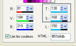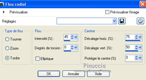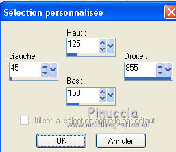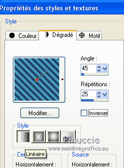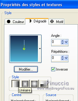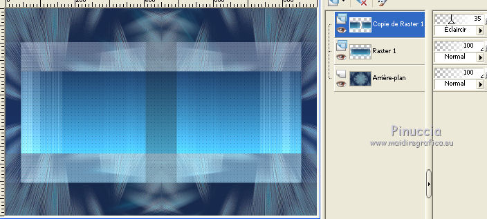 Pour traduire ce tutoriel j'ai utilisé Corel X2, mais il peut également être exécuté avec les autres versions. Suivant la version utilisée, vous pouvez obtenir des résultats différents. Depuis la version X4, la fonction Image>Miroir a été remplacée par Image>Renverser horizontalement, et Image>Renverser avec Image>Renverser verticalement. Dans les versions X5 et X6, les fonctions ont été améliorées par la mise à disposition du menu Objets. Dans la nouvelle version X7, nous avons à nouveau Miroir/Renverser, mais avec autres différences. Voir plus les détails à ce sujet ici Certaines dénominations ont changées entre les versions de PSP. Les plus frequentes dénominations utilisées: ![]() Traduction en italien ici Vos versions ici Nécessaire pour réaliser ce tutoriel: Matériel qui Modules Externes consulter, si nécessaire, ma section de filtre ici Filters Unlimited 2.0 ici &<Bkg Kaleidoscope> - 4QflipZBottomR (da importare in Unlimited) ici AFS Import - 2sqborder2 ici Toadies - What are you ici Simple - Left Right Wrap (bonus) ici AP (lines) - Lines SilverLining ici Filtres Toadies, Simple et AFS IMPORT peuvent être utilisés seuls ou importés dans Filters Unlimited. voir comment le faire ici). Si un filtre est fourni avec cette icône, Parfois, pour raisons différentes (s.o, version de PSP, couleurs, si les filtres sont utilisés seuls ou importés dans Unlimited), ou même selon la version d'Unlimited utilisée (dans le net circule une version d'Unlimited, qui n'a pas besoin d'installation et est composée de files en format 8bf), le résultat des effets peut être différent. ![]() Si vous voulez utiliser vos propres couleurs, n'hésitez pas à changer le mode et l'opacité des calques 1. Placer en avant plan la couleur #182a4c, et en arrière plan la couleur #5b8db. ![]() Préparer un dégradé de premier plan/arrière plan, style Linéaire. ![]() Annoter les valeurs de Teinte (T) et Saturation (S) de votre couleur d'arrière plan, que vous seront utiles pour le Coloriser. ![]() Ouvrir une nouvelle image transparente 900 x 600 pixels Remplir l'image avec la couleur foncée.3. Activer le tube 311211pg10 - Édition>Copier. Revenir sur votre travail et Édition>Coller comme nouveau calque. Réglage>Teinte et Saturation>Coloriser, et transcrire dans les respectives cases les valeurs annotés de votre couleur d'arrière plan. ![]() 4. Réglage>Flou>Flou radial. ![]() 5. Calques>Dupliquer. Calques>Fusionner>Fusionner le calque de dessous. 6. Calques>Dupliquer. Effets>Modules Externes>Filters Unlimited 2.0 - &<Kaleidoscope> - 4QflipZBottomR. ![]() Effets>Effets de bords>Accentuer. 7. Calques>Dupliquer. Image>Rotation libre - 90 degrés à droite. ![]() 8. Effets>Effets d'image>Mosaïque sans jointures, par défaut. ![]() Effets>Effets de bords>Accentuer davantage. 9. Calques>Fusionner>Tous. 10. Calques>Nouveau calque raster. Activer l'outil Sélection ![]() (peu importe le type de sélection, parce que avec la sélection personnalisée vous obtenez toujours un rectangle), cliquer sur Sélection personnalisée ![]() et setter ces paramètres. ![]() 11. Préparer un dégradé de premier plan/arrière plan, style Linéaire. ![]() Remplir la sélection du dégradé.Sélections>Désélectionner tout. 12. Effets>Modules Externes>Filters Unlimited 2.0 - AFS Import - 2sqborder2. ![]() 13. Effets>Modules Externes>Filters Unlimited 2.0 - Toadies - What are you. ![]() 14. Image>Redimensionner, à 90%, redimensionner tous les calques décoché. Effets>Modules Externes>AP Lines - Lines SilverLining - Dotty Grid, par dèfaut. ![]() 15. Calques>Dupliquer. Effets>Modules Externes>Filters Unlimited 2.0 - Simple - Left Right Wrap. ![]() 16. Placer le calque en mode Éclaircir et réduire l'opacité à 35%. ![]() 17. Calques>Nouveau calque raster. Sélection personnalisée ![]() ![]() Placer en avant plan la Couleur, et remplir la sélection avec la couleur foncée.18. À nouveau placer en avant plan le dégradé et changer les paramètres. ![]() 19. Sélections>Modifier>Contracter - 8 pixels. Remplir la sélection du dégradé.Réglage>Netteté>Netteté. Sélections>Désélectionner tout. 20. Fermer les deux calques inférieurs (rester positionné sur le calque du haut de la pile). Calques>Fusionner>Calques visibles. Re-ouvrir les calques inférieurs et rester toujours positionné sur le calque du haut de la pile. Vous devriez avoir ce-ci. ![]() Calques>Dupliquer. Image>Renverser. Calques>Fusionner>Fusionner le calque de dessous. 21. Effets>Effets 3D>Ombre portée, couleur noire. ![]() 22. Activer deco-1-129 - Édition>Copier. Revenir sur votre travail et Édition>Coller comme nouveau calque. Déplacer le tube sur la bande en haut à droite.![]() Placer le calque en mode Recouvrement et réduire l'opacité à 50%. 23. Calques>Dupliquer. Image>Renverser. Image>Miroir. 24. Activer deco-2-129 - Édition>Copier. Revenir sur votre travail et Édition>Coller comme nouveau calque. Déplacer le tube en haut à gauche.Placer le calque en mode Luminance (héritée). 25. Calques>Dupliquer. Image>Renverser. Image>Miroir. Placer le calque en mode Lumière dure. ![]() 26. Activer le tube deco-3-129 - Édition>Copier. Revenir sur votre travail et Édition>Coller comme nouveau calque. Ne pas déplacer. Lascialo come sta. 27. Activer le tube 351b8144 - Édition>Copier. Revenir sur votre travail et Édition>Coller comme nouveau calque. Image>Redimensionner, à 80%, redimensionner tous les calques décoché. Positionner bien le tube (voir mon exemple).Réglage>Netteté>Netteté. 28. Effets>Modules Externes>Alien Skin Eye Candy 5 Impact - Perspective Shadow. Sélectionner le preset Drop Shadow Blurry et ok. ![]() 29. Vous positionner sur le calque du bas de la pile. Calques>Dupliquer. 30. Effets>Modules Externes>AAA Frames - Foto Frame. ![]() 31. Image>Redimensionner, à 90%, redimensionner tous le calques décoché. 32. À nouveau vous positionner sur le calque du bas de la pile. Effets>Modules Exter