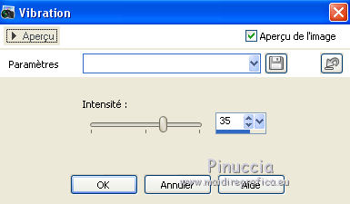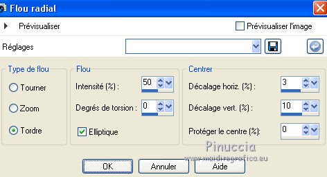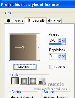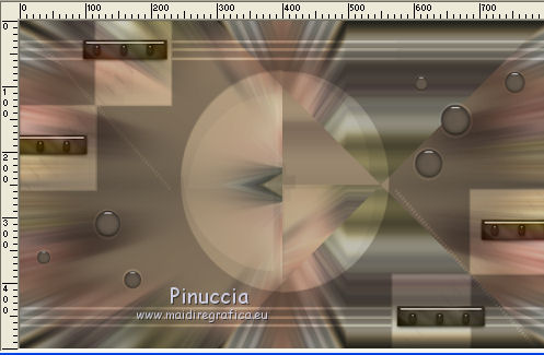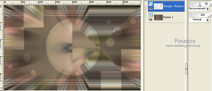 Pour traduire ce tutoriel j'ai utilisé Corel X2, mais il peut également être exécuté avec les autres versions. Suivant la version utilisée, vous pouvez obtenir des résultats différents. Depuis la version X4, la fonction Image>Miroir a été remplacée par Image>Renverser horizontalement, et Image>Renverser avec Image>Renverser verticalement. Dans les versions X5 et X6, les fonctions ont été améliorées par la mise à disposition du menu Objets. Dans la nouvelle version X7, nous avons à nouveau Miroir/Renverser, mais avec autres différences. Voir plus les détails à ce sujet ici Certaines dénominations ont changées entre les versions de PSP. Les plus frequentes dénominations utilisées: ![]() Traduction en italien ici Vos versions ici Nécessaire pour réaliser ce tutoriel: Matériel qui Modules Externes consulter, si nécessaire, ma section de filtre ici Filters Unlimited 2.0 ici &<Bkg Kaleidoscope> - @BluBerry Pie (da importare in Unlimited) ici Adjust - Variations ici Alien Skin Eye Candy 5 Impact - Perspective Shadow ici ![]() Si vous voulez utiliser vos propres couleurs, n'hésitez pas à changer le mode et l'opacité des calques Ouvrir le masque dans PSP et le minimiser avec le reste du matériel. 1. Placer en avant plan la couleur #aa9375, et en arrière plan la couleur #4f473c. ![]() Préparer un dégradé de premier plan/arrière plan, style Linéaire. ![]() 2. Ouvrir une nouvelle image transparente 800 x 500 pixels Remplir l'image du dégradé.3. Sélections>Sélectionner tout. Activer le tube "e7bb4a9c.psp" - Édition>Copier. ne pas fermer le tube: on va s'en servir plus tard Revenir sur votre travail et Édition>Coller dans la sélection. Sélections>Désélectionner tout. 4. Effets>Effets d'image>Mosaïque sans jointures. ![]() 5. Réglage>Flou>Flou radial. ![]() 6. Effets>Modules Externes>Filters Unlimited 2.0 - &<Kaleidoscope> - @BlueBerry Pie. ![]() 7. Image>Miroir. 8. Placer en avant plan la couleur blanche #ffffff. Calques>Nouveau calque raster. Remplir avec la couleur blanche.9. Calques>Nouveau calque de masque>A partir d'une image. Ouvrir le menu deroulant sous la fenêtre d'origine et vous verrez la liste des images ouverts. Sélectionner le masque masker-mb-132. ![]() Calques>Fusionner>Fusionner le groupe. Placer le calque en mode Recouvrement et réduire l'opacité à 55%. ![]() 10. Activer Deco 132-1 - Édition>Copier. Revenir sur votre travail et Édition>Coller comme nouveau calque. Le calque est en mode Luminance (héritée). 11. Activer Deco 132-2 - Édition>Copier. Revenir sur votre travail et Édition>Coller comme nouveau calque. Le calque est en mode Recouvrement. Déplacer l'élément sur les cercles du masque.![]() 12. Activer le tube flowers_17_crealine - Édition>Copier. Revenir sur votre travail et Édition>Coller comme nouveau calque. Image>Redimensionner, à 40%, redimensionner tous les calques décoché. Déplacer le tube en bas à droite.Réglage>Netteté>Netteté. 13. Réglage>Teinte et Saturation>Vibration. ![]() cette effet n'est pas dans les versions moins récentes de PSP. Vous pouvez faire: Réglage>Netteté>Netteté. Effets>Modules Externes>Adjust - Variations. un clic sur Original pour anuler eventuelles précédentes règlages memorisées par le filtre, un clic sur Darker et ok 14. Effets>Modules Externes>Alien Skin Eye Candy 5 Impact - Perspective Shadow. Settings: preset Drop Shadow blurry, sous Basic change Overall opacity avec 60. ![]() 15. À nouveau activer le tube e7bb4a9c - Édition>Copier. Revenir sur votre travail et Édition>Coller comme nouveau calque. Déplacer le tube en bas à gauche.16. Effets>Modules Externes>Alien Skin Eye Candy 5 Impact - Perspective Shadow, comme précédemment. 17. Image>Ajouter des bordures, 1 pixel, symétrique, couleur d'arrière plan. Édition>Copier. Image>Ajouter des bordures, 40 pixels, symétrique, couleur d'avant plan #aa9375. Activer l'outil Baguette magique , tolérance et progressivité 0,et cliquer sur le bord de 40 pixels pour le sélectionner. 18. Édition>Coller dans la sélection. Réglage>Flou>Flou radial, comme précédemment. 19. Sélections>Inverser. Effets>Effets 3D>Ombre portée, couleur noire. ![]() Sélections>Désélectionner tout. 20. Image>Ajouter des bordures, 1 pixel, symétrique, couleur d'arrière plan #4f473c. 21. Signer votre travail sur un nouveau calque. Calques>Fusionner>Tous et enregistrer en jpg. ![]() Si vous avez des problèmes, ou des doutes, ou vous trouvez un link modifié, ou seulement pour me dire que ce tutoriel vous a plu, vous pouvez m'écrire. 8 Juin 2015 |