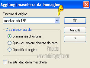 qui puoi trovare qualche risposta ai tuoi dubbi. Se l'argomento che ti interessa non è presente, ti prego di segnalarmelo. Per tradurre questo tutorial ho usato Corel X, ma può essere eseguito con ogni versione di PSP. Dalla versione X4, il comando Immagine>Rifletti è stato sostituito con Immagine>Capovolgi in orizzontale, e il comando Immagine>Capovolgi con Immagine>Capovolgi in verticale. Nelle versioni X5 e X6, le funzioni sono state migliorate rendendo disponibile il menu Oggetti. Con la nuova versione X7, sono tornati Rifletti/Capovolgi, ma con nuove differenze Vedi la scheda sull'argomento qui Le vostre versioni/Vos versions qui Occorrente: Materiale qui Per il tube grazie Alies Filtri: consulta, se necessario, la mia sezione filtri qui Filters Unlimited 2.0 qui Transparency - Eliminate Black qui Alien Skin Eye Candy 5 Impact qui Mura's Seamless qui I filtri Transparency e Mura's Seamless si possono usare da soli o importati in Filters Unlimited (come fare vedi qui) Se un filtro fornito appare con questa icona ![]() Apri la maschera in PSP e minimizzala con il resto del materiale. Scegli due colori dal tube. E' possibile eseguire questo tutorial con molti colori, che potrebbero dare risultati differenti. Per il mio esempio ho usato il colore nero, il colore #d49c5f e un gradiente oro (che può anche essere un altro colore a tinta unita scelto dal tube). ![]() 1. Apri una nuova immagine trasparente 800 x 500 pixels, e riempila con il colore nero.2. Livelli>Nuovo livello raster. Riempi con il gradiente oro.3. Livelli>Nuovo livello maschera>Da immagine. Apri il menu sotto la finestra di origine e vedrai la lista dei files aperti. Seleziona la maschera mb-135, con i seguenti settaggi: ![]() Livelli>Unisci>Unisci gruppo. 4. Livelli>Nuovo livello raster. Riempi con il colore scelto dal tube #f1b06c.5. Effetti>Plugins>Mura's Seamless - Checks with Gradation. ![]() 6. Effetti>Plugins>Transparency - Eliminate Black. ![]() 7. Effetti>Effetti di trama>Veneziana. ![]() 8. Effetti>Plugins>Alien Skin Eye Candy 5 Impact - Extrude. Seleziona il preset Small offset 30 Degrees e ok. ![]() Cambia la modalità di miscelatura di questo livello in Sovrapponi. 9. Apri slinger 1 e vai a Modifica>Copia. Torna al tuo lavoro e vai a Modifica>Incolla come nuovo livello. Lascialo come sta. 10. Apri il tube Tafel, e vai a Modifica>Copia. Torna al tuo lavoro e vai a Modifica>Incolla come nuovo livello. Spostalo in basso a sinistra.![]() 11. Apri il tube 0_7ae71_4c070e4f_L e vai a Modifica>Copia. Torna al tuo lavoro e vai a Modifica>Incolla come nuovo livello. Spostalo sul tavolino.![]() 12. Se vuoi puoi aggiungere un altro tube a tua scelta da appoggiare sul tavolino. Per il mio esempio, seguendo quello del tutorial originale, ho usato delle mele. ![]() 13. Apri il tube Alies 10VR78-woman-12102012 e vai a Modifica>Copia. Torna al tuo lavoro e vai a Modifica>Incolla come nuovo livello. 14. Immagine>Rifletti. Immagine>Ridimensiona, all'80%, tutti i livelli non selezionato. Regola>Messa a fuoco>Metti a fuoco. 15. Sposta il tube a destra.16. Effetti>Plugins>Alien Skin Eye Candy 5 Impact - Perspective Shadow. Seleziona il preset Drop Shadow, Blurry e ok. ![]() Prima di aggiungere i bordi, se vuoi, puoi cambiare a tuo piacimento il colore dello sfondo. Vedi sotto l'esempio con un altro colore. 17. Selezione>Seleziona tutto. Livelli>Nuovo livello raster. Riempi con il gradiente oro (o con un colore a tua scelta).Selezione>Modifica>Contrai - 2 pixels. Premi sulla tastiera il tasto CANC .Se non usi il gradiente oro, puoi anche fare: Immagine>Aggiungi bordatura, 2 pixels, simmetriche, con il colore scuro. 18. Immagine>Aggiungi bordatura, 40 pixels, simmetriche, con il colore bianco. Selezione>Seleziona tutto. Selezione>Modifica>Contrai - 40 pixels. 20. Effetti>Effetti 3D>Sfalsa ombra, con il colore nero. ![]() 21. Aggiungi il tuo nome e/o il tuo watermark su un nuovo livello. 22. Livelli>Unisci>Unisci tutto e salva in formato jpg. ![]() ![]() Se hai problemi o dubbi, o trovi un link non funzionante, o anche soltanto per un saluto, scrivimi. 24 Gennaio 2013 |