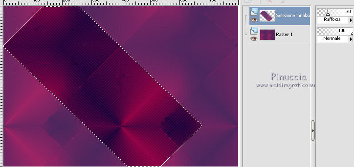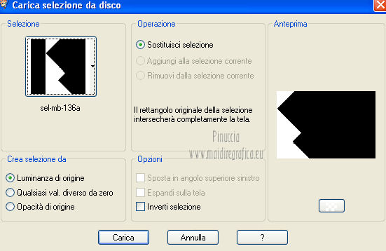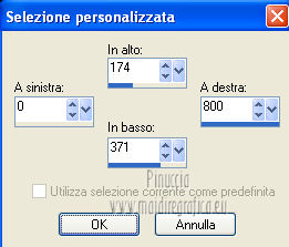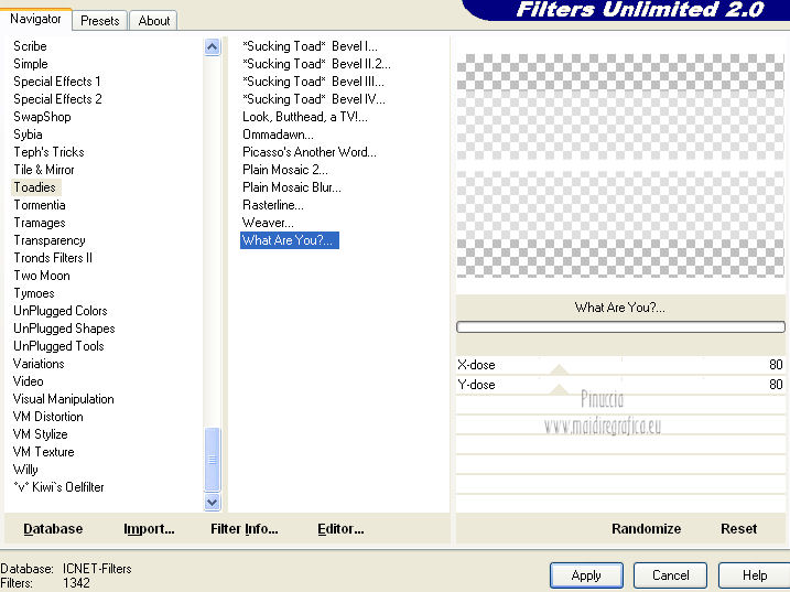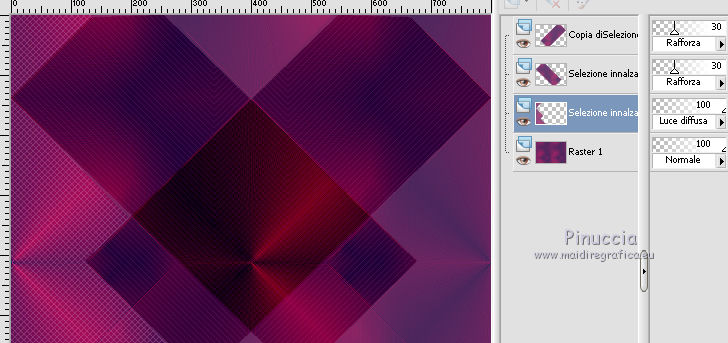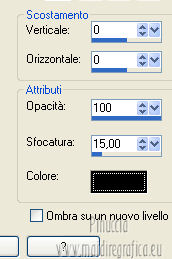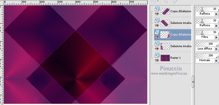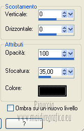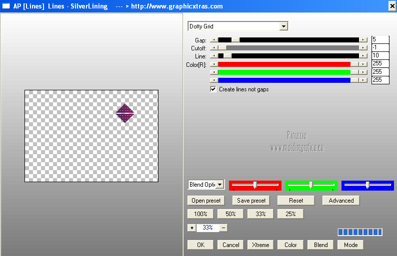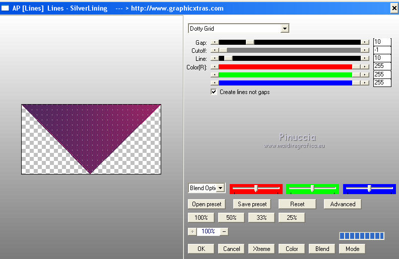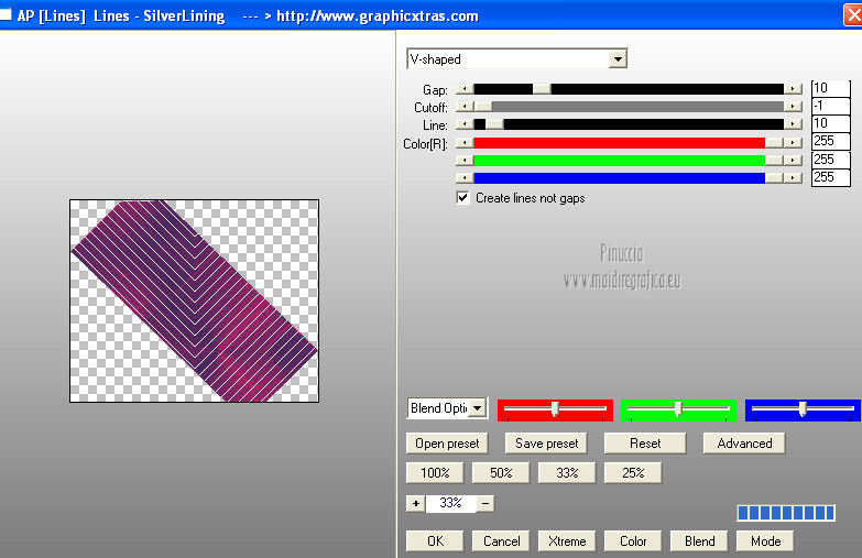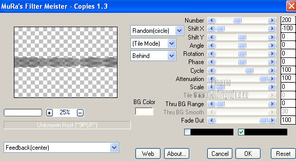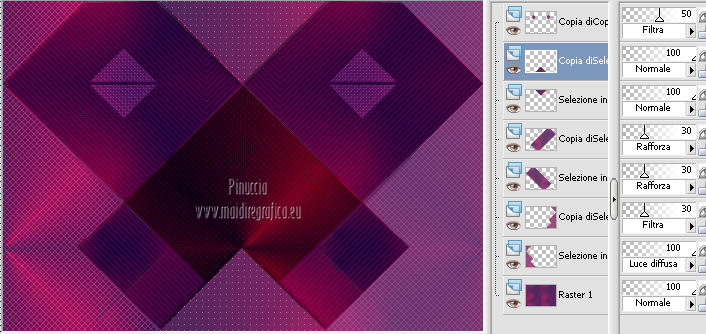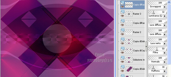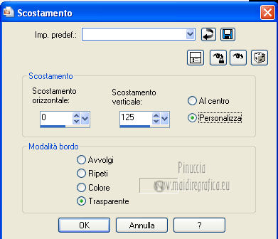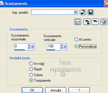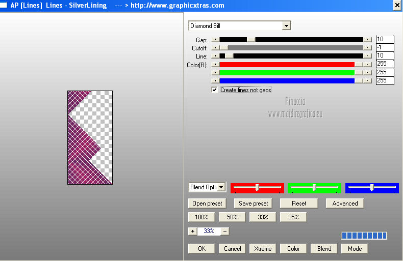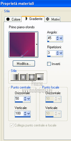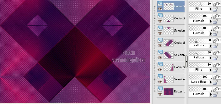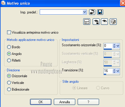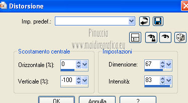 qui puoi trovare qualche risposta ai tuoi dubbi. Se l'argomento che ti interessa non è presente, ti prego di segnalarmelo. Per tradurre questo tutorial ho usato Corel X, ma può essere eseguito con ogni versione di PSP. Dalla versione X4, il comando Immagine>Rifletti è stato sostituito con Immagine>Capovolgi in orizzontale, e il comando Immagine>Capovolgi con Immagine>Capovolgi in verticale. Nelle versioni X5 e X6, le funzioni sono state migliorate rendendo disponibile il menu Oggetti. Con la nuova versione X7, sono tornati Rifletti/Capovolgi, ma con nuove differenze Vedi la scheda sull'argomento qui Le vostre versioni/Vos versions qui Occorrente: Materiale qui I tubes sono di Anna.br e Dédé. Filtri: consulta, se necessario, la mia sezione filtri qui Filters Unlimited 2.0 qui Simple qui AP Lines - Lines SilverLining qui Toadies - What are you qui Mura's Meister - Copies qui Nik Software - Color Efex Pro qui Graphics Plus - Cross Shadow qui I filtri Simple, Toadies e Graphics Plus si possono usare da soli o importati in Filters Unlimited (come fare vedi qui) Se un filtro fornito appare con questa icona ![]() Metti le selezioni nella cartella Selezioni. Imposta il colore di primo piano con #9e2465, e il colore di sfondo con #4e275e. ![]() Passa il colore di primo piano a Gradiente, stile Radiale. ![]() 1. Apri una nuova immagine trasparente 800 x 550 pixels, e riempila con il gradiente.2. Effetti>Plugins>Simple - Blintz. Effetti>Plugins>Simple - Zoom out and flip. 3. Effetti>Effetti di bordo>Aumenta di più. 4. Effetti>Effetti di immagine>Motivo unico. ![]() 5. Effetti>Effetti di bordo>Aumenta. 6. Selezione>Carica/Salva selezione>Carica selezione da disco. Cerca e carica la selezione sel-mb-136. ![]() Selezione>Innalza selezione a livello. 7. Effetti>Plugins>AP lines - Lines SilverLining. ![]() 8. Cambia la modalità di miscelatura di questo livello in Rafforza e abbassa l'opacità al 30%. ![]() Selezione>Deseleziona. 9. Livelli>Duplica. Immagine>Rifletti. 10. Attiva il livello inferiore (Raster 1). Selezione>Carica/Salva selezione>Carica selezione da disco. Cerca e carica la selezione sel-mb-136a. ![]() Selezione>Innalza selezione a livello. 11. Effetti>Plugins>AP Lines - Lines SilverLining. ![]() 12. Cambia la modalità di miscelatura di questo livello in Luce diffusa. ![]() Selezione>Deseleziona. 13. Livelli>Duplica. Immagine>Rifletti. 14. Cambia la modalità di miscelatura di questo livello in Filtra, e abbassa l'opacità al 30%. ![]() 15. Attiva nuovamente il livello inferiore (Raster 1). Selezione>Carica/Salva selezione>Carica selezione da disco. Cerca e carica la selezione sel-mb-136b. ![]() Selezione>Innalza selezione a livello. 16. Effetti>Plugins>AP Lines - Lines SilverLining. ![]() Selezione>Deseleziona. 17. Livelli>Disponi>Porta in alto. Effetti>Effetti 3D>Sfalsa ombra, con il colore nero. ![]() 18. Livelli>Duplica. Immagine>Capovolgi. 19. Rimani sul livello superiore. Livelli>Duplica. Immagine>Ridimensiona, al 40%, tutti i livelli non selezionato. 20. Livelli>Duplica. Immagine>Capovolgi. 21. Effetti>Effetti di immagine>Scostamento. ![]() 22. Livelli>Unisci>Unisci giù. 23. Effetti>Effetti di immagine>Scostamento. ![]() 24. Effetti>Plugins>AP Lines - Lines SilverLining. ![]() 25. Livelli>Duplica. Immagine>Rifletti. Livelli>Unisci>Unisci giù. 26. Cambia la modalità di miscelatura di questo livello in Filtra, e abbassa l'opacità al 50%. ![]() 27. Attiva il livello sottostante copia di Selezione. ![]() 28. Livelli>Unisci>Unisci giù. 29. Livelli>Duplica. Immagine>Ridimensiona, all'80%, tutti i livelli non selezionato. Cambia la modalità di miscelatura di questo livello in Luce netta. Livelli>Disponi>Porta in alto. 30. Livelli>Nuovo livello raster. Attiva lo strumento Selezione ,clicca sull'icona Selezione personalizzata ![]() e imposta i seguenti settaggi: ![]() Imposta il colore di primo piano con il colore bianco. Riempi la selezione con il colore bianco.Selezione>Deseleziona. 31. Effetti>Plugins>Filters Unlimited 2.0 - Toadies - What are you. ![]() 32. Effetti>Effetti di distorsione>Distorsione. ![]() 33. Effetti>Effetti di immagine>Scostamento. ![]() Cambia la modalità di miscelatura di questo livello in Luce diffusa. 34. Livelli>Duplica. Immagine>Capovolgi. 35. Effetti>Effetti di immagine>Scostamento. ![]() 36. Apri il tube Bal, e vai a Modifica>Copia. Torna al tuo lavoro e vai a Modifica>Incolla come nuovo livello. Il tube è in modalità Luminanza (esistente), opacità 32%. 37. Livelli>Duplica. Immagine>Ridimensiona, al 40%, tutti i livelli non selezionato. 38. Effetti>Plugins>Mura's Meister - Copies. ![]() Cambia la modalità di miscelatura di questo livello in Sovrapponi, opacità 100. Effetti>Effetti di bordo>Aumenta. ![]() 39. Sposta questa linea un po' più a destra,in modo che si trovi esattamente al centro. 40. Apri il tube balletjeslijn e vai a Modifica>Copia. Torna al tuo lavoro e vai a Modifica>Incolla come nuovo livello. 41. Effetti>Effetti di immagine>Scostamento. ![]() 42. Immagine>Aggiungi bordatura, 1 pixel, simmetriche, con il colore scuro. Immagine>Aggiungi bordatura, 40 pixels, simmetriche, con il colore chiaro. Livelli>Innalza livello di sfondo. Selezione>Seleziona tutto. Selezione>Modifica>Contrai - 40 pixels. 43. Effetti>Effetti 3D>Sfalsa ombra, con i settaggi precedenti. Selezione>Deseleziona. 44. Ora, se vuoi, puoi usare il filtro Nik Software - Color Efex, per cambiare la combinazione di colori. A sinistra seleziona Bi-Color Filters, e a destra scegli Color Set e settaggi che preferisci. 45. Apri il tube Perfume_bottle66_dédé e vai a Modifica>Copia. Torna al tuo lavoro e vai a Modifica>Incolla come nuovo livello. 46. Regola>Messa a fuoco>Metti a fuoco. Effetti>Effetti 3D>Sfalsa ombra, con i settaggi precedenti. Spostalo in basso a destra.47. Apri il tube anna.br_exuberancia02_by-dquinto e vai a Modifica>Copia. Torna al tuo lavoro e vai a Modifica>Incolla come nuovo livello. Spostalo in basso a sinistra.48. Effetti>Effetti 3D>Sfalsa ombra, 