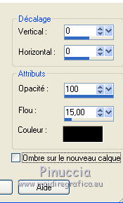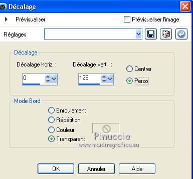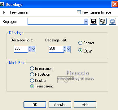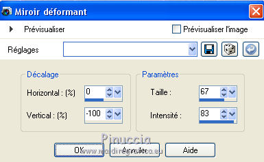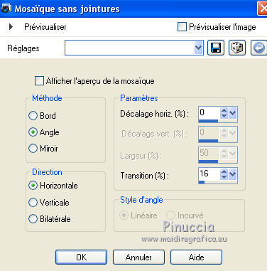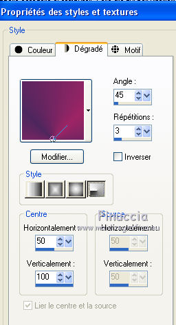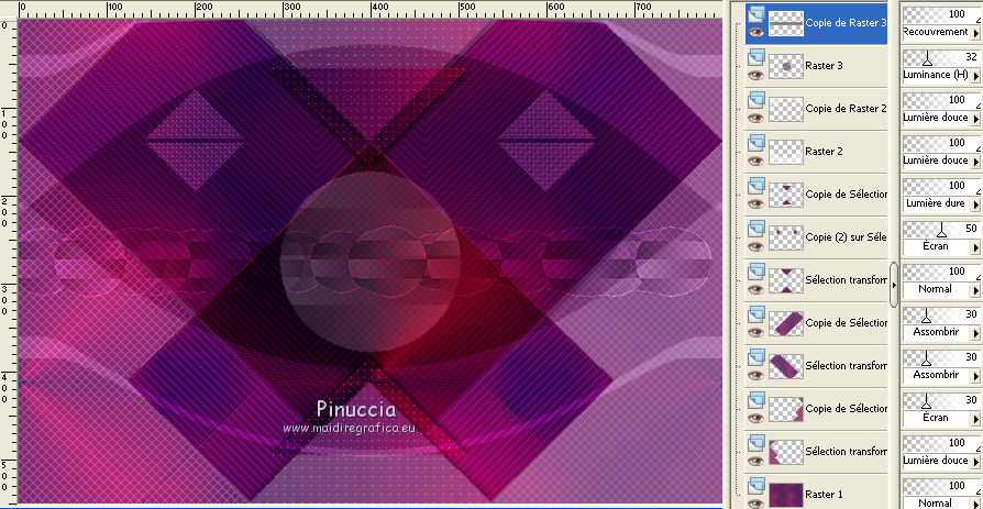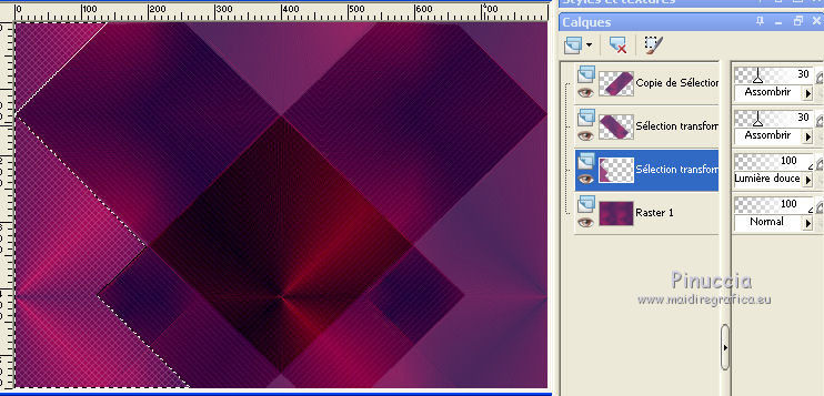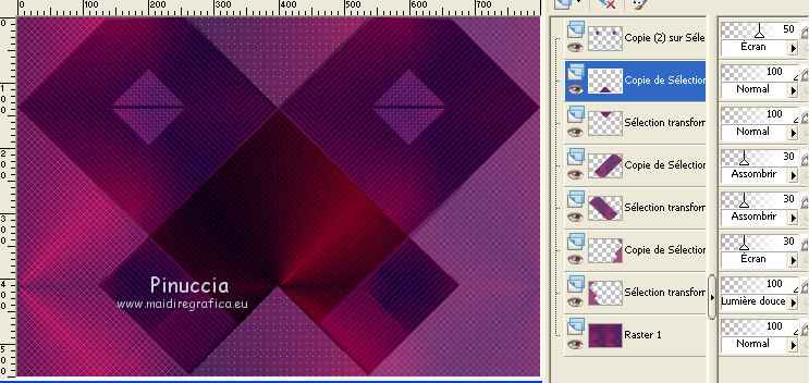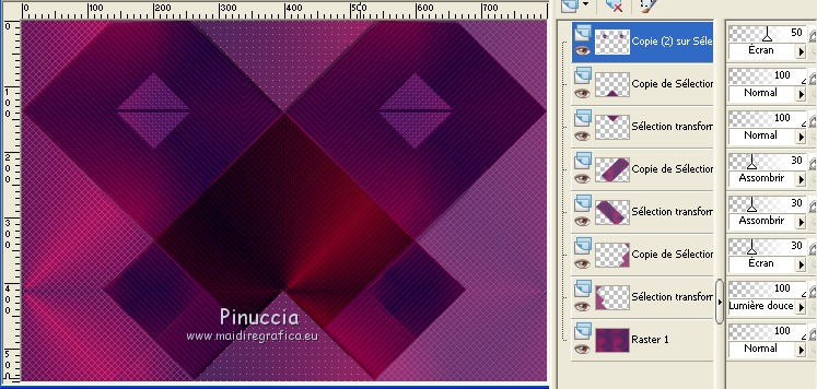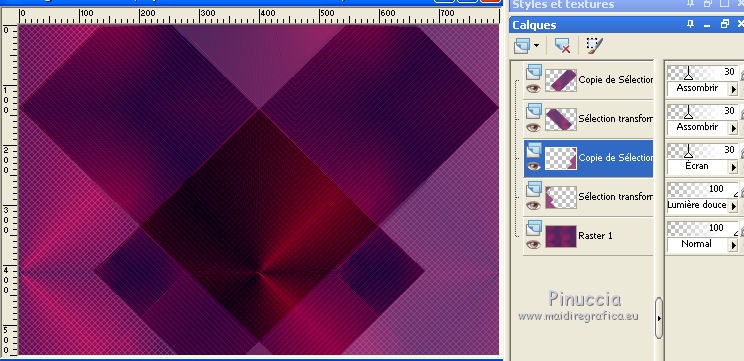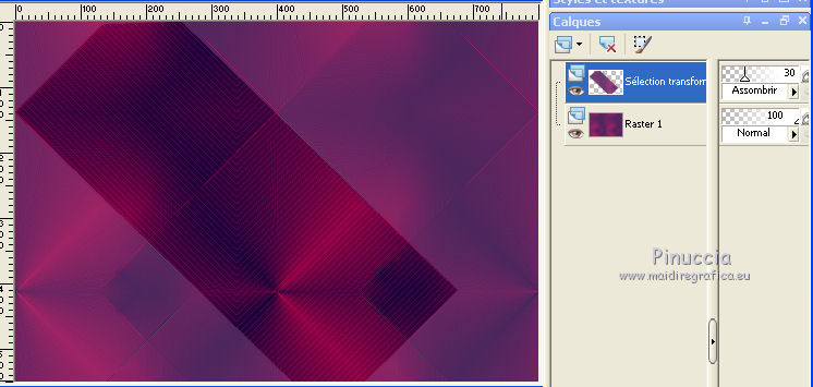 Pour traduire ce tutoriel j'ai utilisé Corel X2, mais il peut également être exécuté avec les autres versions. Suivant la version utilisée, vous pouvez obtenir des résultats différents. Depuis la version X4, la fonction Image>Miroir a été remplacée par Image>Renverser horizontalement, et Image>Renverser avec Image>Renverser verticalement. Dans les versions X5 et X6, les fonctions ont été améliorées par la mise à disposition du menu Objets. Dans la nouvelle version X7, nous avons à nouveau Miroir/Renverser, mais avec autres différences. Voir plus les détails à ce sujet ici Certaines dénominations ont changées entre les versions de PSP. Les plus frequentes dénominations utilisées: ![]() Traduction en italien ici Vos versions ici Nécessaire pour réaliser ce tutoriel: Matériel qui Les tubes sont de Anna.br et Dédé. Modules Externes consulter, si nécessaire, ma section de filtre ici Filters Unlimited 2.0 ici Simple ici AP Lines - Lines SilverLining ici Toadies - What are you ici Mura's Meister - Copies ici Nik Software - Color Efex Pro ici Graphics Plus - Cross Shadow ici Filtres Simple, Toadies et Graphics Plus peuvent être utilisés seuls ou importés dans Filters Unlimited. voir comment le faire ici). Si un filtre est fourni avec cette icône, ![]() Si vous voulez utiliser vos propres couleurs, n'hésitez pas à changer le mode et l'opacité des calques Placer les sélections dans le dossier Sélections. 1. Placer en avant plan la couleur #9e2465, et en arrière plan la couleur #4e275e. ![]() Préparer en avant plan un dégradé de premier plan/arrière plan, style Radial. ![]() Ouvrir une nouvelle image transparente 800 x 550 pixels Remplir l'image du dégradé.2. Effets>Modules Externes>Simple - Blintz. Effets>Modules Externes>Simple - Zoom out and flip. 3. Effets>Effets de bords>Accentuer davantage. 4. Effets>Effets d'image>Mosaïque sans jointures. ![]() 5. Effets>Effets de bords>Accentuer. 6. Sélections>Charger/Enregistrer une sélection>Charger à partir du disque. Chercher et charger la sélection sel-mb-136. ![]() Sélections>Transformer la sélection en calque. 7. Effets>Modules Externes>AP lines - Lines SilverLining. ![]() 8. Placer le calque en mode Assombrir et réduire l'opacité à 30%. ![]() Sélections>Désélectionner tout. 9. Calques>Dupliquer. Image>Miroir. 10. Vous positionner sur le calque du bas de la pile (Raster 1). Sélections>Charger/Enregistrer une sélection>Charger à partir du disque. Chercher et charger la sélection sel-mb-136a. ![]() Sélections>Transformer la sélection en calque. 11. Effets>Modules Externes>AP Lines - Lines SilverLining. ![]() 12. Placer le calque en mode Lumière douce. ![]() Sélections>Désélectionner tout. 13. Calques>Dupliquer. Image>Miroir. 14. Placer le calque en mode Écran et réduire l'opacité à 30%. ![]() 15. À nouveau vous positionner sur le calque du bas de la pile (Raster 1). Sélections>Charger/Enregistrer une sélection>Charger à partir du disque. Chercher et charger la sélection sel-mb-136b. ![]() Sélections>Transformer la sélection en calque. 16. Effets>Modules Externes>AP Lines - Lines SilverLining. ![]() Sélections>Désélectionner tout. 17. Calques>Agencer>Placer en haut de la pile. Effets>Effets 3D>Ombre portée, couleur noire. ![]() 18. Calques>Dupliquer. Image>Renverser. 19. Rester positionné sur le calque du haut de la pile. Calques>Dupliquer. Image>Redimensionner, à 40%, redimensionner tous les calques décoché. 20. Calques>Dupliquer. Image>Renverser. 21. Effets>Effets d'image>Décalage. ![]() 22. Calques>Fusionner>Fusionner le calque de dessous. 23. Effets>Effets d'image>Décalage. ![]() 24. Effets>Modules Externes>AP Lines - Lines SilverLining. ![]() 25. Calques>Dupliquer. Image>Miroir. Calques>Fusionner>Fusionner le calque de dessous. 26. Placer le calque en mode Écran et réduire l'opacité à 50%. ![]() 27. Vous positionner sur le calque de dessous, copie de sélection transformée. ![]() 28. Calques>Fusionner>Fusionner le calque de dessous. 29. Calques>Dupliquer. Image>Redimensionner, 80%, redimensionner tous les calques décoché. Placer le calque en mode Lumière dure. Calques>Agencer>Placer en haut de la pile. 30. Calques>Nouveau calque raster. Activer l'outil Sélection ![]() (peu importe le type de sélection, parce que avec la sélection personnalisée vous obtenez toujours un rectangle), cliquer sur Sélection personnalisée ![]() et setter ces paramètres. ![]() Placer en avant plan la couleur blanche. Remplir la sélection avec la couleur blanche.Sélections>Désélectionner tout. 31. Effets>Modules Externes>Filters Unlimited 2.0 - Toadies - What are you. ![]() 32. Effets>Effets de distorsion>Miroir déformant. ![]() 33. Effets>Effets d'image>Décalage. ![]() Placer le calque en mode Lumière douce. 34. Calques>Dupliquer. Image>Renverser. 35. Effets>Effets d'image>Décalage. ![]() 36. Activer le tube tube Bal, Édition>Copier. Revenir sur votre travail et Édition>Coller comme nouveau calque. Placer le calque en mode Luminance (héritée) et réduire l'opacité à 32%. 37. Calques>Dupliquer. Image>Redimensionner, à 40%, redimensionner tous les calques décoché. 38. Effets>Modules Externes>Mura's Meister - Copies. ![]() Placer le calque en mode Recouvrement, opacité 100. Effets>Effets de bords>Accentuer. ![]() 39. Déplacer cette ligne un peu plus à droite,de façon qu'elle se trouve exactement au centre. 40. Activer le tube balletjeslijn Édition>Copier. Revenir sur votre travail et Édition>Coller comme nouveau calque. 41. Effets>Effets d'image>Décalage. ![]() 42. Image>Ajouter des bordures, 1 pixel, symétrique, couleur foncée. Image>Ajouter des bordures, 40 pixels, symétrique, couleur claire. Calques>Transformer le calque d'arrière plan. Sélections>Sélectionner tout. Sélections>Modifier>Contracter - 40 pixels. 43. Effets>Effets 3D>Ombre portée, comme précédemment. Sélections>Désélectionner tout. 44. Maintenant, si vous voulez, vous po