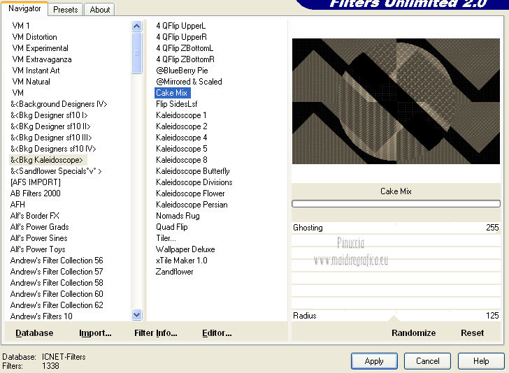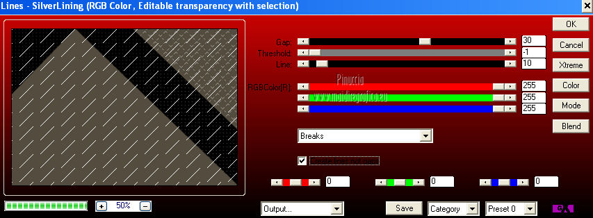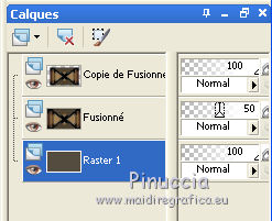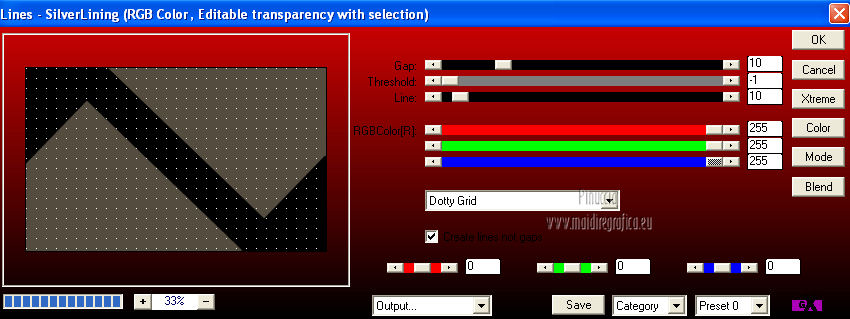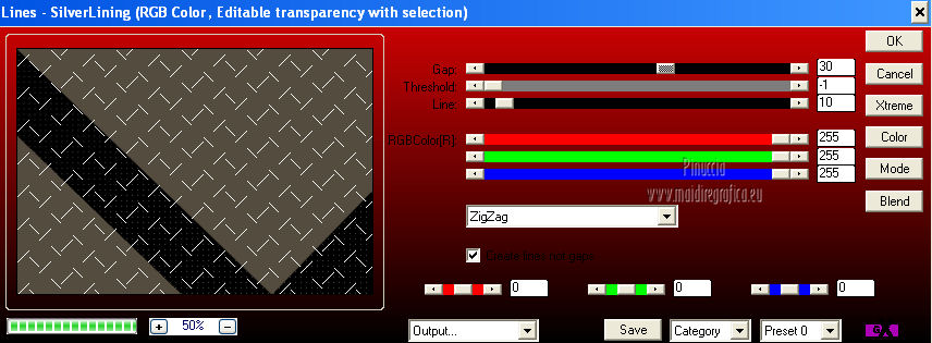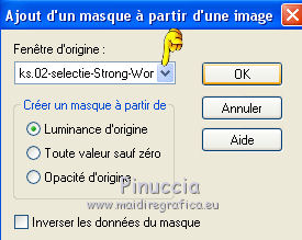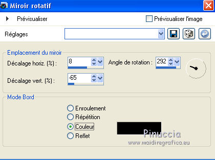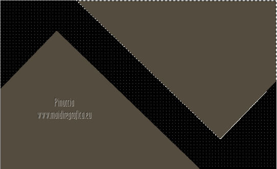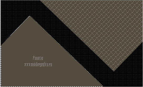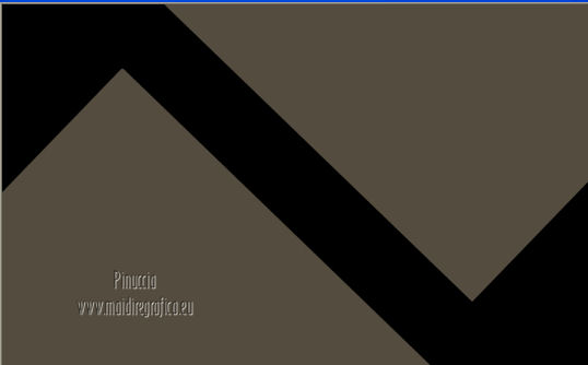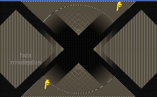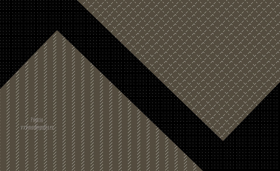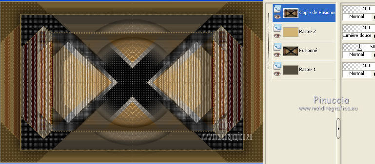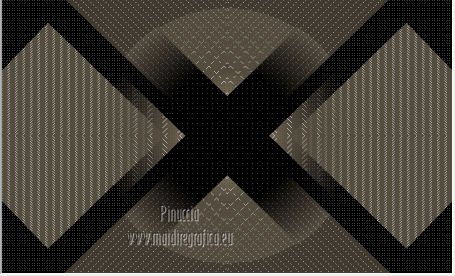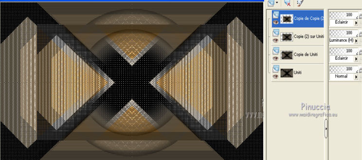 Pour traduire ce tutoriel j'ai utilisé Corel X2, mais il peut également être exécuté avec les autres versions. Suivant la version utilisée, vous pouvez obtenir des résultats différents. Depuis la version X4, la fonction Image>Miroir a été remplacée par Image>Renverser horizontalement, et Image>Renverser avec Image>Renverser verticalement. Dans les versions X5 et X6, les fonctions ont été améliorées par la mise à disposition du menu Objets. Dans la nouvelle version X7, nous avons à nouveau Miroir/Renverser, mais avec autres différences. Voir plus les détails à ce sujet ici Certaines dénominations ont changées entre les versions de PSP. Les plus frequentes dénominations utilisées: ![]() Traduction en italien ici Vos versions ici Nécessaire pour réaliser ce tutoriel: Matériel qui Modules Externes consulter, si nécessaire, ma section de filtre ici Filters Unlimited 2.0 ici &<Bkg Kaleidoscope> - Cake Mix, 4QflipZBottomR (da importare in Unlimited) ici AP (lines) - Lines SilverLining ici ![]() Si vous voulez utiliser vos propres couleurs, n'hésitez pas à changer le mode et l'opacité des calques 1. Placer en avant plan la couleur #d2b575, et en arrière plan la couleur #544c3f. ![]() Ouvrir une nouvelle image transparente 900 x 550 pixels Remplir l'image avec la couleur d'arrière plan.2. Effets>Effets de réflexion>Miroir rotatif - couleur noire. ![]() 3. ACtiver l'outil Baguette magique , tolérance et progressivité 0,et cliquer sur la partie en haut à droite pour la sélectionner. ![]() Sélections>Trasformer la sélection en calque. Sélections>Désélectionner tout. 4. Calques>Dupliquer. Image>Miroir. Image>Renverser. ![]() Calques>Fusionner>Calques visibles. 5. Sélectionner la partie noire au centre avec la baguette magique .![]() 6. Effets>Modules ExternesAP 01 [Innovations] - Lines SilverLining - Dotty Grid. ![]() Sélections>Désélectionner tout. 7. Sélectionner la partie en haut à droite avec la baguette magique ![]() ![]() 8. Effets>Modules ExternesAP 01 [Innovations] - Lines SilverLining - ZigZag. ![]() Sélections>Désélectionner tout. 9. Sélectionner la partie en bas à gauche avec la baguette magique ![]() ![]() 10. Effets>Modules ExternesAP 01 [Innovations] - Lines SilverLining - Breaks. ![]() Sélections>Désélectionner tout. À partir da cette étape ![]() le résultat pourrait être différent selon la version de PSP utilisée. Pour mon exemple, je vais continuer avec la version PSP X2. 11. Effets>Modules ExternesFilters Unlimited 2.0 - &<Bkg Kaleidoscope> - Cake Mix. ![]() 12. Effets>Modules ExternesFilters Unlimited 2.0 - &<Bkg Kaleidoscope> - 4QflipUpperL. ![]() Vous devriez avoir ce-ci. ![]() si votre résultat est trop différent du mien, si vous voulez, vous pouver commencer le tutoriel avec cette image de départ. et continuer avec la prochaine étape. 13. Assurez-vous que le mode Ajouter de l'outil Baguette magique soit sélectionnéet cliquer en haut et en bas pour sélectionner les deux parties. ![]() Effets>Effets de textures>Stores, couleur noire. ![]() Effets>Effets 3D>Ombre portée, couleur noire. ![]() Répéter Ombre portée, mais vertical et horizontal -10. ![]() Sélections>Désélectionner tout. au lieu de cette étape, vous pouvez copier/coller comme nouveau calque le tube deco-1-139 et Calques>Fusionner>Fusionner le calque de dessous. 14. Calques>Dupliquer. Image>Redimensionner, 85%, redimensionner tous les calques décoché. 15. Calques>Dupliquer. Image>Redimensionner, 85%, redimensionner tous les calques décoché. 16. Calques>Dupliquer. Image>Redimensionner, 85%, redimensionner tous les calques décoché. 17. Placer ce calque et le calque de la premier copie en Éclaircir, et le calque de la deuxième copie en Luminance (héritée). ![]() si vous utilisez autres couleur, changer les modes à votre convenance 18. Calques>Fusionner>Calques visibles. 19. Calques>Nouveau calque raster. Remplir avec la couleur claire.20. Activer ks.02-selectie-Strong-women et le minimiser. Revenir sur votre travail. Calques>Nouveau calque de masque>A partir d'une image. Ouvrir le menu deroulant sous la fenêtre d'origine et vous verrez la liste des images ouverts. Sélectionner l'image ks.02-selectie-Strong-women. ![]() Calques>Fusionner>Fusionner le groupe. Placer le calque en mode Assombrir. 21. Activer Deco139 - Édition>Copier. Revenir sur votre travail et Édition>Coller comme nouveau calque. Ne pas déplacer. Réduire l'opacité de ce calque à 50%. 22. Calques>Fusionner>Calques visibles. 23. Calques>Dupliquer. Image>Redimensionner, 85%, redimensionner tous les calques décoché. 24. Vous positionner sur le calque du bas de la pile. Calques>Nouveau calque raster. Remplir avec la couleur d'arrière plan.Calques>Agencer>Placer en bas de la pile. 25. Vous positionner sur le calque de dessus - fusionné. Réduire l'opacité à 50%. ![]() Pour mon exemple j'ai ajouté cette variante: Calques>Nouveau calque raster. Remplir avec la couleur de premier plan.Placer le calque en mode Lumière douce. À vous décider en fonction de vos couleurs. 26. Vous positionner sur le calque du haut de la pile. Sélections>Sélectionner tout. Sélections>Flottante. Sélections>Statique. 27. Calques>Nouveau calque raster. Remplir avec la couleur claire.Sélections>Modifier>Contracter - 3 pixels. Presser CANC sur le clavier ![]() Sélections>Désélectionner tout. 28. Effets>Effets de texture>Stores, comme précédemment. Répéter Effets>Effets de textures>Stores, cette fois horizontal décoché. ![]() Calques>Fusionner>Fusionner le calque de dessous. 29. Effets>Effets 3D>Ombre portée, couleur noire. ![]() Répéter Ombre portée, mais vertical et horizontal -10. Résultat: ![]() 30. Calques>Fusionner>Calques visibles. 31. Activer le tube "GlamourFace" - Édition>Copier. Revenir sur votre travail et Édition>Coller comme nouveau calque. Image>Redimensionner, 80%, redimensionner tous les calques décoché. Déplacer le tube à gauche, comme dans mon exe