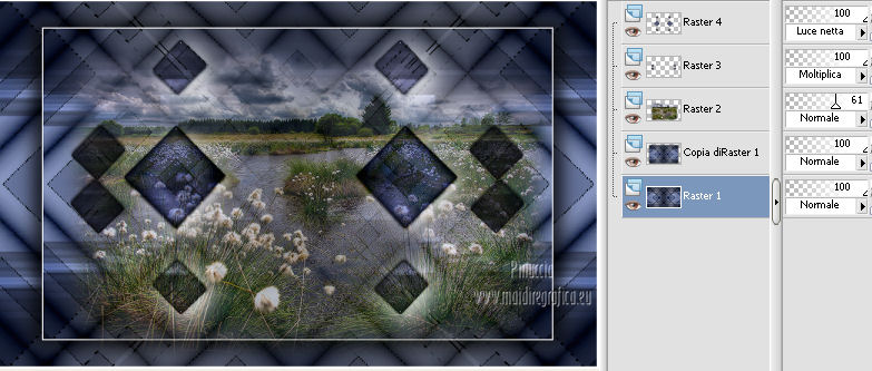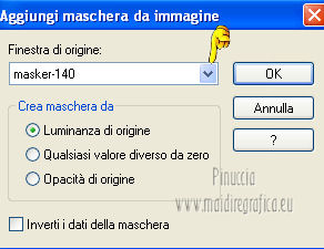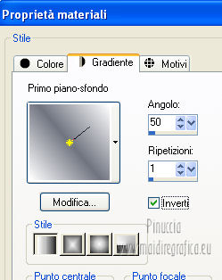 qui puoi trovare qualche risposta ai tuoi dubbi. Se l'argomento che ti interessa non è presente, ti prego di segnalarmelo. Per tradurre questo tutorial ho usato Corel X, ma può essere eseguito con ogni versione di PSP. Dalla versione X4, il comando Immagine>Rifletti è stato sostituito con Immagine>Capovolgi in orizzontale, e il comando Immagine>Capovolgi con Immagine>Capovolgi in verticale. Nelle versioni X5 e X6, le funzioni sono state migliorate rendendo disponibile il menu Oggetti. Con la nuova versione X7, sono tornati Rifletti/Capovolgi, ma con nuove differenze Vedi la scheda sull'argomento qui Le vostre versioni/Vos versions qui Occorrente: Materiale qui Filtri: consulta, se necessario, la mia sezione filtri qui Filters Unlimited 2.0 qui &<Bkg Kaleidoscope> - Zandflower, Kaleidoscope 2 (da importare in Unlimited) qui AAA Frames - Foto Frame qui AAA Filters - Tweed Frame qui Alien Skin Eye Candy 5 Impact - Perspective Shadow qui ![]() Metti il preset nella cartella del filtro Alien Skin Eye Candy 5 Impact>Settings>Shadow. Cliccando sul file una o due volte (a seconda delle tue impostazioni), automaticamente il preset si installerà nella cartella corretta. perchè uno o due clic vedi qui Apri la maschera in PSP e minimizzala con il resto del materiale. Imposta il colore di primo piano con #707480, e il colore di sfondo con #ffffff. ![]() Passa il colore di primo piano a Gradiente, stile Lineare. ![]() 1. Apri una nuova immagine trasparente 900 x 550 pixels, e riempila con il gradiente.2. Regola>Sfocatura>Sfocatura gaussiana - raggio 40. ![]() 3. Effetti>Plugins>AAA Frames - Foto Frame, con i settaggi standard. ![]() 4. Effetti>Plugins>Filters Unlimited 2.0 - &<Bkg Kaleidoscope> - Zandflower. ![]() 5. Livelli>Duplica. Immagine>Capovolgi. Abbassa l'opacità di questo livello al 20%. Livelli>Unisci>Unisci giù. 6. Effetti>Plugins>Filters Unlimited 2.0 - &<Bkg Kaleidoscope> - Kaleidoscope 2. ![]() 7. Livelli>Nuovo livello raster. Riempi con il colore bianco di sfondo.8. Livelli>Nuovo livello maschera>Da immagine. Apri il menu sotto la finestra di origine e vedrai la lista dei files aperti. Seleziona la maschera masker-140, con i seguenti settaggi: ![]() Livelli>Unisci>Unisci gruppo. 9. Cambia la modalità di miscelatura di questo livello in Indebolisci, e abbassa l'opacità al 73%. Livelli>Unisci>Unisci giù. 10. Livelli>Nuovo livello raster. Riempi con il colore bianco di sfondo.Selezione>Seleziona tutto. Selezione>Modifica>Contrai - 2 pixels. Premi sulla tastiera il tasto CANC .Livelli>Unisci>Unisci giù. Selezione>Deseleziona. 11. Livelli>Duplica. Immagine>Ridimensiona, all'85%, tutti i livelli non selezionato. 12. Effetti>Plugins>Alien Skin Eye Candy 5 Impact - Perspective Shadow. Seleziona il preset MB140 e ok. In caso di problemi con il preset, puoi copiare i settaggi della schermata. ![]() 13. Apri il tube anna.br_pradaria_29-08-10 e vai a Modifica>Copia. Torna al tuo lavoro e vai a Modifica>Incolla come nuovo livello. Immagine>Ridimensiona, all'85%, tutti i livelli non selezionato. Abbassa l'opacità di questo livello al 61%. Sposta il tube un po' più in alto.14. Apri deco-140-1 e vai a Modifica>Copia. Torna al tuo lavoro e vai a Modifica>Incolla come nuovo livello. Lascia la modalità di miscelatura di questo livello in Moltiplica. 15. Apri deco-140-2 e vai a Modifica>Copia. Torna al tuo lavoro e vai a Modifica>Incolla come nuovo livello. Lascia la modalità di miscelatura di questo livello in Luce netta. 16. Attiva il livello inferiore. ![]() 17. Regola>Sfocatura>Sfocatura gaussiana - raggio 40. ![]() 18. Effetti>Effetti di trama>Veneziana. ![]() 19. Attiva il livello superiore. Apri il tube TubeNP-1063 e vai a Modifica>Copia. Torna al tuo lavoro e vai a Modifica>Incolla come nuovo livello. Immagine>Ridimensiona, al 72%, tutti i livelli non selezionato. Regola>Messa a fuoco>Metti a fuoco. Sposta il tube a destra.20. Effetti>Plugins>Alien Skin Eye Candy 5 Impact - Perspective Shadow. Seleziona il preset Drop Shadow Blurry e ok. ![]() 21. Immagine>Aggiungi bordatura, 2 pixels, simmetriche, con il colore bianco. Immagine>Aggiungi bordatura, 2 pixels, simmetriche, con il colore di primo piano. Immagine>Aggiungi bordatura, 2 pixels, simmetriche, con il colore bianco. 22. Effetti>Plugins>AAA Filters - Tweed Frame. ![]() 23. Aggiungi il tuo nome e/o il tuo watermark su un nuovo livello. Livelli>Unisci>Unisci tutto e salva in formato jpg. ![]() Se hai problemi o dubbi, o trovi un link non funzionante, o anche soltanto per un saluto, scrivimi 22 Febbraio 2013 |