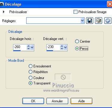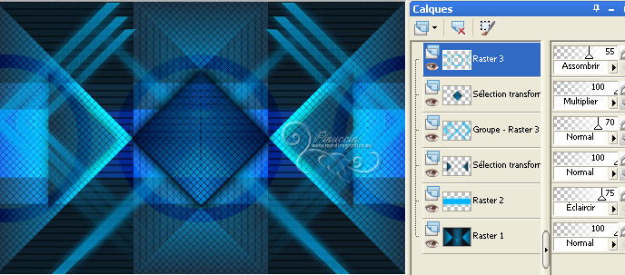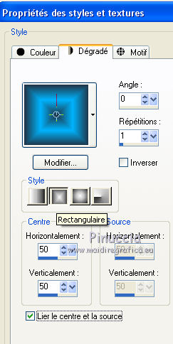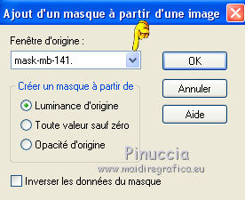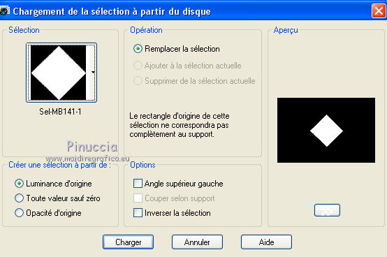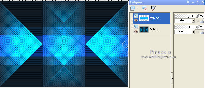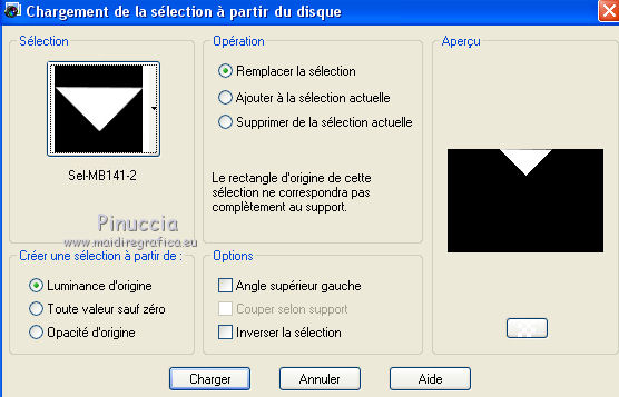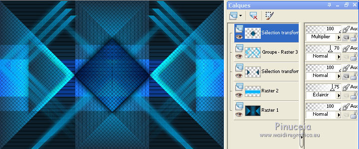 Pour traduire ce tutoriel j'ai utilisé Corel X2, mais il peut également être exécuté avec les autres versions. Suivant la version utilisée, vous pouvez obtenir des résultats différents. Depuis la version X4, la fonction Image>Miroir a été remplacée par Image>Renverser horizontalement, et Image>Renverser avec Image>Renverser verticalement. Dans les versions X5 et X6, les fonctions ont été améliorées par la mise à disposition du menu Objets. Dans la nouvelle version X7, nous avons à nouveau Miroir/Renverser, mais avec autres différences. Voir plus les détails à ce sujet ici Certaines dénominations ont changées entre les versions de PSP. Les plus frequentes dénominations utilisées: ![]() Traduction en italien ici Vos versions ici Nécessaire pour réaliser ce tutoriel: Matériel qui Modules Externes consulter, si nécessaire, ma section de filtre ici Filters Unlimited 2.0 ici AP 01 Innovations - Lines SilverLining ici Simple - Pizza Slice Mirror ici Toadies - What are you ici L&K - L&K Maxime ici Alien Skin Eye Candy 5 Impact - Glass ici Filtres Simple et Toadies peuvent être utilisés seuls ou importés dans Filters Unlimited. voir comment le faire ici). Si un filtre est fourni avec cette icône, ![]() Si vous voulez utiliser vos propres couleurs, n'hésitez pas à changer le mode et l'opacité des calques Placer les sélections dans le dossier Sélections. Ouvrir le masque dans PSP et le minimiser avec le reste du matériel. 1. Placer en avant plan la couleur #213547, et en arrière plan la couleur #00b4fe. ![]() Préparer un dégradé de premier plan/arrière plan, style Rectangulaire. ![]() Ouvrir une nouvelle image transparente 900 x 600 pixels Remplir l'image du dégradé.2. Effets>Modules Externes>AP 01 Innovations - Lines SilverLining. ![]() 3. Effets>Modules Externes>Simple - Pizza Slice Mirror. Édition>Répéter Pizza Slice Mirror. 4. Calques>Dupliquer. Image>Miroir. Réduire l'opacité de ce calque à 50%. Calques>Fusionner>Fusionner le calque de dessous. 5. Calques>Nouveau calque raster. Activer l'outil Sélection ![]() (peu importe le type de sélection, parce que avec la sélection personnalisée vous obtenez toujours un rectangle), cliquer sur Sélection personnalisée ![]() et setter ces paramètres. ![]() Remplir la sélection avec la couleur claire d'arrière plan.Sélections>Désélectionner tout. 6. Effets>Modules Externes>Filters Unlimited 2.0 - Toadies - What are you. ![]() Placer le calque en mode Éclaircir et réduire l'opacité à 75% (ou en fonction de vos couleurs). ![]() 7. Vous positionner sur le calque du bas de la pile - Raster 1. Sélections>Charger/Enregistrer une sélection>Charger à partir du disque. Chercher et charger la sélection Sel-MB141-2. ![]() Sélections>Transformer la sélection en calque. Sélections>Désélectionner tout. 8. Calques>Agencer>Placer en haut de la pile. Image>Rotation libre - 90 degrés à gauche. ![]() 9. Effets>Effets d'image>Décalage. ![]() Calques>Dupliquer. Image>Miroir. Calques>Fusionner>Fusionner le calque de dessous. 10. Effets>Effets 3D>Ombre portée, couleur noire. ![]() 11. Calques>Nouveau calque raster. Remplir avec la couleur claire d'arrière plan.Calques>Nouveau calque de masque>A partir d'une image. Ouvrir le menu deroulant sous la fenêtre d'origine et vous verrez la liste des images ouverts. Sélectionner le masque mb-141. ![]() Calques>Fusionner>Fusionner le groupe. Réduire l'opacité de ce calque à 70%. Réglage>Netteté>Davantage de netteté. 12. Vous positionner sur le calque du bas de la pile - Raster 1. Sélections>Charger/Enregistrer une sélection>Charger à partir du disque. Chercher et charger la sélection Sel-MB141-1. ![]() Sélections>Transformer la sélection en calque. Sélections>Désélectionner tout. Calques>Agencer>Placer en haut de la pile. 13. Effets>Modules Externes>Alien Skin Eye Candy 5 Impact - Glass. Sélectionner le preset Clear et ok. ![]() 14. Effets>Effets 3D>Ombre portée, comme précédemment. ![]() Placer le calque en mode Multiplier (ou en fonction de vos couleurs). ![]() 15. Sélections>Charger/Enregistrer une sélection>Charger à partir du disque. Chercher et charger la sélection Sel-MB141-3. ![]() Calques>Nouveau calque raster. Remplir la sélection avec la couleur claire d'arrière plan.Sélections>Modifier>Contracter - 30 pixels. Presser CANC sur le clavier ![]() Sélections>Désélectionner tout. Effets>Effets d'image>Mosaïque sans jointures - Côte à côte. ![]() Placer le calque en mode Assombrir et réduire l'opacité à 55%, ou en fonction de vos couleurs. ![]() 16. Calques>Fusionner>Tous. Calques>Dupliquer. Image>Redimensionner, à 85%, redimensionner tous les calques décoché. Effets>Effets 3D>Ombre portée, comme précédemment. ![]() 17. Vous positionner sur le calque du bas de la pile. Réglage>Flou>Flou gaussien - rayon 80. ![]() Effets>Modules Externes>L & K Landsiteofwonders - L&K's Maxime. ![]() 18. Calques>Dupliquer. Vous positionner sur le calque de dessous. Calques>Transformer le calque d'arrière plan. Effets>Effets d'image>Décalage. ![]() 18. Vous positionner sur le calque de dessus de la copie. Image>Rotation libre - 90 degrés à gauche. ![]() Effets>Effets d'image>Décalage. ![]() Calques>Fusionner>Fusionner le calque de dessous. 19. Vous positionner sur le calque du haut de la pile. Activer le tube mary-270-113 - Édition>Copier. Revenir sur votre travail et Édition>Coller comme nouveau calque. Image>Redimensionner, 80%, redimensionner tous les calques décoché. Déplacer le tube à gauche.20. Effets>Effets 3D>Ombre portée, comme précédemment, ou à votre convenance. 21. Activer le tube "vlinder" - Édition>Copier. Revenir sur votre travail et Édition>Coller comme nouveau calque. Calques>Dupliquer. Image>Redimensionner, 85%, redimensionner tous les calques décoché. Image>Miroir. Déplacer les papillons à votre goût,ou voir mon exemple. 22. Activer "deco-1-141" - Édition>Copier. Revenir sur votre travail 