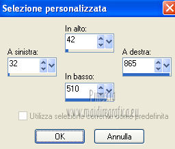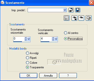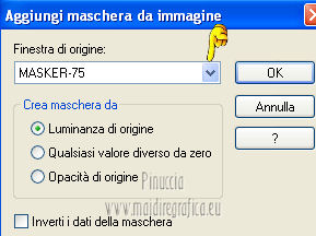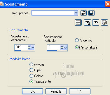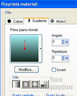qui puoi trovare qualche risposta ai tuoi dubbi. Se l'argomento che ti interessa non è presente, ti prego di segnalarmelo. Per tradurre questo tutorial ho usato Corel X, ma può essere eseguito con ogni versione di PSP. Dalla versione X4, il comando Immagine>Rifletti è stato sostituito con Immagine>Capovolgi in orizzontale, e il comando Immagine>Capovolgi con Immagine>Capovolgi in verticale. Nelle versioni X5 e X6, le funzioni sono state migliorate rendendo disponibile il menu Oggetti. Con la nuova versione X7, sono tornati Rifletti/Capovolgi, ma con nuove differenze Vedi la scheda sull'argomento qui Le vostre versioni/Vos versions qui Occorrente: Materiale qui Per il tube della donna grazie Kamalini Filtri: consulta, se necessario, la mia sezione filtri qui Filters Unlimited 2.0 qui &<Bkg Designer sf10II> (da importare in Unlimited) qui Alien Skin Eye Candy 5 Impact - Perspective Shadow qui ![]() Apri la maschera in PSP e minimizzala con il resto del materiale. Imposta il colore di primo piano con #11261d, e il colore di sfondo con #a0edf0. ![]() Passa il colore di primo piano a Gradiente, stile Lineare. ![]() 1. Apri una nuova immagine trasparente 900 x 550 pixels, e riempila con il gradiente.2. Effetti>Plugins>&<Bkg Designer sf10II> - Downstairs. ![]() 3. Apri deco56 e vai a Modifica>Copia. Torna al tuo lavoro e vai a Modifica>Incolla come nuovo livello. se stai usando altri colori, colorizza l'elemento per adattarlo a questi colori: Regola>Tonalità e saturazione>Viraggio, con i valori corrispondente al colore scelto. Sul Viraggio vedi qui 4. Effetti>Effetti di immagine>Scostamento. ![]() 5. Imposta il colore di primo piano con il colore bianco #ffffff. Livelli>Nuovo livello raster. Riempi il livello con il colore bianco.6. Livelli>Nuovo livello maschera>Da immagine. Apri il menu sotto la finestra di origine e vedrai la lista dei files aperti. Seleziona la maschera masker-75, con i seguenti settaggi: ![]() Livelli>Unisci>Unisci gruppo. Effetti>Effetti di bordo>Aumenta. 7. Apri deco-13 e vai a Modifica>Copia. Torna al tuo lavoro e via a Modifica>Incolla come nuovo livello. Spostalo a sinistra, come nel mio esempio.Cambia la modalità di miscelatura di questo livello in Luce diffusa, e abbassa l'opacità al 40%. 8. Attiva lo strumento Selezione ,clicca sull'icona Selezione personalizzata ![]() e imposta i seguenti settaggi: ![]() Selezione>Inverti. Premi sulla tastiera il tasto CANC ![]() Selezione>Deseleziona. 9. Apri il tube deco55 e vai a Modifica>Copia. Torna al tuo lavoro e via a Modifica>Incolla come nuovo livello. 10. Effetti>Effetti di immagine>Scostamento. ![]() 11. Livelli>Duplica. Immagine>Rifletti. 12. Apri il tube Kamalini-07, e vai a Modifica>Copia. Torna al tuo lavoro e via a Modifica>Incolla come nuovo livello. Immagine>Ridimensiona, 3 volte all'80%, tutti i livelli non selezionato. Sposta il tube come nel mio esempio.13. Effetti>Plugins>Alien Skin Eye Candy 5 Impact - Perspective Shadow. Seleziona il preset Drop Shadow Blurry e ok. ![]() 14. Immagine>Aggiungi bordatura, 2 pixels, simmetriche, con il colore nero. 15. Immagine>Ridimensiona, a 900 pixels di larghezza, tutti i livelli selezionato. 16. Aggiungi il tuo nome e/o il tuo watermark su un nuovo livello. 17. Livelli>Unisci>Unisci tutto e salva in formato jpg. Per questo esempio ho usato un tube di Maryse. ![]() ![]() Se hai problemi o dubbi, o trovi un link non funzionante, o anche soltanto per un saluto, scrivimi. 3 Aprile 2013 |