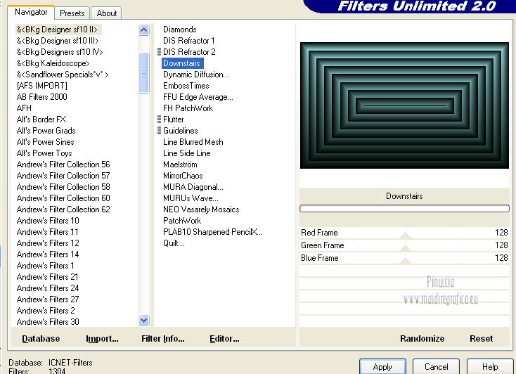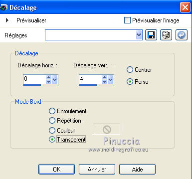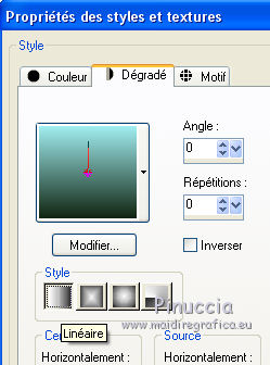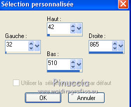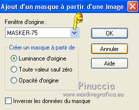 Pour traduire ce tutoriel j'ai utilisé Corel X2, mais il peut également être exécuté avec les autres versions. Suivant la version utilisée, vous pouvez obtenir des résultats différents. Depuis la version X4, la fonction Image>Miroir a été remplacée par Image>Renverser horizontalement, et Image>Renverser avec Image>Renverser verticalement. Dans les versions X5 et X6, les fonctions ont été améliorées par la mise à disposition du menu Objets. Dans la nouvelle version X7, nous avons à nouveau Miroir/Renverser, mais avec autres différences. Voir plus les détails à ce sujet ici Certaines dénominations ont changées entre les versions de PSP. Les plus frequentes dénominations utilisées: ![]() Traduction en italien ici Vos versions ici Nécessaire pour réaliser ce tutoriel: Matériel qui Pour le tube merci Kamalini Modules Externes consulter, si nécessaire, ma section de filtre ici Filters Unlimited 2.0 ici &<Bkg Designer sf10II> (da importare in Unlimited) ici Alien Skin Eye Candy 5 Impact - Perspective Shadow ici ![]() Si vous voulez utiliser vos propres couleurs, n'hésitez pas à changer le mode et l'opacité des calques Ouvrir le masque dans PSP et le minimiser avec le reste du matériel. 1. Placer en avant plan la couleur #11261d, et en arrière plan la couleur #a0edf0. ![]() Préparer un Dégradé de premier plan/arrière plan, style Linéaire. ![]() Ouvrir une nouvelle image transparente 900 x 550 pixels Remplir l'image du dégradé.2. Effets>Modules Externes>&<Bkg Designer sf10II> - Downstairs. ![]() 3. Apctiver deco56, Édition>Copier. Revenir sur votre travail et Édition>Coller comme nouveau calque. si vous utilisez autres couleur, coloriser l'élément en fonction de vos couleurs. Réglage>Teinte et Saturation>Coloriser, avec les valeurs de votre couleur. 4. Effets>Effets d'image>Décalage. ![]() 5. Placer en avant plan la couleur blanche #ffffff. Calques>Nouveau calque raster. Remplir le calque avec la couleur blanche.6. Calques>Nouveau calque de masque>A partir d'une image. Ouvrir le menu deroulant sous la fenêtre d'origine et vous verrez la liste des images ouverts. Sélectionner le masque masker75. ![]() Calques>Fusionner>Fusionner le groupe. Effets>Effets de bords>Accentuer. 7. Activer deco-13, Édition>Copier. Revenir sur votre travail et Édition>Coller comme nouveau calque. Déplacer à gauche, voir mon exemple.Placer le calque en mode Lumière douce et réduire l'opacité à 40%. 8. Activer l'outil Sélection ![]() (peu importe le type de sélection, parce que avec la sélection personnalisée vous obtenez toujours un rectangle), cliquer sur Sélection personnalisée ![]() et setter ces paramètres. ![]() Sélections>Inverser. Presser CANC sur le clavier ![]() Sélections>Désélectionner tout. 9. Activer le tube deco55, Édition>Copier. Revenir sur votre travail et Édition>Coller comme nouveau calque. 10. Effets>Effets d'image>Décalage. ![]() 11. Calques>Dupliquer. Image>Miroir. 12. Activer tube Kamalini-07, Édition>Copier. Revenir sur votre travail et Édition>Coller comme nouveau calque. Image>Redimensionner, 3 volte all'80%, redimensionner tous les calques décoché. Déplacer le tube comme dans mon exemple.13. Effets>Modules Externes>Alien Skin Eye Candy 5 Impact - Perspective Shadow. Sélectionner le preset Drop Shadow Blurry et ok. ![]() 14. Image>Ajouter des bordures, 2 pixels, simmetriche, con il colore nero. 15. Image>Redimensionner, a 900 pixels di larghezza, tutti i livelli selezionato. 16. Signer votre travail sur un nouveau calque. 17. Calques>Fusionner>Tous et enregistrer en jpg. Le tube de cette version è de Maryse. ![]() ![]() Si vous avez des problèmes, ou des doutes, ou vous trouvez un link modifié, ou seulement pour me dire que ce tutoriel vous a plu, vous pouvez m'écrire. 3 Juin 2015 |