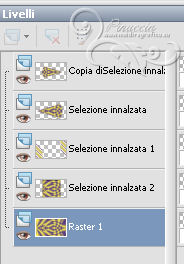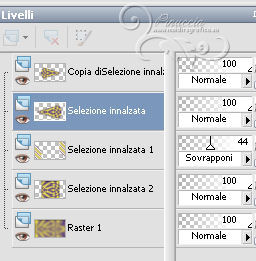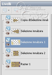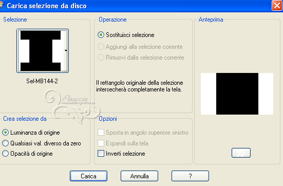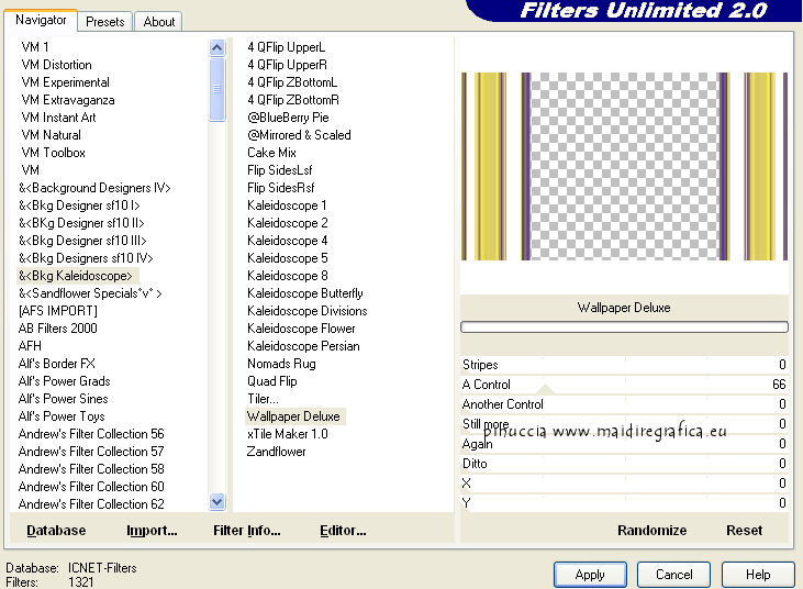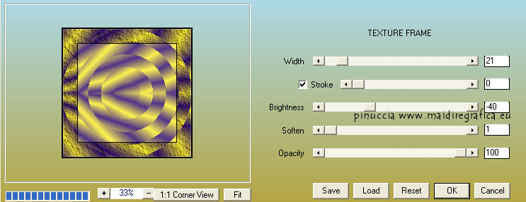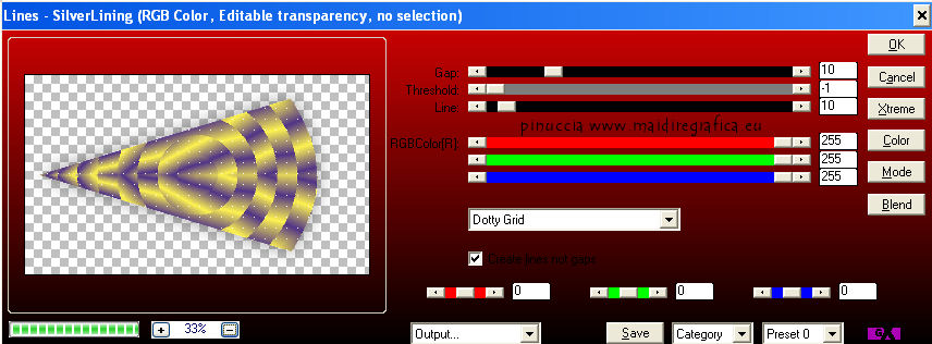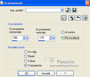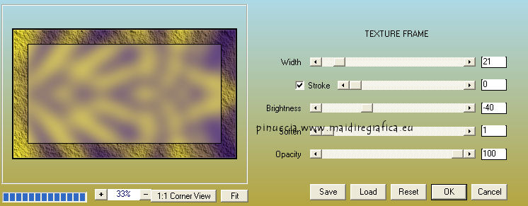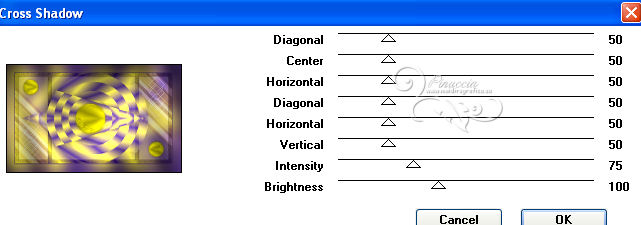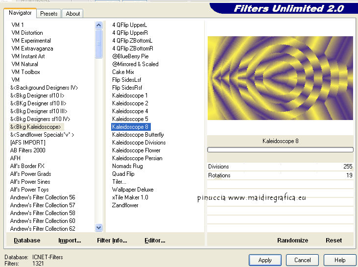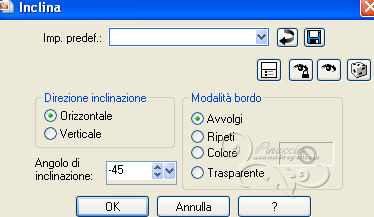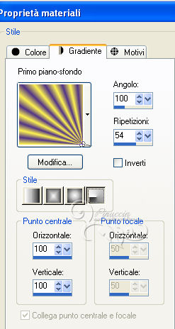 qui puoi trovare qualche risposta ai tuoi dubbi. Se l'argomento che ti interessa non è presente, ti prego di segnalarmelo. Per tradurre questo tutorial ho usato PSP X, ma può essere eseguito anche con le altre versioni. Dalla versione X4, il comando Immagine>Rifletti è stato sostituito con Immagine>Capovolgi in orizzontale, e il comando Immagine>Capovolgi con Immagine>Capovolgi in verticale. Nelle versioni X5 e X6, le funzioni sono state migliorate rendendo disponibile il menu Oggetti. Vedi la scheda sull'argomento qui Con il nuovo CorelX17 sono tornati Rifletti/Capovolgi, ma con nuove differenze. Vedi la scheda sull'argomento qui Traduzione francese qui Le vostre versioni qui Occorrente: Materiale qui Il tube è di Gabry. Filtri: consulta, se necessario, la mia sezione filtri qui Filters Unlimited 2.0 qui &<Bkg Kaleidoscope> (da importare in Unlimited) qui VM Distortion qui AP 01 Innovations - Lines SilverLining qui Graphics Plus - Cross Shadow qui AAA Frames - Texture Frame qui Alien Skin Eye Candy 5 Impact qui I filtri VM Distortion e Graphics Plus si possono usare da soli o importati in Filters Unlimited. (come fare vedi qui). Se un filtro fornito appare con questa icona ![]() Nelle ultime versioni di PSP non c'è il gradiente di primo piano/sfondo (Corel_06_029) Trovi i gradienti delle versioni precedenti qui Metti le selezioni nella cartella Selezioni. Imposta il colore di primo piano con #fdf250, e il colore di sfondo con #503387. ![]() Passa il colore di primo piano a Gradiente, stile Radiale, con i seguenti settaggi. ![]() 1. Apri una nuova immagine trasparente 950 x 550 pixels, e riempila con il gradiente.2. Effetti>Plugins>Filters Unlimited - VM Distortion - Slicer, con i settaggi standard. ![]() 3. Effetti>Plugins>&<Bkg Kaleidoscope> - Kaleidoscope 8. ![]() 4. Selezione>Carica/Salva selezione>Carica selezione da disco. Cerca e carica la selezione Sel-MB144-1. ![]() Selezione>Innalza selezione a livello. Effetti>Effetti 3D>Sfalsa ombra, con il colore nero. ![]() Selezione>Deseleziona. 5. Livelli>Duplica. Immagine>Rifletti. Immagine>Ridimensiona, all'80%, tutti i livelli non selezionato. 6. Effetti>Effetti di immagine>Scostamento. ![]() 7. Attiva il livello inferiore - Raster 1. ![]() 8. Selezione>Carica/Salva selezione>Carica selezione da disco. Cerca e carica la selezione Sel-MB144-2. ![]() Selezione>Innalza selezione a livello. 9. Effetti>Plugins>&<Bkg Kaleidoscope> - Kaleidoscope - Wallpaper Deluxe, con i settaggi standard. ![]() Selezione>Deseleziona. 10. Effetti>Effetti geometrici>Inclina. ![]() 11. Selezione>Carica/Salva selezione>Carica selezione da disco. Carica nuovamente la selezione Sel-MB144-2. ![]() Selezione>Inverti. Premi sulla tastiera il tasto CANC ![]() Mantieni selezionato. 12. Attiva il livello inferiore - Raster 1. ![]() Selezione>Innalza selezione a livello. 13. Effetti>Plugins>AAA Frames - Texture Frame. ![]() Selezione>Deseleziona. 14. Attiva nuovamente il livello inferiore - Raster 1. ![]() Regola>Sfocatura>Sfocatura gaussiana - raggio 30. ![]() 15. Effetti>Plugins>AAA Frames - Texture Frame. ![]() 16. Attiva il livello centrale (selezione innalzata 1). ![]() Cambia la modalità di miscelatura di questo livello in Sovrapponi (o secondo i tuoi colori) e abbassa l'opacità al 44%. 17. Attiva il livello soprastante (selezione innalzata). ![]() Effetti>Plugins>AP Innovations - Linea SilverLining. ![]() Abbassa l'opacità di questo livello al 60% (o secondo i tuoi colori). 18. Regola>Aggiungi/Rimuovi disturbo>Aggiungi disturbo. ![]() 19. Apri deco-1-144 e vai a Modifica>Copia. Torna al tuo lavoro e vai a Modifica>Incolla come nuovo livello. Effetti>Effetti di immagine>Scostamento. ![]() 20. Livelli>Duplica. Immagine>Ridimensiona, al 50%, tutti i livelli non selezionato. Effetti>Effetti di immagine>Scostamento. ![]() 21. Apri deco-144-2 e vai a Modifica>Copia. Torna al tuo lavoro e vai a Modifica>Incolla come nuovo livello. Effetti>Effetti di immagine>Scostamento. ![]() 22. Livelli>Unisci>Unisci giù. Livelli>Duplica. Immagine>Rifletti. Immagine>Capovolgi. 23. Immagine>Aggiungi bordatura, 2 pixels, simmetriche, con il colore di sfondo. Modifica>Copia. 24. Immagine>Aggiungi bordatura, 45 pixels, simmetriche, con il colore di primo piano. Attiva lo strumento Bacchetta magica , sfumatura e tolleranza 0,e clicca nel bordo chiaro per selezionarlo. Modifica>Incolla nella selezione. 25. Regola>Sfocatura>Sfocatura gaussiana - raggio 30. ![]() 26. Effetti>Plugins>Graphics Plus - Cross Shadow. ![]() Selezione>Inverti. Effetti>Effetti 3D>Sfalsa ombra, con il colore nero. ![]() Selezione>Deseleziona. 27. Apri il tube Gabry-woman 177 e vai a Modifica>Copia. Torna al tuo lavoro e vai a Modifica>Incolla come nuovo livello. Spostalo in basso a destra,vedi il mio esempio. 28. Effetti>Plugins>Alien Skin Eye Candy 5 Impact - Perspective Shadow. Seleziona il preset Drop Shadow Blurry e ok. ![]() 29. Aggiungi il tuo nome e/o il tuo watermark su un nuovo livello. 30. Immagine>Aggiungi bordatura, 2 pixels, simmetriche, con il colore di sfondo. 31. Immagine>Ridimensiona, a 900 pixels di larghezza, tutti i livelli selezionato. Salva in formato jpg. Per questi esempi ho usato tubes di Radyga ![]() TalaNat ![]() ![]() Se hai problemi o dubbi, o trovi un link non funzionante, o anche soltanto per un saluto, scrivimi. 19 Aprile 2013 |