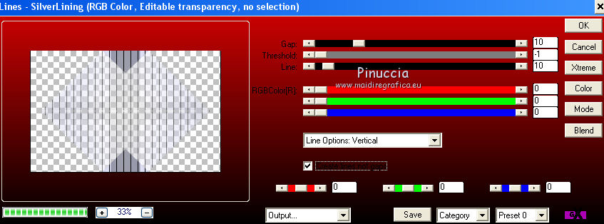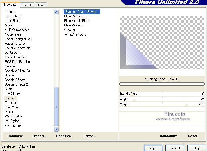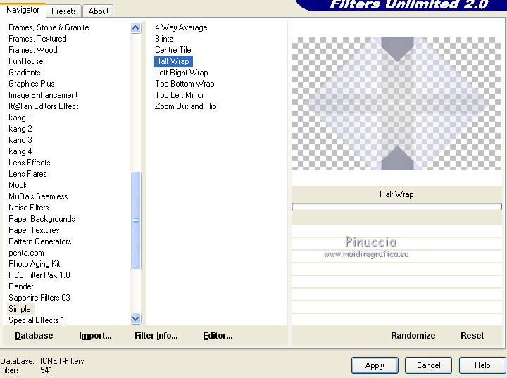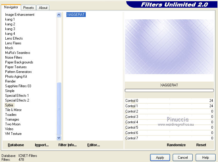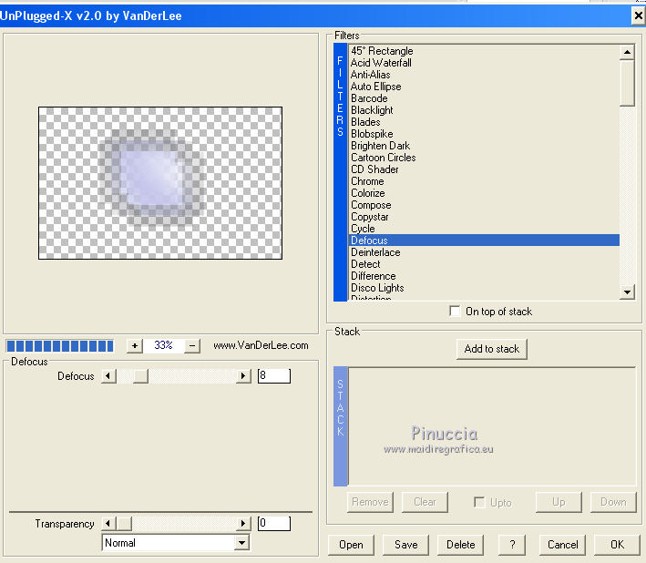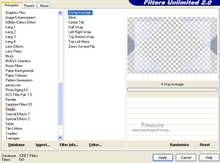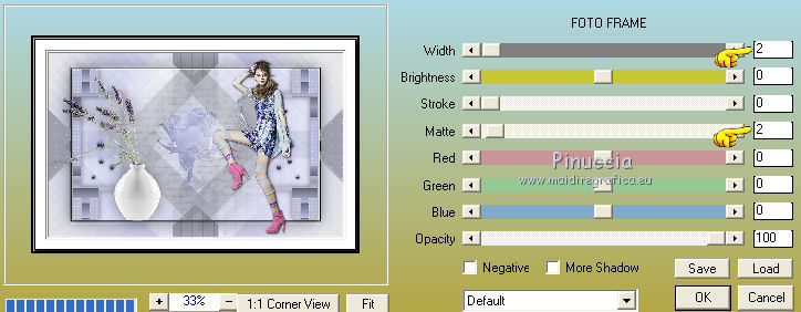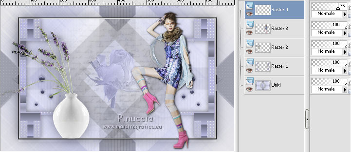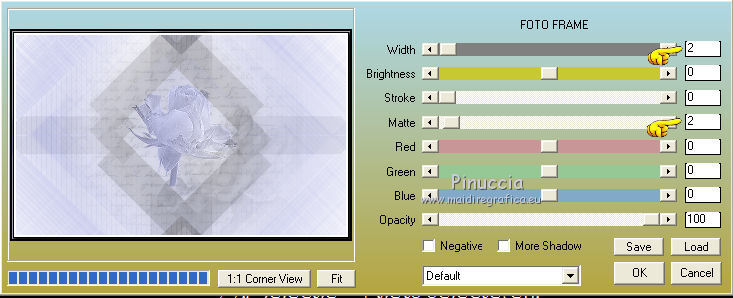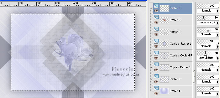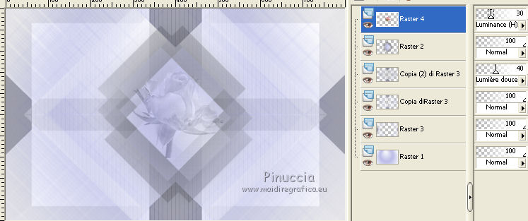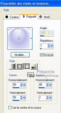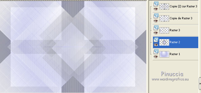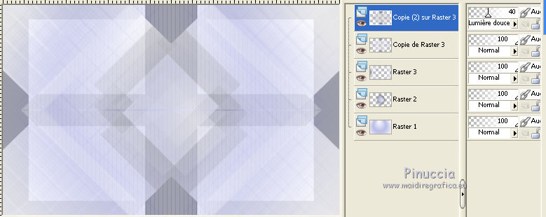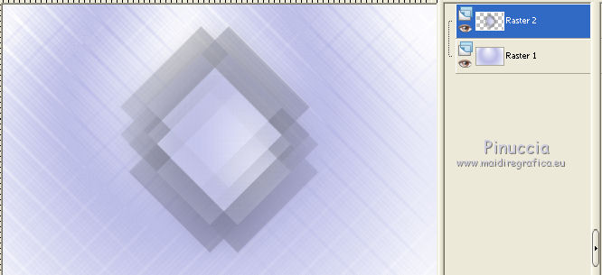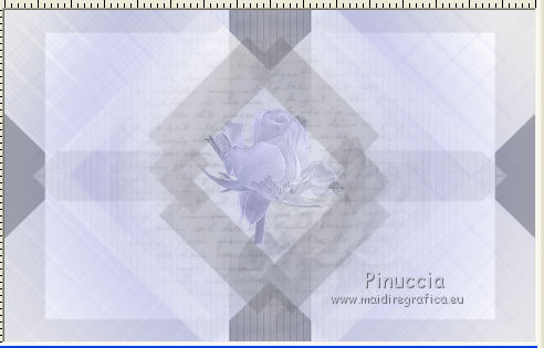 Pour traduire ce tutoriel j'ai utilisé CorelX et CorelX2. Suivant la version utilisée, vous pouvez obtenir des résultats différents. Depuis la version X4, la fonction Image>Miroir a été remplacée par Image>Renverser horizontalement, et Image>Renverser avec Image>Renverser verticalement. Dans les versions X5 et X6, les fonctions ont été améliorées par la mise à disposition du menu Objets. Dans la nouvelle version X7, nous avons à nouveau Miroir/Renverser, mais avec autres différences. Voir plus les détails à ce sujet ici Certaines dénominations ont changées entre les versions de PSP. Les plus frequentes dénominations utilisées: ![]() Traduction en italien ici Vos versions ici Nécessaire pour réaliser ce tutoriel: Matériel qui Les tubes sont de JHanna, Maryse et Nicole. Modules Externes consulter, si nécessaire, ma section de filtre ici Filters Unlimited 2.0 ici Sybia - Xaggerate ici AAA Frames - Foto Frame ici VanDerLee - Unplugged-X ici Simple ici Simple - Half Wrap (bonus) ici AP 01 Innovations - Lines SilverLining ici Toadies - Sucking Toad Bevel 1 ici Filtres Sybia, Simple et Toadies peuvent être utilisés seuls ou importés dans Filters Unlimited. voir comment le faire ici). Si un filtre est fourni avec cette icône, ![]() Si vous voulez utiliser vos propres couleurs, n'hésitez pas à changer le mode et l'opacité des calques Dans les nouvelles versions de PSP vous ne trouvez pas le dégradé de premier plan/arrière plan (Corel_06_029). Les dégradés des versions précédentes ici Placer les sélections dans le dossier Sélection. 1. Placer en avant plan la couleur #b9bbe7, et en arrière plan la couleur blanche #ffffff. ![]() Préparer un dégradé de premier plan/arrière plan, style Halo. ![]() 2. Ouvrir une nouvelle image transparente 800 x 500 pixels Remplir l'image du dégradé.3. Effets>Modules Externes>Filters Unlimited 2.0 - Sybia - Xaggerate, par défaut. ![]() 4. Calques>Dupliquer. Image>Rotation libre - 90 degrés à droite. ![]() 5. Vous positionner sur le calque du bas de la pile - Raster 1. Sélections>Sélectionner tout. Image>Recadrer sur la sélection. 6. Vous positionner sur le calque du haut de la pile - Copie de Raster 1. Image>Redimensionner, à 75%, redimensionner tous les calques décoché. Édition>Répéter Redimensionnement. 7. Effets>Effets d'image>Mosaïque sans jointures. Sélectioner le preset Bégaiement diagonale et ok. ![]() 8. Image>Redimensionner, à 75%, redimensionner tous les calques décoché. 9. Effets>Modules Externes>VanDerLee - Unplugged-X - Defocus. ![]() 10. Image>Rotation libre - 45 degrés à droite. ![]() 11. Effets>Effets 3D>Ombre portée, couleur noire. ![]() 12. Objets>Aligner>Centrer sur le support. Ce commande est disponible seulement après la versione X5 de PSP. Dans les versions précédentes, pour placer un calque au centre: Édition>Couper. Édition>Coller comme nouveau calque (supprimer le calque vide de dessous et revenir sur le calque du haut de la pile). ![]() 13. Activer Deco-mb-punt-145 - Édition>Copier. Revenir sur votre travail et Édition>Coller comme nouveau calque. Déplacer le tube dans le coin en bas à gauche.14. Effets>Modules Externes>Filters Unlimited 2.0 - Toadies - Sucking Toad Bevel 1. ![]() 15. Calques>Dupliquer. Image>Miroir. Image>Renverser. Calques>Fusionner>Fusionner le calque de dessous. 16. Effets>Modules Externes>Filters Unlimited 2.0 - Simple - 4way average. ![]() 17. Calques>Dupliquer. Effets>Modules Externes>Filters Unlimited 2.0 - Simple - Half Wrap. ![]() 18. Calques>Dupliquer. Effets>Modules Externes>AP 01 Innovations - Lines SilverLining. ![]() Placer le calque en mode Lumière douce et réduire l'opacité à 40%. ![]() 19. Vous positionner sur le calque copie de Raster 1 le deuxième calque du bas: si pour centrer le calque vous avez utiliser Édition>Couper/Coller, le calque sera Raster 2). ![]() Calques>Agencer>Placer en haut de la pile. 20. Activer le tube JHanna_667a pink rose - Édition>Copier. Revenir sur votre travail et Édition>Coller comme nouveau calque. Image>Redimensionner, al 35%, redimensionner tous les calques décoché. Placer le calque en mode Luminance (héritée) et réduire l'opacité à 30%. ![]() Réglage>Netteté>Davantage de netteté. 21. Activer le tube Benice_L141_misted - Édition>Copier. Revenir sur votre travail et Édition>Coller comme nouveau calque. Réduire l'opacité de ce calque à 50%. Calques>Agencer>Déplacer vers le bas. Activer l'outil Gomme ![]() ![]() et effacer le texte visible sur la fleur. (Alternativement, vous pouvez faire ainsi: Vous positionner sur le calque de la fleur. Sélections>Sélectionner tout. Sélections>Flottante. Sélections>Statique. Vous positionner sur le calque du texte. Presser CANC sur le clavier ![]() Sélections>Désélectionner tout. ![]() À nouveau vous positionner sur le calque du haut de la pile). 22. Calques>Nouveau calque raster. Activer l'outil Sélection ![]() (peu importe le type de sélection, parce que avec la sélection personnalisée vous obtenez toujours un rectangle), cliquer sur Sélection personnalisée ![]() et setter ces paramètres. ![]() Effets>Effets 3D>Ombre portée. ![]() Garder sélectionné. ![]() 23. Calques>Fusionner>Calques visibles. 24. Effets>Modules Externes>AAA Frames - Foto Frame. ![]() Sélections>Désélectionner tout. 25. Activer Deco-mb-145-1 - Édition>Copier. Revenir sur votre travail et Édition>Coller comme nouveau calque. 26. Activer le tube MR_Pot Lavande - Édition>Copier. Revenir sur votre travail et Édition>Coller comme nouveau calque. Image>Redimensionner, 2 fois à 80%, redimensionner tous les calques décoché. Déplacer le tube à gauche, voir mon exemple.27. Effets>Effets 3D>Ombre portée, comme précédemment. Réglage>Netteté>Netteté. 28. Activer le tube nicole-femme58-2013 - Édition>Copier. Revenir sur votre travail et Édition>Coller comme nouveau calque. Image>Miroir. Image>Redimensionner, al 60%, redimensionner tous les calques dé