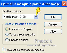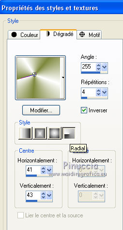Pour traduire ce tutoriel j'ai utilisé CorelX et CorelX2. Suivant la version utilisée, vous pouvez obtenir des résultats différents. Depuis la version X4, la fonction Image>Miroir a été remplacée par Image>Renverser horizontalement, et Image>Renverser avec Image>Renverser verticalement. Dans les versions X5 et X6, les fonctions ont été améliorées par la mise à disposition du menu Objets. Dans la nouvelle version X7, nous avons à nouveau Miroir/Renverser, mais avec autres différences. Voir plus les détails à ce sujet ici Certaines dénominations ont changées entre les versions de PSP. Les plus frequentes dénominations utilisées: ![]() Traduction en italien ici Vos versions ici Nécessaire pour réaliser ce tutoriel: Matériel qui Le tube est de Katrina. Modules Externes consulter, si nécessaire, ma section de filtre ici AAA Frames - Texture Frame ici AP 01 Innovations - Lines SilverLining ici ![]() Si vous voulez utiliser vos propres couleurs, n'hésitez pas à changer le mode et l'opacité des calques Dans les nouvelles versions de PSP vous ne trouvez pas le dégradé de premier plan/arrière plan (Corel_06_029). Les dégradés des versions précédentes ici Placer les sélections dans le dossier Sélection. Ouvrir le masque dans PSP et le minimiser avec le reste du matériel. 1. Placer en avant plan la couleur #ffffff, et en arrière plan la couleur #7d873b. ![]() Préparer un dégradé de premier plan/arrière plan, style Radial. ![]() 2. Ouvrir une nouvelle image transparente 900 x 550 pixels Remplir l'image du dégradé.3. Réglage>Flou>Flou gaussien - rayon 40. ![]() 4. Calques>Nouveau calque raster. Placer en avant plan la Couleur. Remplir avec la couleur blanche.5. Calques>Nouveau calque de masque>A partir d'une image. Ouvrir le menu deroulant sous la fenêtre d'origine et vous verrez la liste des images ouverts. Sélectionner le masque Narah_mask_0428. ![]() Calques>Fusionner>Fusionner le groupe. 6.. Calques>Dupliquer. Image>Miroir. Image>Renverser. Calques>Fusionner>Fusionner le calque de dessous. 7. Activer deco-mb-146 - Édition>Copier. Revenir sur votre travail et Édition>Coller comme nouveau calque. 8. Effets>Effets d'image>Décalage. ![]() 9. Activer l'outil Baguette magique ![]() et cliquer au centre de l'image pour la sélectionner. ![]() 10. Calques>Nouveau calque raster. Placer à nouveau le dégradé en avant plan et remplir le calque du dégradé.11. Réglage>Flou>Flou gaussien - rayon 40. ![]() 12. Effets>Modules Externes>AP 01 Innovations - Lines SilverLining. ![]() 13. Effets>Effets 3d>Ombre portée, couleur noire. ![]() Sélections>Désélectionner tout. 14. Activer decoMB-2-146 - Édition>Copier. Revenir sur votre travail et Édition>Coller comme nouveau calque. Effets>Effets d'image>Décalage. ![]() 15. Effets>Modules Externes>Simple - Top Left Mirror. 16. Calques>Dupliquer. Vous positionner sur le calque de dessous de l'original. Image>Redimensionner, à 80%, redimensionner tous les calques décoché. Effets>Modules Externes>Simple - Diamonds. Réduire l'opacité de ce calque à 50%. ![]() 17. Vous positionner sur le calque de dessus de la copie. Effets>Effets géométriques>Cercle. ![]() 18. Activer deco-Mb-3-146 - Édition>Copier. Revenir sur votre travail et Édition>Coller comme nouveau calque. 19. Activer Deco-knop-1-146 - Édition>Copier. Revenir sur votre travail et Édition>Coller comme nouveau calque. 20. Calques>Dupliquer. Image>Redimensionner, à 50%, redimensionner tous les calques décoché. 21. Effets>Effets d'image>Décalage. ![]() 22. Calques>Dupliquer. Image>Miroir. Calques>Fusionner>Fusionner le calque de dessous. À nouveau Calques>Fusionner>Fusionner le calque de dessous. 23. Effets>Effets 3d>Ombre portée, couleur noire. ![]() 24. Image>Ajouter des bordures, 2 pixels, symétrique, couleur foncée. Sélections>Sélectionner tout. Image>Ajouter des bordures, 40 pixels, symétrique, couleur blanche. Sélections>Inverser. Remplir du dégradé.24. Réglage>Flou>Flou gaussien - rayon 40. ![]() 25. Effets>Modules Externes>AAA Frames - Texture Frame. ![]() 26. Sélections>Inverser. Effets>Effets 3d>Ombre portée, couleur noire. ![]() Sélections>Désélectionner tout. 27. Activer le tube NP 1165 - Édition>Copier. Revenir sur votre travail et Édition>Coller comme nouveau calque. Image>Miroir. Image>Redimensionner, à 70%, redimensionner tous les calques décoché. Réglage>Netteté>Netteté. Déplacer le tube à gauche.28. Effets>Effets 3d>Ombre portée, couleur noire. ![]() 29. Image>Ajouter des bordures, 2 pixels, symétrique, couleur foncée. 30. Signer votre travail sur un nouveau calque. Calques>Fusionner>Tous. Image>Redimensionner, 900 pixels de largeur, redimensionner tous les calques coché. Enregistrer en jpg. Le tube de cette version est de Guismo. ![]() ![]() Si vous avez des problèmes, ou des doutes, ou vous trouvez un link modifié, ou seulement pour me dire que ce tutoriel vous a plu, vous pouvez m'écrire. 18 Avril 2015 |