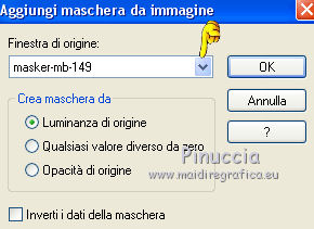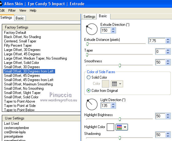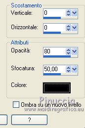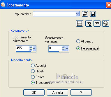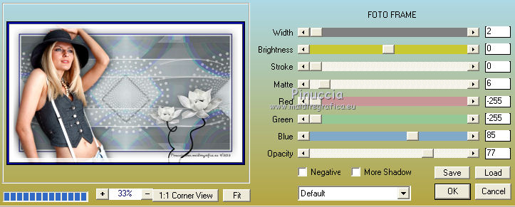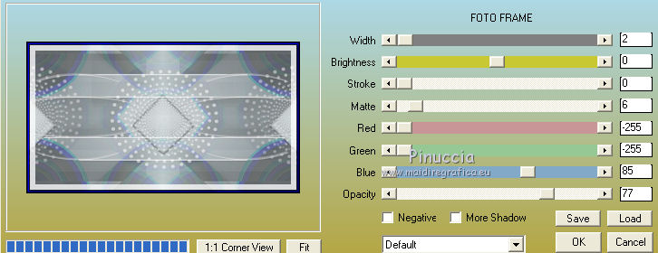 qui puoi trovare qualche risposta ai tuoi dubbi. Se l'argomento che ti interessa non è presente, ti prego di segnalarmelo. Per tradurre questo tutorial ho usato PSP X, ma può essere realizzato anche con le altre versioni di PSP. Dalla versione X4, il comando Immagine>Rifletti è stato sostituito con Immagine>Capovolgi in orizzontale, e il comando Immagine>Capovolgi con Immagine>Capovolgi in verticale. Nelle versioni X5 e X6, le funzioni sono state migliorate rendendo disponibile il menu Oggetti. Vedi la scheda sull'argomento qui Traduzione in francese qui Le vostre versioni qui Occorrente: Materiale qui Il tube è di Kamalini Filtri: consulta, se necessario, la mia sezione filtri qui AAA Frames - Foto Frame qui Alien Skin Eye Candy 5 Impact qui ![]() se stai usando altri colori, sperimenta le modalità di miscelatura e opacità più adatte ai tuoi colori Metti la selezione nella cartella Selezioni. Apri la maschera in PSP e minimizzala con il resto del materiale. 1. Imposta il colore di primo piano con #ffffff, e il colore di sfondo con #253039 ![]() 2. Apri una nuova immagine trasparente 900 x 500 pixels. 3. Selezione>Seleziona tutto. Apri Achtergrond-149 e vai a Modifica>Copia. Torna al tuo lavoro e vai a Modifica>Incolla nella selezione. Selezione>Deseleziona. 4. Livelli>Nuovo livello raster. Riempi con il colore bianco di primo piano.5. Livelli>Nuovo livello maschera>Da immagine. Apri il menu sotto la finestra di origine e vedrai la lista dei files aperti. Seleziona la maschera masker-mb-149, con i seguenti settaggi: ![]() Livelli>Unisci>Unisci gruppo. Regola>Messa a fuoco>Metti a fuoco. 6. Attiva lo strumento Penna ,linea di stile Pieno, larghezza 3 pixels ![]() Traccia due linee come nell'esempio, tenendo premuto il tasto della maiuscola, per ottenere linee perfettamente diritte. ![]() Livelli>Converti in livello raster. 7. Livelli>Duplica. Immagine>Capovolgi. Livelli>Unisci>Unisci giù. 8. Livelli>Duplica. Effetti>Effetti geometrici>Cerchio. ![]() 9. Effetti>Effetti di immagine>Scostamento. ![]() 10. Livelli>Duplica. Immagine>Rifletti. Livelli>Unisci>Unisci giù. 11. Effetti>Plugins>Alien Skin Eye Candy 5 Impact - Extrude. ![]() Abbassa l'opacità di questo livello al 53%. 12. Attiva il livello inferiore - Raster 1. Selezione>Carica/Salva selezione>Carica selezione da disco. Cerca e carica la selezione mb-149-1. ![]() 13. Selezione>Innalza selezione a livello. Selezione>Deseleziona. 14. Effetti>Plugins>Alien Skin Eye Candy 5 Impact - Glass. Seleziona il preset Clear e ok. ![]() 15. Livelli>Duplica. Effetti>Effetti di immagine>Scostamento. ![]() 16. Livelli>Duplica. Immagine>Rifletti. Livelli>Unisci>Unisci tutto. 17. Effetti>Plugins>AAA Frames - Foto Frame. ![]() 18. Selezione>Seleziona tutto. Immagine>Aggiungi bordatura, 50 pixels, simmetriche, con il colore bianco. Effetti>Effetti 3D>Sfalsa ombra, colore nero. ![]() Selezione>Deseleziona. 19. Apri il tube Kamalini-192 e vai a Modifica>Copia. Torna al tuo lavoro e vai a Modifica>Incolla come nuovo livello. Immagine>Ridimensiona, al 78%, tutti i livelli non selezionato. Regola>Messa a fuoco>Metti a fuoco. 20. Effetti>Effetti 3D>Sfalsa ombra, colore nero. ![]() 21. Apri il tube Alies-869—White flowers e vai a Modifica>Copia. Torna al tuo lavoro e vai a Modifica>Incolla come nuovo livello. Immagine>Ridimensiona, all'80%, tutti i livelli non selezionato. Regola>Messa a fuoco>Metti a fuoco. 22. Effetti>Effetti 3D>Sfalsa ombra, colore nero. ![]() 23. Regola>Correzione fotografica in un passaggio. 24. Livelli>Unisci>Unisci tutto. 25. Effetti>Plugins>AAA Frames - Foto Frame. ![]() 26. Aggiungi il tuo nome e/o il tuo watermark su un nuovo livello. Livelli>Unisci>Unisci tutto e salva in formato jpg. ![]() Se hai problemi o dubbi, o trovi un link non funzionante, o anche soltanto per un saluto, scrivimi. 30 Settembre 2013 |