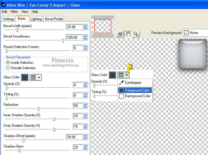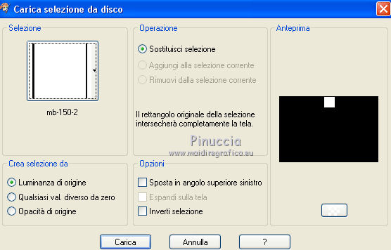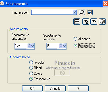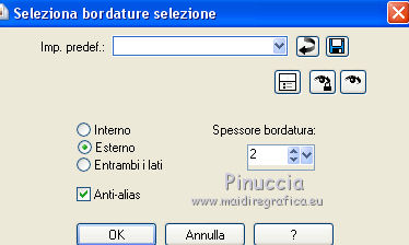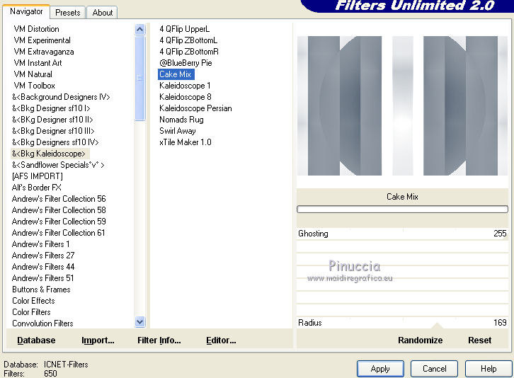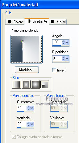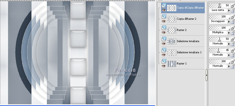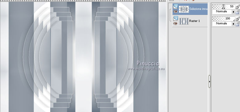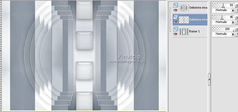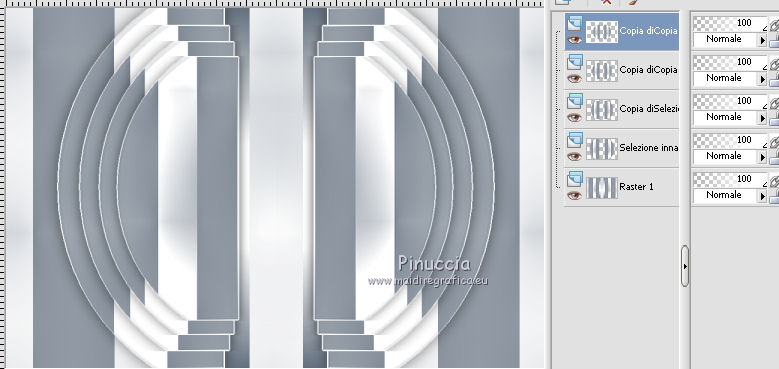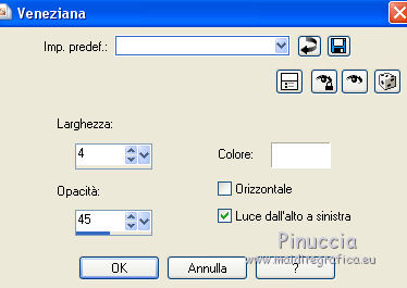 qui puoi trovare qualche risposta ai tuoi dubbi. Se l'argomento che ti interessa non è presente, ti prego di segnalarmelo. Per tradurre questo tutorial ho usato PSP X, ma può essere realizzato anche con le altre versioni di PSP. Dalla versione X4, il comando Immagine>Rifletti è stato sostituito con Immagine>Capovolgi in orizzontale, e il comando Immagine>Capovolgi con Immagine>Capovolgi in verticale. Nelle versioni X5 e X6, le funzioni sono state migliorate rendendo disponibile il menu Oggetti. Vedi la scheda sull'argomento qui Traduzione francese qui Le vostre versioni qui Occorrente: Materiale qui Il tube è di Katrina Filtri: consulta, se necessario, la mia sezione filtri qui Filters Unlimited 2.0 qui &<Bkg Kaleidoscope> (da importare in Unlimited) qui Simple qui Alien Skin Eye Candy 5 Impact - Glass qui I filtri Simple si possono usare da soli o importati in Filters Unlimited. come fare vedi qui) Se un filtro fornito appare con questa icona ![]() se stai usando altri colori, sperimenta le modalità di miscelatura e opacità più adatte ai tuoi colori Metti le selezioni nella cartella Selezioni. Apri la maschera in PSP e minimizzala con il resto del materiale. 1. Imposta il colore di primo piano con #314255, e il colore di sfondo con #ffffff ![]() Passa il colore di primo piano a Gradiente, stile Radiale. ![]() Apri una nuova immagine trasparente 900 x 600 pixels, e riempila con il gradiente.2. Livelli>Duplica. Immagine>Rifletti. Abbassa l'opacità di questo livello al 50%. Livelli>Unisci>Unisci giù. 3. Effetti>Plugins>Simple - Centre Tile. 4. Effetti>Plugins>Filters Unlimited 2.0 - &<Bkg Kaleidoscope> - Cake Mix. ![]() 5. Selezione>Carica/Salva selezione>Carica selezione da disco. Cerca e carica la selezione mb-150-1. ![]() Selezione>Innalza selezione a livello. 6. Selezione>Modifica>Seleziona bordature selezione. ![]() Attiva lo strumento Riempimento ![]() Riempi la selezione con il colore chiaro.Selezione>Deseleziona. 7. Effetti>Effetti 3D>Sfalsa ombra, colore nero. ![]() 8. Livelli>Duplica. Immagine>Rifletti. Livelli>Unisci>Unisci giù. 9. Livelli>Duplica. Immagine>Ridimensiona, al 90%, tutti i livelli non selezionato. Di nuovo Livelli>Duplica. Immagine>Ridimensiona, al 90%, tutti i livelli non selezionato. Ancora una volta Livelli>Duplica. Immagine>Ridimensiona, al 90%, tutti i livelli non selezionato. ![]() 10. Livelli>Unisci>Unisci giù - 3 volte. Abbassa l'opacità di questo al 50% (o secondo i tuoi colori). ![]() 11. Attiva il livello inferiore - Raster 1. Selezione>Carica/Salva selezione>Carica selezione da disco. Cerca e carica la selezione mb-150-2. ![]() Selezione>Innalza selezione a livello. Selezione>Deseleziona. 12. Effetti>Plugins>Alien Skin Eye Candy 5 Impact - Glass. colore di primo piano. ![]() 13. Livelli>Duplica. Effetti>Effetti di immagine>Scostamento. ![]() Di nuovo Livelli>Duplica. Effetti>Effetti di immagine>Scostamento, con i settaggi precedenti. Ancora una volta Livelli>Duplica. Effetti>Effetti di immagine>Scostamento, con i settaggi precedenti. 14. Livelli>Unisci>Unisci giù - 3 volte. Abbassa l'opacità di questo livello al 45% (o secondo i tuoi colori). ![]() 15. Attiva il livello superiore (selezione innalzata). Livelli>Nuovo livello raster. Selezione>Carica/Salva selezione>Carica selezione da disco. Cerca e carica la selezione mb-150-3. ![]() Riporta il colore di primo piano a Colore, e riempi la selezione con il colore scuro di primo piano.16. Effetti>Effetti di trama>Veneziana - colore bianco. ![]() Selezione>Deseleziona. 17. Livelli>Duplica. Immagine>Rifletti. Livelli>Unisci>Unisci giù. 18. Livelli>Duplica. Immagine>Ridimensiona, al 90%, tutti i livelli non selezionato. Di nuovo Livelli>Duplica. Immagine>Ridimensiona, al 90%, tutti i livelli non selezionato. 19. Cambia la modalità di miscelatura del livello originale in Moltiplica (o secondo i tuoi colori). Cambia la modalità di miscelatura del livello della prima copia in Sovrapponi. Cambia la modalità di miscelatura del livello superiore della seconda copia in Luce netta, e abbassa l'opacità al 50%. ![]() se la tua paletta è impostata come nel mio esempio, per cambiare le proprietà del livello non occorre attivarlo. Per visualizzare il menu della paletta dei livelli come nel mio esempio, vedi qui 20. Attiva il livello inferiore - Raster 1. Regola>Sfocatura>Sfocatura gaussiana - raggio 50. ![]() 21. Livelli>Nuovo livello raster. Riempi con il colore chiaro di sfondo.22. Livelli>Nuovo livello maschera>Da immagine. Apri il menu sotto la finestra di origine e vedrai la lista dei files aperti. Seleziona la maschera masker-mb-150-1, con i seguenti settaggi: ![]() Livelli>Unisci>Unisci gruppo. Abbassa l'opacità di questo livello al 35%. 23. Attiva il livello superiore. Apri Deco-150-1 e vai a Modifica>Copia. Torna al tuo lavoro e vai a Modifica>Incolla come nuovo livello. Lascialo come sta. 24. Apri Deco-150-2 e vai a Modifica>Copia. Torna al tuo lavoro e vai a Modifica>Incolla come nuovo livello. (se necessario, colorizza). Lascialo come sta. 25. Deco-150-3 e vai a Modifica>Copia. Torna al tuo lavoro e vai a Modifica>Incolla come nuovo livello. Effetti>Effetti di immagine>Scostamento. ![]() 26. Livelli>Duplica. Immagine>Rifletti. 27. Immagine>Aggiungi bordatura, 1 pixel, simmetriche, con il colore scuro. Immagine>Aggiungi bordatura, 1 pixel, simmetriche, con il colore chiaro. Immagine>Aggiungi bordatura, 1 pixel, simmetriche, con il colore scuro. 28. Selezione>Seleziona tutto. Immagine>Aggiungi bordatura, 50 pixels, simmetriche, con il colore chiaro. 29. Effetti>Effetti 3D>Sfalsa ombra, colore nero. ![]() Selezione>Deseleziona. 30. Apri il tube Vase_jill_bycrealinejuin2012 e vai a Modifica>Copia. Torna al tuo lavoro e vai a Modifica>Incolla come nuovo livello. Immagine>Ridimensiona, all'80%, tutti i livelli non selezionato. 31. Effetti>Effetti 3D>Sfalsa ombra, colore nero. ![]() Sposta il tube a sinistra,come nel mio esempio. 32. Apri il tube c03a1b8c e vai a Modifica>Copia. Torna al tuo lav