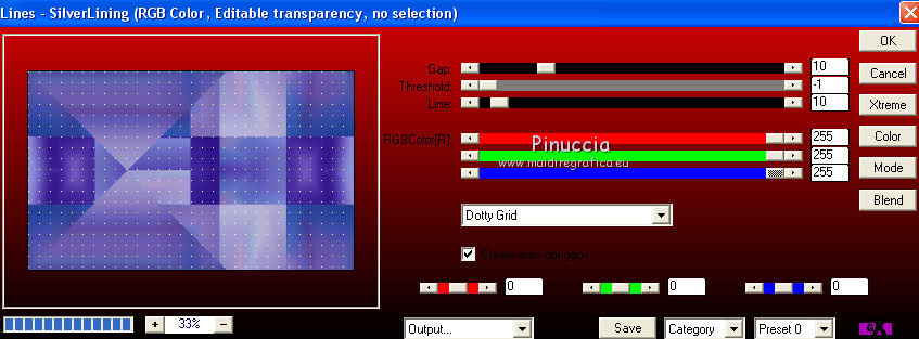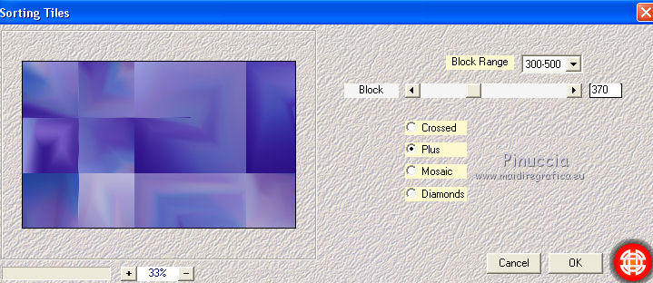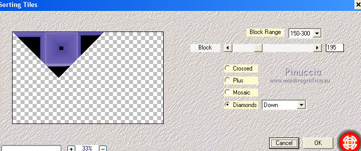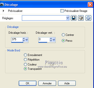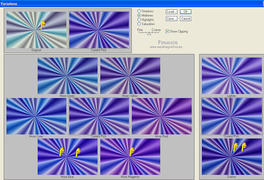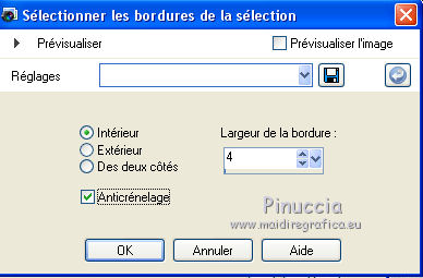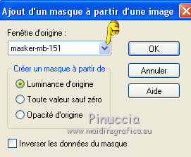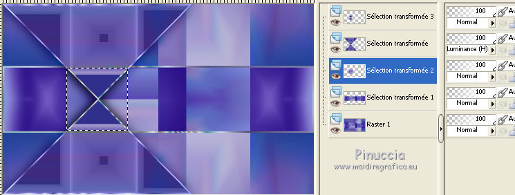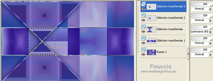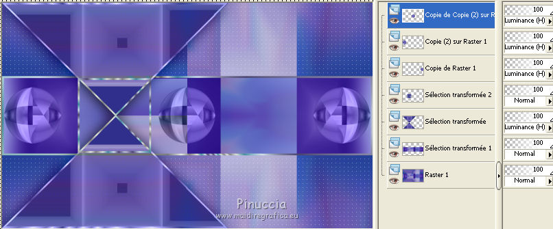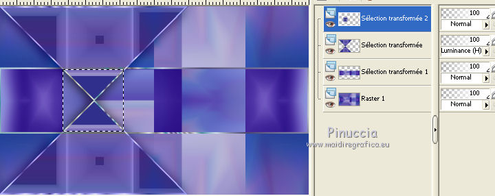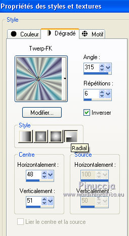 Ce tutoriel est une création de Mieke et il ne peut pas être copié sur d'autres sites, ni être proposé au téléchargement. La même chose vaut pour ma traduction. Le tutoriel peut être exécuté avec toutes les versions de PSP. Pour le traduire, j'ai utilisé CorelX2. Suivant la version utilisée, vous pouvez obtenir des résultats différents. Depuis la version X4, la fonction Image>Miroir a été remplacée par Image>Renverser horizontalement, et Image>Renverser avec Image>Renverser verticalement . Dans les versions X5 et X6, les fonctions ont été améliorées par la mise à disposition du menu Objets. Avec la nouvelle version X7, nous avons encore Image>Miroir et Image>Renverser/Retourner, mais avec nouvelles différences. Voir les détails à ce sujet ici Certaines dénominations ont changées entre les versions de PSP. Les plus frequentes dénominations utilisées: ![]() Traduction en italien ici Vos versions ici Nécessaire pour réaliser ce tutoriel: Matériel qui Modules Externes: consulter, si nécessaire, ma section des filtres ici AP 01 [Innovations] - Lines SilverLining qui Adjust - Variations qui Mehdi - Sorting Tiles qui ![]() Si vous voulez utiliser vos propres couleurs, n'hésitez pas à changer le mode et l'opacité des calques Placer le dégradé dans le dossier Dégradés. Placer la sélection dans le dossier Sélections. Ouvrir le masque en PSP et le minimiser avec le reste du matériel. 1. Placer en avant plan la couleur blanche #ffffff, et en arrière plan la couleur #31318c ![]() Placer en avant plan le Dégradé Twerp-FL, style Radial. ![]() Ouvrir une nouvelle image transparente 900 x 550 pixels. Remplir avec le dégradé.2. Effets>Modules Externes>Adjust - Variations. Un cli sur Original, pour annuler eventuels précédents settages mémorisés par le filtre, 2 clic sur More Blue, 2 clic sur Darker, 1 clic sur More Magenta et ok. vous pouvez régler les settages, en fonction de vos couleurs ![]() 3. Réglage>Flou>Flou gaussien - rayon 20. ![]() 4. Effets>Modules Externes>Mehdi - Sorting Tiles. ![]() 5. Effets>Modules Externes>Simple - Pizza Slice Mirror. 6. Sélections>Charger/Enregistrer une sélection>Charger à partir du disque. Chercher et charger la sélection mb-151-1. ![]() Sélections>Transformer la sélection en calque. Sélections>Désélectionner tout. 7. Effets>Pugins>Mehdi - Sorting Tiles. ![]() 8. Sélections>Sélectionner tout. Sélections>Flottante. Sélections>Statique. 9. Sélections>Modifier>Sélectionner les bordures de la sélection. ![]() Remplir la sélection avec le dégradé,Correspondance de l'Outil Pot de peinture settée sur Aucun. ![]() Sélections>Désélectionner tout. 10. Calques>Dupliquer. Image>Renverser. Calques>Fusionner>Fusionner le calque de dessous. Placer le calque en mode Luminance (héritée). 11. Effets>Effets 3D>Ombre portée, couleur noire. ![]() Édition>Répéter Ombre portée. 12. Activer l'outil Sélection ,cliquer sur l'icone Sélection personnalisée ![]() avec ces settages: ![]() Sélections>Transformer la sélection en calque. 13. Sélections>Modifier>Sélectionner les bordures de la sélection. ![]() Remplir la sélection avec le dégradé.Sélections>Désélectionner tout. 14. Sélection personnalisée ![]() ![]() Sélections>Transformer la sélection en calque. 15. Garder sélectionner. Vous positionner sur le calque du haut de la pile. Répéter Sélections>Transformer la sélection en calque. Vous positionner sur le calque de la première sélection transformée (sélections transformée 2). ![]() Calques>Agencer>Déplacer vers le haut. 16. Vous positionner sur le calque du haut de la pile. ![]() Calques>Fusionner>Fusionner le calque de dessous. Garder sélectionné. ![]() 17. Sélections>Modifier>Sélectionner les bordures de la sélection. ![]() Remplir la sélection avec le dégradé.Sélections>Désélectionner tout. 18. Vous positionner sur le calque du bas de la pile Raster 1. Calques>Dupliquer. 19. Vous positionner à nouveau sur le calque du bas de la pile Raster 1. Effets>Modules Externes>AP 01 Innovations - Lines SilverLining. ![]() 20. Vous positionner sur le calque de dessus - copie de Raster 1. Effets>Effets géometriques>Cercle. ![]() Calques>Agencer>Placer en haut de la pile. 21. Image>Redimensionner - à 25%, redimensionner tous les calque décoché. Effets>Effets d'image>Décalage. ![]() 22. Calques>Dupliquer. Image>Miroir. Calques>Dupliquer. 23. Effets>Effets d'image>Décalage, comme précédemment. ![]() 24. Placer les trois calques en mode Luminance (héritée). ![]() 25. Vous positionner sur le calque du haut de la pile. Calques>Nouveau calque raster. Placer en avant plan la couleur blanche du début #ffffff, et remplir le calque avec la couleur blanche.26. Calques>Nouveau calque de masque>A partir d'une image. Ouvrir le menu deroulant sous la fenetre d'origine et on voit tous les calques ouverts. Sélectionner le masque mb151. ![]() Calques>Dupliquer. Calques>Fusionner>Fusionner le groupe. 27. Calques>Nouveau calque raster. Placer en avant plan le dégradé du début. Remplir le calque avec le dégradé.28. Sélections>Sélectionner tout. Sélections>Modifier>Contracter - 4 pixels. Presser CANC sur le clavier.29. Sélections>Sélectionner tout. Image>Ajouter des bordures - 60 pixels, symétriques, couleur blanche. Effets>Effets 3D>Ombre portée, comme précédemment. Sélections>Désélectionner tout. 30. Activer le tube cas_tube23_bloem_24032012.pspimage - Édition>Copier. Revenir sur votre travail et Édition>Coller comme nouveau calque. Positionner le tube en bas.![]() Effets>Effets 3D>Ombre portée, comme précédemment. 31. Image>Redimensionner, - 850 pixels de largeur, redimensionner tous les calque coché. 32. Signer votre travail sur un nouveau calque. Calques>Fusionner>Tous et enregistrer en jpg. ![]() Si vous avez des problèmes, ou des doutes, ou vous trouvez un link modifié, ou seulement pour me dire que ce tutoriel vous a plu, vous pouvez m'écrire. 12 Mars 201
