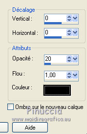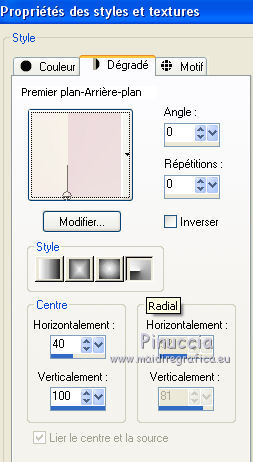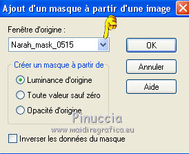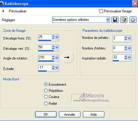 J'ai traduit ce tutoriel avec PSP12, mais peut également être exécuté avec les autres versions. Suivant la version utilisée, vous pouvez obtenir des résultats différents. Depuis la version X4, la fonction Image>Miroir a été remplacée par Image>Renverser horizontalement, et Image>Renverser avec Image>Renverser verticalement . Dans les versions X5 et X6, les fonctions ont été améliorées par la mise à disposition du menu Objets. Avec la nouvelle version X7, nous avons encore Image>Miroir et Image>Renverser/Retourner, mais avec nouvelles différences. Voir les détails à ce sujet ici Certaines dénominations ont changées entre les versions de PSP. Les plus frequentes dénominations utilisées: ![]() Traduction en italien ici Vos versions ici Nécessaire pour réaliser ce tutoriel: Matériel qui Modules Externes: consulter, si nécessaire, ma section des filtres ici AFS IMPORT sqborder2 qui AAA Frames - Foto Frame qui Simple qui Simple - Half Wrap (bonus) qui Filtres Simple et AFS Import peuvent être utilisés seuls ou importés dans Filters Unlimited. voir comment le faire ici). Si un filtre est fourni avec cette icône, ![]() Si vous voulez utiliser vos propres couleurs, n'hésitez pas à changer le mode et l'opacité des calques Placer la sélection dans le dossier Sélections. Ouvrir le masque en PSP et le minimiser avec le reste du matériel. 1. Placer en avant plan la couleur #ecdbdd, et en arrière plan la couleur #f7f2e9 ![]() Préparer un Dégradé d'avant plan/arrière plan, style Radial. dans les versions plus recentes de PSP, ce dégradé a été nommé Corel_06_029 ![]() Ouvrir une nouvelle image transparente 900 x 550 pixels, et remplir avec le dégradé.2. Effets>Modules Externes>AFS IMPORT - sqborder2, par défaut. ![]() 3. Effets>Modules Externes>Simple - Top Left Mirror. 4. Calques>Dupliquer. 5. Effets>Modules Externes>Simple - Half Wrap. Placer le calque en mode Multiplier. 6. Calques>Fusionner>Fusionner le calque de dessous. 7. Sélections>Charger/Enregistrer une sélection>Charger à partir du disque. Chercher et charger la sélection mb-152. ![]() Sélections>Transformer la sélection en calque. Sélections>Désélectionner tout. 8. Effets>Effets 3D>Ombre portée, couleur noire. ![]() 9. Calques>Dupliquer. Image>Rotation libre - 90 degrés à droite. ![]() 10. Image>Redimensionner, à 80%, redimensionner tous les calques décoché. Édition>Répéter Redimensionnement. 11. Effets>Effets d'image>Décalage. ![]() 12. Calques>Dupliquer. Image>Miroir. Calques>Fusionner>Fusionner le calque de dessous. 13. Calques>Dupliquer. Effets>Modules Externes>Simple - Centre Tile. 14. Calques>Dupliquer. Effets>Effets de refléxion>Kaléidoscope. ![]() 15. Effets>Effets de distorsion>Coordonnées polaires. ![]() 16. Calques>Dupliquer. Image>Renverser. Calques>Fusionner>Fusionner le calque de dessous. 17. Activer Deco-1-152 - Édition>Copier. Revenir sur votre travail et Édition>Coller comme nouveau calque. 18. Effets>Effets d'image>Décalage. ![]() Calques>Fusionner>Fusionner le calque de dessous. 19. Activer Deco-5-152 - Édition>Copier. Revenir sur votre travail et Édition>Coller comme nouveau calque. Ne déplacer. Il est à sa place. 20. Activer Deco-4-152 - Édition>Copier. Revenir sur votre travail et Édition>Colle comme nouveau calque. Il est à sa place. 21. Activer Deco-3-152 e vai a Édition>Copier. Revenir sur votre travail et Édition>Coller comme nouveau calque. Il est à sa place. 22. Calques>Dupliquer. Effets>Effets d'image>Décalage. ![]() 23. Calques>Dupliquer. Image>Renverser. Calques>Fusionner>Fusionner le calque de dessous. 24. Calques>Dupliquer. Image>Miroir. Calques>Fusionner>Fusionner le calque de dessous. 25. Calques>Nouveau calque raster. Placer la couleur d'avant plan avec la couleur du début. Remplir le calque avec la couleur d'avant plan.26. Calques>Nouveau calque de masque>A partir d'une image. Ouvrir le menu deroulant sous la fenetre d'origine et vous verrez tous les calques ouverts. Sélectionner le masque Narah_mask_0515. ![]() Calques>Fusionner>Fusionner le groupe. 27. Effets>Effets 3D>Ombre portée, couleur noire. ![]() Réglage>Netteté>Netteté. Réduire l'opacité de ce calque à 32% (ou en fonction de tes couleurs). 28. Image>Ajouter des bordures, 2 pixels, symétrique, avec la couleur foncée. Image>Ajouter des bordures, 2 pixels, symétrique, avec la couleur claire. Image>Ajouter des bordures, 2 pixels, symétrique, avec la couleur foncée. 29. Sélections>Sélectionner tout. Image>Ajouter des bordures, 50 pixels, symétrique, avec la couleur claire. Sélections>Inverser. 30. Effets>Modules Externes>AAA Frames - Foto Frame. ![]() Répéter le filtre Foto Frame, avec width à 2. ![]() 31. Sélections>Inverser. Effets>Effets 3D>Ombre portée, couleur noire. ![]() Sélections>Désélectionner tout. 32. Activer le tube AnaRidzi1503 - Édition>Copier. Revenir sur votre travail et Édition>Coller comme nouveau calque. Image>Redimensionner - 2 fois à 80%, redimensionner tous les calques décoché. Positionner le tube en bas à droite.33.Effets>Effets 3D>Ombre portée, couleur noire. ![]() 34. Activer l'outil Sélections , Rectangle,et sélectionner l'ombre au dessous du tube et au dessous de la bordure. ![]() Presser sur le clavier la touche CANC ![]() Sélections>Désélectionner tout. 35. Image>Ajouter des bordures, 2 pixels, symétrique, avec la couleur foncée. 36. Signer votre trav ail sur un nouveu calque. Calques>Fusionner>Tous et enregistrer en jpg. Les tubes de cettes versions sont de Mara Pontes ![]() Min@ ![]() ![]() Si vous avez des problèmes, ou des doutes, ou vous trouvez un link modifié, ou seulement pour me dire que ce tutoriel vous a plu, vous pouvez m'écrire. 12 Avril 2014 |