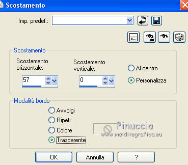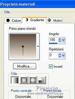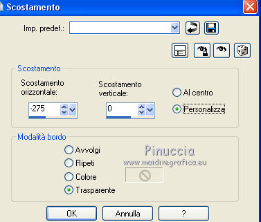 qui puoi trovare qualche risposta ai tuoi dubbi. Se l'argomento che ti interessa non è presente, ti prego di segnalarmelo. Il tutorial può essere eseguito con ogni versione di PSP. Dalla versione X4, il comando Immagine>Rifletti è stato sostituito con Immagine>Capovolgi in orizzontale, e il comando Immagine>Capovolgi con Immagine>Capovolgi in verticale. Nelle versioni X5 e X6, le funzioni sono state migliorate rendendo disponibile il menu Oggetti. Vedi la scheda sull'argomento qui Per tradurre questo tutorial ho usato PSP X. traduzione francese qui Le vostre versioni qui Occorrente: Materiale qui Filtri: consulta, se necessario, la mia sezione filtri qui Filters Unlimited 2.0 qui AAA Frames - Foto Frame qui AP 01 [Innovations] - Lines SilverLining qui Simple qui AFS IMPORT - sqborder2 qui Flaming Pear - Flexify 2 qui I filtri Simple e AFS IMPORT si possono usare da soli o importati in Filters Unlimited (come fare vedi qui) Se un filtro fornito appare con questa icona ![]() se stai usando altri colori, sperimenta le modalità di miscelatura e opacità più adatte ai tuoi colori Metti la selezione nella cartella Selezioni. 1. Imposta il colore di primo piano con #f0e7da, e il colore di sfondo con #5a483c. ![]() Passa il colore di primo piano a Gradiente di primo piano/sfondo, stile Lineare, con i seguenti settaggi. nelle versioni più recenti di PSP, il gradiente di primo piano/sfondo è stato rinominato Corel_6_029. ![]() 2. Apri una nuova immagine trasparente 900 x 500 pixels, e riempila con il gradiente.3. Effetti>Plugins>AAA Frames - Foto Frame. ![]() 4. Effetti>Plugins>Filters Unlimited 2.0 - AFS IMPORT - sqborder2, con i settaggi standard. ![]() 5. Effetti>Plugins>Filters Unlimited 2.0 - Simple - Zoom out and flip ![]() 6. Effetti>Plugins>Filters Unlimited 2.0 - Simple - Blintz. ![]() 7. Selezione>Carica/Salva selezione>Carica selezione da disco. Cerca e carica la selezione 155-1. ![]() Selezione>Innalza selezione a livello. Selezione>Deseleziona. 8. Effetti>Effetti 3D>Sfalsa ombra, colore nero. ![]() 9. Livelli>Duplica. Immagine>Capovolgi. 10. Effetti>Plugins>Filters Unlimited 2.0 - Simple - 4Way Average. ![]() 11. Attiva il livello della selezione innalzata. ![]() 12. Livelli>Duplica. Livelli>Disponi>Porta in alto. 13. Effetti>Plugins>Flaming Pear - Flexify 2. ![]() 14. Immagine>Ridimensiona, al 70%, tutti i livelli non selezionato. Regola>Messa a fuoco>Metti a fuoco. 15. Livelli>Duplica. Immagine>Ridimensiona, al 20%, tutti i livelli non selezionato. Regola>Messa a fuoco>Metti a fuoco. 16. Effetti>Effetti di immagine>Scostamento. ![]() 17. Livelli>Duplica. Effetti>Effetti di immagine>Scostamento. ![]() 18. Livelli>Duplica. Effetti>Effetti di immagine>Scostamento, con i settaggi precedenti. ![]() 19. Livelli>Unisci>Unisci giù - 2 volte. 20. Attiva il livello Raster 1. Livelli>Duplica. 21. Effetti>Plugins>Mura's Meister - Perspective Tiling. ![]() 22. Livelli>Duplica. Immagine>Capovolgi. 23. Effetti>Effetti di immagine>Scostamento. ![]() 24. Apri Deco-155-3, e vai a Modifica>Copia. Torna al tuo lavoro e vai a modifica>Incolla come nuovo livello. Livelli>Disponi>Porta in alto. 25. Apri 0_f5f94_XXL e vai a Modifica>Copia. Torna al tuo lavoro e vai a modifica>Incolla come nuovo livello. Immagine>Ridimensiona, al 50%, tutti i livelli non selezionato. 26. Effetti>Effetti di immagine>Scostamento. ![]() 27. Regola>Tonalità e saturazione>Viraggio. ![]() 28. Apri kamalini-297, e vai a Modifica>Copia. Torna al tuo lavoro e vai a modifica>Incolla come nuovo livello. 29. Effetti>Effetti di immagine>Scostamento. ![]() 30. Effetti>Effetti 3D>Sfalsa ombra, colore nero. ![]() 31. Immagine>Aggiungi bordatura, 2 pixels, simmetriche, con il colore #5a483c. 32. Selezione>Seleziona tutto. Immagine>Aggiungi bordatura, 50 pixels, simmetriche, con il colore #f0e7da. 33. Effetti>Plugins>AAA Frames - Foto Frame. ![]() 34. Effetti>Effetti 3D>Sfalsa ombra, colore nero. ![]() Selezione>Deseleziona. 35. Effetti>Plugins>AAA Frames - Foto Frame. ![]() 36. Aggiungi il tuo nome e/o il tuo watermark su un nuovo livello. 37. Immagine>Ridimensiona, a 900 pixels di larghezza, tutti i livelli selezionato. Salva in formato jpg. Per questo esempio ho usato un tube di Azalee. ![]() ![]() Se hai problemi o dubbi, o trovi un link non funzionante, o anche soltanto per un saluto, scrivimi. 12 Gennaio 2014 |