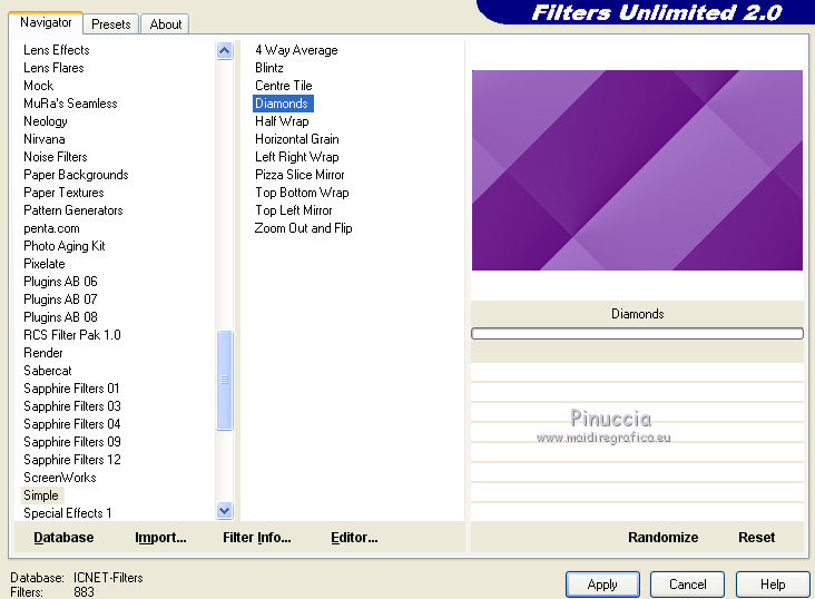 2. Effets>Modules Externes>Filters Unlimited 2.0 - Simple - Diamonds.