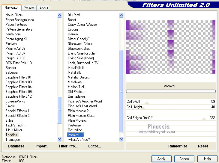 Effets>Modules Externes>Filters Unlimited 2.0 - Toadies - Weaver, con i settaggi standard.