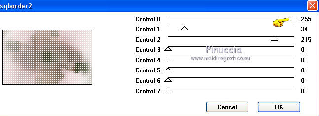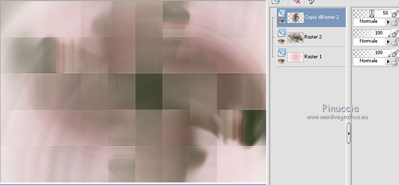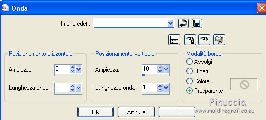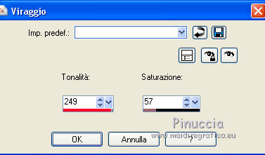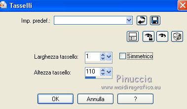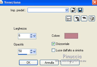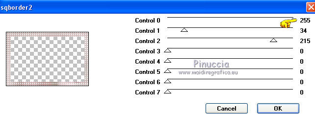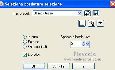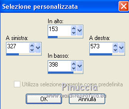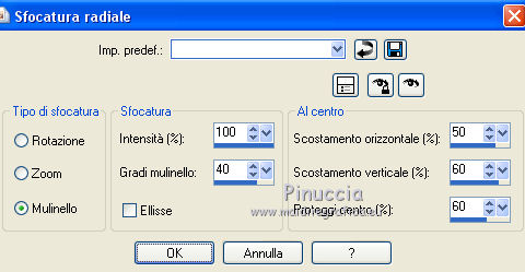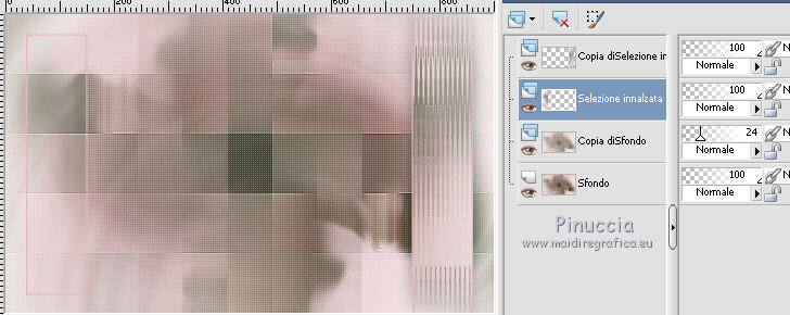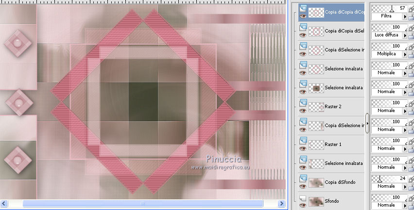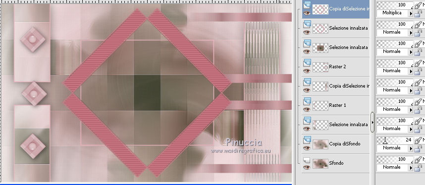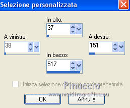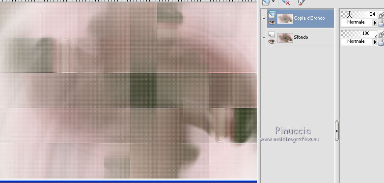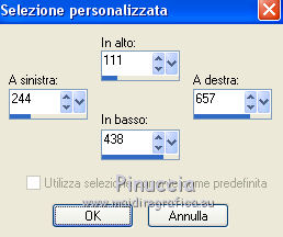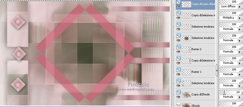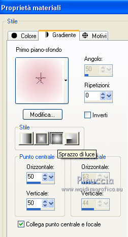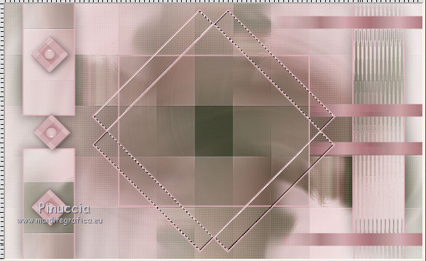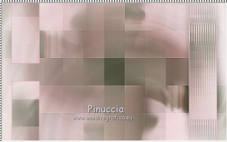 qui puoi trovare qualche risposta ai tuoi dubbi. Se l'argomento che ti interessa non è presente, ti prego di segnalarmelo. Il tutorial può essere eseguito con ogni versione di PSP. Dalla versione X4, il comando Immagine>Rifletti è stato sostituito con Immagine>Capovolgi in orizzontale, e il comando Immagine>Capovolgi con Immagine>Capovolgi in verticale. Nelle versioni X5 e X6, le funzioni sono state migliorate rendendo disponibile il menu Oggetti. Vedi la scheda sull'argomento qui Per tradurre questo tutorial ho usato PSP X. traduction en français qui Le vostre versioni qui Occorrente: Materiale qui Filtri: consulta, se necessario, la mia sezione filtri qui Filters Unlimited 2.0 qui Simple - Top Bottom Wrap qui AFS IMPORT - sqborder2 qui Alien Skin Eye Candy 5 Impact - Glass qui I filtri AFS Import e Simple si possono usare da soli o importati in Filters Unlimited (come fare vedi qui) Se un filtro fornito appare con questa icona ![]() se stai usando altri colori, sperimenta le modalità di miscelatura e opacità più adatte ai tuoi colori 1. Imposta il colore di primo piano con #e7b5bd, e il colore di sfondo con il colore bianco #ffffff. ![]() Passa il colore di primo piano a Gradiente di primo piano/sfondo, stile Sprazzo di luce. ![]() 2. Apri una nuova immagine trasparente 900 x 550 pixels, e riempila con il gradiente.3. Selezione>Deseleziona. Livelli>Nuovo livello raster. 4. Apri il tube 0_9d064_29d54ca0_L e vai a Modifica>Copia. non chiuderlo perchè ti servirà ancora Torna al tuo lavoro e vai a Modifica>Incolla nella selezione. Selezione>Deseleziona. 5. Regola>Sfocatura>Sfocatura radiale. ![]() 6. Livelli>Duplica. Immagine>Rifletti. Immagine>Capovolgi. Abbassa l'opacità di questo livello al 50%. ![]() Livelli>Unisci>Unisci giù. 7. Effetti>Effetti di distorsione>Tasselli. ![]() Effetti>Effetti di bordo>Aumenta di più. 8. Livelli>Duplica. Immagine>Ruota per gradi - 90 gradi a sinistra. ![]() 9. Immagine>Ridimensiona, al 75%, tutti i livelli non selezionato. Abbassa l'opacità di questo livello al 50%. ![]() Effetti>Effetti di bordo>Aumenta. 10. Livelli>Unisci>Unisci tutto. 11. Livelli>Duplica. Effetti>Plugins>AFS IMPORT - sq border 2. ![]() 12. Abbassa l'opacità di questo livello al 24 (o secondo i tuoi colori). ![]() 13. Attiva il livello inferiore di sfondo. Attiva lo strumento Selezione ![]() (non importa il tipo di selezione impostato, perchè con la selezione personalizzata si ottiene sempre un rettangolo) clicca sull'icona Selezione personalizzata ![]() e imposta i seguenti settaggi. ![]() 14. Selezione>Innalza selezione a livello. Livelli>Disponi>Porta in alto. 15. Selezione>Modifica>Seleziona bordature selezione. ![]() 16. Riporta il colore di primo piano a Colore e riempi la selezione con il colore di primo piano #e7b5bd.Selezione>Deseleziona. 17. Livelli>Duplica. Immagine>Rifletti. 18. Effetti>Effetti di distorsione>Onda. ![]() 19. Effetti>Effetti 3D>Sfalsa ombra, colore nero. ![]() 20. Attiva il livello sottostante della selezione innalzata originale. ![]() 21. Effetti>Plugins>Simple - Top Bottom Wrap. ![]() 22. Effetti>Effetti 3D>Sfalsa ombra, colore nero. ![]() 23. Apri deco-161-1 e vai a Modifica>Copia. Torna al tuo lavoro e vai a Modifica>Incolla come nuovo livello. 24. Effetti>Effetti di immagine>Scostamento. ![]() 25. Effetti>Effetti 3D>Sfalsa ombra, colore nero. ![]() 26. Apri deco-161-2 e vai a Modifica>Copia. Torna al tuo lavoro e vai a Modifica>Incolla come nuovo livello. 24. Effetti>Effetti di immagine>Scostamento. ![]() 27. Effetti>Effetti di distorsione>Vento - da destra, intensità 100. ![]() 28. Livelli>Disponi>Porta in alto. 29. Attiva nuovamente il livello inferiore di sfondo. Selezione personalizzata ![]() ![]() Selezione>Innalza selezione a livello. Livelli>Disponi>Porta in alto. 30. Selezione>Modifica>Seleziona bordature selezione. ![]() 31. Riempi con il colore di primo piano.Selezione>Innalza selezione a livello. Selezione>Deseleziona. 32. Immagine>Ruota per gradi - 45 gradi a sinistra. ![]() 33. Livelli>Duplica. Immagine>Rifletti. Livelli>Unisci>Unisci giù. 34. Attiva lo strumento Bacchetta magica , sfumatura e tolleranza 0,e seleziona i quattro bordi ![]() Riempi la selezione con il colore di primo piano.35. Effetti>Effetti di trama>Veneziana, colore #c1818c. ![]() Selezione>Deseleziona. 36. Livelli>Duplica. Cambia la modalità di miscelatura di questo livello in Moltiplica. ![]() 37. Livelli>Duplica. Immagine>Ruota per gradi - 45 gradi a sinistra. ![]() Cambia la modalità di miscelatura di questo livello in Luce diffusa. ![]() 38. Livelli>Duplica. Immagine>Ridimensiona, al 75%, tutti i livelli non selezionato. Cambia la modalità di miscelatura di questo livello in Filtra, e abbassa l'opacità al 57% (o secondo i tuoi colori). ![]() 39. Attiva il livello inferiore di sfondo. Selezione personalizzata ![]() ![]() 14. Selezione>Innalza selezione a livello. Livelli>Disponi>Porta in alto. 40. Effetti>Plugins>Alien Skin Eye Candy 5 Impact - Glass. Seleziona il preset Clear e ok. ![]() 41. Regola>Tonalità e saturazione>viraggio. ![]() 42. Immagine>Aggiungi bordatura, 1 pixel, simmetriche, con il colore di primo piano. Immagine>Aggiungi bordatura, 1 pixel, simmetriche, con il colore bianco. Immagine>Aggiungi bordatura, 1 pixel, simmetriche, con il colore di primo piano. 43. Modifica>Copia. Selezione>Seleziona tutto. Immagine>Aggiungi bordatura, 50 pixels, simmetriche, con il colore bianco. 44. Selezione>Inverti. Modifica>Incolla nella selezione. 45. Regola>Sfocatura>Sfocatura radiale, con i settaggi precedenti. Effetti>Effetti di bordo>aumenta. Selezione>Innalza selezione a livello. 46. Effetti>Plugins>AFS IMPORT - sqborder2. ![]() 47. Abbassa l'opacità di questo livello al 24%, o secondo i tuoi colori. Selezione>Inverti. 48. Effetti>Effetti 3D>Sfalsa ombra, colore nero. ![]() Selezione>Deseleziona. 49. Attiva nuovamente il tube 0_9d064_29d54ca0_L e vai a Modifica>Copia. Torna al tuo lavoro e vai a Modifica>Incolla come nuovo livello. 50. Effet