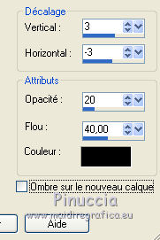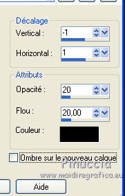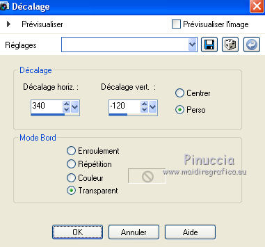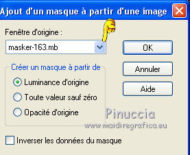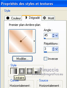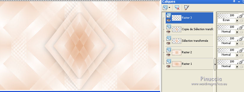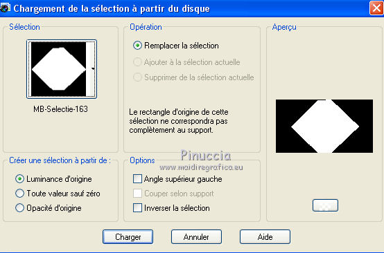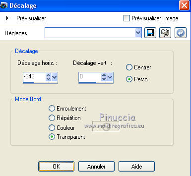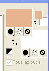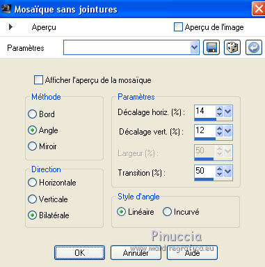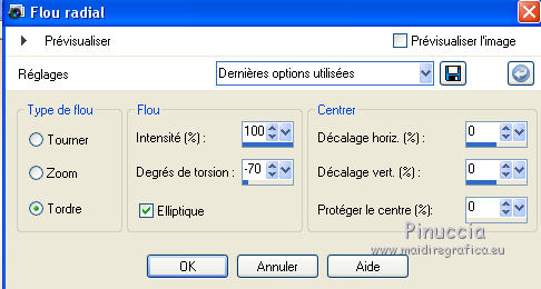 J'ai traduit ce tutoriel avec CorelX12, mais il peut également être exécuté avec les autres versions. Suivant la version utilisée, vous pouvez obtenir des résultats différents. Depuis la version X4, la fonction Image>Miroir a été remplacée par Image>Renverser horizontalement, et Image>Renverser avec Image>Renverser verticalement . Dans les versions X5 et X6, les fonctions ont été améliorées par la mise à disposition du menu Objets. Avec la nouvelle version X7, nous avons encore Image>Miroir et Image>Renverser/Retourner, mais avec nouvelles différences. Voir les détails à ce sujet ici Certaines dénominations ont changées entre les versions de PSP. Les plus frequentes dénominations utilisées: ![]() Traduction en italien ici Vos versions ici Nécessaire pour réaliser ce tutoriel: Matériel qui Le tube des fleurs est de Alies (dans le tutoriel l'original). Je ne connais pas les auteurs du tube de la femme et du masque. Modules Externes: consulter, si nécessaire, ma section des filtres ici Filters Unlimited 2.0 qui Toadies - Weaver qui &<Bkg Kaleidoscope> - Kaleidoscope 2 (à importer dans Unlimited) qui L&K's - L&K's Palmyre qui Adjust - Variations qui Filtres Toadies peuvent être utilisés seuls ou importés dans Filters Unlimited. voir comment le faire ici). Si un filtre est fourni avec cette icône, ![]() Si vous voulez utiliser vos propres couleurs, n'hésitez pas à changer le mode et l'opacité des calques Placer la sélection dans le dossier Sélections. Ouvrir le masque en PSP et le minimiser avec le reste du matériel. 1. Placer en avant plan la couleur #e7b48f, et en arrière plan la couleur #ffffff. ![]() Préparer un dégradé d'avant plan/arrière plan, style Linéaire. ![]() 2. Ouvrir une nouvelle image transparente 900 x 500 pixels. Remplir du dégradé.3. Réglage>Flou>Flou radiale. ![]() 4. Calques>Nouveau calque raster. Remplir du dégradé.5. Effets>Effets d'image>Mosaïque sans jointures, par défaut. ![]() 6. Effets>Modules Externes>Filters Unlimited 2.0 - Toadies - Weaver, par défaut. ![]() 7. Effets>Modules Externes>Filters Unlimited 2.0 - &<Bkg Kaleidoscope> - Kaleidoscope 2. ![]() 8. Sélections>Charger/Enregistrer une sélection>Charger à partir du disque. Chercher et charger la sélection MB-les-163.PspSelection ![]() Sélections>Transformer la sélection en calque. Sélections>Désélectionner tout. 9. Effets>Effets géometriques>Cercle. ![]() 10. Touche K pour activer l'outil Sélectionner ![]() avec PSP 9 la touche D pour activer l'outil Déformation ![]() en mode Échelle ,utiliser les noeuds à droite et à gauche ![]() pour enlarger la forme à peu près comme dans la capture. ![]() Presser la touche M pour désélectionner l'outil. 11. Effets>Effets 3D>Ombre portée, couleur noire. ![]() 12. Calques>Dupliquer. Image>Redimensionner, à 75%, redimensionner tous les calques décoché. 13. Effets>Modules Externes>Adjust - Variations un clic sur Original pour anuler eventuels précedents settages mémorisés du filtre, un clic sur Darker et ok. ![]() 14. Calques>Nouveau calque raster. cliquez sur l'icone Sélection personnalisée ![]() avec ces settages: ![]() Placer le mode de l'Outil Pot de peinture sur Aucun ![]() Remplir la sélection avec la couleur blanche.15. Sélections>Modifier>Contracter - 2 pixels. Presser CANC sur le clavier ![]() 16. Sélections>Modifier>Contracter - 2 pixels. Remplir avec la couleur blanche.17. Selezione>Modifica>Contrai - 2 pixels. Presser CANC sur le clavier. 18. Sélections>Modifier>Contracter - 2 pixels. Remplir avec la couleur blanche.19. Sélections>Modifier>Contracter - 2 pixels. Presser CANC sur le clavier. 20. Sélections>Modifier>Contracter - 2 pixels. Remplir avec la couleur blanche.21. Sélections>Modifier>Contracter - 2 pixels. Presser CANC sur le clavier. 21. Réduire l'opacité de l'Outil Pot de peinture à 50. ![]() Remplir la selezione avec la couleur blanche.Ne pas oublier de mettre à nouveau l'opacité à 100. Sélections>Désélectionner tout. 22. Calques>Dupliquer. Image>Miroir. Calques>Fusionner>Fusionner le calque de dessous. 23. Effets>Effets d'image>Mosaîque sans jointures. ![]() 24. Effets>Modules Externes>L&K's - L&K's Palmyre. ![]() 25. Placer le calque en mode Écran. ![]() 26. Calques>Nouveau calque raster. Mettre la couleur d'avant plan à Couleur. Remplir le calque avec la couleur d'avant plan.27. Calques>Nouveau calque de masque>A partir d'une image. Ouvrir le menu deroulant sous la fenêtre d'origine et vous verrez la liste des images ouverts. Sélectionner le masque masker-163-mb. ![]() Calques>Fusionner>Fusionner le groupe. Réduire l'opacité de ce calque à 65%. 28. Activer deco-163-1, Édition>Copier. Revenir sur votre travail et Édition>Coller comme nouveau calque. 29. Activer Deco-163-2, Édition>Copier. Revenir sur votre travail et Édition>Coller comme nouveau calque. 30. Effets>Effets d'image>Décalage. ![]() 31. Effets>Effets 3D>Ombre portée, couleur noire. ![]() 32. Image>Ajouter des bordures, 2 pixels, symétrique, couleur d'avant plan. Image>Ajouter des bordures, 2 pixels, symétrique, couleur blanche. Image>Ajouter des bordures, 2 pixels, symétrique, couleur d'avant plan. Image>Ajouter des bordures, 50 pixels, symétrique, couleur blanche. 33. Activer l'outil Baguette magique ![]() cliquer sur le bord blanc de 50 pixels pour le sélectionner. Sélections>Inverser. 34. Effets>Effets 3D>Ombre portée, couleur noire. ![]() Sélections>Désélectionner tout. 35. Activer Rand-163-MB, Édition>Copier. Revenir sur votre travail et Édition>Coller comme nouveau calque. 36. Activer Alies 1FP965-flower-12042014, Édition>Copier. Revenir sur votre travail et Édition>Coller comme nouveau calque. 37. Effets>Effets 3D>Ombre portée, couleur noire. ![]() 38. Effets>Effets d'image>Décalage. ![]() 39. Calques>Dupliquer. Image>Redimensionner, à 75%, redimensionner tous les calque décoché. Positionner bien le tube à côté de l'original.![]() 40. Activer le tube de 