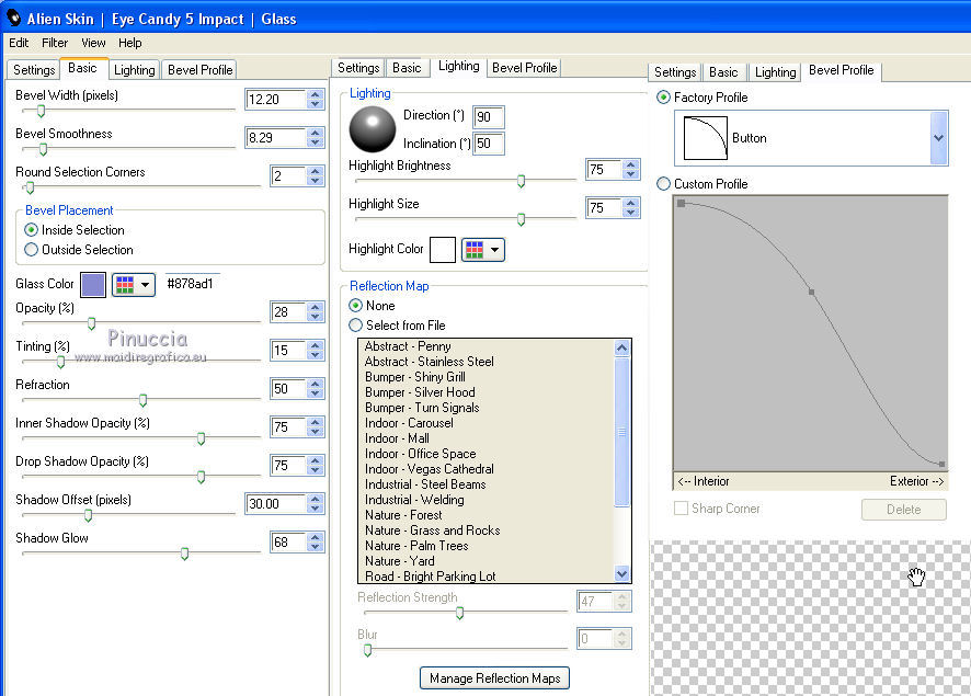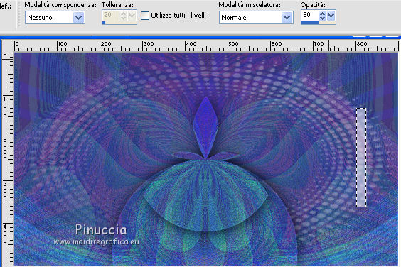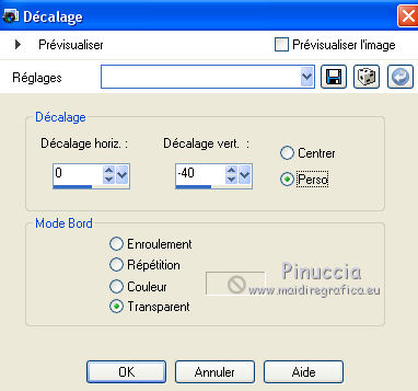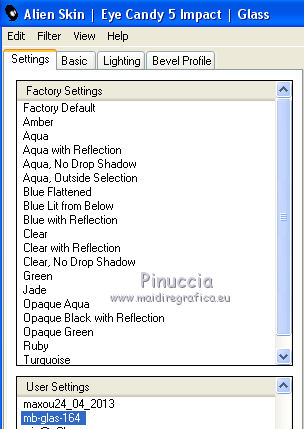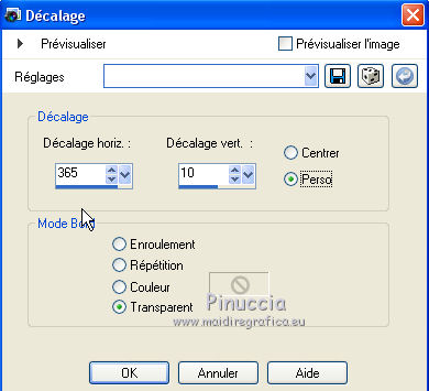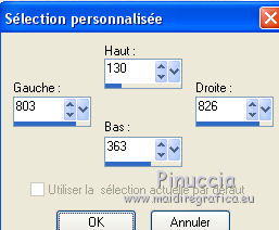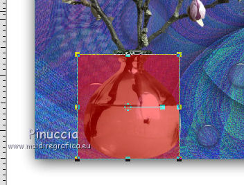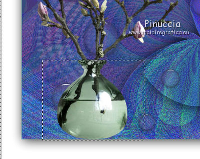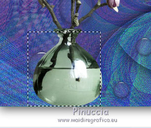 J'ai traduit ce tutoriel avec CorelX12, mais il peut également être exécuté avec les autres versions. Suivant la version utilisée, vous pouvez obtenir des résultats différents. Depuis la version X4, la fonction Image>Miroir a été remplacée par Image>Renverser horizontalement, et Image>Renverser avec Image>Renverser verticalement . Dans les versions X5 et X6, les fonctions ont été améliorées par la mise à disposition du menu Objets. Avec la nouvelle version X7, nous avons encore Image>Miroir et Image>Renverser/Retourner, mais avec nouvelles différences. Voir les détails à ce sujet ici Certaines dénominations ont changées entre les versions de PSP. Les plus frequentes dénominations utilisées: ![]() Traduction en italien ici Vos versions ici Nécessaire pour réaliser ce tutoriel: Matériel qui Le tube du vase est de Rooskes Modules Externes: consulter, si nécessaire, ma section des filtres ici Alien Skin Eye Candy 5 Impact - Glass qui ![]() Si vous voulez utiliser vos propres couleurs, n'hésitez pas à changer le mode et l'opacité des calques Placer le preset En cliquant sur le preset une ou deux fois (selon vos réglages) automatiquement il se placera directement dans le dossier Settings de Alien Skin Eye Candy. pourquoi un ou deux clic voir ici Ouvrir le masque en PSP et le minimiser avec le reste du matériel. 1. Placer en avant plan la couleur blanche #ffffff, et en arrière plan la couleur #378288. ![]() 2. Ouvrir ag-les 164. Fenêtre>Dupliquer - ou sur le clavier shift+D - pour faire une copie. Fermer l'original. La copie sera la base de votre travail. 3. Calques>Nouveau calque raster. Remplir avec la couleur blanche #ffffff.4. Calques>Nouveau calque de masque>A partir d'une image. Ouvrir le menu deroulant sous la fenêtre d'origine et vous verrez la liste des images ouverts. Charger le masque Narah_masker_0187. ![]() Calques>Fusionner>Fusionner le groupe. Réduire l'opacité de ce calque à 34%. ![]() 5. Calques>Fusionner>Fusionner le calque de dessous. 6. Activer deco-1-164, Édition>Copier. Revenir sur votre travail et Édition>Coller comme nouveau calque. 7. Effets>Effets d'image>Décalage. ![]() 8. Calques>Nouveau calque raster. Activer l'outil Sélection ![]() (peu importe le type de sélection, parce que avec la sélection personnalisée vous obtenez toujours un rectangle), cliquer sur Sélection personnalisée ![]() et setter ces paramètres. ![]() 9. Réduire l'opacité de l'Outil Pot de peinture à 50. ![]() et remplir la sélection du couleur blanche #ffffff.![]() Avant de l'oublier, placer à nouveau l'opacité à 100. Sélections>Désélectionner tout. 10. Effets>Effets 3D>Ombre portée, couleur noire. ![]() 11. Activer deco-2-164, Édition>Copier. Revenir sur votre travail et Édition>Coller comme nouveau calque. 12. Effets>Effets d'image>Décalage. ![]() 13. Activer l'outil Sélection , cercle,![]() Vous positionner sur le calque du bas de la pile. Tracer un petit cercle à peu près comme ci-dessous. ![]() Sélections>Transformer la sélection en calque. Sélections>Désélectioner tout. Effets>Modules Externes>Alien Skin Eye Candy 5 Impact - Glass. sélectionnes le preset preset mb.glass-16 et ok. ![]() en cas de problèmes avec le preset, vous pouvez copier les paramètres comme ci-dessous. ![]() Calques>Agencer>Placer en haut de la pile. Calques>Dupliquer, 3 fois, et positionner les sphères sur la ligne blanche.(ou, vous pouvez copier/coller le tube deco-3-164 dans le matériel). ![]() 14. Calques>Fusionner>Calques visibles. 15. À nouveau activer l'outil Sélection , Cercle![]() Tracer un cercle en peu plus grand du précédent. ![]() 16. Calques>Nouveau calque raster. Effets>Modules Externes>Alien Skin Eye Candy 5 Impact - Glass, comme précédemment. ![]() Sélections>Désélectionner tout. 17. Calques>Dupliquer. Image>Redimensionner, à votre convenance, redimensionner tous les calques décoché. Répéter Calques>Dupliquer et Image>Redimennsioner, à votre convenance, et positionner les sphère comme vous préferez.Pour mon exemple. ![]() 18. Image>Ajouter des bordures, 1 pixel, symétriques, couleur d'arrière plan. Sélections>Sélectionner tout. Image>Ajouter des bordures, 50 pixels, symétriques, couleur blanche #ffffff. Effets>Effets 3D>Ombre portée, couleur noire. ![]() Sélections>Désélectionner tout. 19. Activer le tube rooskestube-bloem-05, Édition>Copier. Revenir sur votre travail et Édition>Coller comme nouveau calque. Image>Redimensionner, 2 fois à 80%, redimensionner tous les calques décoché. Déplacer le tube à gauche.20. Activer l'outil Sélection , rectangle,et tracer une sélection autour du vase. ![]() Si vous voulez déplacer la sélection, presser la touche droite du souris et déplacer. Si, au contraire, votre sélection est plus petite de l'espace à sélectionner, comme dans la capture ![]() aller à Sélection>Modifier la sélection, et la partie sélectionnée deviendra rouge ![]() Activer l'outil Sélectionner ![]() et la sélection sera "encagée" par la grille de l'Outil. ![]() En mode Échelle ![]() utiliser les noeuds centraux pour régler la sélection. ![]() Presser la touche M pour désélectionner l'Outil, à nouveau Sélections>Modifier la sélection et la partie rouge va disparaître. ![]() 21. Réglage>Teinte et Saturation>Coloriser. ![]() régler selon vos couleurs Sélections>Désélectionner tout. 22. Effets>Effets 3D>Ombre portée, couleur noire. ![]() 23. Activer deco-4-164 Édition>Copier. Revenir sur votre travail et Édition>Coller comme nouveau calque. Image>Miroir. Placer le calque en mode Luminance (héritée), ou selon vos couleurs. Déplacer le tube à droite.![]() Calques>Dupliquer. Image>Miroir. Image>Redimensionner, à 80%, redimensionner tous les calques décoché. Positionner le tube à votre convenance.24. Activer rand-164 Édition>Copier. Revenir sur votre travail et Édition>Coller comme nouveau calque. 25. Signer votre travail sur un nouveau calque. 26. Image>Ajouter 