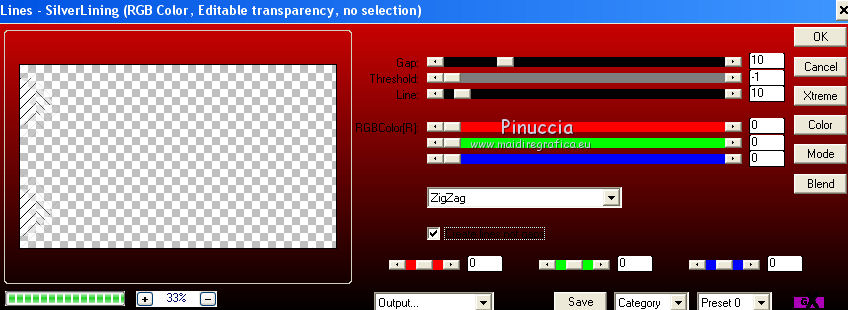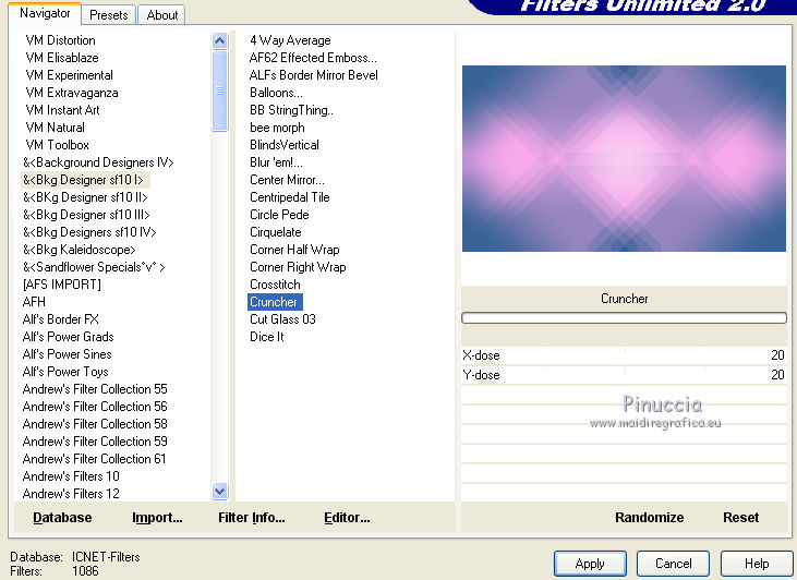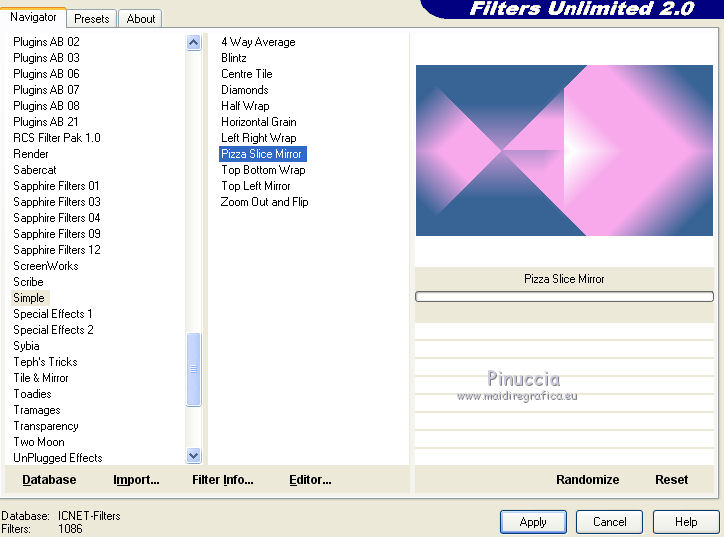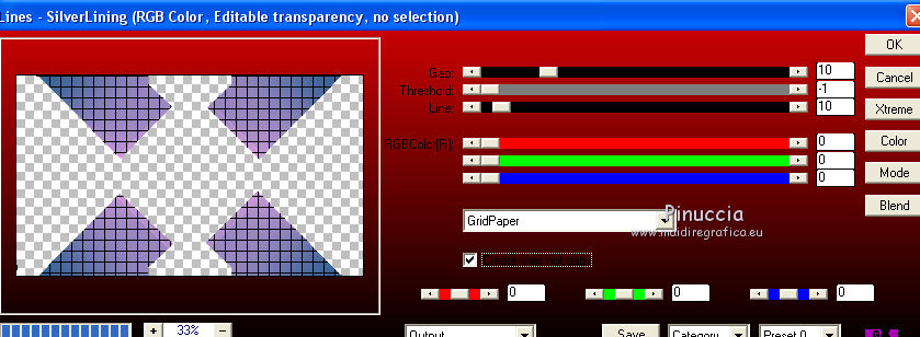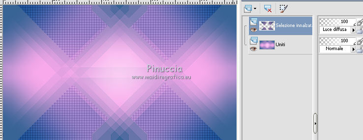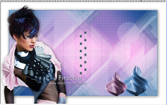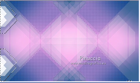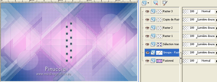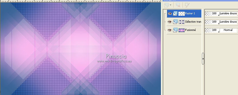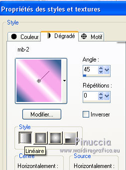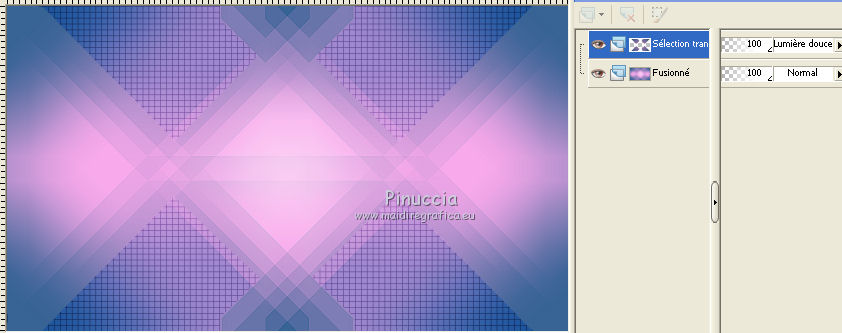 J'ai traduit ce tutoriel avec CorelX12, mais il peut également être exécuté avec les autres versions. Suivant la version utilisée, vous pouvez obtenir des résultats différents. Depuis la version X4, la fonction Image>Miroir a été remplacée par Image>Renverser horizontalement, et Image>Renverser avec Image>Renverser verticalement . Dans les versions X5 et X6, les fonctions ont été améliorées par la mise à disposition du menu Objets. Avec la nouvelle version X7, nous avons encore Image>Miroir et Image>Renverser/Retourner, mais avec nouvelles différences. Voir les détails à ce sujet ici Certaines dénominations ont changées entre les versions de PSP. Les plus frequentes dénominations utilisées: ![]() Traduction en italien ici Vos versions ici Nécessaire pour réaliser ce tutoriel: Matériel qui Pour les tubes merci Syl et Babette. Modules Externes: consulter, si nécessaire, ma section des filtres ici Filters Unlimited 2.0 qui Simple - Pizza Slice Mirror qui &<Bkg Designer sf10I> - Kaleidoscope 2 (à importer dans Unlimited) qui AP 01 [Innovations] - Lines SilverLining qui L&K's - L&K's Palmyre qui Adjust - Variations qui Filtres Simple peuvent être utilisés seuls ou importés dans Filters Unlimited. voir comment le faire ici). Si un filtre est fourni avec cette icône, ![]() Si vous voulez utiliser vos propres couleurs, n'hésitez pas à changer le mode et l'opacité des calques Placer le dégradé dans le dossier Dégradés. Placer les sélections dans le dossier Sélections. Ouvrir le masque en PSP et le minimiser avec le reste du matériel. 1. Placer en avant plan la couleur #376395, et en arrière plan la couleur #ffffff. ![]() Placer en avant plan le dégradé mb-2, avec ces paramètres. ![]() 2. Ouvrir une nouvelle image transparente 950 x 550 pixels. Remplir du dégradé.3. Effets>Modules Externes>Filters Unlimited 2.0 - Simple - Pizza Slice Mirror. ![]() 4. Calques>Dupliquer. Image>Miroir. Réduire l'opacité de ce calque à 50%. Calques>Fusionner>Calques visibles. 5. Effets>Modules Externes>Filters Unlimited 2.0 - &<Bkg designer sf10I> - Cruncher, par défaut. ![]() Effets>Effets de bords>Accentuer. 6. Sélections>Charger/Enregistrer une sélection>Charger à partir du disque. Chercher et charger la sélection MB-les-165-1. ![]() Sélections>Transformer la sélection en calque. Sélections>Désélectionner tout. 7. Effets>Modules Externes>AP 01 [Innovations] - Lines SilverLining. ![]() 8. Placer le calque en mode Lumière douce. ![]() 9. Ouvrir deco-165-2, Édition>Copier. Revenir sur votre travail et Édition>Coller comme nouveau calque. Placer le calque en mode Lumière douce. ![]() 10. Sélections>Charger/Enregistrer une sélection>Charger à partir du disque. Chercher et charger la sélection MB-les-165-2. ![]() 11. Calques>Nouveau calque raster. Remplir avec la couleur blanche d'arrière plan.La sélection est floue: vous devriez avoir ce-ci. ![]() Sélections>Désélectionner tout. 12. Effets>Modules Externes>AP 01 [Innovations] - Lines SilverLining. ![]() 13. Placer le calque en mode Lumière douce. ![]() 14. Effets>Effets 3D>Ombre portée, couleur noire. ![]() 15. Calques>Dupliquer. Image>Miroir. 16. Activer deco-165-1, Édition>Copier. Revenir sur votre travail et Édition>Coller comme nouveau calque. Réglage>Netteté>Netteté. 17. Vous positionner sur le calque du bas de la pile. Calques>Nouveau calque raster. Remplir avec la couleur blanche d'arrière plan.18. Calques>Nouveau calque de masque>A partir d'une image. Ouvrir le menu deroulant sous la fenêtre d'origine et vous verrez la liste des images ouverts. Sélectionner le masque masker-mb.165. ![]() Calques>Fusionner>Fusionner le groupe. 19. Effets>Effets de bords>Accentuer. Placer le calque en mode Lumière douce. ![]() 20. Image>Ajouter des bordures, 1 pixel, symétrique, couleur foncée d'avant plan. Image>Ajouter des bordures, 1 pixel, symétrique, couleur blanche. Image>Ajouter des bordures, 1 pixel, symétrique, couleur foncée d'avant plan. 21. Sélections>Sélectionner tout. Image>Ajouter des bordures, 50 pixels, symétrique, couleur blanche. 22. Effets>Effets 3D>Ombre portée, couleur noire. ![]() Sélections>Désélectionner tout. 23. Activer il tube SvB (877) Beauty, Édition>Copier. Revenir sur votre travail et Édition>Coller comme nouveau calque. Déplacer le tube à gauche.24. Effets>Effets 3D>Ombre portée, couleur noire. ![]() 25. Activer vase-34–14, Édition>Copier. Revenir sur votre travail et Édition>Coller comme nouveau calque. Image>Redimensionner, à 40%, redimensionner tous les calques décoché. 26. Réglage>Teinte et Saturation>Coloriser. ![]() 27. Déplacer le tube en bas à droite.28. Calques>Dupliquer. Image>Redimensionner, à 80%, redimensionner tous les calques décoché. 29. Réglage>Teinte et Saturation>Coloriser. ![]() Déplacer le tube à côté de l'original.![]() Calques>Fusionner>Fusionner le calque de dessous. 30. Effets>Effets 3D>Ombre portée, couleur noire. ![]() 31. Signer votre travail sur un nouveau calque. 32. Image>Ajouter des bordures, 1 pixel, symétrique, couleur foncée d'avant plan. Image>Redimensionner - à 900 pixels de largeur, redimensionner tous les calques décoché. Enregistrer en jpg. ![]() Si vous avez des problèmes, ou des doutes, ou vous trouvez un link modifié, ou seulement pour me dire que ce tutoriel vous a plu, vous pouvez m'écrire. 27 Juillet 2014 |