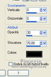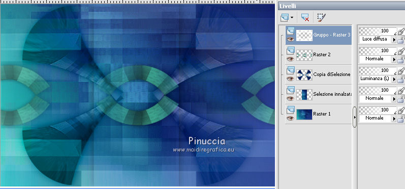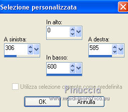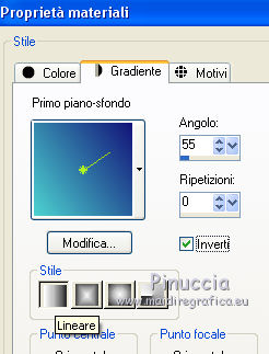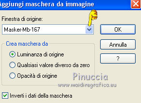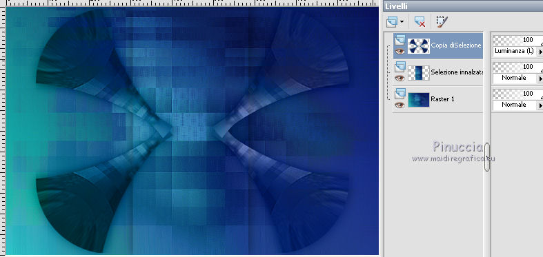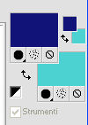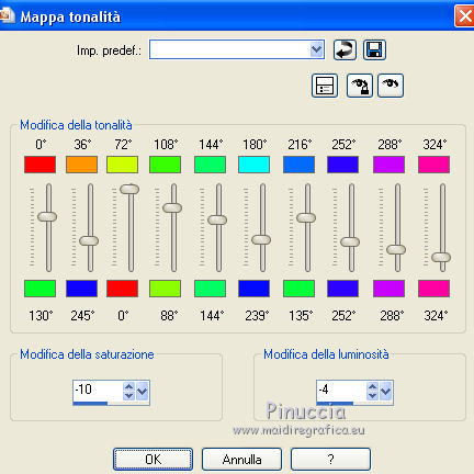 qui puoi trovare qualche risposta ai tuoi dubbi. Se l'argomento che ti interessa non è presente, ti prego di segnalarmelo. Il tutorial può essere eseguito con ogni versione di PSP. Dalla versione X4, il comando Immagine>Rifletti è stato sostituito con Immagine>Capovolgi in orizzontale, e il comando Immagine>Capovolgi con Immagine>Capovolgi in verticale. Nelle versioni X5 e X6, le funzioni sono state migliorate rendendo disponibile il menu Oggetti. Vedi la scheda sull'argomento qui Per tradurre questo tutorial ho usato PSP X. traduction en français qui Le vostre versioni qui Occorrente: Materiale qui Per il tube grazie Kamalini. Filtri: consulta, se necessario, la mia sezione filtri qui Flaming Pear - Flexify 2 qui Adjust - Variations qui ![]() se stai usando altri colori, sperimenta le modalità di miscelatura e opacità più adatte ai tuoi colori Apri le maschere in PSP e minimizzale con il resto del materiale. 1. Imposta il colore di primo piano con #131478, e il colore di sfondo con il colore #4cd2d0. ![]() Passa il colore di primo piano a Gradiente, stile Lineare. ![]() 2. Apri una nuova immagine trasparente 900 x 600 pixels, e riempila con il gradiente.3. Livelli>Nuovo livello raster. Selezione>Seleziona tutto. 4. Apri ag-167 e vai a Modifica>Copia. Torna al tuo lavoro e vai a Modifica>Incolla nella selezione. Selezione>Deseleziona. 5. Regola>Tonalità e saturazione>Mappa tonalità. ![]() Nel tutorial è stato utilizzato questo strumento. Con il filtro Nik Software - Bi-color filters, puoi sperimentare altre belle combinazioni di colore di questo sfondo 6. Cambia la modalità di miscelatura di questo livello in Sovrapponi. Livelli>Unisci>Unisci giù. 7. Attiva lo strumento Selezione ![]() (non importa il tipo di selezione impostato, perchè con la selezione personalizzata si ottiene sempre un rettangolo) clicca sull'icona Selezione personalizzata ![]() e imposta i seguenti settaggi. ![]() Selezione>Innalza selezione a livello. Selezione>Deseleziona. 8. Effetti>Effetti 3D>Sfalsa ombra, colore nero. ![]() 9. Livelli>Duplica. Effetti>Plugins>Flaming Pear - Flexify 2. ![]() 10. Immagine>Ridimensiona, al 90%, tutti i livelli non selezionato. 11. Effetti>Effetti di immagine>Scostamento. ![]() 12. Effetti>Effetti 3D>Sfalsa ombra, colore nero. ![]() 13. Livelli>Duplica. Immagine>Rifletti. Livelli>Unisci>Unisci giù. 14. Livelli>Duplica. Immagine>Capovolgi. Livelli>Unisci>Unisci giù. 15. Cambia la modalità di miscelatura di questo livello in Luminanza (esistente). ![]() 16. Apri deco-1-167, e vai a Modifica>Copia. Torna al tuo lavoro e vai a Modifica>Incolla come nuovo livello. 17. Effetti>Effetti di immagine>Motivo unico - Fianco a fianco. ![]() 18. Imposta il colore di primo piano con il colore bianco #ffffff. Livelli>Nuovo livello raster. Riempi con il colore bianco.![]() 19. Livelli>Nuovo livello maschera>Da immagine. Apri il menu sotto la finestra di origine e vedrai la lista dei files aperti. Carica la maschera Masker-Mb-167, con i seguenti settaggi. ![]() Livelli>Unisci>Unisci gruppo. Cambia la modalità di miscelatura di questo livello in Luce diffusa. ![]() 20. Livelli>Nuovo livello raster. Riempi con il colore bianco.21. Livelli>Nuovo livello maschera>Da immagine. Apri il menu sotto la finestra di origine e carica la maschera MASK-MD-041, con i seguenti settaggi. ![]() Livelli>Unisci>Unisci gruppo. Regola>Messa a fuoco>Metti a fuoco. 22. Immagine>Aggiungi bordatura, 1 pixel, simmetriche, con il colore scuro #131478. Immagine>Aggiungi bordatura, 2 pixels, simmetriche, con il colore bianco di primo piano. Immagine>Aggiungi bordatura, 1 pixel, simmetriche, con il colore scuro #131478. 23. Selezione>Seleziona tutto. Immagine>Aggiungi bordatura, 50 pixels, simmetriche, con il colore bianco. Effetti>Effetti 3D>Sfalsa ombra, colore nero. ![]() Selezione>Deseleziona. 24. Effetti>Plugins>Adjust - Variations. Un clic su Original per annullare eventuali precedenti settaggi memorizzati dal filtri, un clic su Darker e ok. 25. Apri kamalini-174.png, e vai a Modifica>Copia. Torna al tuo lavoro e vai a Modifica>Incolla come nuovo livello. Spostalo a destra.26. Effetti>Effetti 3D>Sfalsa ombra, colore nero. ![]() 27. Immagine>Aggiungi bordatura, 1 pixel, simmetriche, con il colore scuro #131478. Firma il tuo lavoro su un nuovo livello. 28. Livelli>Unisci>Unisci tutto. Immagine>Ridimensiona, a 900 pixels di larghezza. Salva in formato jpg. Per questo esempio ho usato tubes di Criss ![]() Animabelle ![]() ![]() Se hai problemi o dubbi, o trovi un link non funzionante, o anche soltanto per un saluto, scrivimi. 29 Agosto 2014 |