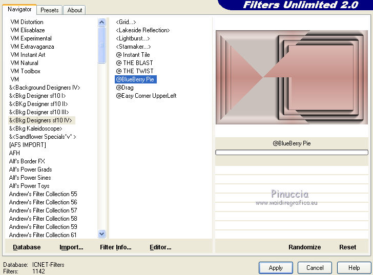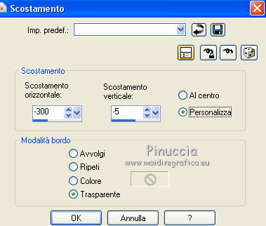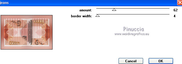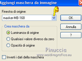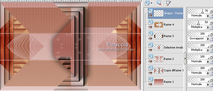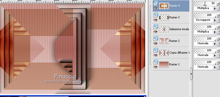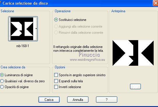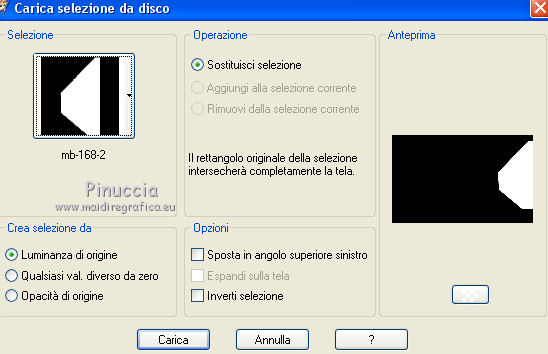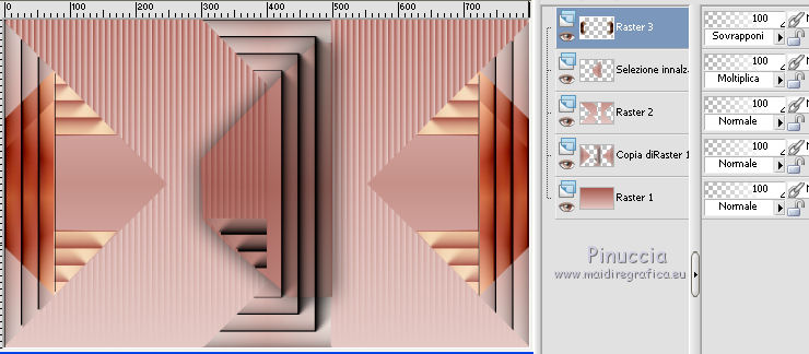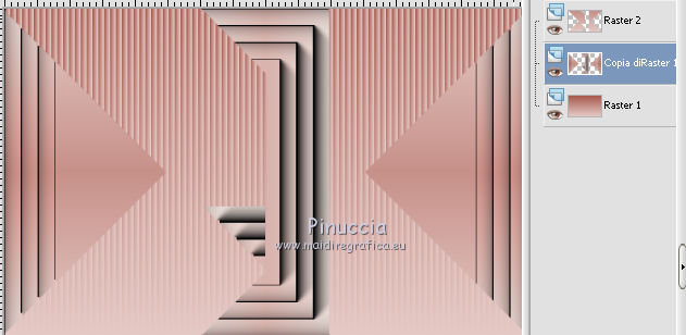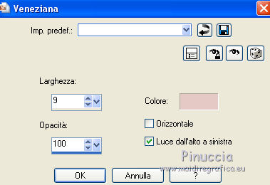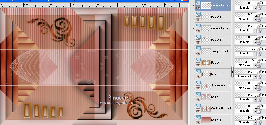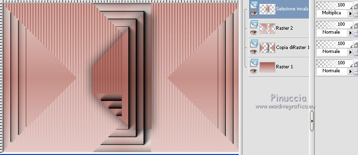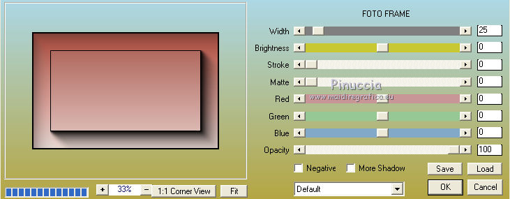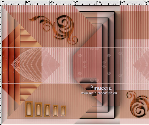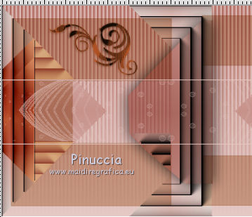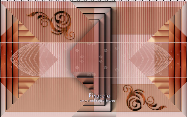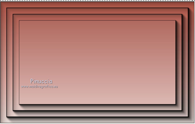 qui puoi trovare qualche risposta ai tuoi dubbi. Se l'argomento che ti interessa non è presente, ti prego di segnalarmelo. Il tutorial può essere eseguito con ogni versione di PSP. Dalla versione X4, il comando Immagine>Rifletti è stato sostituito con Immagine>Capovolgi in orizzontale, e il comando Immagine>Capovolgi con Immagine>Capovolgi in verticale. Nelle versioni X5 e X6, le funzioni sono state migliorate rendendo disponibile il menu Oggetti. Con la nuova versione X7, sono tornati Rifletti/Capovolgi, ma con nuove differenze Vedi la scheda sull'argomento qui Per tradurre questo tutorial ho usato PSP X. traduction en français qui Le vostre versioni qui Occorrente: Materiale qui Filtri: consulta, se necessario, la mia sezione filtri qui Filters Unlimited 2.0 qui <Bkg Designer sf10IV> (da importare in Unlimited) qui Penta.com - Jeans qui AAA Frames - Foto Frame qui I filtri Simple e VM Natural si possono usare da soli o importati in Filters Unlimited (come fare vedi qui) Se un filtro fornito appare con questa icona ![]() se stai usando altri colori, sperimenta le modalità di miscelatura e opacità più adatte ai tuoi colori Nel nuovo Corel17 non c'è il gradiente di primo piano/sfondo. Trovi i gradienti delle versioni precedenti qui Metti le selezioni nella cartella Selezioni. Apri la maschere in PSP e minimizzala con il resto del materiale. 1. Imposta il colore di primo piano con #e5c9c5, e il colore di sfondo con il colore #a7584c. ![]() Passa il colore di primo piano a Gradiente, stile Lineare. ![]() 2. Apri una nuova immagine trasparente 800 x 500 pixels, e riempila con il gradiente.3. Livelli>Duplica. 4. Selezione>Seleziona tutto. Effetti>Plugins>AAA Frames - Foto Frame. ![]() 5. Selezione>Modifica>Contrai - 26 pixels. Effetti>Plugins>AAA Frames - Foto Frame, con i settaggi precedenti. 6. Selezione>Modifica>Contrai - 26 pixels. Effetti>Plugins>AAA Frames - Foto Frame, con i settaggi precedenti. Selezione>Deseleziona. Dovresti avere questo. ![]() 7. Effetti>Plugins>Filters Unlimited 2.0 - <Bkg Designer sf10IV> - @BlueBerry Pie. ![]() Ripeti l'Effetto una seconda volta. 8. Selezione>Carica/Salva selezione>Carica selezione da disco. Cerca e carica la selezione mb-168-1. ![]() Premi sulla tastiera il tasto CANC ![]() 9. Livelli>Nuovo livello raster. Riempi con il gradiente.10. Effetti>Effetti di trama>Veneziana - colore di primo piano #e5c9c5. ![]() Selezione>Deseleziona. 11. Attiva il livello copia di Raster 1. ![]() 12. Selezione>Carica/Salva selezione>Carica selezione da disco. Cerca e carica la selezione mb-168-2. ![]() Selezione>Innalza selezione a livello. Selezione>Deseleziona. 13. Livelli>Disponi>Porta in alto. 14. Effetti>Effetti di immagine>Scostamento. ![]() 15. Effetti>Effetti 3D>Sfalsa ombra, colore nero. ![]() cambia la modalità di miscelatura di questo livello in Moltiplica. ![]() 16. Apri Deco-186-1, e vai a Modifica>Copia. Torna al tuo lavoro e vai a Modifica>Incolla come nuovo livello. Cambia la modalità di miscelatura di questo livello in Sovrapponi. ![]() 17. Apri Deco-186-2, e vai a Modifica>Copia. Torna al tuo lavoro e vai a Modifica>Incolla come nuovo livello. 18. Cambia la modalità di miscelatura di questo livello in Moltiplica, e abbassa l'opacità al 50%. ![]() 19. Livelli>Nuovo livello raster. Riporta il colore di primo piano a Colore, e riempi il livello con il colore di primo piano #e5c9c5.20. Livelli>Nuovo livello maschera>Da immagine. Apri il menu sotto la finestra di origine e vedrai la lista dei files aperti. Carica la maschera masker-MB-168.jpg. ![]() Livelli>Unisci>Unisci gruppo. Abbassa l'opacità di questo livello al 70%. ![]() 21. Apri deco-168-3, e vai a Modifica>Copia. Torna al tuo lavoro e vai a Modifica>Incolla come nuovo livello. Spostalo in alto a sinistra.![]() 22. Livelli>Duplica. Immagine>Rifletti. Immagine>Capovolgi. se stai usando il nuovo Corel17: Immagine>Rifletti>Rifletti orizzontalmente. Immagine>Rifletti>Rifletti verticalmente. 23. Immagine>Ridimensiona, al 90%, tutti i livelli non selezionato. Posiziona correttamente il duplicato.![]() 24. Apri deco-168-4, e vai a Modifica>Copia. Torna al tuo lavoro e vai a Modifica>Incolla come nuovo livello. Sposta l'elemento in basso a sinistra.![]() 25. Livelli>Duplica. Immagine>Rifletti. Immagine>Capovolgi. con Corel17: Immagine>Rifletti>Rifletti orizzontalmente. Immagine>Rifletti>Rifletti verticalmente A questo punto, abbiamo ![]() 26. Immagine>Aggiungi bordatura, 1 pixel, simmetriche, colore chiaro. Immagine>Aggiungi bordatura, 1 pixel, simmetriche, colore scuro. 27. Selezione>Seleziona tutto. Modifica>Copia. 28. Immagine>Aggiungi bordatura, 50 pixels, simmetriche, colore chiaro. Selezione>Inverti. Modifica>Incolla nella selezione. 29. Regola>Sfocatura>Sfocatura gaussiana - raggio 50. ![]() 30. Effetti>Plugins>Penta.com - Jeans, con i settaggi standard. ![]() 31. Selezione>Inverti. Effetti>Effetti 3D>Sfalsa ombra, colore nero. ![]() Selezione>Deseleziona. 32. Apri il tube 19b550ad, e vai a Modifica>Copia. Torna al tuo lavoro e vai a Modifica>Incolla come nuovo livello. Sposta il tube a destra.33. Effetti>Effetti 3D>Sfalsa ombra, colore nero. ![]() 34. Immagine>Aggiungi bordatura, 1 pixel, simmetriche, colore scuro. 35. Immagine>Ridimensiona, a 900 pixels di larghezza, tutti i livelli selezionato. 36. Firma il tuo lavoro su un nuovo livello. Livelli>Unisci>Unisci tutto e salva in formato jpg. ![]() Se hai problemi o dubbi, o trovi un link non funzionante, o anche soltanto per un saluto, scrivimi. 29 Settembre 2014 |