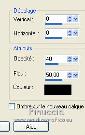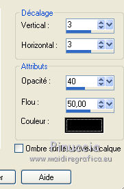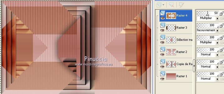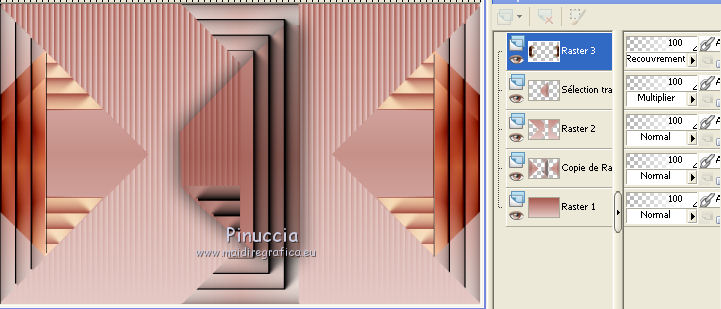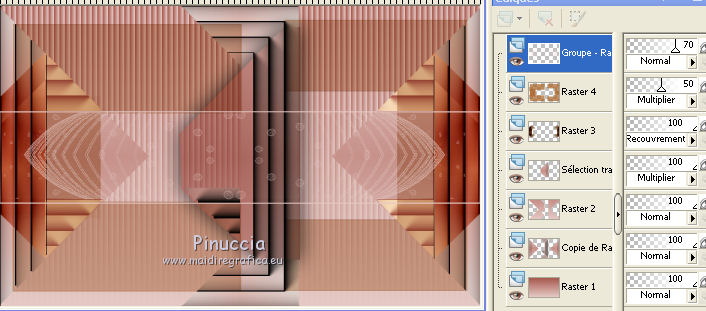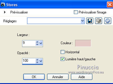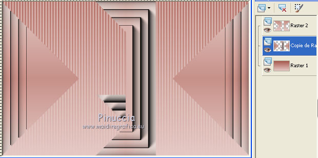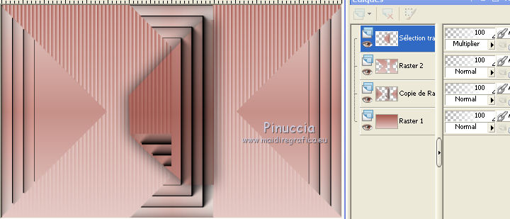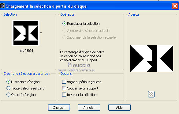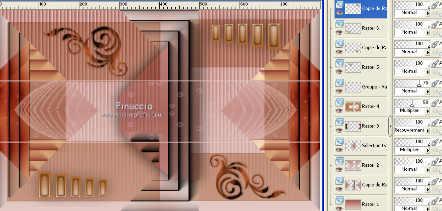 J'ai traduit ce tutoriel avec CorelX12, mais il peut également être exécuté avec les autres versions. Suivant la version utilisée, vous pouvez obtenir des résultats différents. Depuis la version X4, la fonction Image>Miroir a été remplacée par Image>Renverser horizontalement, et Image>Renverser avec Image>Renverser verticalement . Dans les versions X5 et X6, les fonctions ont été améliorées par la mise à disposition du menu Objets. Avec la nouvelle version X7, nous avons encore Image>Miroir et Image>Renverser/Retourner, mais avec nouvelles différences. Voir les détails à ce sujet ici Certaines dénominations ont changées entre les versions de PSP. Les plus frequentes dénominations utilisées: ![]() Traduction en italien ici Vos versions ici Nécessaire pour réaliser ce tutoriel: Matériel qui Pour le tube merci Kamalini Modules Externes: consulter, si nécessaire, ma section des filtres ici Filters Unlimited 2.0 qui <Bkg Designer sf10IV> (da importare in Unlimited) qui Penta.com - Jeans qui AAA Frames - Foto Frame qui Filtres Penta.com peuvent être utilisés seuls ou importés dans Filters Unlimited. voir comment le faire ici). Si un filtre est fourni avec cette icône, ![]() Si vous voulez utiliser vos propres couleurs, n'hésitez pas à changer le mode et l'opacité des calques Dans Corel X7 vous ne trouvez pas le dégradé d'avant plan/arrière plan ou Corel_06_029. Pour avoir ce dégradé, vous pouvez utiliser le dégradé des versions antérieures. Ici vous trouvez les dégradés de CorelX. Placer les sélections dans le dossier Sélections. Ouvrir le masque en PSP et le minimiser avec le reste du matériel. 1. Placer en avant plan la couleur #e5c9c5, et en arrière plan la couleur #a7584c. ![]() Préparer un dégradé d'avant plan/arrière plan, style Linéaire. ![]() 2. Ouvrir une nouvelle image transparente 800 x 500 pixels. Remplir du dégradé.3. Calques>Dupliquer. 4. Sélections>Sélectionner tout. Effets>Modules Externes>AAA Frames - Foto Frame. ![]() 5. Sélections>Modifier>Contracter - 26 pixels. Effets>Modules Externes>AAA Frames - Foto Frame, comme précédemment. 6. Sélections>Modifier>Contracter - 26 pixels. Effets>Modules Externes>AAA Frames - Foto Frame, comme précédemment. Sélections>Désélectionner tout. Vous devriez avoir ce-ci. ![]() 7. Effets>Modules Externes>Filters Unlimited 2.0 - <Bkg Designer sf10IV> - @BlueBerry Pie. ![]() Répéter l'Effet un deuxième fois. 8. Sélections>Charger/Enregistrer une sélection>Charger à partir du disque. Chercher et charger la sélection mb-168-1. ![]() Presser CANC sur le clavier ![]() 9. Calques>Nouveau calque raster. Remplir le calque du dégradé.10. Effets>Effets de textures>Stores - couleur d'avant plan #e5c9c5. ![]() Sélections>Désélectionner tout. 11. vous positionner sur le calque copie de Raster 1. ![]() 12. Sélections>Charger/Enregistrer une sélection>Charger à partir du disque. Chercher et charger la sélection mb-168-2. ![]() Sélections>Transformer la sélection en calque. Sélections>Désélectionner tout. 13. Calques>Agencer>Placer en haut de la pile. 14. Effets>Effets d'image>Décalage. ![]() 15. Effets>Effets 3D>Ombre portée, couleur noire. ![]() Placer le calque en mode Multiplier. ![]() 16. Activer Deco-186-1, - Édition>Copier. Revenir sur votre travail et Édition>Coller comme nouveau calque. Placer le calque en mode Recouvrement. ![]() 17. Activer Deco-186-2, - Édition>Copier. Revenir sur votre travail et Édition>Coller comme nouveau calque. 18. Placer le calque en mode Multiplier et réduire l'opacité à 50%. ![]() 19. Calques>Nouveau calque raster. Placer en avant plan la couleur. Remplir le calque avec la couleur d'avant plan #e5c9c5.20. Calques>Nouveau calque de masque>A partir d'une image. Ouvrir le menu deroulant sous la fenêtre d'origine et vous verrez la liste des images ouverts. Charger le masque masker-MB-168. ![]() Calques>Fusionner>Fusionner le groupe. Réduire l'opacité de ce calque à 70%. ![]() 21. Activer deco-168-3, - Édition>Copier. Revenir sur votre travail et Édition>Coller comme nouveau calque. Positionner l'élément en haut à gauche.![]() 22. Calques>Dupliquer. Image>Miroir. Image>Renverser. Avec Corel17: Image>Miroir>Miroir horizontal. Image>Miroir>Miroir vertical. 23. Image>Redimensionner, à 90%, redimensionner tous les calques décoché. Positionner bien l'élément.![]() 24. Activer deco-168-4, - Édition>Copier. Revenir sur votre travail et Édition>Coller comme nouveau calque. Positionner l'élément en bas à gauche.![]() 25. Calques>Dupliquer. Image>Miroir. Image>Renverser. Avec Corel17: Image>Miroir>Miroir horizontal. Image>Miroir>Miroir vertical. À cette point, nous avons ce-ci. ![]() 26. Image>Ajouter des bordures, 1 pixel, symétrique, couleur claire. Image>Ajouter des bordures, 1 pixel, symétrique, couleur foncée. 27. Sélections>Sélectionner tout. Édition>Copier. 28. Image>Ajouter des bordures, 50 pixels, symétrique, couleur claire. Sélections>Inverser. Édition>Coller dans la sélection. 29. Réglage>Flou>Flou gaussien - rayon 50. ![]() 30. Effets>Modules Externes>Penta.com - Jeans, par défaut. ![]() 31. Sélections>Inverser. Effets>Effets 3D>Ombre portée, couleur noire. ![]() Sélections>Désélectionner tout. 32. Activer le tube 19b550ad, - Édition>Copier. Revenir sur votre travail et Édition>Coller comme nouveau calque. Déplacer le tube à droite.33. Effets>Effets 3D>Ombre portée, couleur noire. ![]() 34. Image>Ajouter des bordures, 1 pixel, symétrique, couleur foncée. 35. Signer votre travail sur un nouveau calques. Calques>Fusionner tout. 36. Image>Redimensionner, à 900 pixels de largeur, redimensionner tous les calques coché. Enregistrer en jpg. Le tube de cette version est de Verlaine ![]() ![]() Si vous avez des problèmes, ou des doutes, ou vous trouvez un link modifié, ou seulement pour me dire que ce tutoriel vous a plu, vous pouvez m'écrire. 29 Septembre 2014 |