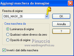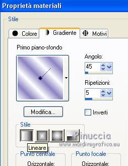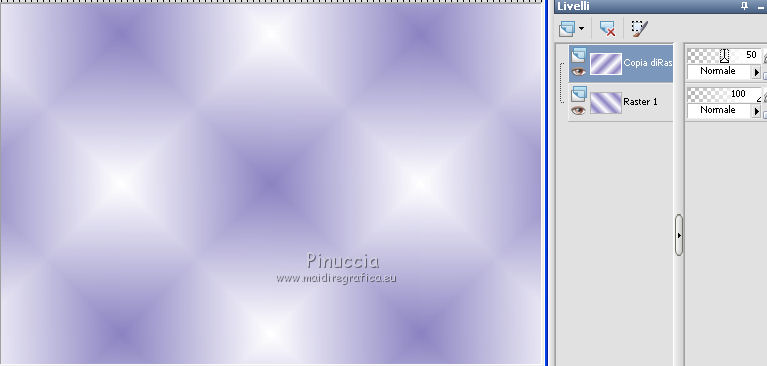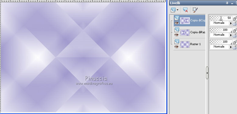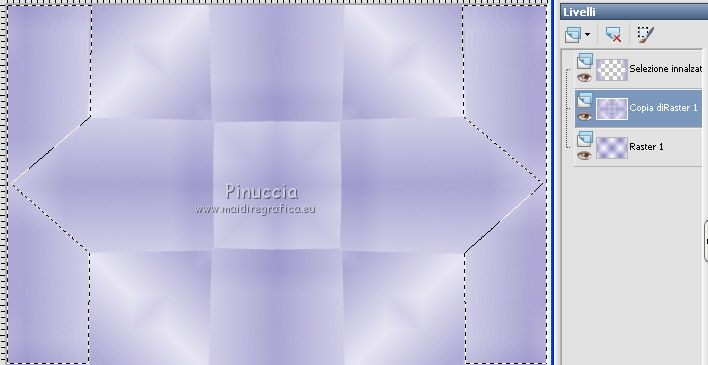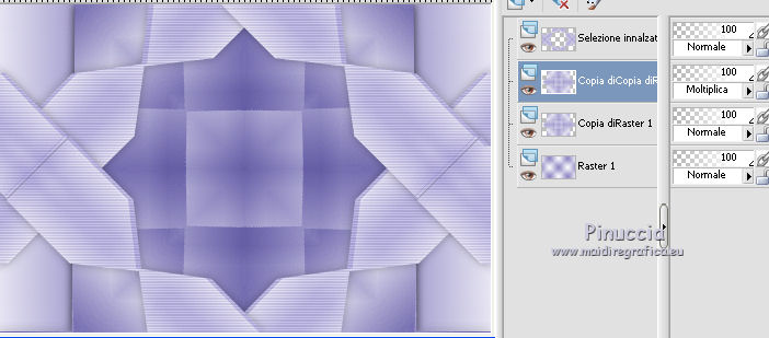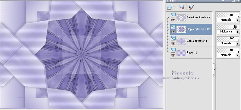 qui puoi trovare qualche risposta ai tuoi dubbi. Se l'argomento che ti interessa non è presente, ti prego di segnalarmelo. Il tutorial può essere eseguito con ogni versione di PSP. Dalla versione X4, il comando Immagine>Rifletti è stato sostituito con Immagine>Capovolgi in orizzontale, e il comando Immagine>Capovolgi con Immagine>Capovolgi in verticale. Nelle versioni X5 e X6, le funzioni sono state migliorate rendendo disponibile il menu Oggetti. Con la nuova versione X7, sono tornati Rifletti/Capovolgi, ma con nuove differenze Vedi la scheda sull'argomento qui Per tradurre questo tutorial ho usato PSP X. traduction en français qui Le vostre versioni qui Occorrente: Materiale qui Filtri in caso di dubbi, ricorda di consultare la mia sezione filtri qui Filters Unlimited 2.0 qui &<Bkg Kaleidoscope> - Kaleidoscope 2, Kaleidoscope Butterfly (da importare in Unlimited) qui Simple qui Mehdi - Sorting Tiles qui Carolaine and Sensibility - CsTexture, Cs-LDots qui I filtri Simple si possono usare da soli o importati in Filters Unlimited (come fare vedi qui) Se un filtro fornito appare con questa icona Inoltre, con alcuni filtri importati in Unlimited potresti ottenere risultati differenti secondo la versione di Unlimited che stai usando: è infatti in circolazione una versione di questo filtro che non si installa e che è composto da files in formato 8bf. Non ci sono regole che possono definire il perchè di queste differenze, per questo possiamo rilevarle soltanto confrontando il nostro risultato con quello del tutorial original. ![]() se stai usando altri colori, sperimenta le modalità di miscelatura e opacità più adatte ai tuoi colori Nelle ultime versioni di Corel, non c'è il gradiente di primo piano/sfondo. Trovi i gradienti delle versioni precedenti qui Metti le selezioni nella cartella Selezioni. Apri la maschera in PSP e minimizzala con il resto del materiale. 1. Imposta il colore di primo piano con #ffffff, e il colore di sfondo con #8b83c2. ![]() Passa il colore di primo piano a Gradiente di primo piano/sfondo (Corel_06_029), stile Lineare. ![]() 2. Apri una nuova immagine trasparente 900 x 600 pixels, ![]() e riempila con il gradiente.3. Livelli>Duplica. Immagine>Rifletti. Abbassa l'opacità di questo livello al 50%. ![]() 4. Livelli>Unisci>Unisci giù. Effetti>Effetti di bordo>Aumenta di più. 5. Livelli>Duplica. Effetti>Plugins>Simple - Pizza Slice Mirror. 6. Livelli>Duplica. Immagine>Rifletti. Abbassa l'opacità di questo livello al 50%. ![]() Livelli>Unisci>Unisci giù. 7. Effetti>Plugins>Filters Unlimited 2.0 - &<Bkg Kaleidoscope> - Kaleidoscope 2. ![]() 8. Selezione>Carica/Salva selezione>Carica selezione da disco. Cerca e carica la selezione mb-172-2. ![]() Selezione>Innalza selezione a livello. 9. Attiva il livello copia di Raster 1. ![]() Premi sulla tastiera il tasto CANC ![]() Selezione>Deseleziona. 10. Attiva il livello superiore (selezione innalzata). Effetti>Plugins>Simple - Diamonds. 11. Effetti>Plugins>Carolaine and Sensibility - CS-Texture. ![]() 12. Effetti>Effetti 3D>Sfalsa ombra, colore nero. ![]() 13. Livelli>Duplica. Immagine>Rifletti. Livelli>Unisci>Unisci giù. 14. Attiva il livello centrale - Copia di raster 1. Effetti>Effetti 3D>Sfalsa ombra, colore nero. ![]() 15. Livelli>Duplica. Cambia la modalità di miscelatura di questo livello in Moltiplica. ![]() Effetti>Plugins>Filters Unlimited 2.0 - &<Bkg Kaleidoscope> - Kaleidoscope Butterfly. ![]() Questo è uno dei casi in cui il risultato è differente secondo la versione di Unlimited che stai usando. (vedi la nota sotto la lista dei filtri). Per eseguire il tutorial ho usato la versione software di Unlimited. Se stai usando la versione con files in formato 8bf avrai un risultato differente (vedi la schermata) ![]() Se non vuoi sostituire nei Percorsi File il filtro con la versione software, puoi cliccare su Randomize per scegliere un altro risultato, o usare questo zip fornito da Mieke 18. Di nuovo: Effetti>Plugins>Filters Unlimited 2.0 - &<Bkg Kaleidoscope> - Kaleidoscope Butterfly, con i settaggi standard. ![]() Con la versione Unlimited composta da files in formato 8bf: ![]() 19. Effetti>Plugins>Carolaine and Sensibility - CS-LDots - 2 volte con i settaggi standard. ![]() 20. Immagine>Ridimensiona, all'80%, tutti i livelli non selezionato. Abbassa l'opacità di questo livello all'80%. ![]() 21. Effetti>Effetti 3D>Sfalsa ombra, colore nero. ![]() 22. Selezione>Carica/Salva selezione>Carica selezione da disco. Cerca e carica la selezione mb-172-1. ![]() Premi sulla tastiera il tasto CANC .Selezione>Deseleziona. 23. Attiva il livello inferiore Raster 1. Effetti>Plugins>Mehdi - Sorting Tiles ![]() Effetti>Effetti di bordo>Aumenta. 24. Attiva il livello superiore. Livelli>Nuovo livello raster. Riporta il colore di primo piano a Colore, e riempi il livello con il colore bianco.25. Livelli>Nuovo livello maschera>Da immagine. Apri il menu sotto la finestra di origine e vedrai la lista dei files aperti. Seleziona la maschera, con i seguenti settaggi. ![]() Livelli>Unisci>Unisci gruppo. 26. Livelli>Duplica. 27. Apri deco-1 e vai a Modifica>Copia. Torna al tuo lavoro e vai a Modifica>Incolla come nuovo livello. 28. Apri deco-2 e vai a Modifica>Copia. Torna al tuo lavoro e vai a Modifica>Incolla come nuovo livello. 29. Apri deco-3 e vai a Modifica>Copia. Torna al tuo lavoro e vai a Modifica>Incolla come nuovo livello. 30. Apri 0_b81ab_1991591c_L, e vai a Modifica>Copia. Torna al tuo lavoro e vai a Modifica>Incolla come nuovo livello. Posiziona correttamente il tube.31. Effetti>Effetti 3D>Sfalsa ombra, colore nero. ![]() 32. Immagine>Aggiungi bordatura, 1 pixel, simmetriche, colore #8b83c2. Immagine>Aggiungi bordatura, 3 pixels, simmetriche, colore #ffffff. Immagine>Aggiungi bordatura, 1 pixel, simmetriche, colore #8b83c2. 33. Selezione>Seleziona tutto. Immagine>Aggiungi bordatura, 50 pixels, simmetriche, colore bianco. Effetti>Effetti 3D>Sfalsa ombra, colore nero. ![]() Selezione>Deseleziona. 34. Immagine>Aggiu