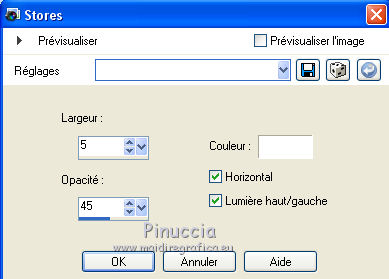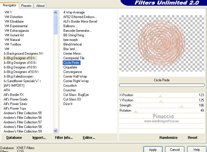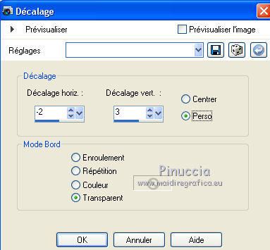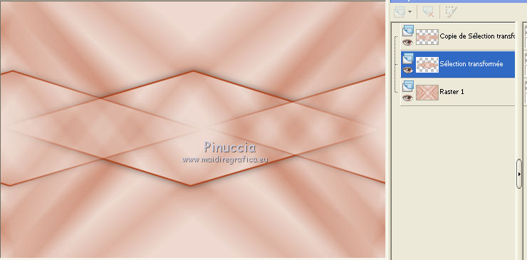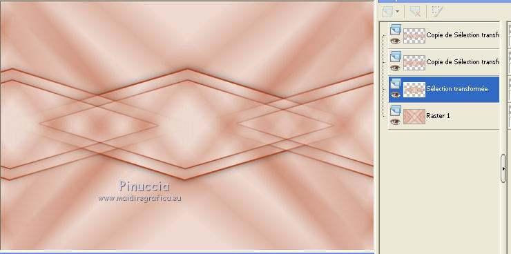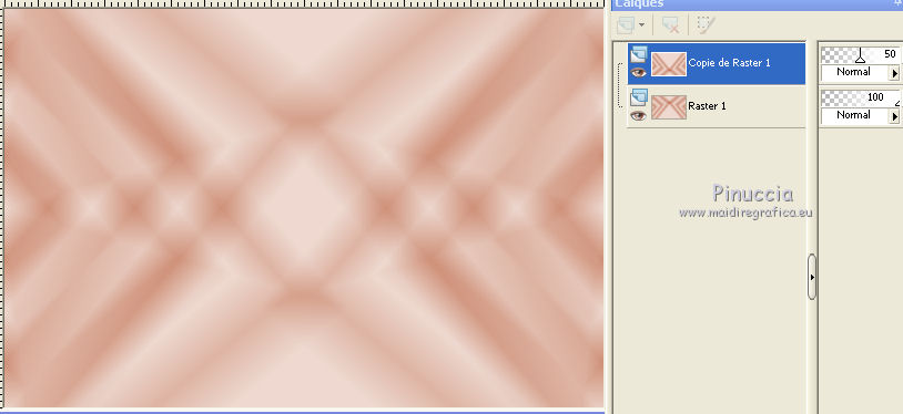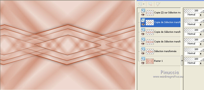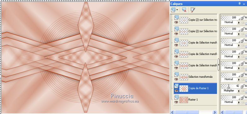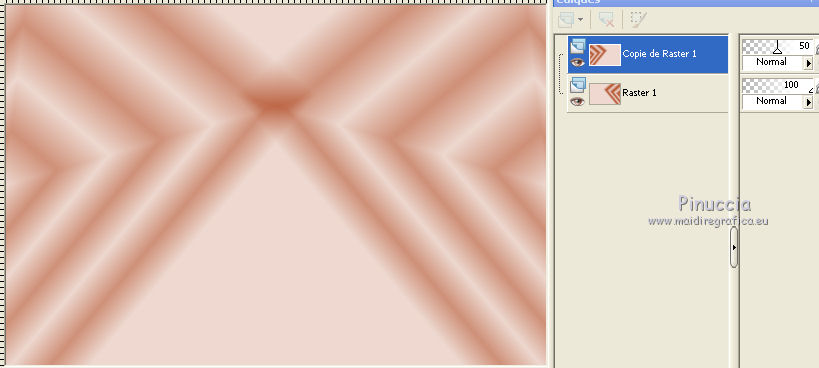 J'ai traduit ce tutoriel avec CorelX12, mais peut également être exécuté avec les autres versions. Suivant la version utilisée, vous pouves obtenir des résultats différents. Depuis la version X4, la fonction Image>Miroir a été remplacée par Image>Renverser horizontalment, et Image>Renverser avec Image>Renverser verticalemente. Dans les versions X5 et X6, les fonctions ont été améliorées par la mise à disposition du menu Objets. Dans la nouvelle version X7, nous avons à nouveau Miroir/Renverser, mais avec autres différences. Voir plus les détails à ce sujet ici Certaines dénominations ont changées entre les versions de PSP. Les plus frequentes dénominations utilisées: ![]() Traduction en italien ici Vos versions ici Nécessaire pour réaliser ce tutoriel: Matériel qui Modules Externes Filters Unlimited 2.0 ici &<Bkg Designer sf10I> - Circle Pede (à importer dans Unlimited) ici ![]() Si vous voulez utiliser vos propres couleurs, n'hésitez pas à changer le mode et l'opacité des calques Dans Corel X7 vous ne trouvez pas le dégradé d'avant plan/arrière plan ou Corel_06_029. Pour avoir ce dégradé, vous pouvez utiliser le dégradé des versions antérieures. Ici vous trouvez les dégradés de CorelX. Placer la sélection dans le dossier Sélections. Ouvrir le masque en PSP et le minimiser avec le reste du matériel. 1. Placer en avant plan la couleur #edd8cf, et en arrière plan la couleur #b14922. ![]() Préparer un dégradé de premier plan/arrière plan (Corel_06_029), style Rectangulaire. ![]() 2. Ouvrir une nouvelle image transparente 900 x 600 pixels ![]() Remplir du dégradé.3. Calques>Dupliquer. Image>Miroir. Réduire l'opacité de ce calque à 50%. ![]() Calques>Fusionner>Fusionner le calque de dessous. 4. Calques>Dupliquer. Image>Renverser. Réduire l'opacité de ce calque à 50%. ![]() Calques>Fusionner>Fusionner le calque de dessous. 5. Réglage>Netteté>Netteté. 6. Sélections>Charger/Enregistrer une sélection>Charger à partir du disque. Chercher et charger la sélection mb-les-173-1. ![]() Sélections>Transformer la sélection en calque. 7. Sélections>Modifier>Sélectionner les bordures de la sélection. ![]() Mode de correspondance de l'outil Pot de Peinture sur Aucun ![]() Remplir la sélection avec la couleur d'arrière plan.Sélections>Désélectionner tout. 8. Effets>Effets 3D>Ombre portée, couleur noire. ![]() 9. Calques>Dupliquer. Effets>Effets d'image>Mosaïque sans jointures. ![]() 10. Vous positionner sur le calque sélection transformée. ![]() 11. Calques>Dupliquer. Image>Redimensionner, à 80%, redimensionner tous les calques décoché. Calques>Agencer>Placer en haut de la pile. 12. Effets>Effets d'image>Mosaïque sans jointures, comme précédemment. ![]() 13. À nouveau vous positionner sur le calque sélection transformée. ![]() 14. Calques>Dupliquer. Image>Redimensionner, à 50%, redimensionner tous les calques décoché. Calques>Agencer>Placer en haut de la pile. 15. Calques>Dupliquer. Effets>Effets d'image>Mosaïque sans jointures, comme précédemment. ![]() 16. Vous positionner sur le calque de dessous. ![]() 17. Calques>Dupliquer. Calques>Agencer>Placer en haut de la pile. Image>Redimensionner, à 65%, redimensionner tous les calques décoché. 18. Calques>Dupliquer. Image>Redimensionner, à 80%, redimensionner tous les calques décoché. Image>Rotation libre - 90 degrés à gauche. ![]() 19. Effets>Effets d'image>Décalage. ![]() 20. Calques>Dupliquer. Image>Renverser. 21. Effets>Effets d'image>Décalage. ![]() 22. Vous positionner sur le calque du bas de la pile. Calques>Dupliquer. 23. Effets>Effets géométriques>Cercle. ![]() 24. Image>Redimensionner, à 80%, redimensionner tous les calques décoché. 25. Effets>Modules Externes>Filters Unlimited 2.0 - &<Bkg Designer sf10I> - Circle Pede. ![]() 26. Placer le calque en mode Multiplier et réduire l'opacité à 42%. ![]() 27. Placer en avant plan la couleur blanche #ffffff. Calques>Nouveau calque raster. Remplir avec la couleur blanche.28. Calques>Nouveau calque de masque>A partir d'une image. Ouvrir le menu deroulant sous la fenêtre d'origine et vous verrez la liste des images ouverts. Sélectionner le masque masker-MB-173. ![]() Calques>Fusionner>Fusionner le groupe. 29. Effets>Effets 3D>Ombre portée, couleur noire. ![]() 30. Activer le tube PspDesignersClub338-vi, effacer le watermark, Édition>Copier. Revenir sur votre travail et Édition>Coller comme nouveau calque. Calques>Agencer>Placer en haut de la pile. 31. Déplacer le tube à droite.32. Calques>Dupliquer. Réglage>Flou>Flou gaussien - rayon 30. ![]() 33. Effets>Effets de textures>Stores, couleur blanche. ![]() Calques>Agencer>Déplacer vers le bas. 34. Vous positionner sur le calque du haut de la pile. Activer set-3 swirl©Miledy.net composé de 3 calques. Choisir une couleur et vous positionner sur le calque de cette couleur. Édition>Copier. Revenir sur votre travail et Édition>Coller comme nouveau calque. Déplacer le tube en bas à gauche.35. Image>Ajouter de bordures, 2 pixels, symétrique, couleur d'arrière plan #b14922. 36. Sélections>Sélectionner tout. Image>Ajouter des bordures, 50 pixels, symétrique, couleur blanche #ffffff. 37. Effets>Effets 3D>Ombre portée, couleur noire. ![]() Sélections>Désélectionner tout. 38. Image>Ajouter des bordures, 1 pixel, symétrique, couleur d'arrière plan #b14922. 39. Signer votre travail sur un nouveau calque. Calques>Fusionner>Tous et enregistrer en jpg. Le tube de cette version est de Guismo ![]() ![]() Si vous avez des problèmes, ou des doubts, ou trouvez un link corrupte, ou seulement pour me dire que ce tutoriel vous a plu, vous pouvez m'écrire. Mon mail est dans le menu en haut de la page. 31 Janvier 2015 Mes tutoriels sont régulièrement enregistrer chez Tut Writers |