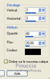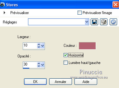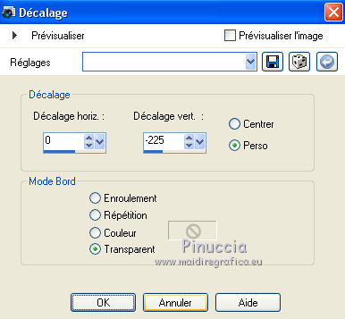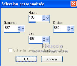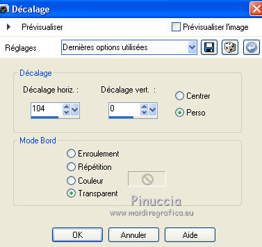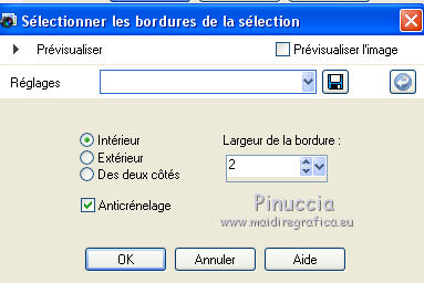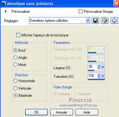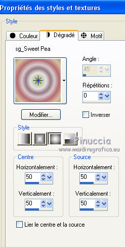 J'ai traduit ce tutoriel avec CorelX12, mais peut également être exécuté avec les autres versions. Suivant la version utilisée, vous pouves obtenir des résultats différents. Depuis la version X4, la fonction Image>Miroir a été remplacée par Image>Renverser horizontalment, et Image>Renverser avec Image>Renverser verticalemente. Dans les versions X5 et X6, les fonctions ont été améliorées par la mise à disposition du menu Objets. Dans la nouvelle version X7, nous avons à nouveau Miroir/Renverser, mais avec autres différences. Voir plus les détails à ce sujet ici Certaines dénominations ont changées entre les versions de PSP. Les plus frequentes dénominations utilisées: ![]() Traduction en italien ici Vos versions ici Nécessaire pour réaliser ce tutoriel: Matériel qui Modules Externes consulter, si nécessaire, ma section de filtre ici Filters Unlimited 2.0 ici &<Bkg Designer sf10III> - Sectorize (da importare in Unlimited) ici Simple - Horizontal Grain ici AFS IMPORT - Mirroff ici Flaming Pear - Flexify 2 ici AAA Frames - Foto Frame ici Filtres Simple et AFS IMPORT peuvent être utilisés seuls ou importés dans Filters Unlimited. voir comment le faire ici). Si un filtre est fourni avec cette icône, ![]() Si vous voulez utiliser vos propres couleurs, n'hésitez pas à changer le mode et l'opacité des calques Placer le dégradé dans le dossier Dégradés. Placer les sélections dans le dossier Sélections. 1. Placer en avant plan la couleur #d6b6c0, et en arrière plan la couleur #b26271. ![]() Placer en avant plan le dégradé sg_sweet Pea, style Halo. ![]() 2. Ouvrir une nouvelle image transparente 900 x 600 pixels ![]() Remplir du dégradé.3. Réglage>Flou>Flou gaussien - rayon 25. ![]() 4. Effets>Modules Externes>AFS IMPORT - Mirroff. ![]() Vous devriez avoir ce-ci: ![]() Si vous avez des problèmes avec le filtre, copier/coller comme nouveau calque le calque que vous trouvez dans le zip: ag-ASF IMPORT Mirroff 5. Calques>Dupliquer. Effets>Modules Externes>Filters Unlimited 2.0 - Simple - Horizontal Grain. ![]() Placer le calque en mode Lumière dure. ![]() 6. Calques>Nouveau calque raster. Remplir le calque du dégradé.7. Sélections>Charger/Enregistrer une sélection>Charger à partir du disque. Chercher et charger la sélection mb-174-1. ![]() Sélections>Inverser. Presser CANC sur le clavier ![]() 8. Sélections>Inverser. Effets>Effets de textures>Stores - couleur foncée. ![]() 9. Sélections>Modifier>Sélectionner les bordures de la sélection. ![]() 10. Mode de correspondance de l'outil Pot de Peinture sur Aucun ![]() Remplir la sélection avec la couleur foncée.Sélections>Désélectionner tout. 11. Effets>Modules Externes>Filters Unlimited 2.0 - &<Bkg Designersf10III> - Sectorize. ![]() Ce-ci est un des cas où le résultat peut changer en fonction de la version d'Unlimited utilisée. Dans le net il y a une version qui n'a besoin d'installation, et est composée de files en format 8bf. Si vous utilisez cette version, vous aurez ce-ci ![]() Pour obtenir le résultat correct, vous devriez remouver cette version des Emplacement des Fichiers et ajouter la version software du filtre. Alternativement, copier/coller sur votre travail le calque dans le zip: Sectorize-155-155 12. Calques>Dupliquer. Effets>Modules Externes>Flaming Pear - Flexify 2. ![]() 13. Placer le calque en mode Luminance (héritée) et réduire l'opacité à 36%. ![]() 14. Sélections>Charger/Enregistrer une sélection>Charger à partir du disque. Chercher et charger la sélection mb-174-2. ![]() Et les traits restant de l'application du filtre Flexify seront sélectionnés. ![]() Presser CANC sur le clavier ![]() Sélections>Désélectionner tout. 15. Effets>Effets d'image>Mosaïque sans jointures. ![]() 16. Effets>Effets d'image>Décalage. ![]() 17. Activer Deco 3, Édition>Copier. Revenir sur votre travail et Édition>Coller comme nouveau calque. 18. Calques>Nouveau calque raster. Activer l'outil Sélection ![]() (peu importe le type de sélection, parce que avec la sélection personnalisée vous obtenez toujours un rectangle), cliquer sur Sélection personnalisée ![]() et setter ces paramètres. ![]() Remplir la sélection du dégradé.19. Sélections>Modifier>Contracter - 10 pixels. Presser CANC sur le clavier ![]() Sélections>Désélectionner tout. 20. Effets>Effets 3D>Biseautage intérieur. 21. Calques>Dupliquer. Image>Redimensionner, à 69%, redimensionner tous les calques décoché. 22. Image>Rotation libre - 45 degrés à droite. ![]() 23. Effets>Effets d'image>Décalage. ![]() Calques>Agencer>Déplacer vers le bas. 24. Calques>nouveau calque raster. Sélection personnalisée comme précédemment.![]() 25. Activer le tube 0_a497a_dfaf7b84_L.psd. Image>Miroir. Édition>Copier. Revenir sur votre travail et Édition>Coller dans la sélection. Sélections>Désélectionner tout. 26. Vous positionner sur le calque du haut de la pile. Calques>Fusionner>Fusionner le calque de dessous - 2 fois. 27. Effets>Effets 3D>Ombre portée, couleur noire. ![]() 28. Calques>Dupliquer. Image>Miroir. 29. Activer le tube 10Flow-0_5099.psd, Édition>Copier. Revenir sur votre travail et Édition>Coller comme nouveau calque. Image>Redimensionner, à 70%, redimensionner tous les calques décoché. Réduire l'opacité de ce calque à 90%. Effets>Effets de bords>Accentuer. 30. Effets>Effets 3D>Ombre portée, comme précédemment. ![]() 31. Activer Deco 1, Édition>Copier. Revenir sur votre travail et Édition>Coller comme nouveau calque. 32. Effets>Effets d'image>Décalage. ![]() 33. Effets>Effets 3D>Ombre portée, comme précédemment. ![]() 34. Activer Deco 2, Édition>Copier. Revenir sur votre travail et Édition>Coller comme nouveau calque. 35. Effets>Effets d'image>Décalage. ![]() Placer le calque en mode Écran. 36. Image>Ajouter des bordures, 1 pixel, symétrique, couleur foncée. Image>Ajouter des bordures, 75 pixels, symétrique, couleur blanche #ffffff. 37. Activer l'outil Baguette magique , 