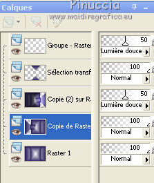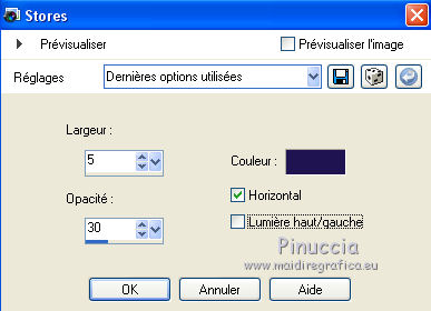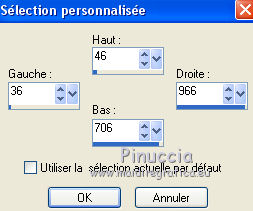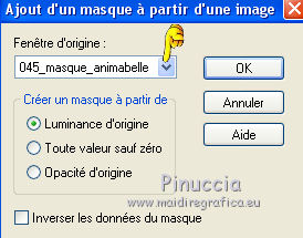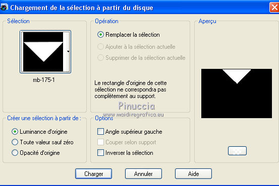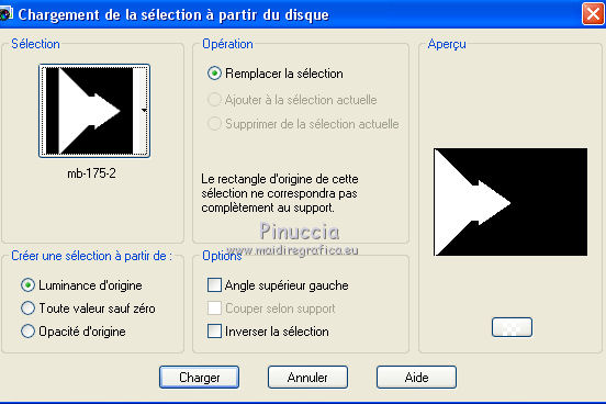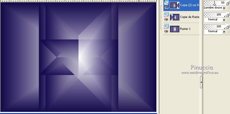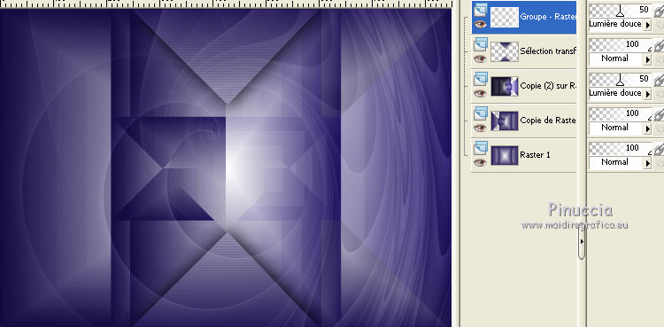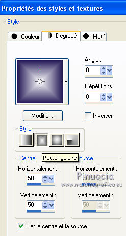 Ce tutoriel a été créé avec CorelX17, mais peut également être exécuté avec les autres versions. Pour traduire le tutoriel j'ai utilisé CorelX et CorelX2. Suivant la version utilisée, vous pouves obtenir des résultats différents. Depuis la version X4, la fonction Image>Miroir a été remplacée par Image>Renverser horizontalment, et Image>Renverser avec Image>Renverser verticalemente. Dans les versions X5 et X6, les fonctions ont été améliorées par la mise à disposition du menu Objets. Dans la nouvelle version X7, nous avons à nouveau Miroir/Renverser, mais avec autres différences. Voir plus les détails à ce sujet ici Certaines dénominations ont changées entre les versions de PSP. Les plus frequentes dénominations utilisées: ![]() Traduction en italien ici Vos versions ici Nécessaire pour réaliser ce tutoriel: Matériel qui Modules Externes consulter, si nécessaire, ma section de filtre ici Filters Unlimited 2.0 ici &<Bkg Kaleidoscope> - @BlueBerry Pie (da importare in Unlimited) ici Carolaine and Sensibility - CS-Reflection, CS-LDots ici Toadies - What are you, Posterize ici AAA Frames - Foto Frame, Texture Frame ici Filtres Toadies peuvent être utilisés seuls ou importés dans Filters Unlimited. voir comment le faire ici). Si un filtre est fourni avec cette icône, Suivant le s.o., la version de PSP et aussi la version d'Unlimited utilisés (est en circulation une version d'Unlimited qui n'a pas besoin d'installation et est composée de file en format .8bf) vous pourrez obtenir des résultats différents. ![]() Si vous voulez utiliser vos propres couleurs, n'hésitez pas à changer le mode et l'opacité des calques Placer les sélections dans le dossier Sélections. Ouvrir le masque dans PSP et le minimiser avec le reste du matériel. 1. Placer en avant plan la couleur #ffffff, et en arrière plan la couleur #1f1452. ![]() Préparer un dégradé de premier plan/arrière plan, style Rectangulaire. ![]() 2. Ouvrir une nouvelle image transparente 850 x 600 pixels ![]() Remplir l'image du dégradé.3. Calques>Dupliquer. Image>Redimensionner, à 80%, redimensionner tous les calques décoché. 4. Image>Rotation libre - 90 degrés à droite. ![]() Image>Redimensionner, à 90%, redimensionner tous les calques décoché. 5. Calques>Fusionner>Fusionner le calque de dessous. 6. Calques>Dupliquer. Effets>Modules Externes>Filters Unlimited 2.0 - &<Bkg Kaleidoscope> - @BlueBerry Pie. ![]() 7. Calques>Dupliquer. Image>Miroir. Placer le calque en mode Lumière douce et réduire l'opacité à 50%. ![]() 8. Effets>Modules Externes>Filters Unlimited 2.0 - Toadies - Posterize. ![]() 9. Effets>Modules Externes>Carolaine and Sensibility - CS-Reflection ![]() 10. Vous positionner sur le calque du bas de la pile - Raster 1. Sélections>Charger/Enregistrer une sélection>Charger à partir du disque. Chercher et charger la sélection mb-175-1. ![]() Sélections>Transformer la sélection en calque. Calques>Agencer>Placer en haut de la pile. 11. Effets>Effets de textures - Stores - couleur foncée d'arrière plan. ![]() Sélections>Désélectionner tout. 12. Effets>Effets 3D>Ombre portée, couleur noire. ![]() 13. Calques>Dupliquer. Image>Renverser. Calques>Fusionner>Fusionner le calque de dessous. 14. Calques>Nouveau calque raster. Placer à nouveau la couleur blanche en avant plan. Remplir le calque avec la couleur blanche #ffffff.15. Calques>Nouveau calque de masque>A partir d'une image. Ouvrir le menu deroulant sous la fenêtre d'origine et vous verrez la liste des images ouverts. Sélectionner le masque 045_masque_animabelle. ![]() Calques>Fusionner>Fusionner le groupe. 16. Placer le calque en mode Lumière douce et réduire l'opacité à 50%. ![]() 17. Vous positionner sur le calque copie de Raster 1 (le deuxième du bas). ![]() 18. Sélections>Charger/Enregistrer une sélection>Charger à partir du disque. Chercher et charger la sélection mb-175-2. ![]() Sélections>Transformer la sélection en calque. Calques>Agencer>Placer en haut de la pile. 19. Effets>Modules Externes>Carolaine and Sensibility - CS-LDots. ![]() Sélections>Désélectionner tout. 20. Effets>Effets 3D>Ombre portée, comme précédemment. ![]() 21. Calques>Dupliquer. Image>Miroir. Calques>Fusionner>Fusionner le calque de dessous. Réduire l'opacité de ce calque à 80%. 22. Activer le tube Deco-mb-175-1.psd, Édition>Copier. Revenir sur votre travail et Édition>Coller comme nouveau calque. 23. Effets>Effets d'image>Décalage. ![]() 24. Effets>Effets 3D>Ombre portée, comme précédemment. ![]() 25. Calques>Dupliquer. Image>Miroir. Calques>Fusionner>Fusionner le calque de dessous. Réduire l'opacité de ce calque à 80%. 26. Image>Ajouter des bordures, 1 pixel, symétrique, couleur foncée d'arrière plan. Image>Ajouter des bordures, 75%, symétrique, couleur blanche #ffffff. 27. Activer l'outil Baguette magique , tolérance et progressivité 0,et cliquer sur le bord blanc pour le sélectionner. 28. Effets>Modules Externes>Filters Unlimited 2.0 - Toadies - What are you, par défaut. ![]() 29. Effets>Modules Externes>AAA Frames - Texture Frame. ![]() 30. Sélections>Inverser. Effets>Effets 3D>Ombre portée, comme précédemment. ![]() Sélections>Désélectionner tout. 31. Activer l'outil Sélection ![]() (peu importe le type de sélection, parce que avec la sélection personnalisée vous obtenez toujours un rectangle), cliquer sur Sélection personnalisée ![]() et setter ces paramètres. ![]() 32. Effets>Modules Externes>AAA Frames - Foto Frame. ![]() 33. Effets>Effets 3D>Ombre portée, comme précédemment. ![]() Sélections>Désélectionner tout. 34. Activer le tube Dani-1898, Édition>Copier. Revenir sur votre travail et Édition>Coller comme nouveau calque. Image>Redimensionner, à 90%, redimensionner tous les calques décoché. Déplacer le tube à gauche (voir la tag finale).35. Effets>Effets 3D>Ombre portée, couleur noire. ![]() 36. Activer le tube anna.br_yorkshire2_20-09-10, Édition>Copier. Reven