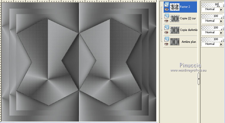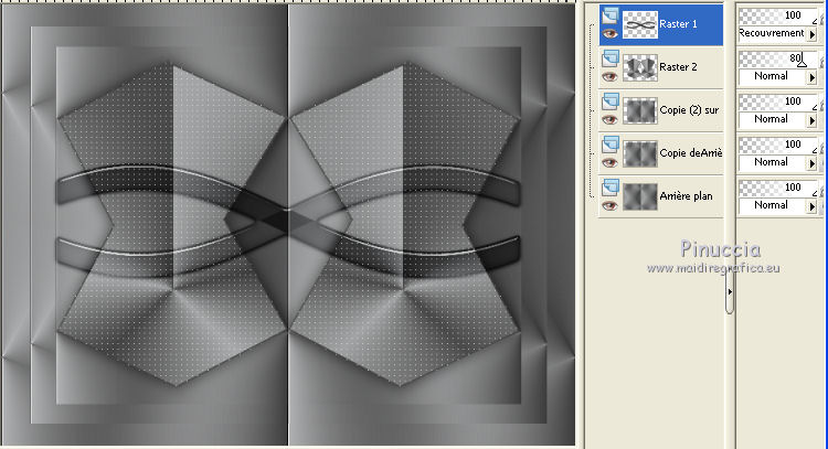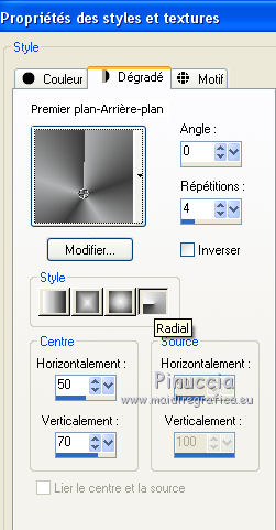 Ce tutoriel a été créé avec CorelX17, mais il peut également être exécuté avec les autres versions. Pour traduire le tutoriel j'ai utilisé CorelX et CorelX2. Suivant la version utilisée, vous pouvez obtenir des résultats différents. Depuis la version X4, la fonction Image>Miroir a été remplacée par Image>Renverser horizontalement, et Image>Renverser avec Image>Renverser verticalement . Dans les versions X5 et X6, les fonctions ont été améliorées par la mise à disposition du menu Objets. Dans la nouvelle version X7, nous avons à nouveau Miroir/Renverser, mais avec autres différences. Voir plus les détails à ce sujet ici Certaines dénominations ont changées entre les versions de PSP. Les plus frequentes dénominations utilisées: ![]() Traduction en italien ici Vos versions ici Nécessaire pour réaliser ce tutoriel: Matériel qui Modules Externes consulter, si nécessaire, ma section de filtre ici Filters Unlimited 2.0 ici Simple - Top Bottom Wrap, Top Left Mirror, Zoom out and flip ici AP 01 [Innovations] - Lines SilverLining ici Alien Skin Eye Candy 5 Impact - Glass ici AAA Frames - Foto Frame ici Filtres Toadies peuvent être utilisés seuls ou importés dans Filters Unlimited. voir comment le faire ici). Si un filtre est fourni avec cette icône, Suivant le s.o., la version de PSP et aussi la version d'Unlimited utilisés (est en circulation une version d'Unlimited qui n'a pas besoin d'installation et est composée de file en format .8bf) vous pourrez obtenir des résultats différents. ![]() Si vous voulez utiliser vos propres couleurs, n'hésitez pas à changer le mode et l'opacité des calques Placer la sélection dans le dossier Sélections. 1. Placer en avant plan la couleur #b1b2b3, et en arrière plan la couleur #3c3c3c. ![]() Préparer un dégradé de premier plan/arrière plan, style Radial. ![]() 2. Ouvrir une nouvelle image transparente 650 x 500 pixels ![]() Remplir l'image du dégradé.3. Calques>Dupliquer. Image>Renverser. Réduire l'opacité de ce calque à 50%. Calques>Fusionner>Fusionner le calque de dessous. 4. Effets>Modules Externes>Simple - Top Bottom Wrap. L'effet travaille sans fenêtre. Résultat. ![]() 5. Effets>Effets d'image>Mosaïque sans jointures. ![]() Effets>Effets de bords>Accentuer. 6. Calques>Dupliquer. Image>Redimensionner, à 90%, redimensionner tous les calques décoché. 7. À nouveau Calques>Dupliquer. Image>Redimensionner, à 90%, redimensionner tous les calques décoché. 8. Sélections>Charger/Enregistrer une sélection/Charger à partir du disque. Chercher et charger la sélection mb-176-1. ![]() 9. Calques>Nouveau calque raster. Remplir le calque avec la couleur d'arrière plan.10. Sélections>Modifier>Contracter - 2 pixels. ![]() Remplir ![]() la sélection du dégradé. Sélections>Désélectionner tout. 11. Effets>Modules Externes>AP 01 [Innovations] - Lines SilverLining. ![]() 12. Calques>Dupliquer. Image>Miroir. Calques>Fusionner>Fusionner le calque de dessous. 13. Effets>Effets 3D>Ombre portée, couleur noire. ![]() 14. Réduire l'opacité de ce calque à 80%. ![]() 15. Activer deco-176-1, Édition>Copier. Revenir sur votre travail et Édition>Coller comme nouveau calque. 16. Effets>Effets d'image>Décalage. ![]() 17. Effets>Modules Externes>Alien Skin Eye Candy 5 Impact - Glass. Sélectionner le preset Clear et ok. ![]() Placer le calque en mode Recouvrement. ![]() 18. Calques>Fusionner>Tous. 19. Sélections>Sélectionner tout. 20. Édition>Copier. 21. Image>Ajouter des bordures, 40 pixels, symétrique, couleur foncée. Sélections>Inverser. 22. Calques>Nouveau calque raster. Édition>Coller dans la sélection. 23. Effets>Modules Externes>Simple - Zoom out and flip. 24. Sélections>Inverser. Effets>Effets 3D>Ombre portée, couleur noire. ![]() 25. Calques>Nouveau calque raster. Placer en avant plan la Couleur. Remplir le calque avec la couleur d'avant plan.26. Sélections>Modifier>Contracter - 2 pixels. Presser CANC sur le clavier ![]() 27. Sélections>Sélectionner tout. Image>Ajouter des bordures, 40 pixels, symétrique, couleur foncée. 28. Effets>Effets 3D>Ombre portée, couleur noire. ![]() Sélections>Désélectionner tout. 29. Effets>Modules Externes>AAA Frames - Foto Frame. ![]() 30. Activer deco-176-2, Édition>Copier. Revenir sur votre travail et Édition>Coller comme nouveau calque. 31. Effets>Effets d'image>Décalage. ![]() 32. Calques>Dupliquer. Effets>Effets de distorsion>Vent - vers la gauche, intensité 100. ![]() Calques>Agencer>Déplacer vers le bas. 33. Vous positionner sur le calque du haut de la pile. Calques>Fusionner>Fusionner le calque de dessous. 34. Effets>Modules Externes>Simple - Top Left Mirror. ![]() 35. Activer le tube 182-2013 woman by Roby2765, Édition>Copier. Revenir sur votre travail et Édition>Coller comme nouveau calque. Image>Redimensionner, à 80%, redimensionner tous les calques décoché. Déplacer le tube à droite.36. Effets>Effets 3D>Ombre portée, couleur noire. ![]() 37. Activer le tube 0_e3d51_98d4646f_L, Édition>Copier. Revenir sur votre travail et Édition>Coller comme nouveau calque. 38. Réglage>Teinte et Saturation>Coloriser. ![]() 39. Déplacer le tube en bas à gauche.40. Effets>Effets 3D>Ombre portée, couleur noire. ![]() 41. Signer votre travail sur un nouveau calque. 42. Image>Ajouter des bordures, 1 pixel, symétrique, couleur noire. Enregistrer en jpg. Les tubes de cette version sont de Min@ ![]() ![]() Si vous avez des problèmes, ou des doutes, ou vous trouvez un link modifié, ou seulement pour me dire que ce tutoriel vous a plu, vous pouvez m'écrire. 16 Mars 2015 |