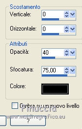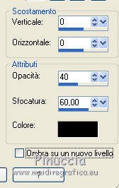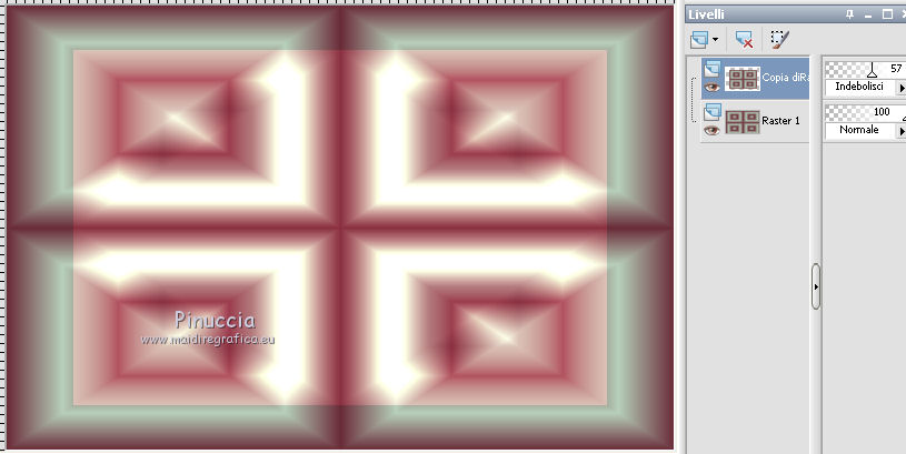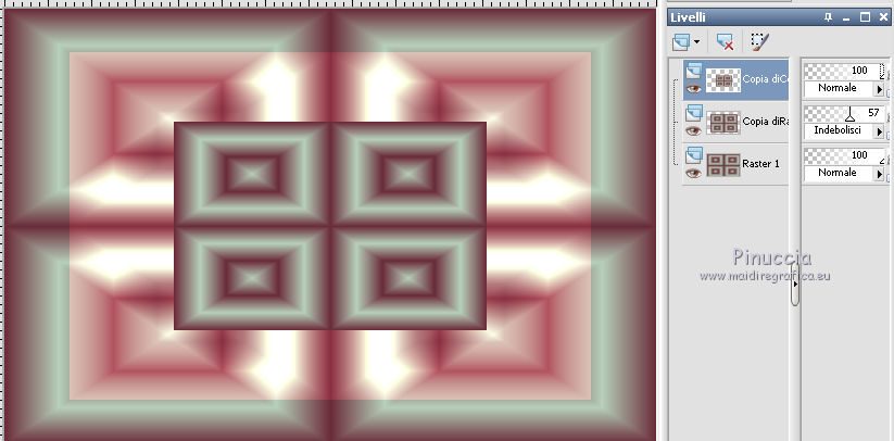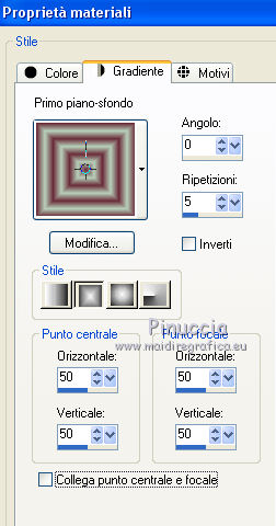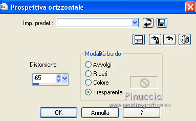 qui puoi trovare qualche risposta ai tuoi dubbi. Se l'argomento che ti interessa non è presente, ti prego di segnalarmelo. Il tutorial è stato creato con CorelX17, ma può essere eseguito con ogni versione di PSP. Dalla versione X4, il comando Immagine>Rifletti è stato sostituito con Immagine>Capovolgi in orizzontale, e il comando Immagine>Capovolgi con Immagine>Capovolgi in verticale. Nelle versioni X5 e X6, le funzioni sono state migliorate rendendo disponibile il menu Oggetti. Con la nuova versione X7, sono tornati Rifletti/Capovolgi, ma con nuove differenze Vedi la scheda sull'argomento qui Per tradurre questo tutorial ho usato PSP X. traduction en français qui Le vostre versioni qui Occorrente: Materiale qui Il tube utilizzato è di Alies. Filtri in caso di dubbi, ricorda di consultare la mia sezione filtri qui Filters Unlimited 2.0 qui Simple - Half Wrap, Centre Tile qui Flaming Pear - Flexify 2 qui I filtri Simple si possono usare da soli o importati in Filters Unlimited (come fare vedi qui) Se un filtro fornito appare con questa icona Secondo il sistema operativo, la versione di PSP e anche la versione di Unlimited che stai usando (circola in rete una versione che non si installa, ma è composta da files in formato 8bf), potresti ottenere dei risultati differenti. ![]() se stai usando altri colori, sperimenta le modalità di miscelatura e opacità più adatte ai tuoi colori Nelle ultime versioni di PSP non c'è il gradiente di primo piano/sfondo (Corel_06_029) Trovi i gradienti delle versioni precedenti qui 1. Imposta il colore di primo piano con #6a2c39, e il colore di sfondo con #b7d1bb. ![]() Passa il colore di primo piano a Gradiente di primo piano/sfondo, stile Rettangolare. ![]() 2. Apri una nuova immagine trasparente 750 x 500 pixels, e riempila con il gradiente.3. Effetti>Plugins>Simple - Half Wrap. 4. Effetti>Plugins>Simple - Centre Tile. 5. Livelli>Duplica. Immagine>Ridimensiona, all'80%, tutti i livelli non selezionato. 6. Cambia la modalità di miscelatura di questo livello in Indebolisci, e abbassa l'opacità al 57%. ![]() 7. Livelli>Duplica. Immagine>Ridimensiona, al 60%, tutti i livelli non selezionato. Riporta la modalità di miscelatura di questo livello a Normale, opacità 100. ![]() 8. Effetti>Plugins>Flaming Pear - Flexify 2. Attenzione, è selezionato Flip. ![]() 9. Effetti>Effetti geometrici>Prospettiva orizzontale. ![]() 10. Livelli>Duplica. Immagine>Rifletti. Livelli>Unisci>Unisci giù. 11. Effetti>Effetti 3D>Sfalsa ombra, colore nero. ![]() 12. Apri deco-1, e vai a Modifica>Copia. Torna al tuo lavoro e vai a Modifica>Incolla come nuovo livello. Livelli>Disponi>Sposta giù. 13. Apri deco-2, e vai a Modifica>Copia. Torna al tuo lavoro e vai a Modifica>Incolla come nuovo livello. Livelli>Disponi>Porta in alto. 14. Effetti>Effetti di immagine>Scostamento. ![]() 15. Livelli>Duplica. Immagine>Rifletti. Livelli>Unisci>Unisci giù. 16. Livelli>Duplica. Effetti>Effetti di immagine>Scostamento. ![]() 17. Immagine>Aggiungi bordatura, 2 pixels, simmetriche, colore scuro. Immagine>Aggiungi bordatura, 2 pixels, simmetriche, colore chiaro. Immagine>Aggiungi bordatura, 2 pixels, simmetriche, colore scuro. 18. Selezione>Seleziona tutto. Immagine>Aggiungi bordatura, 40 pixels, simmetriche, colore #cfb0a8. 19. Effetti>Effetti 3D>Sfalsa ombra, colore nero. ![]() 20. Selezione>Seleziona tutto. Selezione>Modifica>Contrai - 40 pixels. Selezione>Inverti. 21. Livelli>Nuovo livello raster. Effetti>Effetti 3D>Ritaglio, colore nero. ![]() Selezione>Deseleziona. 22. Apri il tube Alies 1-2FP228-tulips-03032015, Attiva lo strumento Selezione , rettangolo,e traccia una selezione intorno al watermark. Selezione>Inverti. Modifica>Copia. (puoi chiudere il tube senza salvare le modifiche). Torna al tuo lavoro e vai a Modifica>Incolla come nuovo livello. Immagine>Ridimensiona, all'80%, tutti i livelli non selezionato. Regola>Messa a fuoco>Metti a fuoco. 23. Effetti>Effetti 3D>Sfalsa ombra, colore nero. ![]() 24. Firma il tuo lavoro su un nuovo livello. Livelli>Unisci>Unisci tutto e salva in formato jpg. Il tube di questo esempio è di Azalée ![]() ![]() Se hai problemi o dubbi, o trovi un link non funzionante, o anche soltanto per un saluto, scrivimi. 14 Aprile 2015 |