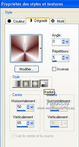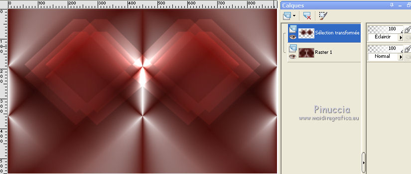 Ce tutoriel a été créé avec CorelX17, mais il peut également être exécuté avec les autres versions. Pour traduire le tutoriel j'ai utilisé CorelX et CorelX2. Suivant la version utilisée, vous pouvez obtenir des résultats différents. Depuis la version X4, la fonction Image>Miroir a été remplacée par Image>Renverser horizontalement, et Image>Renverser avec Image>Renverser verticalement . Dans les versions X5 et X6, les fonctions ont été améliorées par la mise à disposition du menu Objets. Dans la nouvelle version X7, nous avons à nouveau Miroir/Renverser, mais avec autres différences. Voir plus les détails à ce sujet ici Certaines dénominations ont changées entre les versions de PSP. Les plus frequentes dénominations utilisées: ![]() Traduction en italien ici Vos versions ici Nécessaire pour réaliser ce tutoriel: Matériel qui Pour le tube merci Gabry Modules Externes consulter, si nécessaire, ma section de filtre ici Filters Unlimited 2.0 ici Graphics Plus - Cross Shadow ici Toadies - What are you ici Carolaine and Sensibility - CS Texture ici Mura's Meister - Perspective Tiling ici Filtres Graphics Plus et Toadies peuvent être utilisés seuls ou importés dans Filters Unlimited. voir comment le faire ici). Si un filtre est fourni avec cette icône, Suivant le s.o., la version de PSP et aussi la version d'Unlimited utilisés (est en circulation une version d'Unlimited qui n'a pas besoin d'installation et est composée de file en format .8bf) vous pourrez obtenir des résultats différents. ![]() Si vous voulez utiliser vos propres couleurs, n'hésitez pas à changer le mode et l'opacité des calques Dans les nouvelles versions de PSP vous ne trouvez pas le dégradé de premier plan/arrière plan (Corel_06_029). Les dégradés des versions précédentes ici Placer les sélections dans le dossier Sélection. 1. Placer en avant plan la couleur #ffffff, et en arrière plan la couleur #5a1611. ![]() Préparer un dégradé de premier plan/arrière plan, style Radial. ![]() 2. Ouvrir une nouvelle image transparente 900 x 550 pixels ![]() Remplir l'image du dégradé.3. Calques>Dupliquer. Image>Renverser. Placer le calque en mode Multiplier. Calques>Fusionner>Fusionner le calque de dessous. 4. Effets>Effets d'image>Mosaïque sans jointures. ![]() 5. Sélections>Charger/Enregistrer une sélection>Charger à partir du disque. Chercher et charger la sélection mb-les-180-1. ![]() Sélections>Transformer la sélection en calque. Sélections>Désélectionner tout. Image>Redimensionner, 80%, redimensionner tous les calques décoché. 6. Effets>Modules Externes>Filters Unlimited 2.0 - Toadies - What are you, par défaut. ![]() 7. Calques>Dupliquer. Image>Miroir. Calques>Fusionner>Fusionner le calque de dessous. 8. Placer le calque en mode Éclaircir. ![]() 9. Calques>Dupliquer. Effets>Modules Externes>Caroline and Sensibility - CS texture. ![]() 10. Vous positionner sur le calque du bas de la pile - Raster 1. Calques>Dupliquer. 11. Effets>Modules Externes>Mura's Meister - Perspective Tiling. ![]() 12. Effets>Effets 3D>Ombre portée, couleur noire. ![]() 13. À nouveau vous positionner sur le calque du bas de la pile, raster 1. Calques>Nouveau calque raster. 14. Sélections>Charger/Enregistrer une sélection>Charger à partir du disque. Chercher et charger la sélection mb-les-180-2. ![]() Remplir la sélection du dégradé.15. Effets>Modules Externes>Filters Unlimited 2.0 - Graphics Plus - Cross Shadow, par défaut. ![]() Sélections>Désélectionner tout. 16. Effets>Effets 3D>Ombre portée, comme précédemment. ![]() 17. Vous positionner sur le calque copie de Raster 1 (le calque avec Perspective Tiling). Activer deco-180-1, Édition>Copier. Revenir sur votre travail et Édition>Coller comme nouveau calque. Réduire l'opacité de ce calque à 48%. 18. Vous positionner sur le calque du haut de la pile. Activer deco-180-2, Édition>Copier. Revenir sur votre travail et Édition>Coller comme nouveau calque. 19. Effets>Effets d'image>Décalage. ![]() 20. Activer le tube Gabry-fiori 115.pspimage, Édition>Copier. Revenir sur votre travail et Édition>Coller comme nouveau calque. 21. Effets>Effets 3D>Ombre portée, comme précédemment. ![]() Vous devriez avoir ce-ci. ![]() 22. Image>Ajouter des bordures, 1 pixel, symétrique, couleur noire. Sélections>Sélectionner tout. Édition>Copier. 23. Image>Ajouter des bordures, 50 pixels, symétrique, couleur blanche. Calques>Nouveau calque raster. Sélections>Inverser. 24. Édition>Coller dans la sélection. 25. Réglage>Flou>Flou gaussien - rayon 40. ![]() 26. Placer le calque en mode Lumière dure. 27. Effets>Modules Externes>Filters Unlimited 2.0 - Graphics Plus - Cross Shadow, par défaut. 28. Sélections>Inverser. Effets>Effets 3D>Ombre portée, comme précédemment. Sélections>Désélectionner tout. 29. Signer votre travail sur un nouveau calque. 30. Image>Ajouter des bordures, 1 pixel, symétrique, couleur noire. Enregistrer en jpg. ![]() Si vous avez des problèmes, ou des doutes, ou vous trouvez un link modifié, ou seulement pour me dire que ce tutoriel vous a plu, vous pouvez m'écrire. 7 Mai 2015 |