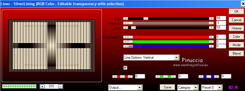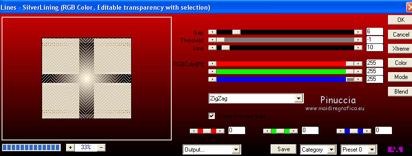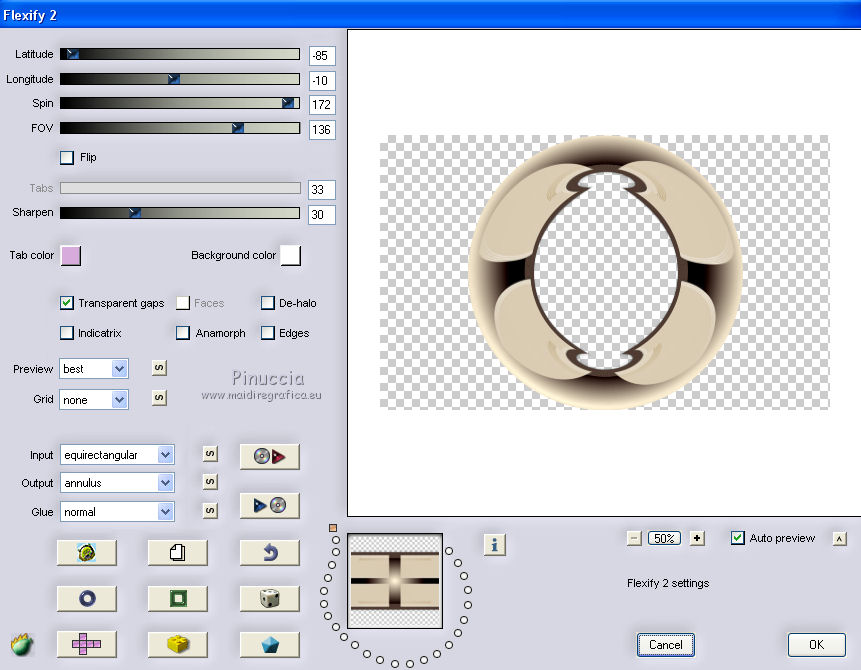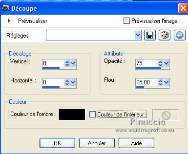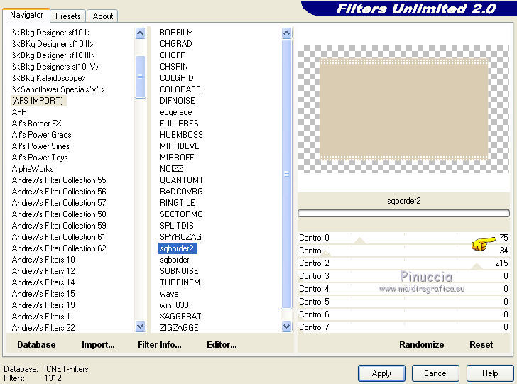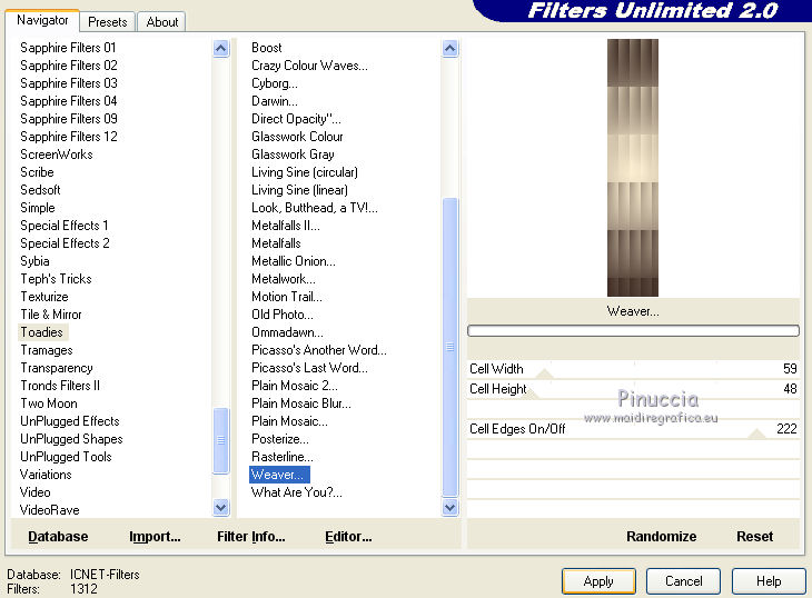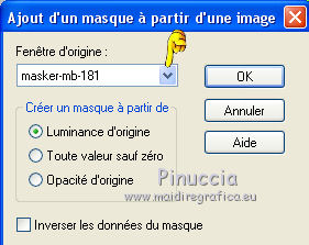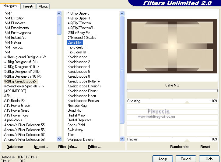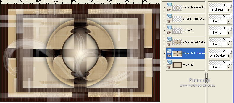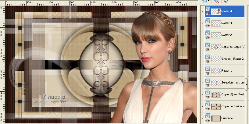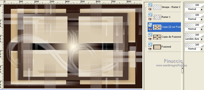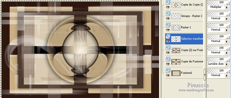 Ce tutoriel a été créé avec CorelX17, mais il peut également être exécuté avec les autres versions. Pour traduire le tutoriel j'ai utilisé CorelX et CorelX2. Suivant la version utilisée, vous pouvez obtenir des résultats différents. Depuis la version X4, la fonction Image>Miroir a été remplacée par Image>Renverser horizontalement, et Image>Renverser avec Image>Renverser verticalement. Dans les versions X5 et X6, les fonctions ont été améliorées par la mise à disposition du menu Objets. Dans la nouvelle version X7, nous avons à nouveau Miroir/Renverser, mais avec autres différences. Voir plus les détails à ce sujet ici Certaines dénominations ont changées entre les versions de PSP. Les plus frequentes dénominations utilisées: ![]() Traduction en italien ici Vos versions ici Nécessaire pour réaliser ce tutoriel: Matériel qui Pour le tube merci Kamalini. Modules Externes consulter, si nécessaire, ma section de filtre ici Filters Unlimited 2.0 ici &<Bkg Kaleidoscope> - Cake mix (da importare in Unlimited) ici AP 01 [Innovations] - Lines SilverLining ici Toadies - Weaver ici AFS Import - sqborder2 ici Flaming Pear - Flexify 2 ici Filtres AFS IMPORT et Toadies peuvent être utilisés seuls ou importés dans Filters Unlimited. voir comment le faire ici). Si un filtre est fourni avec cette icône, Suivant le s.o., la version de PSP et aussi la version d'Unlimited utilisés (est en circulation une version d'Unlimited qui n'a pas besoin d'installation et est composée de file en format .8bf) vous pourrez obtenir des résultats différents. ![]() Si vous voulez utiliser vos propres couleurs, n'hésitez pas à changer le mode et l'opacité des calques Placer les sélections dans le dossier Sélections. Ouvrir le masque dans PSP et le minimiser avec le reste du matériel. 1. Placer en avant plan la couleur #daccb3, et en arrière plan la couleur #48362d. ![]() 2. Ouvrir une nouvelle image transparente 900 x 550 pixels ![]() Remplir l'image avec la couleur d'arrière plan #48362d.3. Calques>Nouveau calque raster. Remplir avec la couleur d'avant plan #daccb3.4. Image>Redimensionner, 80%, redimensionner tous les calques décoché. 5. Effets>Modules Externes>Filters Unlimited 2.0 - [AFS IMPORT] - sqborder2. ![]() 6. Calques>Fusionner>Calques visibles. 7. Calques>Dupliquer. Effets>Modules Externes>Filters Unlimited 2.0 - &<Bkg Kaleidoscope> - Cake Mix. ![]() 8. Sélections>Charger/Enregistrer une sélection>Charger à partir du disque. Chercher et charger la sélection mb-les-181-1. ![]() Mode de correspondance de l'outil Pot de Peinture sur Aucun![]() et un seul clic suffit pour remplir les sélections avec la couleur claire d'avant plan.9. Effets>Modules Externes>AP 01 [Innovation] - Lines SilverLining. ![]() Sélections>Désélectionner tout. 10. Activer l'outil Baguette magique , tolérance et progressivité 0,et cliquer sur le bord extérieur pour le sélectionner. ![]() 11. Effets>Modules Externes>AP 01 [Innovation] - Lines SilverLining. ![]() 12. Effets>Effets de bords>Accentuer. Sélections>Désélectionner tout. 13. Calques>Dupliquer. Image>Redimensionner, 80%, redimensionner tous les calques décoché. 14. Effets>Effets 3D>Ombre portée, couleur noire. ![]() 15. Activer deco-1.png, Édition>Copier. Revenir sur votre travail et Édition>Coller comme nouveau calque. 16. Calques>Nouveau calque raster. Placer en avant plan la couleur blanche #ffffff, et remplir le calque avec la couleur blanche.17. Calques>Nouveau calque de masque>A partir d'une image. Ouvrir le menu deroulant sous la fenêtre d'origine et vous verrez la liste des images ouverts. Sélectionner le masque masker-mb-181. ![]() Calques>Fusionner>Fusionner le groupe. Réglage>Netteté>Davantage de netteté. 18. Placer le calque copie de Fusionner (le deuxième du bas) en mode Lumière dure, et vous positionner sur le calque de la deuxième copie de fusionner (le troisième du bas). ![]() 19. Calques>Dupliquer. Effets>Modules Externes>Flaming Pear - Flexify 2. ![]() Image>Redimensionner, 70%, redimensionner tous les calques décoché. 21. Effets>Modules Externes>AP 01 [Innovation] - Lines SilverLining. ![]() 22. Effets>Effets 3D>Ombre portée, couleur noire. ![]() 23. Calques>Agencer>Placer en haut de la pile. Placer le calque en mode Multiplier. À nouveau vous positionner sur le calque copie de Fusionner (le deuxième du bas). ![]() 24. Sélections>Charger/Enregistrer une sélection>Charger à partir du disque. Chercher et charger la sélection mb-les-180-3. ![]() Sélections>Transfomer la sélection en calque. 25. Effets>Modules Externes>Filters Unlimited 2.0 - Toadies - Weaver, par défaut. ![]() Sélections>Désélectionner tout. Calques>Agencer>Déplacer vers le haut. ![]() Vous positionner sur le calque du haut de la pile. 26. Activer deco-181-2, Édition>Copier. Revenir sur votre travail et Édition>Coller comme nouveau calque. 27. Activer deco-181-3, Édition>Copier. Revenir sur votre travail et Édition>Coller comme nouveau calque. 28. Effets>Effets 3D>Ombre portée, couleur noire. ![]() 29. Activer le tube Kamalini-435, Édition>Copier. Revenir sur votre travail et Édition>Coller comme nouveau calque. 30. Image>Redimensionner, 85%, redimensionner tous les calques décoché. Déplacer le tube à droite.![]() 31. Effets>Effets 3D>Ombre portée, couleur noire. ![]() 32. Placer à nouveau en avant plan la couleur claire du début #daccb3. Image>Ajouter des bordures, 1 pixel, symétrique, couleur claire. Image>Ajouter des bordures, 1 pixel, symétrique, couleur foncée. Image>Ajouter des bordures, 50 pixels, symétrique, couleur claire. 33. Activer l'outil Baguette magique ![]() et cliquer sur le bord de 50 pixels pour le sélectionner. 34. Effets>Effets 3D>Découpe. ![]() 35. Sélections>Inverser. Effets>Effets 3D>Ombre portée, couleur noire. ![]() Sélections>Désélectionner tout. 36. Image>Ajouter des bordures, 1 pixel, symétrique, couleur foncée. 37. Signer votre travail sur un nouveau calque