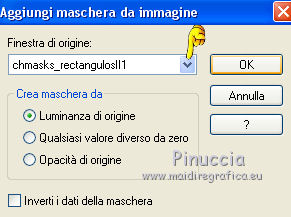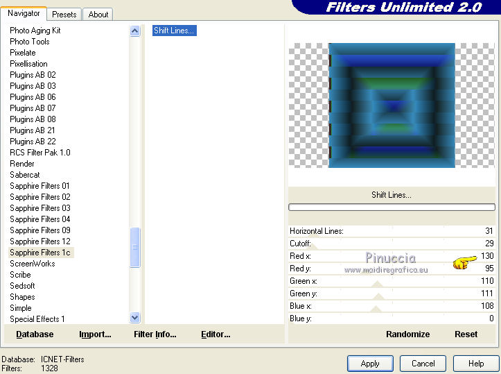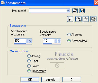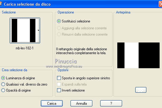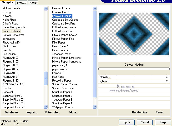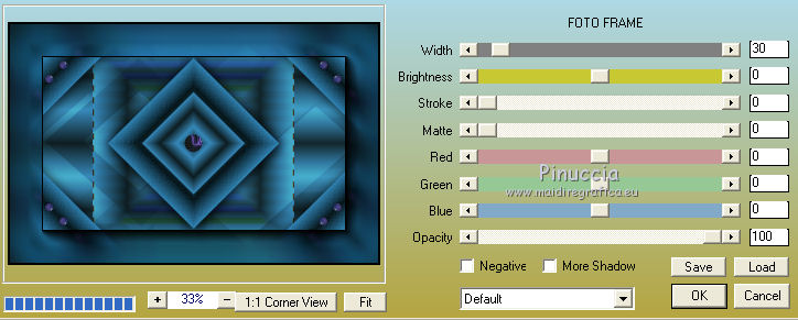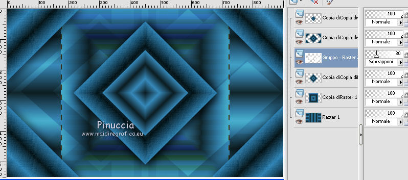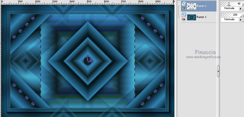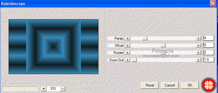 qui puoi trovare qualche risposta ai tuoi dubbi. Se l'argomento che ti interessa non è presente, ti prego di segnalarmelo. Il tutorial è stato creato con CorelX17, ma può essere eseguito con ogni versione di PSP. Dalla versione X4, il comando Immagine>Rifletti è stato sostituito con Immagine>Capovolgi in orizzontale, e il comando Immagine>Capovolgi con Immagine>Capovolgi in verticale. Nelle versioni X5 e X6, le funzioni sono state migliorate rendendo disponibile il menu Oggetti. Con la nuova versione X7, sono tornati Rifletti/Capovolgi, ma con nuove differenze Vedi la scheda sull'argomento qui Per tradurre questo tutorial ho usato PSP X. traduction en français qui Le vostre versioni qui Occorrente: Materiale qui Per il tube grazie Kamalini. Filtri in caso di dubbi, ricorda di consultare la mia sezione filtri qui Filters Unlimited 2.0 qui Sapphire Filters - Shift Lines qui Mehdi - Kaleidoscope qui I filtri Sapphire si possono usare da soli o importati in Filters Unlimited (come fare vedi qui) Se un filtro fornito appare con questa icona ![]() se stai usando altri colori, sperimenta le modalità di miscelatura e opacità più adatte ai tuoi colori Metti le selezioni nella cartella Selezioni. Apri la maschera in PSP e minimizzala con il resto del materiale. 1. Imposta il colore di primo piano con #388bbc, e il colore di sfondo con #0f1e22. ![]() Passa il colore di primo piano a Gradiente di primo piano/sfondo, stile Lineare. ![]() 2. Apri una nuova immagine trasparente 900 x 550 pixels, ![]() e riempila con il gradiente.3. Livelli>Duplica. Immagine>Ruota per gradi - 90 gradi a sinistra. ![]() 4. Attiva il livello Raster 1. Selezione>Seleziona tutto. Immagine>Ritaglia la selezione. 5. Attiva il livello superiore. Livelli>Unisci>Unisci giù. 6. Livelli>Duplica. Effetti>Plugins>Mehdi - Kaleidoscope. ![]() 7. Immagine>Ruota per gradi - 90 gradi a sinistra. ![]() 8. Attiva il livello Raster 1. Selezione>Seleziona tutto. Immagine>Ritaglia la selezione. 9. Attiva il livello superiore. Livelli>Duplica. Immagine>Ridimensiona, al 60%, tutti i livelli non selezionato. 10. Immagine>Ruota per gradi - 45 gradi a sinistra. ![]() 11. Effetti>Effetti 3D>Sfalsa ombra, colore nero. ![]() 12. Livelli>Duplica. Effetti>Effetti di immagine>Motivo unico, con i settaggi standard. ![]() 13. Effetti>Plugins>Filters Unlimited 2.0 - Paper Textures - Canvas,Medium. ![]() 14. Effetti>Effetti 3D>Sfalsa ombra, colore nero. ![]() 15. Attiva il livello copia di Raster 1. ![]() Effetti>Plugins>Filters Unlimited 2.0 - Sapphire Filters 1c - Shift Lines. ![]() 16. Livelli>Duplica. Immagine>Rifletti. 17. Selezione>Carica/Salva selezione>Carica selezione da disco. Cerca e carica la selezione mb-les-182-1. ![]() Premi sulla tastiera il tasto CANC ![]() Selezione>Deseleziona. 18. Livelli>Unisci>Unisci giù. 19. Attiva il livello copia 2 di raster 1. ![]() Livelli>Duplica. Immagine>Ridimensiona, al 60%, tutti i livelli non selezionato. Livelli>Disponi>Porta in alto. 20. Livelli>Nuovo livello raster. Imposta il colore di primo piano con il colore bianco #ffffff. Riempi il livello con il colore bianco.21. Livelli>Nuovo livello maschera>Da immagine. Apri il menu sotto la finestra di origine e vedrai la lista dei files aperti. Seleziona la maschera chmasks_rectangulosII1. ![]() Livelli>Unisci>unisci gruppo. Cambia la modalità di miscelatura di questo livello in Sovrapponi, e abbassa l'opacità al 30%. 22. Livelli>Disponi>Sposta giù - 2 volte. ![]() 23. Attiva il livello superiore. Apri deco-182-1, e vai a Modifica>Copia. Torna al tuo lavoro e vai a Modifica>Incolla come nuovo livello. 24. Apri deco-182-3, e vai a Modifica>Copia. Torna al tuo lavoro e vai a Modifica>Incolla come nuovo livello. 25. Per i bordi riporta il colore di primo piano al colore iniziale #388bbc. Immagine>Aggiungi bordatura, 1 pixel, simmetriche, colore di sfondo #0f1e22. Immagine>Aggiungi bordatura, 2 pixels, simmetriche, colore di primo piano #388bbc. Immagine>Aggiungi bordatura, 1 pixel, simmetriche, colore di sfondo #0f1e22. 26. Selezione>Seleziona tutto. Modifica>Copia. 27. Immagine>Aggiungi bordatura, 50 pixels, simmetriche, colore bianco #ffffff. Selezione>Inverti. Modifica>Incolla nella selezione. 28. Regola>Sfocatura>Sfocatura gaussiana - raggio 30. ![]() 29. Selezione>Inverti. Effetti>Effetti 3D>Sfalsa ombra, colore nero. ![]() Selezione>Deseleziona. 30. Effetti>Plugins>AAA Frames - Foto Frame. ![]() 31. Apri Deco-182-2, e vai a Modifica>Copia. Torna al tuo lavoro e vai a Modifica>Incolla come nuovo livello. 32. Effetti>Effetti di immagine>Motivo unico, con i settaggi standard. ![]() Abbassa l'opacità di questo livello al 40%. ![]() 33. Apri il tube Kamalini-441, cancella il watermark, e vai a Modifica>Copia. Torna al tuo lavoro e vai a Modifica>Incolla come nuovo livello. Immagine>Ridimensiona, all'85%, tutti i livelli non selezionato. Immagine>Rifletti. Spostalo a sinistra.34. Apri deco-182-4, e vai a Modifica>Copia. Torna al tuo lavoro e vai a Modifica>Incolla come nuovo livello. 35. Effetti>Effetti di immagine>Scostamento. ![]() 36. Immagine>Aggiungi bordatura, 2 pixels, simmetriche, colore di primo piano #388bbc. 37. Immagine>Ridimensiona, 900 pixels di larghezza, tutti i livelli selezionato. Firma il tuo lavoro su un nuovo livello. Livelli>Unisci>Unisci tutto e salva in formato jpg. Il tube di questa versione è di Gabry ![]() ![]() Se hai problemi o dubbi, o trovi un link non funzionante, o anche soltanto per un saluto, scrivimi. 23 Giugno 2015 |