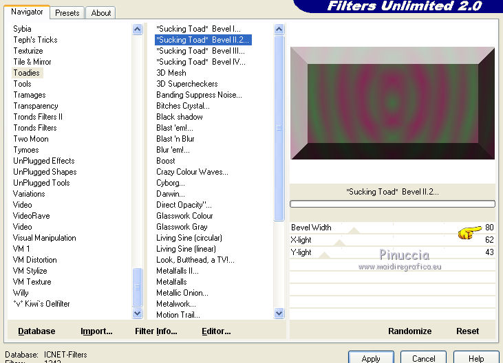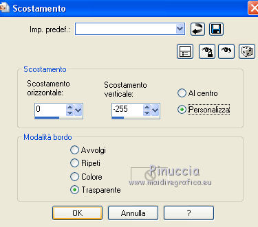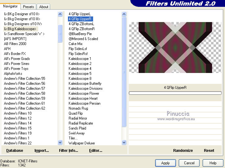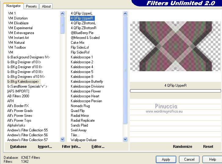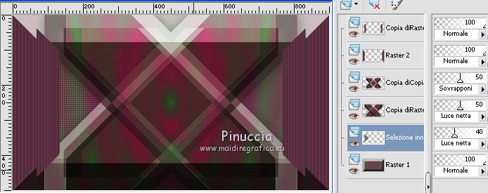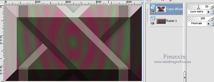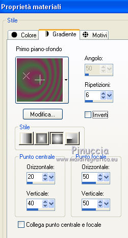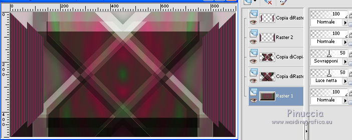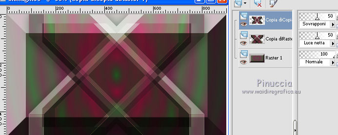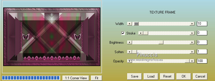 qui puoi trovare qualche risposta ai tuoi dubbi. Se l'argomento che ti interessa non è presente, ti prego di segnalarmelo. Il tutorial è stato creato con CorelX17, ma può essere eseguito con ogni versione di PSP. Dalla versione X4, il comando Immagine>Rifletti è stato sostituito con Immagine>Capovolgi in orizzontale, e il comando Immagine>Capovolgi con Immagine>Capovolgi in verticale. Nelle versioni X5 e X6, le funzioni sono state migliorate rendendo disponibile il menu Oggetti. Con la nuova versione X7, sono tornati Rifletti/Capovolgi, ma con nuove differenze Vedi la scheda sull'argomento qui Per tradurre questo tutorial ho usato PSP X. traduction en français qui Le vostre versioni qui Occorrente: Materiale qui Il tube è di K@rine Filtri in caso di dubbi, ricorda di consultare la mia sezione filtri qui Filters Unlimited 2.0 qui &<Bkg Kaleidoscope> - 4QFlip UpperR (da importare in Unlimited) qui Toadies - Sucking Toad Bevel II.2 qui AAA Frames - Texture Frame qui I filtri Toadies si possono usare da soli o importati in Filters Unlimited (come fare vedi qui) Se un filtro fornito appare con questa icona ![]() se stai usando altri colori, sperimenta le modalità di miscelatura e opacità più adatte ai tuoi colori Nelle ultime versioni di PSP non c'è il gradiente di primo piano/sfondo (Corel_06_029) Trovi i gradienti delle versioni precedenti qui Metti le selezioni nella cartella Selezioni. 1. Imposta il colore di primo piano con #446c41, e il colore di sfondo con #822954. ![]() Passa il colore di primo piano a Gradiente di primo piano/sfondo, stile Sprazzo di luce. ![]() 2. Apri una nuova immagine trasparente 900 x 500 pixels, ![]() e riempila con il gradiente.3. Livelli>Duplica. Immagine>Rifletti. 4. Abbassa l'opacità di questo livello al 50%. Livelli>Unisci>Unisci giù. 5. Effetti>Plugins>Filters Unlimited 2.0 - Toadies - Sucking Toad Bevel II.2. ![]() 6. Livelli>Duplica. Immagine>Ridimensiona, all'80%, tutti i livelli non selezionato. 7. Effetti>Effetti geometrici>Inclina. ![]() 8. Livelli>Duplica. Immagine>Rifletti. Livelli>Unisci>Unisci giù. 9. Effetti>Effetti 3D>Sfalsa ombra, colore nero. ![]() 10. Cambia la modalità di miscelatura di questo livello in Luce netta e abbassa l'opacità al 50%. ![]() Effetti>Effetti di bordo>Aumenta. 11. Livelli>Duplica. Immagine>Rifletti. Livelli>Unisci>Unisci giù. 12. Livelli>Duplica. Effetti>Plugins>Filters Unlimited 2.0 - &<Bkg Kaleidoscope> - 4Q Flip Upper R. ![]() questo è uno dei casi in cui potresti avere un risultato differente a seconda delle versioni di PSP che stai usando. Con Corel X2 questa è stata la finestra del filtro ![]() 13. Immagine>Ridimensiona, all'85%, tutti i livelli non selezionato. 14. Cambia la modalità di miscelatura di questo livello in Sovrapponi. ![]() 15. Selezione>Carica/Salva selezione>Carica selezione da disco. Cerca e carica la selezione mb-184-1. ![]() 16. Livelli>Nuovo livello raster. Riempi con il colore di sfondo #822954.17. Effetti>Effetti di trama>Veneziana - colore #34352f. ![]() Selezione>Deseleziona. 18. Livelli>Duplica. Immagine>Rifletti. Livelli>Unisci>Unisci giù. 19. Livelli>Duplica. Immagine>Ridimensiona, all'85%, tutti i livelli non selezionato. 20. Attiva il livello inferiore Raster 1. ![]() 21. Selezione>Carica/Salva selezione>Carica selezione da disco. Cerca e carica la selezione mb-184-2. ![]() Selezione>Innalza selezione a livello. 22. Effetti>Effetti di trama>Intessitura - entrambi i colori bianco #ffffff. ![]() Selezione>Deseleziona. 23. Cambia la modalità di miscelatura di questo livello in Luce netta e abbassa l'opacità al 40%. ![]() 24. Livelli>Duplica. Immagine>Rifletti. Livelli>Unisci>Unisci giù. 25. Attiva il secondo livello dall'alto - Raster 2. ![]() 26. Livelli>Duplica. Effetti>Effetti di immagine>Motivo unico. ![]() 27. Effetti>Effetti 3D>Sfalsa ombra, colore nero. ![]() 28. Apri vlinder.png, e vai a Modifica>Copia. Torna al tuo lavoro e vai a Modifica>Incolla come nuovo livello. 29. Effetti>Effetti di immagine>Scostamento. ![]() 30. Livelli>Duplica. Immagine>Rifletti. 31. Apri randje-184.png, e vai a Modifica>Copia. Torna al tuo lavoro e vai a Modifica>Incolla come nuovo livello. Livelli>Disponi>Porta in alto. 32. Apri bloemrandje.184.png, e vai a Modifica>Copia. Torna al tuo lavoro e vai a Modifica>Incolla come nuovo livello. 33. Effetti>Effetti di immagine>Scostamento. ![]() 34. Immagine>Aggiungi bordatura, 2 pixels, simmetriche, colore di primo piano #446c41. Immagine>Aggiungi bordatura, 2 pixels, simmetriche, colore di sfondo #822954. 35. Selezione>Seleziona tutto. Modifica>Copia. 36. Immagine>Aggiungi bordatura, 50 pixels, simmetriche, colore bianco. Selezione>Inverti. 37. Modifica>Incolla nella selezione. 38. Regola>Sfocatura>Sfocatura gaussiana - raggio 30. ![]() 39. Selezione>Inverti. Effetti>Effetti 3D>Sfalsa ombra, colore nero. ![]() Selezione>Deseleziona. 40. Effetti>Plugins>AAA Frames - Texture Frame. ![]() 41. Apri il tube K@_Dreams_Pretty_Geisha_2939_Mai_2014, e vai a Modifica>Copia. Torna al tuo lavoro e vai a Modifica>Incolla come nuovo livello. 42. Immagine>Ridimensiona, 3 volte al 90% e 1 volta al 95%, tutti i livelli non selezionato. Sposta il tube in basso.43. Effetti>Effetti 3D>Sfalsa ombra, colore nero. ![]() Regola>Messa a fuoco>Metti a fuoco. 44. Immagine>Aggiungi bordatura, 1 pixel, simmetriche, colore di sfondo #822954. 45. Firma il tuo lavoro su un nuovo livello. 46. Se vuoi Immagine>Ridimensiona - per l'esempio 900 pixels di larghezza, tutti i livelli selezionato. Salva in formato jpg. Il tube di questa versione è di Beatriz ![]() ![]() Se hai problemi o dubbi, o trovi un link non funzionante, o anche soltanto per un saluto, scrivimi. 4 Agosto 2015 |