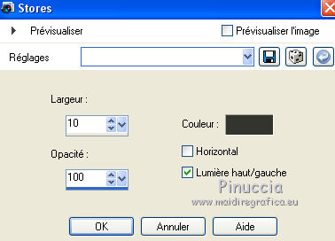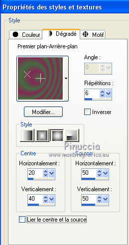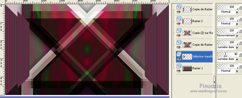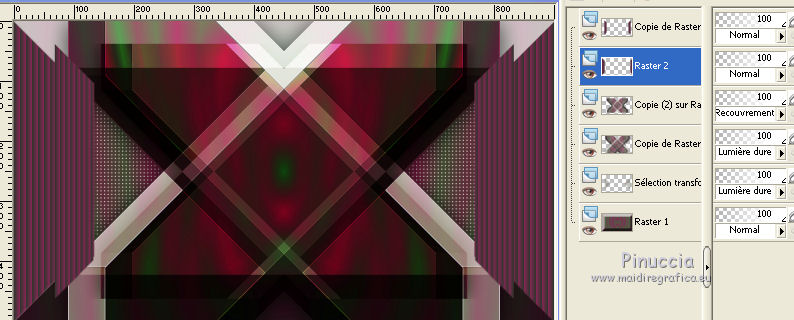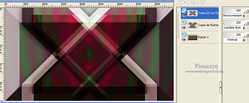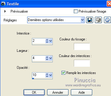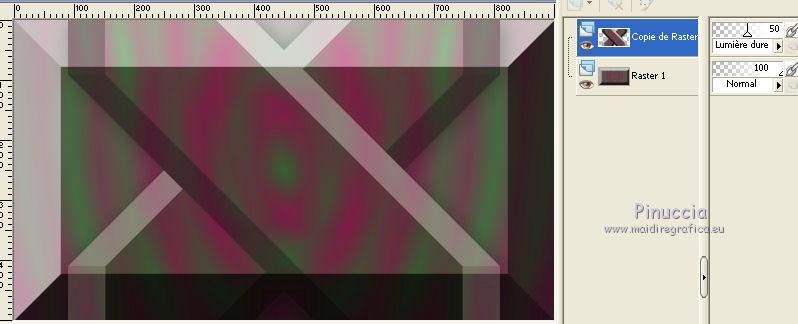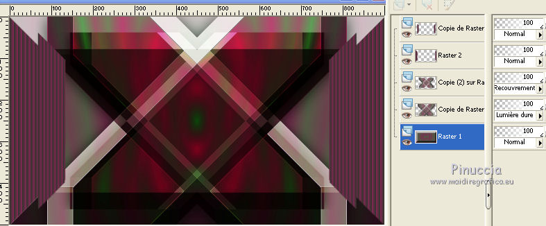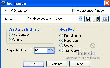 Ce tutoriel a été créé avec CorelX17, mais il peut également être exécuté avec les autres versions. Pour traduire le tutoriel j'ai utilisé CorelX et CorelX2. Suivant la version utilisée, vous pouvez obtenir des résultats différents. Depuis la version X4, la fonction Image>Miroir a été remplacée par Image>Renverser horizontalement, et Image>Renverser avec Image>Renverser verticalement. Dans les versions X5 et X6, les fonctions ont été améliorées par la mise à disposition du menu Objets. Dans la nouvelle version X7, nous avons à nouveau Miroir/Renverser, mais avec autres différences. Voir plus les détails à ce sujet ici Certaines dénominations ont changées entre les versions de PSP. Les plus frequentes dénominations utilisées: ![]() Traduction en italien ici Vos versions ici Nécessaire pour réaliser ce tutoriel: Matériel qui Le tube est de K@rine Modules Externes consulter, si nécessaire, ma section de filtre ici Filters Unlimited 2.0 ici &<Bkg Kaleidoscope> - 4QFlip Upper R(da importare in Unlimited) ici Toadies - Sucking Toad Bevel II.2 ici AAA Frames - Texture Frame ici Filtres Toadies peuvent être utilisés seuls ou importés dans Filters Unlimited. voir comment le faire ici). Si un filtre est fourni avec cette icône, ![]() Si vous voulez utiliser vos propres couleurs, n'hésitez pas à changer le mode et l'opacité des calques Dans les plus récentes versions de PSP, vous ne trouvez pas le dégradé d'avant plan/arrière plan ou Corel_06_029. Vous pouvez utiliser le dégradé des versions antérieures. Ici le dossier Dégradés de CorelX. Placer les sélections dans le dossier Sélections. 1. Placer en avant plan la couleur #446c41, et en arrière plan la couleur #822954. ![]() Préparer un dégradé de premier plan/arrière plan, style Halo. ![]() 2. Ouvrir une nouvelle image transparente 900 x 500 pixels ![]() Remplir l'image du dégradé.3. Calques>Dupliquer. Image>Miroir. 4. Réduire l'opacité de ce calque à 50%. Calques>Fusionner>Fusionner le calque de dessous. 5. Effets>Modules Externes>Filters Unlimited 2.0 - Toadies - Sucking Toad Bevel II.2. ![]() 6. Calques>Dupliquer. Image>Redimensionner, à 80%, redimensionner tous les calques décoché. 7. Effets>Effets géométriques>Inclinaison. ![]() 8. Calques>Dupliquer. Image>Miroir. Calques>Fusionner>Fusionner le calque de dessous. 9. Effets>Effets 3D>Ombre portée, couleur noire. ![]() 10. Placer le calque en mode Lumière dure et réduire l'opacité à 50%. ![]() Effets>Effets de bords>Accentuer. 11. Calques>Dupliquer. Image>Miroir. Calques>Fusionner>Fusionner le calque de dessous. 12. Calques>Dupliquer. Effets>Modules Externes>Filters Unlimited 2.0 - &<Bkg Kaleidoscope> - 4Q Flip Upper R. ![]() ce-ci est un des cas où vous pourriez obtenir un résultat différent selon la version de PSP utilisée. Avec CorelX2 j'ai obtenu cette fenêtre ![]() 13. Image>Redimensionner, à 85%, redimensionner tous les calques décoché. 14. Placer le calque en mode Recouvrement. ![]() 15. Sélections>Charger/Enregistrer une sélection>Charger à partir du disque. Chercher et charger la sélection mb-184-1. ![]() 16. Calques>Nouveau calque raster. Remplir avec la couleur d'arrière plan #822954.17. Effets>Effets de textures>Stores - couleur #34352f. ![]() Sélections>Désélectionner. 18. Calques>Dupliquer. Image>Miroir. Calques>Fusionner>Fusionner le calque de dessous. 19. Calques>Dupliquer. Image>Redimensionner, à 85%, redimensionner tous les calques décoché. 20. Vous positionner sur le calque du bas de la pile - Raster 1. ![]() 21. Sélections>Charger/Enregistrer une sélection>Charger à partir du disque. Chercher et charger la sélection mb-184-2. ![]() Sélections>Transformer la sélection en calque. 22. Effets>Effets de textures>Textile - les deux couleur #ffffff. ![]() Sélections>Désélectionner tout. 23. Placer le calque en mode Lumière dure et réduire l'opacité à 40%. ![]() 24. Calques>Dupliquer. Image>Miroir. Calques>Fusionner>Fusionner le calque de dessous. 25. Vous positionner sur le deuxième calque du haut - Raster 2. ![]() 26. Calques>Dupliquer. Effets>Effets d'image>Mosaïque sans jointures. ![]() 27. Effets>Effets 3D>Ombre portée, couleur noire. ![]() 28. Activer vlinder.png, Édition>Copier. Revenir sur votre travail et Édition>Coller comme nouveau calque. 29. Effets>Effets d'image>Décalage. ![]() 30. Calques>Dupliquer. Image>Miroir. 31. Activer randje-184.png, Édition>Copier. Revenir sur votre travail et Édition>Coller comme nouveau calque. Calques>Agencer>Placer en haut de la pile. 32. Apri bloemrandje.184.png, Édition>Copier. Revenir sur votre travail et Édition>Coller comme nouveau calque. 33. Effets>Effets d'image>Décalage. ![]() 34. Image>Ajouter des bordures, 2 pixels, symétrique, couleur d'avant plan #446c41. Image>Ajouter des bordures, 2 pixels, symétrique, couleur d'arrière plan #822954. 35. Sélections>Sélectionner tout. Édition>Copier. 36. Image>Ajouter des bordures, 50 pixels, symétrique, couleur blanche #ffffff. Sélections>Inverser. 37. Édition>Coller dans la sélection. 38. Réglage>Flou>Flou gaussien - rayon 30. ![]() 39. Sélections>Inverser. Effets>Effets 3D>Ombre portée, couleur noire. ![]() Sélections>Désélectionner tout. 40. Effets>Modules Externes>AAA Frames - Texture Frame. ![]() 41. Activer le tube K@_Dreams_Pretty_Geisha_2939_Mai_2014, Édition>Copier. Revenir sur votre travail et Édition>Coller comme nouveau calque. 42. Image>Redimensionner, 3 fois à 90% et 1 fois à 95%, redimensionner tous les calques décoché. Déplacer le tube en bas.43. Effets>Effets 3D>Ombre portée, couleur noire. ![]() Réglage>Netteté>Netteté. 44. Image>Ajouter des bordures, 1 pixel, symétrique, couleur d'arrière plan #822954. 45. Signer votre travail sur un nouveau calque. 46. Si vous voulez: Image>Redimensionner - pour moi 900 pixels de largeur, redimensionner tous les calques cochés. Enregistrer en jpg. Le tube de cette version est de Beatriz ![]() ![]()
