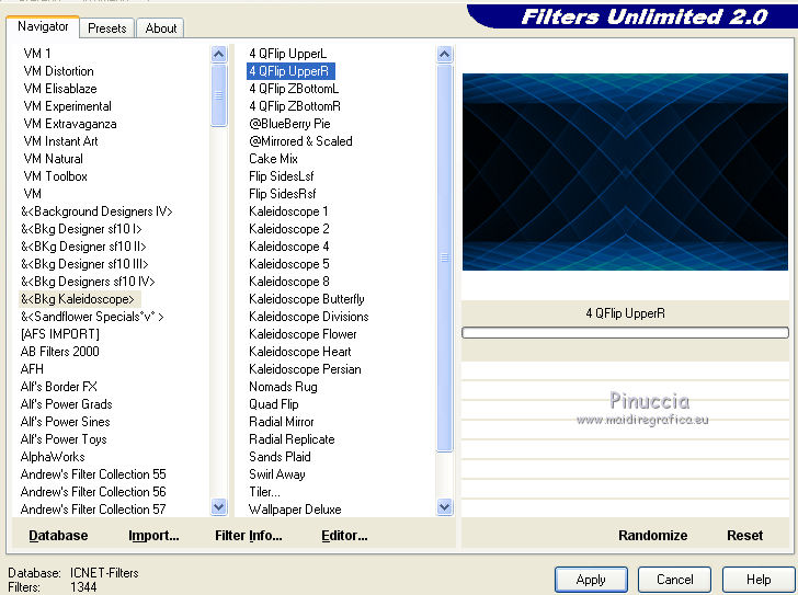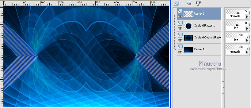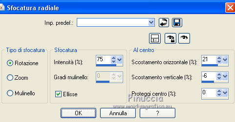 qui puoi trovare qualche risposta ai tuoi dubbi. Se l'argomento che ti interessa non è presente, ti prego di segnalarmelo. Il tutorial è stato creato con CorelX17, ma può essere eseguito con ogni versione di PSP. Dalla versione X4, il comando Immagine>Rifletti è stato sostituito con Immagine>Capovolgi in orizzontale, e il comando Immagine>Capovolgi con Immagine>Capovolgi in verticale. Nelle versioni X5 e X6, le funzioni sono state migliorate rendendo disponibile il menu Oggetti. Con la nuova versione X7, sono tornati Rifletti/Capovolgi, ma con nuove differenze Vedi la scheda sull'argomento qui Per tradurre questo tutorial ho usato PSP X. traduction en français qui Le vostre versioni qui Occorrente: Materiale qui Il tube è di Kamalini (versione in blu) e Grisi (versione in rosso) Filtri in caso di dubbi, ricorda di consultare la mia sezione filtri qui Filters Unlimited 2.0 qui &<Bkg Kaleidoscope> - 4QFlip UpperR (da importare in Unlimited) qui Graphics Plus qui AAA Frames - Texture Frame qui Flaming Pear - Flexify 2 qui I filtri Graphics Plus si possono usare da soli o importati in Filters Unlimited (come fare vedi qui) Se un filtro fornito appare con questa icona ![]() se stai usando altri colori, sperimenta le modalità di miscelatura e opacità più adatte ai tuoi colori Metti il preset Emboss 3 nella cartella Impostazioni predefinite. 1. Imposta il colore di primo piano con #065097, e il colore di sfondo con #ffffff. ![]() 2. Apri una nuova immagine trasparente 900 x 550 pixels. ![]() 3. Selezione>Seleziona tutto. Apri deco-ag-185 (versione blu) se preferisci, puoi usare la versione rossa, o colorizzare secondo i tuoi colori Modifica>Copia. Torna al tuo lavoro e vai a Modifica>Incolla nella selezione. Selezione>Deseleziona. 4. Livelli>Duplica - 2 volte. 5. Immagine>Capovolgi, e dovresti avere questo. ![]() 6. Abbassa l'opacità di questo livello al 50%. ![]() 7. Livelli>Unisci>Unisci giù. 8. Effetti>Filtro definito dall'utente, seleziona il preset Emboss 3 e ok. ![]() (oppure, se preferisci: Regola>Messa a fuoco>Accentua messa a fuoco - 2 volte). 9. Effetti>Plugins>Filters Unlimited 2.0 - &<Bkg Kaleidoscope> - 4Q Flip UpperR. ![]() 10. Livelli>Duplica. Effetti>Plugins>Flaming Pear - Flexify 2. ![]() 11. Cambia la modalità di miscelatura di questo livello in Luminanza (esistente) (o Filtra, secondo i tuoi colori). ![]() 12. Attiva il livello centrale Copia di Raster 1. Effetti>Effetti geometrici>Cerchio. ![]() 13. Livelli>Disponi>Porta in alto. Cambia la modalità di miscelatura di questo livello in Filtra e abbassa l'opacità al 50%. 14. Apri deco-1-185 (anche qui hai a disposizione la versione rossa), e vai a Modifica>Copia. Torna al tuo lavoro e vai a Modifica>Incolla come nuovo livello. Abbassa l'opacità di questo livello tra 50 e 60%. ![]() 15. Livelli>Duplica. Effetti>Plugins>Flaming Pear - Flexify 2. ![]() 16. Immagine>Aggiungi bordatura, 1 pixel, simmetriche, con il colore scuro #065097. Immagine>Aggiungi bordatura, 1 pixel, simmetriche, con il colore bianco #ffffff. Immagine>Aggiungi bordatura, 1 pixel, simmetriche, con il colore scuro #065097. 17. Modifica>Copia. 18. Selezione>Seleziona tutto. Immagine>Aggiungi bordatura, 50 pixels, simmetriche, con il colore bianco #ffffff. Selezione>Inverti. prima di continuare vedi la nota in fondo al tutorial 19. Livelli>Nuovo livello raster. Modifica>Incolla nella selezione. 20. Regola>Sfocatura>Sfocatura radiale. ![]() 21. Effetti>Plugins>Graphics Plus - Cross Shadow, con i settaggi standard. ![]() 22. Livelli>Unisci>Unisci giù. 23. Selezione>Inverti. Effetti>Plugins>AAA Frames - Foto Frame. ![]() 24. Effetti>Effetti 3D>Sfalsa ombra, colore nero. ![]() Selezione>Deseleziona. 25. Apri il tube Kamalini-447—of Grisi_Woman_842, (o Grisi_Woman_842 per la versione in rosso) e vai a Modifica>Copia. Torna al tuo lavoro e vai a Modifica>Incolla come nuovo livello. Immagine>Rifletti. Immagine>Ridimensiona, se e quanto necessario (per l'esempio 60%), tutti i livelli non selezionato. Posiziona correttamente il tube.26. Effetti>Effetti 3D>Sfalsa ombra, colore nero. ![]() 27. Regola>Messa a fuoco>Metti a fuoco (se necessario). 28. Livelli>Unisci>Unisci tutto. 29. Effetti>Plugins>AAA Frames - Foto Frame, con i settaggi precedenti. ![]() 30. Firma il tuo lavoro su un nuovo livello. 31. Salva in formato jpg. questo è il risultato seguendo il tutorial dal punto 19 come l'originale. ![]() Però la versione originale del tutorial ha un diverso aspetto. Per ottenere una versione simile a quella originale, dal punto 19 ho proseguito così. A te decidere come continuare. 19. Senza aggiungere il livello: Modifica>Incolla nella selezione. Regola>Sfocatura>Sfocatura radiale. ![]() 21. Effetti>Plugins>Graphics Plus - Cross Shadow, con i settaggi standard. ![]() 22. Selezione>Inverti. 23. Effetti>Effetti 3D>Sfalsa ombra, colore nero. ![]() Selezione>Deseleziona. 24. Apri il tube Kamalini-447—of Grisi_Woman_842, (o Grisi_Woman_842 per la versione in rosso) e vai a Modifica>Copia. Torna al tuo lavoro e vai a Modifica>Incolla come nuovo livello. Immagine>Rifletti. Immagine>Ridimensiona, se e quanto necessario (per l'esempio 60%), tutti i livelli non selezionato. Posiziona correttamente il tube.25. Effetti>Effetti 3D>Sfalsa ombra, colore nero. ![]() 26. Regola>Messa a fuoco>Metti a fuoco (se necessario). 27. Livelli>Unisci>Unisci tutto. 28. Effetti>Plugins>AAA Frames - Foto Frame, con i settaggi precedenti. ![]() 29. Firma il tuo lavoro su un nuovo livello. 30. Salva in formato jpg. Versione in rosso con il tube di Grisi ![]() ![]() Se hai problemi o dubbi, o trovi un link non funzionante, o anche soltanto per un saluto, scrivimi. 18 Agosto 2015 |