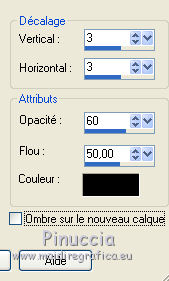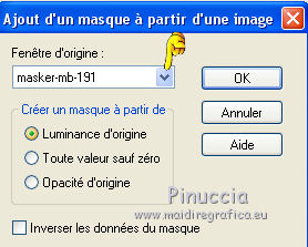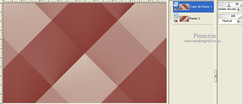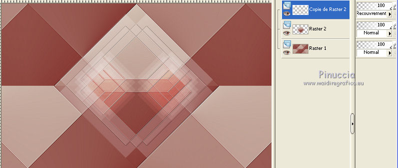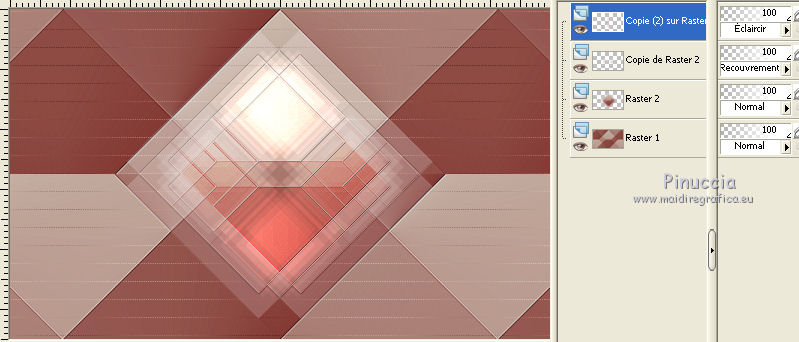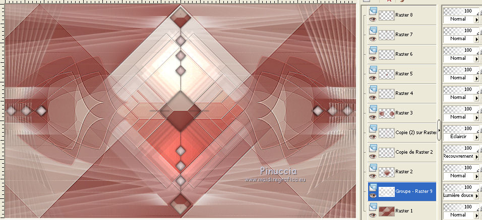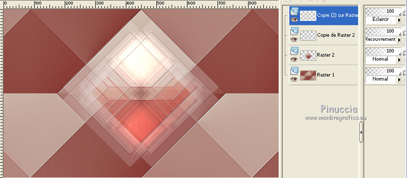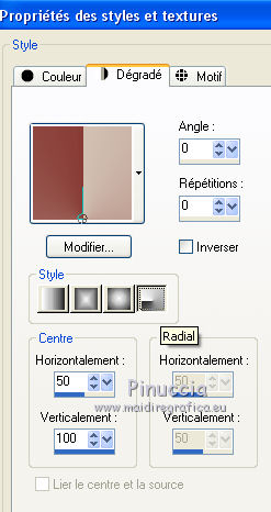 Ce tutoriel a été créé avec CorelX17, mais il peut également être exécuté avec les autres versions. Pour traduire le tutoriel j'ai utilisé CorelX et CorelX2. Suivant la version utilisée, vous pouvez obtenir des résultats différents. Depuis la version X4, la fonction Image>Miroir a été remplacée par Image>Renverser horizontalement, et Image>Renverser avec Image>Renverser verticalement. Dans les versions X5 et X6, les fonctions ont été améliorées par la mise à disposition du menu Objets. Dans la nouvelle version X7, nous avons à nouveau Miroir/Renverser, mais avec autres différences. Voir plus les détails à ce sujet ici Certaines dénominations ont changées entre les versions de PSP. Les plus frequentes dénominations utilisées: ![]() Traduction en italien ici Vos versions ici Nécessaire pour réaliser ce tutoriel: Matériel qui Pour le tube merci Malacka. Modules Externes consulter, si nécessaire, ma section de filtre ici Filters Unlimited 2.0 ici Simple - Diamonds ici Simple - Top Bottom Wrap (bonus) ici Toadies - What are you ici L&K's - L&K's Zitah ici Alien Skin Eye Candy 5 Impact - Glass ici Filtres Factory Gallery peuvent être utilisés seuls ou importés dans Filters Unlimited. voir comment le faire ici). Si un filtre est fourni avec cette icône, ![]() Si vous voulez utiliser vos propres couleurs, n'hésitez pas à changer le mode et l'opacité des calques Dans les plus récentes versions de PSP, vous ne trouvez pas le dégradé d'avant plan/arrière plan ou Corel_06_029. Vous pouvez utiliser le dégradé des versions antérieures. Ici le dossier Dégradés de CorelX. Ouvrir le masque dans PSP et le minimiser avec le reste du matériel. 1. Placer en avant plan la couleur #d2c1b3, et en arrière plan la couleur #883c36. ![]() Préparer en avant plan un dégradé de premier plan/arrière plan, style Radial. ![]() 2. Ouvrir une nouvelle image transparente 900 x 550 pixels. ![]() Remplir l'image transparente du dégradé.3. Effets>Modules Externes>Filters Unlimited 2.0 - Simple - Diamonds. ![]() 4. Calques>Dupliquer. Image>Miroir. 5. Placer le calque en mode Assombrir davantage et réduire l'opacité à 50%. ![]() 6. Calques>Fusionner>Fusionner le calque de dessous. 7. Effets>Effets de bords>Accentuer davantage. 8. Effets>Modules Externes>Filters Unlimited 2.0 - Simple - Top bottom wrap. ![]() 9. Activer Deco-191-1.png - Édition>Copier. ne pas fermer le tube; on va s'en servir plus tard Revenir sur votre travail et Édition>Coller comme nouveau calque. 10. Image>Redimensionner, à 80%, redimensionner tous les calques décoché. 11. Effets>Modules Externes>Filters Unlimited 2.0 - Toadies - What are you. ![]() 12. Effets>Effets de bords>Accentuer davantage. 13. Calques>Dupliquer. Image>Redimensionner, à 40%, redimensionner tous les calques décoché. Réglage >Netteté>Netteté. 14. Effets>Modules Externes>Filters Unlimited 2.0 - Toadies - What are you. ![]() 15. Placer le calque en mode Recouvrement. ![]() 16. Calques>Dupliquer. Image>Rotation libre - 90 degrès à gauche, Pivoter un seul calque autour du centre du support coché. ![]() 17. Placer le calque en mode Éclaircir. ![]() 18. Vous positionner sur le calque du bas de la pile - raster 1. 19. Effets>Modules Externes>L&K landssiteofwonders - L&K's Zitah. ![]() 20. Vous positionner sur le calque du haut de la pile - copie (2) surRaster 2. ![]() 21. Activer deco-191-2.png - Édition>Copier. . Revenir sur votre travail et Édition>Coller comme nouveau calque. 22. Activer deco-191-3 - Édition>Copier. . Revenir sur votre travail et Édition>Coller comme nouveau calque. 23. Activer à nouveau deco-191-1 - Édition>Copier. . Revenir sur votre travail et Édition>Coller comme nouveau calque. Image>Redimensionner, à 20%, redimensionner tous les calques décoché. 24. Effets>Modules Externes>Alien Skin Eye Candy 5 Impact - Glass. Seleziona il preset Clear e ok. ![]() 25. Réglate>Netteté>Davantage de netteté. 26. Activer deco-191-4 - Édition>Copier. Revenir sur votre travail et Édition>Coller comme nouveau calque. 27. Activer deco-191-5 - Édition>Copier. Revenir sur votre travail et Édition>Coller comme nouveau calque. 28. Avtiver deco-191-6 - Édition>Copier. Revenir sur votre travail et Édition>Coller comme nouveau calque. 29. Calques>Nouveau calque raster. Placer en avant plan la couleur blanche #ffffff, et remplir le calque avec cette couleur.30. Calques>Nouveau calque de masque>A partir d'une image. Ouvrir le menu deroulant sous la fenêtre d'origine et vous verrez la liste des images ouvertes. Sélectionner le masque masker-mb-191. ![]() Calques>Fusionner>Fusionner le groupe. 31. Calques>Agencer>Placer en bas de la pile. Calques>Agencer>Déplacer vers le haut. Placer le calque en mode Lumière douce. ![]() 32. Réglage >Netteté>Netteté. 33. Image>Ajouter des bordures, 1 pixel, symétrique, couleur foncée #883c3b. Image>Ajouter des bordures, 3 pixels, symétrique, couleur claire #d2c1b3. Image>Ajouter des bordures, 1 pixel, symétrique, couleur foncée #883c3b. 34. Sélections>Sélectionner tout. Image>Ajouter des bordures, 45 pixels, symétrique, couleur claire #d2c1b3. 35. Effets>Effets 3D>Ombre portée, couleur noire. ![]() 36. Sélections>Inverser. Effets>Modules Externes>L&K's - L&K's Zitah, comme précédemment. ![]() Sélections>Désélectionner tout. 37. Activer le tube malackatube v1 - Édition>Copier. Revenir sur votre travail et Édition>Coller comme nouveau calque. Effacer le watermark. Image>Redimensionner, à 73%, redimensionner tous les calques décoché. Réglage >Netteté>Netteté. Déplacer le tube à droite.38. Effets>Effets 3D>Ombre portée, couleur noire. ![]() 39. Activer le tube MR_Green Ladybug.pspimage - Édition>Copier. Revenir sur votre travail et Édition>Coller comme nouveau calque. Image>Redimensionner, à 80%, redimensionner tous les calques décoché. Réglage >Netteté>Netteté. Déplacer le tube en bas à gauche.40. Effets>Effets 3D>Ombre portée, couleur no