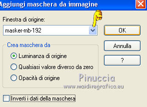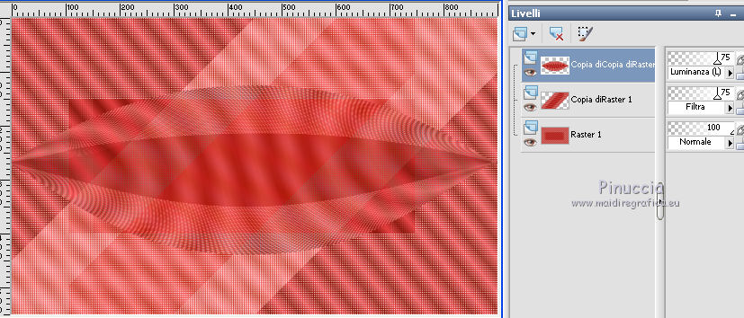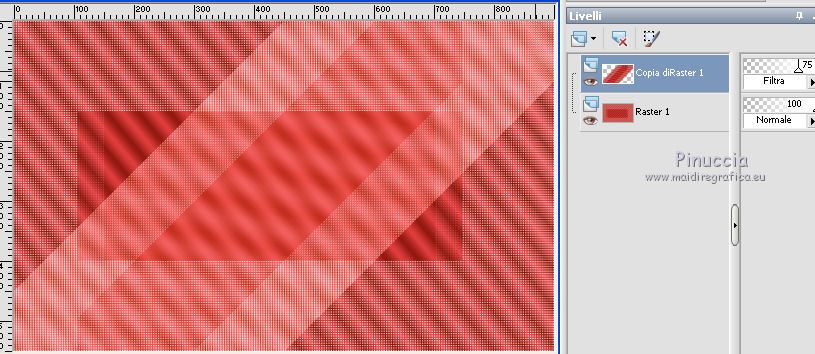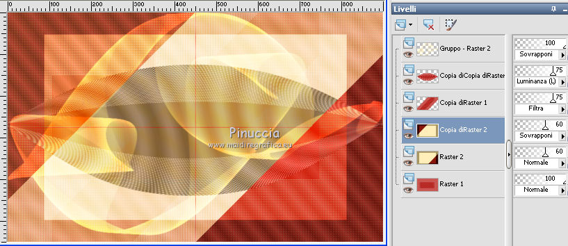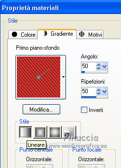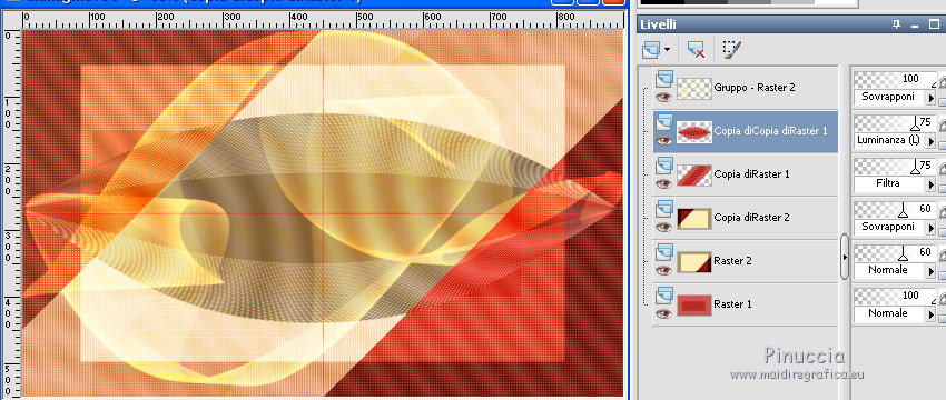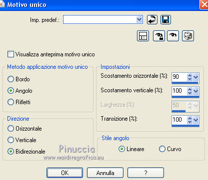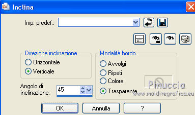 qui puoi trovare qualche risposta ai tuoi dubbi. Se l'argomento che ti interessa non è presente, ti prego di segnalarmelo. Per tradurre il tutorial ho usato Corel X, ma può essere eseguito con ogni versione di PSP. Dalla versione X4, il comando Immagine>Rifletti è stato sostituito con Immagine>Capovolgi in orizzontale, e il comando Immagine>Capovolgi con Immagine>Capovolgi in verticale. Nelle versioni X5 e X6, le funzioni sono state migliorate rendendo disponibile il menu Oggetti. Con la nuova versione X7, sono tornati Rifletti/Capovolgi, ma con nuove differenze Vedi la scheda sull'argomento qui traduction en français qui Le vostre versioni qui Occorrente: Materiale qui Il tube usato è di JHanna Filtri in caso di dubbi, ricorda di consultare la mia sezione filtri qui Filters Unlimited 2.0 qui AFS IMPORT - sqborder2 qui Flaming Pear - Flexify 2 qui Mock - Windo qui I filtri AFS IMPORT e Mock si possono usare da soli o importati in Filters Unlimited (come fare vedi qui) Se un filtro fornito appare con questa icona ![]() se stai usando altri colori, sperimenta le modalità di miscelatura e opacità più adatte ai tuoi colori Nelle ultime versioni di PSP non c'è il gradiente di primo piano/sfondo (Corel_06_029) Trovi i gradienti delle versioni precedenti qui Metti la selezione nella cartella Selezioni. Apri la maschera in PSP e minimizzala con il resto del materiale. 1. Imposta il colore di primo piano con #88160b, e il colore di sfondo con #ea4344. ![]() Passa il colore di primo piano a Gradiente di primo piano/sfondo, stile Lineare. ![]() 2. Apri una nuova immagine trasparente 900 x 550 pixels, ![]() e riempila con il gradiente.3. Effetti>Plugins>AFS IMPORT - sqborder2. ![]() 4. Effetti>Effetti di immagine>Motivo unico. ![]() 5. Livelli>Duplica. 6. Effetti>Effetti geometrici>Inclina. ![]() 7. Cambia la modalità di miscelatura di questo livello in Filtra, e abbassa l'opacità al 75%. ![]() 8. Livelli>Duplica. Effetti>Plugins>Flaming Pear - Flexify 2. ![]() 9. Cambia la modalità di miscelatura di questo livello in Luminanza (esistente), e abbassa l'opacità al 75%. ![]() 10. Imposta il colore di sfondo con #ffeeba. ![]() Livelli>Nuovo livello raster. Riempi il livello con il colore di sfondo #ffeeba.11. Livelli>Nuovo livello maschera>Da immagine. Apri il menu sotto la finestra di origine e vedrai la lista dei files aperti. Seleziona la maschera masker-mb-192. ![]() Livelli>Unisci>Unisci gruppo. 12. Cambia la modalità di miscelatura di questo livello in Sovrapponi. 13. Livelli>Nuovo livello raster. Selezione>Carica/Salva selezione>Carica selezione da disco. Cerca e carica la selezione sel-mb-192. ![]() 14. Riporta il colore di primo piano a Colore e riempi la selezione con il colore di primo piano #88160b.Selezione>Deseleziona. 15. Effetti>Plugins>Filters Unlimited 2.0 - Mock - Windo. ![]() 16. Livelli>Disponi>Porta sotto. Livelli>Disponi>Sposta su. Abbassa l'opacità di questo livello al 60%. 17. Livelli>Duplica. Immagine>Rifletti. Immagine>Capovolgi. 18. Cambia la modalità di miscelatura di questo livello in Sovrapponi, e mantieni l'opacità al 60%. ![]() 19. Attiva il livello Copia di Copia di Raster 1. ![]() Effetti>Effetti 3D>Sfalsa ombra, colore nero. ![]() 20. Immagine>Aggiungi bordatura, 1 pixel, simmetriche, colore scuro di primo piano #88160b. Immagine>Aggiungi bordatura, 3 pixels, simmetriche, colore chiaro di sfondo #ffeeba. Immagine>Aggiungi bordatura, 1 pixel, simmetriche, colore scuro di primo piano #88160b. 21. Selezione>Seleziona tutto. Immagine>Aggiungi bordatura, 50 pixels, simmetriche, colore #ffffff. 22. Effetti>Effetti 3D>Sfalsa ombra, colore nero. ![]() Selezione>Deseleziona. 23. Apri il tube JHanna_367 tube©CarineBouvard, e vai a Modifica>Copia. Torna al tuo lavoro e vai a Modifica>Incolla come nuovo livello. 24. Spostalo a sinistra.25. Immagine>Aggiungi bordatura, 1 pixel, simmetriche, colore scuro di primo piano #88160b. Immagine>Aggiungi bordatura, 3 pixels, simmetriche, colore chiaro di sfondo #ffeeba. Immagine>Aggiungi bordatura, 1 pixel, simmetriche, colore scuro di primo piano #88160b. 26. Firma il tuo lavoro su un nuovo livello. 27. Livelli>Unisci>Unisci tutto. Immagine>Ridimensiona, a 900 pixels di larghezza, tutti i livelli selezionato. Salva in formato jpg. Il tube di questo esempio è di Luz Cristina ![]() ![]() Se hai problemi o dubbi, o trovi un link non funzionante, o anche soltanto per un saluto, scrivimi. 7 Marzo 2016 |