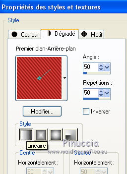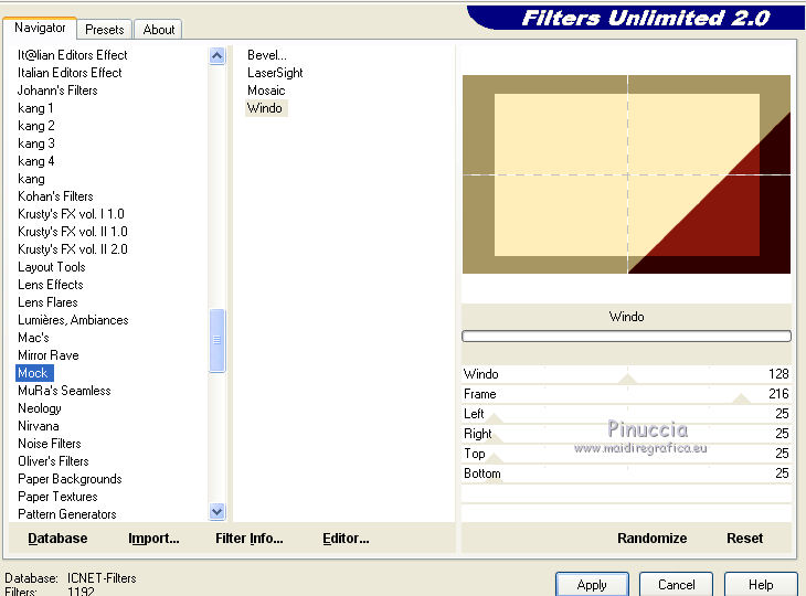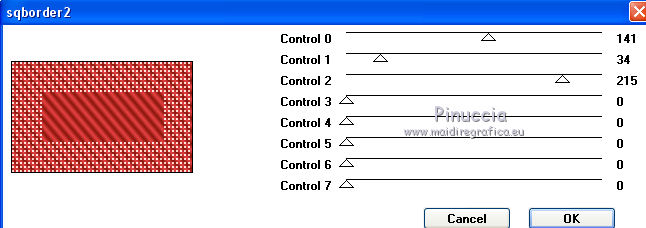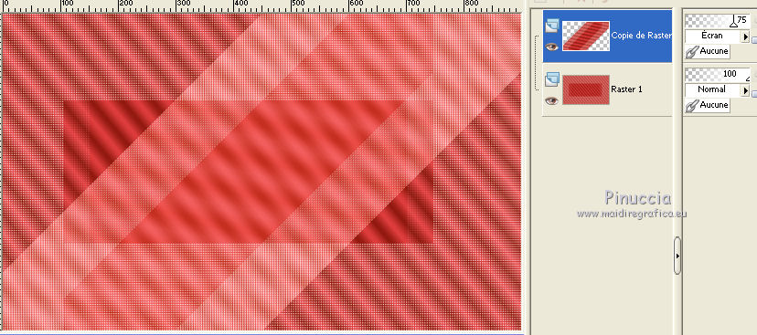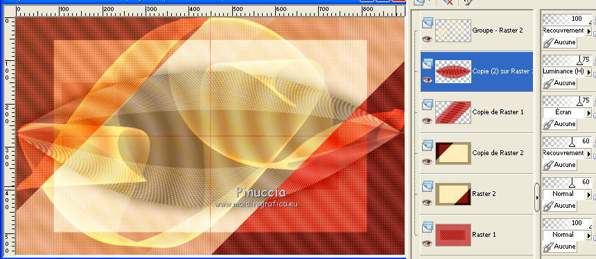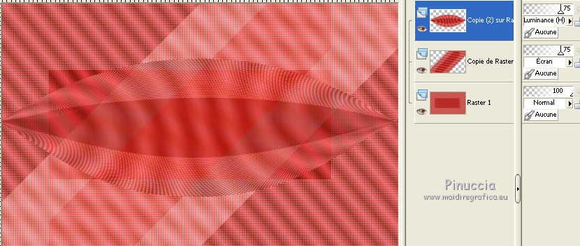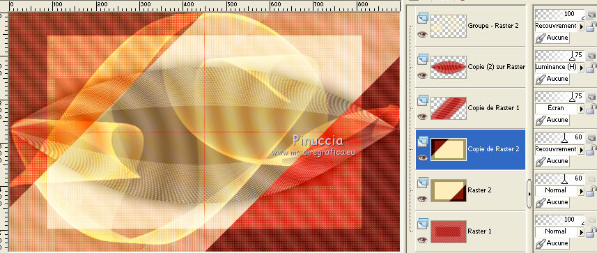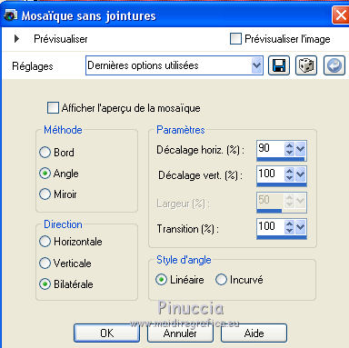Ce tutoriel a été créé avec CorelX17, mais il peut également être exécuté avec les autres versions. Pour traduire le tutoriel j'ai utilisé CorelX et CorelX2. Suivant la version utilisée, vous pouvez obtenir des résultats différents. Depuis la version X4, la fonction Image>Miroir a été remplacée par Image>Renverser horizontalement, et Image>Renverser avec Image>Renverser verticalement. Dans les versions X5 et X6, les fonctions ont été améliorées par la mise à disposition du menu Objets. Dans la nouvelle version X7, nous avons à nouveau Miroir/Renverser, mais avec autres différences. Voir plus les détails à ce sujet ici Certaines dénominations ont changées entre les versions de PSP. Les plus frequentes dénominations utilisées: ![]() Traduction en italien ici Vos versions ici Nécessaire pour réaliser ce tutoriel: Matériel qui Le tube de la femme est de JHanna. Modules Externes consulter, si nécessaire, ma section de filtre ici Filters Unlimited 2.0 ici AFS IMPORT - sqborder2 ici Flaming Pear - Flexify 2 ici Mock - Windo ici Filtres AFS IMPORT et Mock peuvent être utilisés seuls ou importés dans Filters Unlimited. voir comment le faire ici). Si un filtre est fourni avec cette icône, ![]() Si vous voulez utiliser vos propres couleurs, n'hésitez pas à changer le mode et l'opacité des calques Dans les plus récentes versions de PSP, vous ne trouvez pas le dégradé d'avant plan/arrière plan ou Corel_06_029. Vous pouvez utiliser le dégradé des versions antérieures. Ici le dossier Dégradés de CorelX. Placer la sélection dans le dossier Sélections. Ouvrir le masque dans PSP et le minimiser avec le reste du matériel. 1. Placer en avant plan la couleur #88160b, et en arrière plan la couleur #ea4344. ![]() Préparer en avant plan un dégradé de premier plan/arrière plan, style Linéaire. ![]() 2. Ouvrir une nouvelle image transparente 900 x 550 pixels. ![]() Remplir l'image transparente du dégradé.3. Effets>Modules Externes>AFS IMPORT - sqborder2. ![]() 4. Effets>Effets d'image>Mosaïque sans jointures. ![]() 5. Calques>Dupliquer. 6. Effets>Effets géométriques>Inclinaison. ![]() 7. Placer le calque en mode Écran et réduire l'opacité à 75%. ![]() 8. Calques>Dupliquer. Effets>Modules Externes>Flaming Pear - Flexify 2. ![]() 9. Placer le calque en mode Luminance (héritée) et réduire l'opacité à 75%. ![]() 10. Placer en arrière plan la couleur #ffeeba. ![]() Calques>Nouveau calque raster. Remplir le calque avec la couleur d'arrière plan #ffeeba.11. Calques>Nouveau calque de masque>A partir d'une image. Ouvrir le menu deroulant sous la fenêtre d'origine et vous verrez la liste des images ouvertes. Sélectionner le masque masker-mb-192. ![]() Calques>Fusionner>Fusionner le groupe. 12. Placer le calque en mode Recouvrement. 13. Calques>Nouveau calque raster. Sélections>Charger/Enregistrer une sélection>Charger à partir du disque. Chercher et charger la sélection sel-mb-192. ![]() 14. Placer en avant plan la Couleur et remplir la sélection avec la couleur d'avant plan #88160b.Sélections>Désélectionner tout. 15. Effets>Modules Externes>Filters Unlimited 2.0 - Mock - Windo. ![]() 16. Calques>Agencer>Placer en bas de la pile. Calques>Agencer>Déplacer vers le haut. Réduire l'opacité de ce calque à 60%. 17. Calques>Dupliquer. Image>Miroir. Image>Renverser. 18. Placer le calque en mode Recouvrement et garder l'opacité à 60%. ![]() 19. Vous positionner sur le calque Copie(2) sur Raster 1. ![]() Effets>Effets 3D>Ombre portée, couleur noire. ![]() 20. Image>Ajouter des bordures, 1 pixel, symétrique, couleur foncée d'avant plan #88160b. Image>Ajouter des bordures, 3 pixels, symétrique, couleur claire d'arrière plan #ffeeba. Image>Ajouter des bordures, 1 pixel, symétrique, couleur foncée d'avant plan #88160b. 21. Sélections>Sélectionner tout. Image>Ajouter des bordures, 50 pixels, symétrique, couleur #ffffff. 22. Effets>Effets 3D>Ombre portée, couleur noire. ![]() Sélections>Désélectionner tout. 23. Ouvrir le tube JHanna_367 tube©CarineBouvard, Édition>Copier. Revenir sur votre travail et Édition>Coller comme nouveau calque. 24. Déplacer le tube à gauche.25. Image>Ajouter des bordures, 1 pixel, symétrique, couleur foncée d'avant plan #88160b. Image>Ajouter des bordures, 3 pixels, symétrique, couleur claire d'arrière plan #ffeeba. Image>Ajouter des bordures, 1 pixel, symétrique, couleur foncée d'avant plan #88160b. 26. Signer votre travail sur un nouveau calque. 27. Calques>Fusionner>Tous. Image>Redimensionner, à 900 pixels de largeur, redimensionner tous les calques coché. Enregistrer en jpg. Le tube de cette version est de LuzCristina ![]() ![]() Si vous avez des problèmes, ou des doutes, ou vous trouvez un link modifié, ou seulement pour me dire que ce tutoriel vous a plu, vous pouvez m'écrire. 7 Mars 2016 |