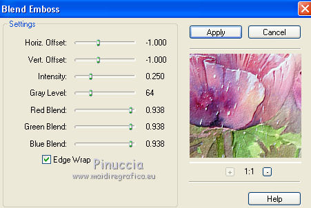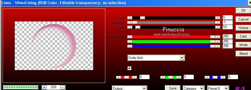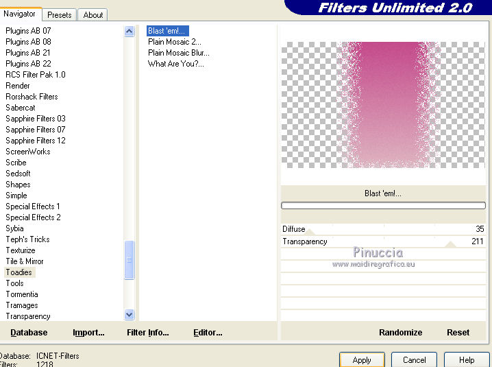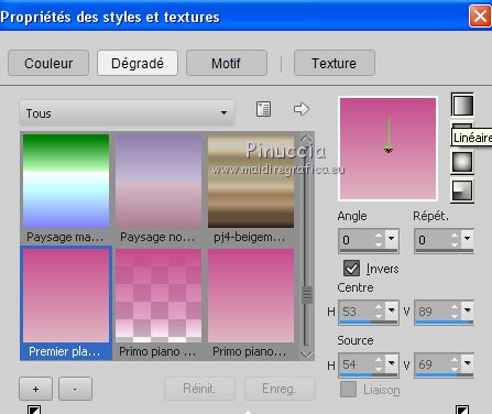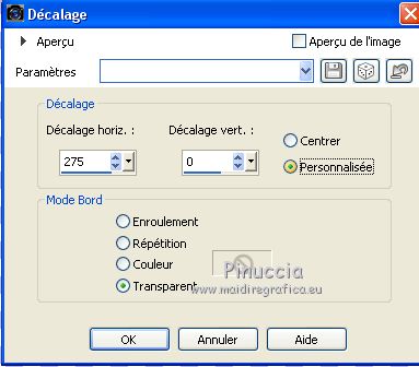 Ce tutoriel a été créé avec CorelX17, mais il peut également être exécuté avec les autres versions. Pour traduire le tutoriel j'ai utilisé CorelX pour l'italien et CorelX17 pour le français. Suivant la version utilisée, vous pouvez obtenir des résultats différents. Depuis la version X4, la fonction Image>Miroir a été remplacée par Image>Renverser horizontalement, et Image>Renverser avec Image>Renverser verticalement . Dans les versions X5 et X6, les fonctions ont été améliorées par la mise à disposition du menu Objets. Dans la nouvelle version X7, nous avons à nouveau Miroir/Renverser, mais avec autres différences. Voir plus les détails à ce sujet ici Certaines dénominations ont changées entre les versions de PSP. Les plus frequentes dénominations utilisées: ![]() Traduction en italien ici Vos versions ici Nécessaire pour réaliser ce tutoriel: Matériel qui Le tube des fleurs est de Jewel. Modules Externes consulter, si nécessaire, ma section de filtre ici AP 01 [Innovations] - Lines SilverLining ici Flaming Pear - Flexify 2 ici Filters Unlimited 2.0 ici Toadies - Blast 'em ici FM Tile Tools - Blend Emboss ici Filtres Toadies peuvent être utilisés seuls ou importés dans Filters Unlimited. voir comment le faire ici). Si un filtre est fourni avec cette icône, ![]() Si vous voulez utiliser vos propres couleurs, n'hésitez pas à changer le mode et l'opacité des calques Dans les plus récentes versions de PSP, vous ne trouvez pas le dégradé d'avant plan/arrière plan ou Corel_06_029. Vous pouvez utiliser le dégradé des versions antérieures. Ici le dossier Dégradés de CorelX. 1. Placer en avant plan la couleur #c54b8c et en arrière plan la couleur #dfb5c1. ![]() Préparer en avant plan un dégradé de premier plan/arrière plan, style Linéaire. ![]() 2. Ouvrir une nouvelle image transparente 800 x 500 pixels. ![]() Remplir l'image transparente du dégradé.3. Calques>Nouveau calque raster. Sélections>Sélectionner tout. 4. Ouvrir Abstract333.png - Édition>Copier. Revenir sur votre travail et Édition>Coller dans la sélection. Sélections>Désélectionner tout. 5. Effets>Effets d'image>Mosaïque sans jointures. ![]() 6. Calques>Fusionner>Calques visibles. 7. Calques>Nouveau calque raster. Activer l'outil Sélection ![]() (peu importe le type de sélection, parce que avec la sélection personnalisée vous obtenez toujours un rectangle), cliquer sur Sélection personnalisée ![]() et setter ces paramètres. ![]() Remplir la sélection du dégradé.Sélections>Désélectionner tout. 8. Effets>Modules Externes>Filters Unlimited 2.0 - Toadies - Blast em. ![]() 9. Effets>Modules Externes>Flaming Pear - Flexify 2. ![]() 10. Image>Redimensionner, à 90%, redimensionner tous les calques décoché. 11. Effets>Modules Externes>AP 01 [Innovations] - Lines SilverLining. ![]() 12. Effets>Effets 3D>Ombre portée, couleur noire. ![]() 13. Calques>Dupliquer. Image>Redimensionner, à 90%, redimensionner tous les calques décoché. Placer le calque en mode Lumière dure. 14. Calques>Dupliquer. Image>Redimensionner, à 90%, redimensionner tous les calques décoché. Placer le calque en mode Écran. 15. Calques>Dupliquer. Image>Redimensionner, à 50%, redimensionner tous les calques décoché. Garder le calque en mode Écran. ![]() 16. Effets>Effets d'image>Décalage. ![]() ![]() 17. Calques>Dupliquer. Image>Miroir. 18. Calques>Fusionner>Calques visibles. 19. Ouvrir le tube Fleur misted jewel 0034, effacer le watermark - Édition>Copier. Revenir sur votre travail et Édition>Coller comme nouveau calque. Image>Redimensionner, à 55%, redimensionner tous les calques décoché. Positionner le tube au centre.![]() 20. Effets>Modules Externes>FM Tile Tools - Blend Emboss, par défaut. ![]() 21. Ouvrir le tube 383.png - Édition>Copier. Revenir sur votre travail et Édition>Coller comme nouveau calque. Déplacer le tube à gauche, voir mon exemple.Placer le calque en mode Lumière douce. 22. Calques>Dupliquer. Image>Miroir. Déplacer ce tube un peu plus en bas(mode de melange en Écran; pour mon exemple j'ai gardé le mode Lumière douce). ![]() 23. Ouvrir strikje-85.png - Édition>Copier. Revenir sur votre travail et Édition>Coller comme nouveau calque. Déplacer le tube à droite.![]() 24. Ouvrir deco-10.png - Édition>Copier. Revenir sur votre travail et Édition>Coller comme nouveau calque. Déplacer le tube en bas à gauche, voir mon exemple.25. Effets>Effets 3D>Ombre portée, couleur noire. ![]() 26. Ouvrir chili_Butterflies0501.png - Édition>Copier. Revenir sur votre travail et Édition>Coller comme nouveau calque. Image>Redimensionner, à 50%, redimensionner tous les calques décoché. Déplacer le tube en haut à gauche - voir mon exemple.27. Effets>Effets 3D>Ombre portée, comme précédemment. ![]() 28. Ouvrir vlindertjes50.png - Édition>Copier. Revenir sur votre travail et Édition>Coller comme nouveau calque. Déplacer le tube à droite.![]() 29. Image>Ajouter des bordures, 2 pixels, symétrique, couleur d'avant plan. Image>Ajouter des bordures, 4 pixels, symétrique, couleur blanche #ffffff. Image>Ajouter des bordures, 2 pixels, symétrique, couleur #62366b. 30. Sélections>Sélectionner tout. Image>Ajouter des bordures, 40 pixels, symétrique, couleur blanche #ffffff. 31. Effets>Effets 3D>Ombre portée, couleur noire. ![]() Sélections>Désélectionner tout. 32. Signer votre travail sur un nouveau calque. 33. Image>Ajouter des bordures, 2 pixels, symétrique, couleur d'avant plan. Enregistrer en jpg. Le tube de cette version est de Devilinside ![]() ![]() Si vous avez des problèmes, ou des doutes, ou vous trouvez un link modifié, ou seulement pour me dire que ce tutoriel vous a plu, vous pouvez m'écrire. 26 Mai 2016 |