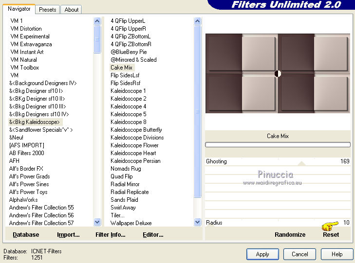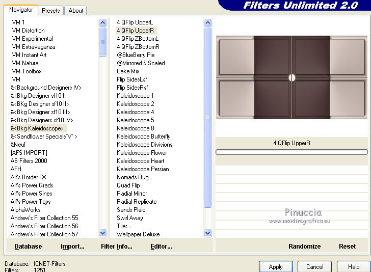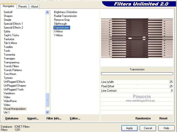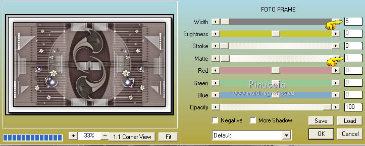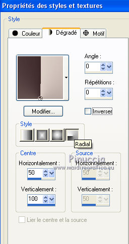 Ce tutoriel a été créé avec CorelX17, mais il peut également être exécuté avec les autres versions. Pour traduire le tutoriel j'ai utilisé CorelX pour l'italien et CorelX17 pour le français. Suivant la version utilisée, vous pouvez obtenir des résultats différents. Depuis la version X4, la fonction Image>Miroir a été remplacée par Image>Renverser horizontalement, et Image>Renverser avec Image>Renverser verticalement. Dans les versions X5 et X6, les fonctions ont été améliorées par la mise à disposition du menu Objets. Dans la nouvelle version X7, nous avons à nouveau Miroir/Renverser, mais avec autres différences. Voir plus les détails à ce sujet ici Certaines dénominations ont changées entre les versions de PSP. Les plus frequentes dénominations utilisées: ![]() Traduction en italien ici Vos versions ici Nécessaire pour réaliser ce tutoriel: Matériel qui Le tube de la femme est de OBG. Modules Externes consulter, si nécessaire, ma section de filtre ici AP 01 [Innovations] - Lines SilverLining ici AAA Frames - Foto Frame ici Filters Unlimited 2.0 ici &<Bkg Kaleidoscope> (da importare in Unlimited) ici Visual Manipulation - Transmission ici Alien Skin Eye Candy 5 Impact - Perspective Shadow ici Filtres Visual Manipulation peuvent être utilisés seuls ou importés dans Filters Unlimited. voir comment le faire ici). Si un filtre est fourni avec cette icône, ![]() Si vous voulez utiliser vos propres couleurs, n'hésitez pas à changer le mode et l'opacité des calques Dans les plus récentes versions de PSP, vous ne trouvez pas le dégradé d'avant plan/arrière plan ou Corel_06_029. Vous pouvez utiliser le dégradé des versions antérieures. Ici le dossier Dégradés de CorelX. 1. Placer en avant plan la couleur #ded1c8 et en arrière plan la couleur #3e2a2a. ![]() Préparer en avant plan un dégradé de premier plan/arrière plan, style Radial. ![]() 2. Ouvrir une nouvelle image transparente 900 x 500 pixels. ![]() Remplir l'image transparente avec la couleur d'arrière plan.3. Calques>Nouveau calque raster. Remplir le calque du dégradé.4. Effets>Modules Externes>AAA Frames - Foto Frame, par défaut. ![]() 5. Effets>Modules Externes>Filters Unlimited 2.0 - &<Bkg Kaleidoscope> - Cake Mix. ![]() 6. Effets>Modules Externes>Filters Unlimited 2.0 - &<Bkg Kaleidoscope> - 4QFlip-UpperR. ![]() 7. Réduire l'opacité de ce calque à 55%. 8. Calques>Dupliquer. 9. Effets>Modules Externes>AP 01 [Innovations] - Lines Silver>Lining. ![]() 10. Sur ce calque: Effets>Effets géométriques>Cercle. ![]() 11. Vous positionner sur le calque de dessous Raster 2. ![]() Effets>Modules Externes>Filters Unlimited 2.0 - Visual Manipulation - Transmission, par défaut. ![]() 12. Vous positionner sur le calque du haut de la pile Copie de Raster 2. 13. Ouvrir deco-1-196-2016 - Édition>Copier. Revenir sur votre travail et Édition>Coller comme nouveau calque. 14. Ouvrir deco-2a-196-2016 - Édition>Copier. Revenir sur votre travail et Édition>Coller comme nouveau calque. (Si vous utilisez d'autres couleurs: Réglage>Teinte et Saturation>Coloriser) 15. Image>Ajouter des bordures, 5 pixels, symétrique, couleur d'arrière plan. 16. Effets>Modules Externes>AAA Frames - Foto Frame. ![]() 17. Sélections>Sélectionner tout. Image>Ajouter des bordures, 45 pixels, symétrique, couleur blanche. 18. Effets>Effets 3D>Ombre portée, couleur noire. ![]() Sélections>Désélectionner tout. 19. Effets>Modules Externes>AAA Frames - Foto Frame. ![]() 20. Ouvrir deco-3-196-2016 - Édition>Copier. Revenir sur votre travail et Édition>Coller comme nouveau calque. Déplacer l'image en haut à gauche, sur le bord blanc.21. Calques>Dupliquer. Image>Miroir. Image>Renverser. 22. Ouvrir OBG_1146 - Édition>Copier. Revenir sur votre travail et Édition>Coller comme nouveau calque. Effacer le watermark et déplacer le tube en bas à gauche.23. Effets>Modules Externes>Alien Skin Eye Candy 5 Impact - Perspective Shadow sélectionner le preset Drop Shadow Blurry et ok. ![]() 24. Signer votre travail sur un nouveau calque. 25. Image>Redimensionner, 900 pixels de largeur, redimensionner tous les calques coché. Enregistrer en jpg. Le tube de cette version est de Gabry ![]() ![]() Si vous avez des problèmes, ou des doutes, ou vous trouvez un link modifié, ou seulement pour me dire que ce tutoriel vous a plu, vous pouvez m'écrire. 16 Juin 2016 |