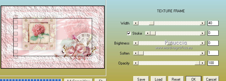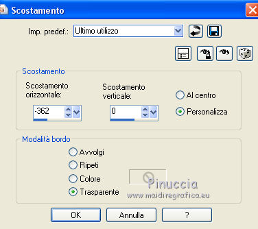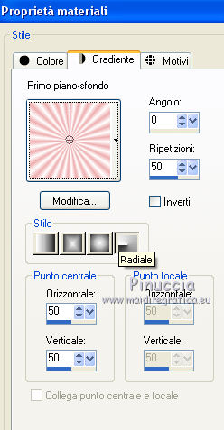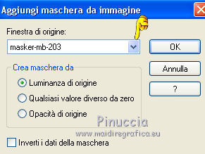qui puoi trovare qualche risposta ai tuoi dubbi. Se l'argomento che ti interessa non è presente, ti prego di segnalarmelo. Per tradurre il tutorial ho usato Corel X, ma può essere eseguito con ogni versione di PSP. Dalla versione X4, il comando Immagine>Rifletti è stato sostituito con Immagine>Capovolgi in orizzontale, e il comando Immagine>Capovolgi con Immagine>Capovolgi in verticale. Nelle versioni X5 e X6, le funzioni sono state migliorate rendendo disponibile il menu Oggetti. Con la nuova versione X7, sono tornati Rifletti/Capovolgi, ma con nuove differenze Vedi la scheda sull'argomento qui traduzione in francese qui Le vostre versioni qui Occorrente: Materiale qui Filtri in caso di dubbi, ricorda di consultare la mia sezione filtri qui AAA Frames - Texture Frame qui ![]() se stai usando altri colori, sperimenta le modalità di miscelatura e opacità più adatte ai tuoi colori Nelle ultime versioni di PSP non c'è il gradiente di primo piano/sfondo (Corel_06_029) Puoi usare i gradienti delle versioni precedenti. Trovi qui i gradienti Corel X. Metti il preset Emboss 3 nella cartella Impostazioni predefinite. Apri la maschera in PSP e minimizzala con il resto del materiale. 1. Imposta il colore di primo piano con #edaeaf, e il colore di sfondo con #ffffff. ![]() Passa il colore di primo piano a Gradiente di primo piano/sfondo, stile Radiale. ![]() 2. Apri una nuova immagine trasparente 900 x 500 pixels, ![]() Riempi l'immagine trasparente con il gradiente.3. Regola>Sfocatura>Sfocatura gaussiana - raggio 25. ![]() 4. Livelli>Nuovo livello raster. Riempi con il colore di sfondo #ffffff.5. Livelli>Nuovo livello maschera>Da immagine. Apri il menu sotto la finestra di origine e vedrai la lista dei files aperti. Seleziona la maschera masker-mb.203. ![]() Livelli>Unisci>Unisci gruppo. 6. Livelli>Duplica. Livelli>Unisci>Unisci giù. 7. Effetti>Filtro definito dall'utente, seleziona il preset Emboss 3 e ok. ![]() 8. Cambia la modalità di miscelatura di questo livello in Filtra. ![]() 9. Apri il tube schilderij.png e vai a Modifica>Copia. Torna al tuo lavoro e vai a Modifica>Incolla come nuovo livello. Immagine>Ridimensiona, 2 volte all'80%, tutti i livelli non selezionato. 10. Effetti>Effetti di immagine>Scostamento. ![]() 11. Effetti>Effetti 3D>Sfalsa ombra, colore nero. ![]() 12. Apri il tube bloem-klein.png e vai a Modifica>Copia. Torna al tuo lavoro e vai a Modifica>Incolla come nuovo livello. Immagine>Ridimensiona, 2 volte all'80%, tutti i livelli non selezionato. Spostalo nella cornice![]() 13. Livelli>Unisci>Unisci giù. 14. Apri deco-1.png e vai a Modifica>Copia. Torna al tuo lavoro e vai a Modifica>Incolla come nuovo livello. 15. Effetti>Effetti di immagine>Scostamento. ![]() 16. Apri il tube rw-hydrangea e vai a Modifica>Copia. Torna al tuo lavoro e vai a Modifica>Incolla come nuovo livello. Immagine>Ridimensiona, all'80%, tutti i livelli non selezionato. Spostalo a destra - vedi il mio esempio.17. Abbassa l'opacità di questo livello intorno al 28%. Effetti>Effetti di bordo>Aumenta. 18. Apri il tube Deco-2222 e vai a Modifica>Copia. Torna al tuo lavoro e vai a Modifica>Incolla come nuovo livello. Immagine>Ridimensiona, all'85%, tutti i livelli non selezionato. Spostalo in basso a destra.![]() 19. Effetti>Effetti 3D>Sfalsa ombra, colore nero. ![]() 20. Immagine>Aggiungi bordatura, 2 pixels, simmetriche, colore di primo piano. Immagine>Aggiungi bordatura, 2 pixels, simmetriche, colore di sfondo bianco. Immagine>Aggiungi bordatura, 2 pixels, simmetriche, colore di primo piano. 21. Selezione>Seleziona tutto. Modifica>Copia. 22. Immagine>Aggiungi bordatura, 50 pixels, simmetriche, colore di sfondo bianco. Selezione>Inverti. 23. Modifica>Incolla nella selezione. 24. Regola>Sfocatura>Sfocatura gaussiana - raggio 25. ![]() 25. Selezione>Inverti. Effetti>Effetti 3D>Sfalsa ombra, colore nero. ![]() Selezione>Deseleziona. 26. Effetti>Plugins>AAA Frames - Texture Frame. ![]() 27. Firma il tuo lavoro su un nuovo livello. Salva in formato jpg. ![]() Se hai problemi o dubbi, o trovi un link non funzionante, o anche soltanto per un saluto, scrivimi. 21 Febbraio 2017 |