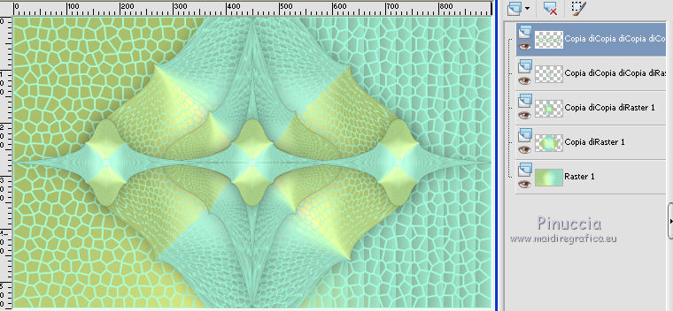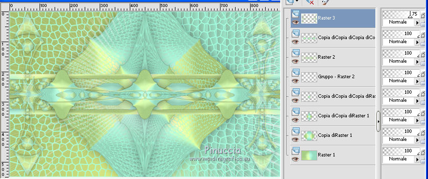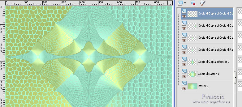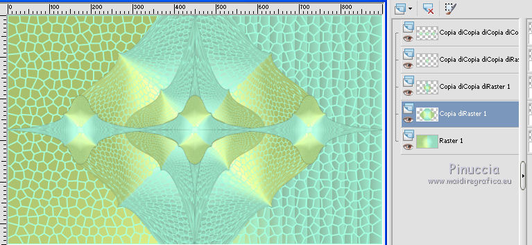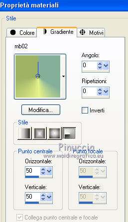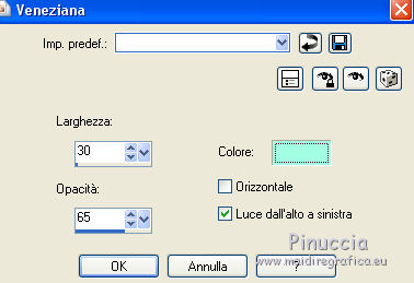 qui puoi trovare qualche risposta ai tuoi dubbi. Se l'argomento che ti interessa non è presente, ti prego di segnalarmelo. Per tradurre il tutorial ho usato Corel X, ma può essere eseguito con ogni versione di PSP. Dalla versione X4, il comando Immagine>Rifletti è stato sostituito con Immagine>Capovolgi in orizzontale, e il comando Immagine>Capovolgi con Immagine>Capovolgi in verticale. Nelle versioni X5 e X6, le funzioni sono state migliorate rendendo disponibile il menu Oggetti. Con la nuova versione X7, sono tornati Rifletti/Capovolgi, ma con nuove differenze Vedi la scheda sull'argomento qui traduzione in francese qui Le vostre versioni qui Occorrente: Materiale qui Per il tube grazie Kamalini. Filtri in caso di dubbi, ricorda di consultare la mia sezione filtri qui AAA Frames - Foto Frame, Texture Frame qui Flaming Pear - Flexify 2 qui Texture - Stained Glass qui ![]() se stai usando altri colori, sperimenta le modalità di miscelatura e opacità più adatte ai tuoi colori Nelle ultime versioni di PSP non c'è il gradiente di primo piano/sfondo (Corel_06_029) Puoi usare i gradienti delle versioni precedenti. Trovi qui i gradienti Corel X. Metti il gradiente nella cartella Gradienti. Apri la maschera in PSP e minimizzala con il resto del materiale. 1. Imposta il colore di primo piano con #a3f4e1, e il colore di sfondo con #ffffff. ![]() Passa il colore di primo piano a Gradiente di primo piano/sfondo, stile Radiale. ![]() 2. Apri una nuova immagine trasparente 900 x 550 pixels, ![]() Riempi l'immagine trasparente con il gradiente.3. Effetti>Plugins>Textures - Stained Glass ![]() se stai usando la versione francese del filtro: Effetti>Plugins>Textures>Vitrail. Vedi la scheda del filtro qui 4. Attiva lo strumento Selezione ![]() (non importa il tipo di selezione impostato, perchè con la selezione personalizzata si ottiene sempre un rettangolo) clicca sull'icona Selezione personalizzata ![]() e imposta i seguenti settaggi. ![]() 5. Effetti>Effetti di trama>Veneziana, colore di primo piano #a3f4e1. ![]() 6. Selezione>Deseleziona. 7. Livelli>Duplica. 8. Effetti>Effetti geometrici>Cerchio. ![]() Immagine>Rifletti. 9. Effetti>Plugins>Flaming Pear - Flexify 2. ![]() se hai problemi a trovare il preset, posizionati sul primo nome della lista e clicca sulla iniziale del preset finché non lo trovi. Vedi la scheda del filtro qui 10.Livelli>Duplica. 11. Effetti>Plugins>Flaming Pear - Flexify 2. ![]() 12 Livelli>Duplica. 13. Effetti>Plugins>Flaming Pear - Flexify 2, con i settaggi precedenti. ![]() ![]() 14. Livelli>Duplica. 15. Immagine>Ruota per gradi - 90 gradi a sinistra. ![]() 16. Livelli>Duplica. 17. Effetti>Effetti di immagine>Scostamento. ![]() 18. Livelli>Duplica. Immagine>Rifletti. ![]() 19. Livelli>Unisci>Unisci giù - 2 volte. 20. Attiva il livello Copia di Raster 1. ![]() 21. Effetti>Effetti 3D>Sfalsa ombra, colore nero. ![]() 22. Attiva il livello soprastante (copia 2 di Raster 1). Modifica>Ripeti Sfalsa ombra. Attiva il livello soprastante (copia 3 di Raster 1). Modifica>Ripeti Sfalsa ombra. Attiva il livello superiore (copia 4 di Raster 1). Modifica>Ripeti Sfalsa ombra. ![]() 23. Livelli>Nuovo livello raster. Riempi con il colore bianco di sfondo #ffffff.24. Livelli>Nuovo livello maschera>Da immagine. Apri il menu sotto la finestra di origine e vedrai la lista dei files aperti. Seleziona la maschera 077-animabelle-masques,psp. ![]() Livelli>Unisci>Unisci gruppo. Regola>Messa a fuoco>Metti a fuoco. 25. Livelli>Disponi>Sposta giù. 26. Apri deco-1-204.psp e vai a Modifica>Copia. Torna al tuo lavoro e vai a Modifica>Incolla come nuovo livello. 27. Attiva il livello superiore. Apri deco-2-204.psp e vai a Modifica>Copia. Torna al tuo lavoro e vai a Modifica>Incolla come nuovo livello. Abbassa l'opacità di questo livello al 75%. ![]() 28. Immagine>Aggiungi bordatura, 1 pixel, simmetriche, colore di primo piano. Immagine>Aggiungi bordatura, 2 pixels, simmetriche, colore bianco. Immagine>Aggiungi bordatura, 1 pixel, simmetriche, colore di primo piano. 29. Modifica>Copia. 30. Selezione>Seleziona tutto. Immagine>Aggiungi bordatura, 50 pixels, simmetriche, colore bianco. 31. Selezione>Inverti. 32. Modifica>Incolla nella selezione. 33. Regola>Sfocatura>Sfocatura gaussiana - raggio 25. ![]() 34. Selezione>Inverti. 35. Effetti>Effetti 3D>Sfalsa ombra, con i settaggi precedenti. ![]() 36. Selezione>Deseleziona. 37. Effetti>Plugins>AAA Frames - Texture Frame. ![]() 38. Effetti>Plugins>AAA Frames - Foto Frame. ![]() 39. Apri il tube Kamalini-092.psp e vai a Modifica>Copia. Torna al tuo lavoro e vai a Modifica>Incolla come nuovo livello. Cancella il watermark. 40. Immagine>Rifletti. Immagine>Ridimensiona, al 65%, tutti i livelli non selezionato. Regola>Messa a fuoco>Metti a fuoco. Posiziona correttamente il tube.41. Effetti>Effetti 3D>Sfalsa ombra, con i settaggi precedenti. ![]() Modifica>Ripeti Sfalsa ombra. 42. Firma il tuo lavoro su un nuovo livello. Livelli>Unisci>Unisci tutto e salva in formato jpg. Il tube di questo esempio è di Thafs ![]() ![]() Se hai problemi o dubbi, o trovi un link non funzionante, o anche soltanto per un saluto, scrivimi. 13 Marzo 2017 |
