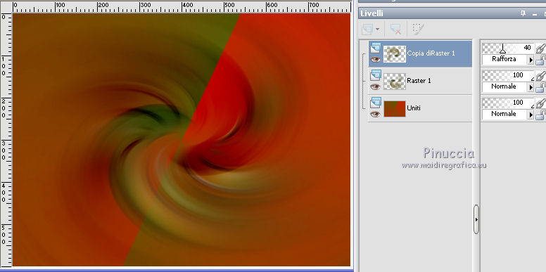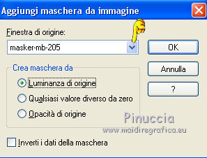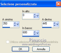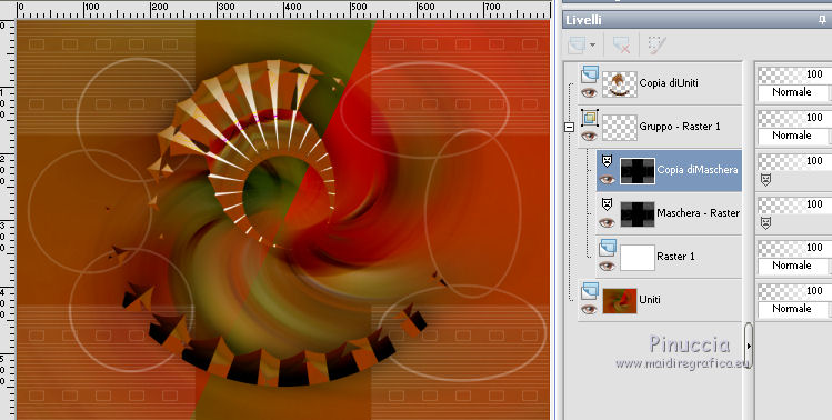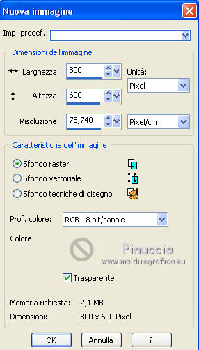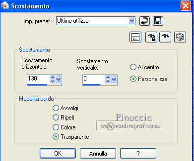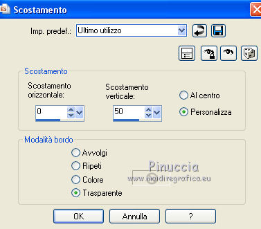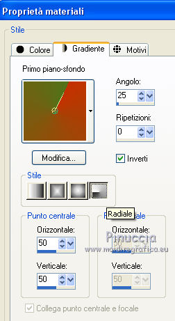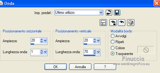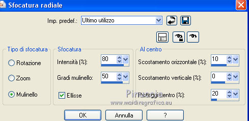 qui puoi trovare qualche risposta ai tuoi dubbi. Se l'argomento che ti interessa non è presente, ti prego di segnalarmelo. Per tradurre il tutorial ho usato Corel X, ma può essere eseguito con ogni versione di PSP. Dalla versione X4, il comando Immagine>Rifletti è stato sostituito con Immagine>Capovolgi in orizzontale, e il comando Immagine>Capovolgi con Immagine>Capovolgi in verticale. Nelle versioni X5 e X6, le funzioni sono state migliorate rendendo disponibile il menu Oggetti. Con la nuova versione X7, sono tornati Rifletti/Capovolgi, ma con nuove differenze Vedi la scheda sull'argomento qui traduzione in francese qui Le vostre versioni qui Occorrente: Materiale qui Filtri in caso di dubbi, ricorda di consultare la mia sezione filtri qui AAA Frames - Foto Frame qui Flaming Pear - Flexify 2 qui Filters Unlimited 2.0 - qui Simple - Pizza Slice Mirror qui I filtri Simple si possono usare da soli o importati in Filters Unlimited (come fare vedi qui) Se un filtro fornito appare con questa icona ![]() se stai usando altri colori, sperimenta le modalità di miscelatura e opacità più adatte ai tuoi colori Nelle ultime versioni di PSP non c'è il gradiente di primo piano/sfondo (Corel_06_029) Puoi usare i gradienti delle versioni precedenti. Trovi qui i gradienti Corel X. Apri la maschera in PSP e minimizzala con il resto del materiale. 1. Imposta il colore di primo piano con #52721a, e il colore di sfondo con #c53100. ![]() Passa il colore di primo piano a Gradiente di primo piano/sfondo, stile Radiale. 2. Apri una nuova immagine trasparente 800 x 600 pixels, ![]() Riempi l'immagine trasparente con il gradiente.3. Livelli>Duplica. Immagine>Rifletti. Immagine>Capovolgi. 4. Cambia la modalità di miscelatura di questo livello in Luce diffusa. ![]() 5. Livelli>Unisci>Unisci visibile. 6. Apri il tube 545f9312.png e vai a Modifica>Copia. non chiuderlo perchè ti servirà ancora Torna al tuo lavoro e vai a Modifica>Incolla come nuovo livello. 7. Regola>Sfocatura>Sfocatura radiale. ![]() 8. Livelli>Duplica. Immagine>Rifletti. Immagine>Capovolgi. 9. Cambia la modalità di miscelatura di questo livello in Rafforza, e abbassa l'opacità al 40%. ![]() 10. Livelli>Unisci>Unisci visibile. 11. Livelli>Duplica. 12. Immagine>Ridimensiona, 2 volte all'80%, tutti i livelli non selezionato. ![]() 13. Immagine>Ruota per gradi - 90 gradi a destra. ![]() 14. Effetti>Plugins>Filters Unlimited 2.0 - Simple - Pizza Slice Mirror. ![]() 15. Effetti>Plugins>Flaming Pear - Flexify 2 ![]() se non trovi il preset, seleziona il primo preset della lista ![]() e clicca l'iniziale del preset "D" finché non vedrai Disc Sphere A (con la mia versione di Flexify ho cliccato 7 volte) ![]() ***** Se ancora hai problemi con le impostazioni del filtro: scarica e usa il preset che ho creato qui Clicca sull'icona del bottone rosso e cerca e seleziona il preset nella cartella in cui lo hai salvato. ![]() ***** 16. Effetti>Effetti di immagine>Scostamento. ![]() 17. Effetti>Effetti 3D>Sfalsa ombra, colore nero. ![]() 18. Attiva il livello inferiore (Uniti). 19. Imposta il colore di primo piano con il colore bianco #ffffff. Livelli>Nuovo livello raster. Riempi il livello con il colore bianco.20. Livelli>Nuovo livello maschera>Da immagine. Apri il menu sotto la finestra di origine e vedrai la lista dei files aperti. Seleziona la maschera masker-mb-205. ![]() Livelli>Duplica. ![]() Livelli>Unisci>Unisci gruppo. 21. Effetti>Effetti 3D>Sfalsa ombra, con i settaggi precedenti. ![]() 22. Apri deco-mb-329 e vai a Modifica>Copia. Torna al tuo lavoro e vai a Modifica>Incolla come nuovo livello. Cambia la modalità di miscelatura di questo livello in Luminanza (esistente). 23. Apri deco-mb-328 e vai a Modifica>Copia. Torna al tuo lavoro e vai a Modifica>Incolla come nuovo livello. Cambia la modalità di miscelatura di questo livello in Luminanza (esistente). 24. Attiva il livello inferiore (Uniti). Attiva lo strumento Selezione ![]() (non importa il tipo di selezione impostato, perchè con la selezione personalizzata si ottiene sempre un rettangolo) clicca sull'icona Selezione personalizzata ![]() e imposta i seguenti settaggi. ![]() 25. Selezione>Innalza selezione a livello. Selezione>Deseleziona. 26. Effetti>Effetti di distorsione>Onda. ![]() 27. Effetti>Effetti di immagine>Scostamento. ![]() 28. Livelli>Duplica. Immagine>Rifletti. 29. Attiva il livello superiore. Attiva nuovamente il tube 545f9312.png e vai a Modifica>Copia. Torna al tuo lavoro e vai a Modifica>Incolla come nuovo livello. Spostalo a sinistra.30. Effetti>Effetti 3D>Sfalsa ombra, colore nero. ![]() 31. Immagine>Aggiungi bordatura, 1 pixel, simmetriche, colore bianco #ffffff. 32. Modifica>Copia. 33. Selezione>Seleziona tutto. 34. Effetti>Plugins>AAA Frames - Foto Frame. ![]() 35. Immagine>Aggiungi bordatura, 50 pixels, simmetriche, colore bianco #ffffff. Selezione>Inverti. Modifica>Incolla nella selezione. 36. Regola>Sfocatura>Sfocatura gaussiana - raggio 30. ![]() 37. Selezione>Inverti. Effetti>Effetti 3D>Sfalsa ombra, con i settaggi precedenti. ![]() 38. Selezione>Deseleziona. 39. Effetti>Plugins>AAA Frames - Foto Frame. ![]() 40. Firma il tuo lavoro su un nuovo livello. Salva in formato jpg. Il tube di questo esempio è di Danimage ![]() ![]() Se hai problemi o dubbi, o trovi un link non funzionante, o anche soltanto per un saluto, scrivimi. 11 Aprile 2017 |