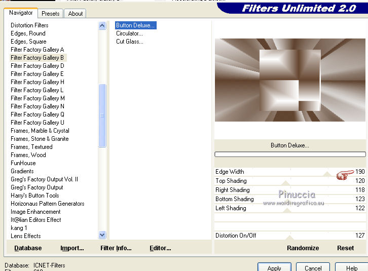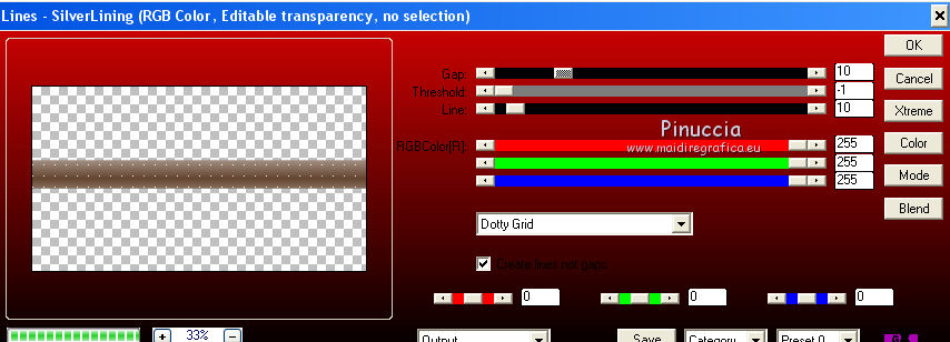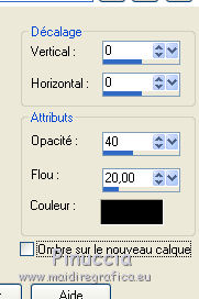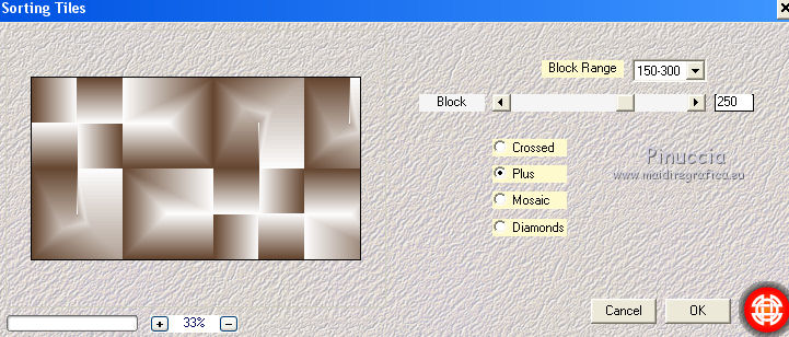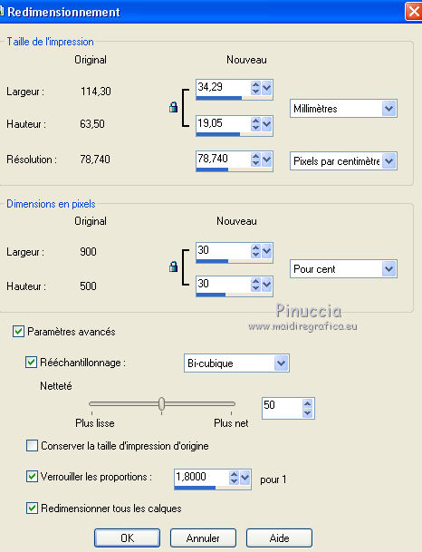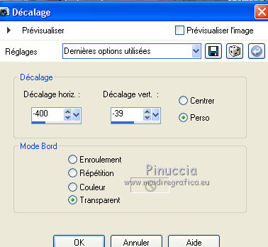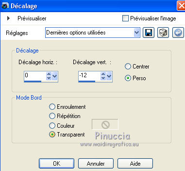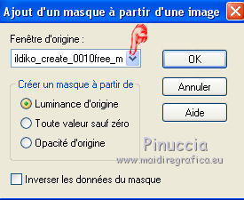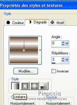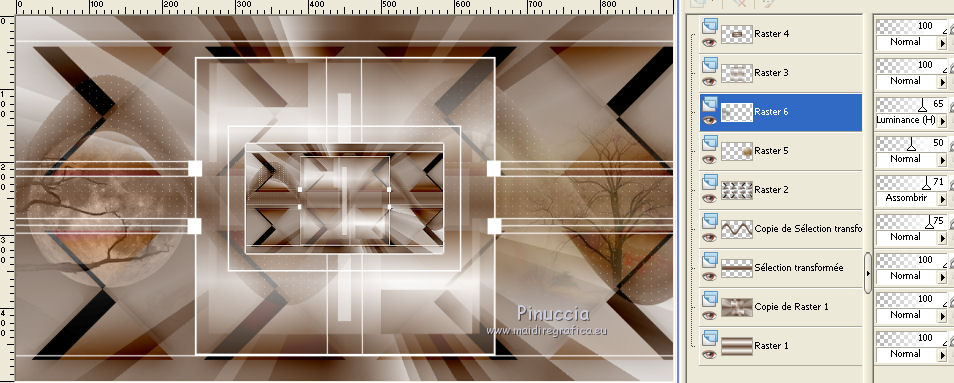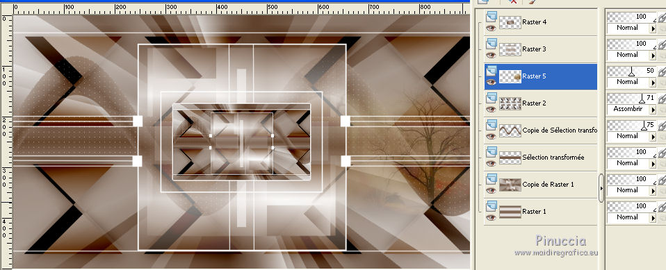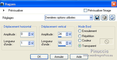 Ce tutoriel a été créé avec CorelX17, mais il peut également être exécuté avec les autres versions. Pour traduire le tutoriel j'ai utilisé CorelX pour l'italien et CorelX17 pour le français. Suivant la version utilisée, vous pouvez obtenir des résultats différents. Depuis la version X4, la fonction Image>Miroir a été remplacée par Image>Renverser horizontalement, et Image>Renverser avec Image>Renverser verticalement. Dans les versions X5 et X6, les fonctions ont été améliorées par la mise à disposition du menu Objets. Dans la nouvelle version X7, nous avons à nouveau Miroir/Renverser, mais avec autres différences. Voir plus les détails à ce sujet ici Certaines dénominations ont changées entre les versions de PSP. Les plus frequentes dénominations utilisées: ![]() Traduction en italien ici Vos versions ici Nécessaire pour réaliser ce tutoriel: Matériel qui Merci: pour les tubes Luz Cristina, Libellule et Jacotte; pour le masque Ildiko. (ici les liens aux sites des tubers Modules Externes consulter, si nécessaire, ma section de filtre ici Filters Unlimited 2.0 ici Filter Factory Gallery B - Button deluxe ici Mehdi - Sorting Tiles ici AP 01 Innovations - Lines SilverLining ici Filtres Factory Gallery peuvent être utilisés seuls ou importés dans Filters Unlimited. voir comment le faire ici). Si un filtre est fourni avec cette icône, ![]() Si vous voulez utiliser vos propres couleurs, n'hésitez pas à changer le mode et l'opacité des calques Dans les plus récentes versions de PSP, vous ne trouvez pas le dégradé d'avant plan/arrière plan ou Corel_06_029. Vous pouvez utiliser le dégradé des versions antérieures. Ici le dossier Dégradés de CorelX. Ouvrir le masque dans PSP et le minimiser avec le reste du matériel. 1. Placer en avant plan la couleur #654630 et en arrière plan la couleur #ffffff. ![]() Préparer un dégradé de premier plan/arrière plan, style Linéaire ![]() 2. Ouvrir une nouvelle image transparente 900 x 500 pixels. ![]() Remplir l'image transparente du dégradé.3. Calques>Dupliquer. Effets>Modules Externes>Mehdi - Sorting Tiles. ![]() 4. Effets>Modules Externes>Filters Unlimited 2.0 - Filter Factory Gallery B - Button Deluxe. ![]() 5. Calques>Dupliquer. Image>Miroir. Image>Renverser. 6. Réduire l'opacité de ce calque à 50%. 7. Calques>Fusionner>Fusionner le calque de dessous. 8. Vous positionner sur le calque du bas de la pile, Raster 1. Activer l'outil Sélection ![]() (peu importe le type de sélection, parce que avec la sélection personnalisée vous obtenez toujours un rectangle), cliquer sur Sélection personnalisée ![]() et setter ces paramètres. ![]() Sélections>Transformer la sélection en calque. 9. Calques>Agencer>Placer en haut de la pile. Sélections>Désélectionner tout. 10. Effets>Modules Externes>AP 01 [Innovations] - Lines SilverLining. ![]() 11. Calques>Dupliquer. 12. Effets>Effets de distorsion>Vagues. ![]() 13. Réduire l'opacité de ce calque à 75%. 14. Ouvrir deco-1-207.psp - Édition>Copier. Revenir sur votre travail et Édition>Coller comme nouveau calque. Le calque est en mode Assombrir et opacité 71%. 16. Effets>Effets d'image>Décalage. ![]() 17. Ouvrir deco-2-2017.png - Édition>Copier. Revenir sur votre travail et Édition>Coller comme nouveau calque. 18. Édition>Copie Spéciale>Copier avec fusion. Édition>Coller comme nouvelle image et travailler sur cette image. Image>Redimensionner, à 30%, redimensionner tous les calques coché. ![]() 19. Image>Ajouter des bordures, 25 pixels, symétrique, couleur blanche #ffffff. Calques>Trasformer le calque d'arrière plan. 20. Activer l'outil Baguette magique , tolérance et progressivité 0,et cliquer dans le bord blanc pour le sélectionner. 21. Sélections>Modifier>Contracter - 2 pixel. Presser CANC sur le clavier ![]() Sélections>Désélectionner tout. 22. Édition>Copier. Revenir sur votre travail et Édition>Coller comme nouveau calque. Réglage>Netteté>Netteté. 23. Ouvrir le tube 1371-luzcristina.psp - Édition>Copier. Revenir sur votre travail et Édition>Coller comme nouveau calque. 24. Effets>Effets d'image>Décalage. ![]() 25. Réduire l'opacité de ce calque à 50%. Calques>Agencer>Déplacer vers le bas - 2 fois. ![]() 26. Ouvrir le tube libellulegraphisme_paysage_pleine_lune.psp - Édition>Copier. Revenir sur votre travail et Édition>Coller comme nouveau calque. 27. Effets>Effets d'image>Décalage. ![]() 28. Placer le calque en mode Luminance (héritée) et réduire l'opacité à 65%. ![]() 29. Vous positionner sur le calque du haut de la pile. Calques>Nouveau calque raster. Remplir le calque avec la couleur blanche #ffffff.30. Calques>Nouveau calque de masque>A partir d'une image. Ouvrir le menu deroulant sous la fenêtre d'origine et vous verrez la liste des images ouvertes. Sélectionner le masque ildiko_create_0010free_mask.psp. ![]() Calques>Fusionner>Fusionner le groupe. 31. Réglage>Netteté>Netteté. 32. Ouvrir tube-Jacotte-458.psp - Édition>Copier. Revenir sur votre travail et Édition>Coller comme nouveau calque. Image>Miroir. Image>Redimensionner, à 70%, redimensionner tous les calques décoché. Réglage>Netteté>Netteté. 33. Effets>Effets 3D>Ombre portée, couleur noire. ![]() Déplacer le tube à droite, voir mon exemple.34. Image>Ajouter des bordures, 2 pixels, symétrique, couleur foncée. Image>Ajouter des bordures, 20 pixels, symétrique, couleur blanche. Image>Ajouter des bordures, 1 pixel, symétrique, couleur foncée. Image>Ajouter des bordures, 5 pixels, symétrique, couleur blanche. Image>Ajouter des bordures, 1 pixel, symétrique, couleur foncée. 35. Sélections>Sélectionner tout. Image>Ajouter des bordures, 30 pixels, symétrique, couleur blanche. Image>Ajouter des bordures, 1 pixel, symétrique, couleur foncée. 36. Effets>Effets 3D>Ombre portée, couleur noire. ![]() Sélections>Désélectionner tout. 37. Signer votre travail. Image>Redimensionner, 900 pixels de largeur, redimensionner tous les calq