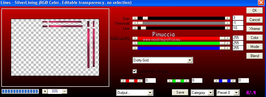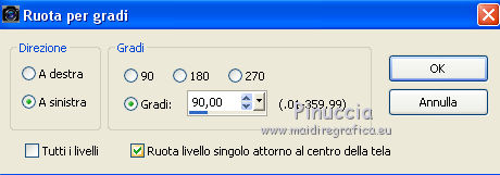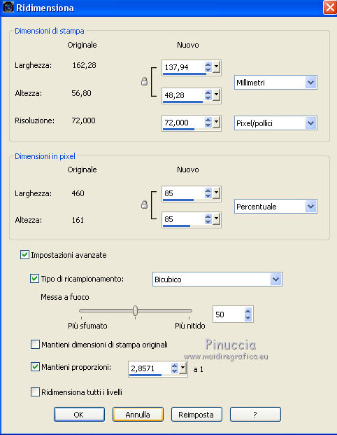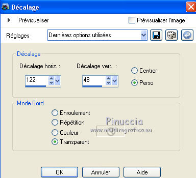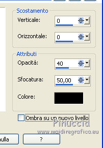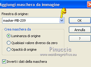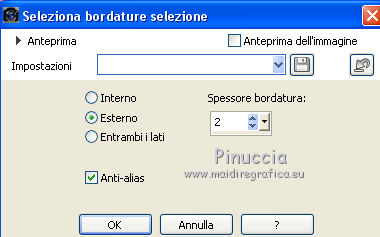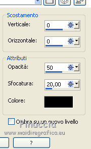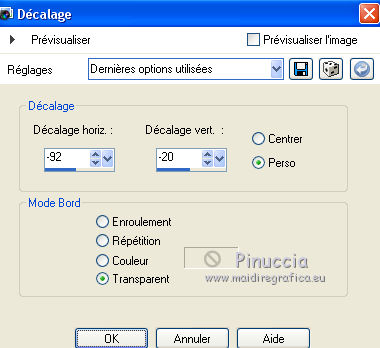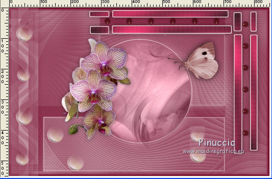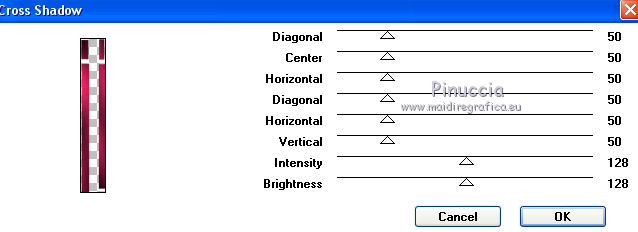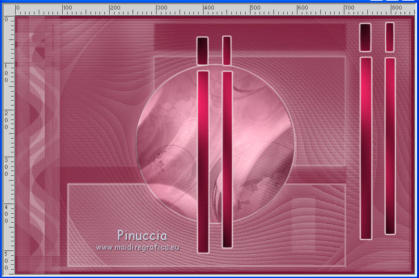 qui puoi trovare qualche risposta ai tuoi dubbi. Se l'argomento che ti interessa non è presente, ti prego di segnalarmelo. Per tradurre il tutorial ho usato Corel X, ma può essere eseguito con ogni versione di PSP. Dalla versione X4, il comando Immagine>Rifletti è stato sostituito con Immagine>Capovolgi in orizzontale, e il comando Immagine>Capovolgi con Immagine>Capovolgi in verticale. Nelle versioni X5 e X6, le funzioni sono state migliorate rendendo disponibile il menu Oggetti. Con la nuova versione X7, sono tornati Rifletti/Capovolgi, ma con nuove differenze Vedi la scheda sull'argomento qui traduzione in francese qui Le vostre versioni qui Occorrente: Materiale qui (in questa pagina trovi i links ai loro siti). Filtri in caso di dubbi, ricorda di consultare la mia sezione filtri qui Filters Unlimited 2.0 qui Graphics Plus - Cross Shadow qui FM Tile Tools - Blend Emboss qui AP 01 [Innovations] - Lines SilverLining qui I filtri Graphics Plus si possono usare da soli o importati in Filters Unlimited (come fare vedi qui) Se un filtro fornito appare con questa icona ![]() se stai usando altri colori, sperimenta le modalità di miscelatura e opacità più adatte ai tuoi colori Metti la selezione nella cartella Selezioni. Apri la maschera in PSP e minimizzala con il resto del materiale. 1. Imposta il colore di primo piano con #f1d9de, e il colore di sfondo con #791232. ![]() 2. Apri una nuova immagine trasparente 850 x 550 pixels. ![]() Riempi l'immagine trasparente con il colore scuro di sfondo.3. Livelli>Nuovo livello raster. Riempi il livello con il colore chiaro.4. Livelli>Nuovo livello maschera>Da immagine. Apri il menu sotto la finestra di origine e vedrai la lista dei files aperti. Seleziona la maschera masker-MB-209. ![]() Livelli>Unisci>Unisci gruppo. (se usi altri colori, la maschera prende la tonalità del tuo colore di sfondo: vedi per esempio il risultato dopo l'applicazione della maschera, nella versione in fondo al tutorial.) ![]() 5. Effetti>Plugins>FM Tile Tools - Blend Emboss, con i settaggi standard. ![]() 6. Apri misted-ballen.png e vai a Modifica>Copia. Torna al tuo lavoro e vai a Modifica>Incolla come nuovo livello. 7. Cambia la modalità di miscelatura di questo livello in Luminanza e abbassa l'opacità all'80%. (colorizza il tube se stai usando altri colori). 8. Livelli>Nuovo livello raster. Selezione>Carica/Salva selezione>Carica selezione da disco. Cerca e carica la selezione les-209-mb.PspSelection. ![]() Riempi la selezione con il colore scuro.9. Effetti>Plugins>Graphics Plus - Cross Shadow, con i settaggi standard. ![]() 10. Selezione>Modifica>Seleziona bordature selezione. ![]() 11. Riempi la selezione con il colore chiaro.Selezione>Deseleziona. 12. Livelli>Duplica. Oggetti>Allinea>Centra nella tela Se stai usando una versione che non ha disponibile il menu Oggetti, invece di duplicare il livello: Modifica>Copia. Modifica>Incolla come nuovo livello, e il livello sarà perfettamente al centro. ![]() 13. Immagine>Ruota per gradi - 90 gradi a sinistra. ![]() 14. Immagine>Ridimensiona, all'85%, tutti i livelli non selezionato. ![]() 15. Effetti>Effetti di immagine>Scostamento. ![]() 16. Livelli>Unisci>Unisci giù. 17. Effetti>Plugins>AP 01 [Innovations] - Lines SilverLining. ![]() 18. Effetti>Effetti 3D>Sfalsa ombra, colore nero. ![]() 19. Apri deco-1-209.png e vai a Modifica>Copia. Torna al tuo lavoro e vai a Modifica>Incolla come nuovo livello. 20. Effetti>Effetti di immagine>Scostamento. ![]() 21. Apri deco-2-209.png e vai a Modifica>Copia. Torna al tuo lavoro e vai a Modifica>Incolla come nuovo livello. 22. Effetti>Effetti di immagine>Scostamento. ![]() 23. Apri Fleurs - 114-16.png e vai a Modifica>Copia. Torna al tuo lavoro e vai a Modifica>Incolla come nuovo livello. Sposta il tube a sinistra.24. Effetti>Effetti 3D>Sfalsa ombra, colore nero. ![]() 25. Apri Vlinder e vai a Modifica>Copia. Torna al tuo lavoro e vai a Modifica>Incolla come nuovo livello. Sposta il tube a destra.26. Effetti>Effetti 3D>Sfalsa ombra, con i settaggi precedenti. ![]() ![]() 27. Immagine>Aggiungi bordatura, 2 pixels, simmetriche, colore bianco. 28. Selezione>Seleziona tutto. Immagine>Aggiungi bordatura, 50 pixels, simmetriche, colore scuro. 29. Selezione>Inverti. Effetti>Plugins>Graphics Plus - Cross Shadow, con i settaggi standard. 30. Selezione>Inverti. Effetti>Effetti 3D>Sfalsa ombra, colore nero. ![]() Selezione>Deseleziona. 31. Firma il tuo lavoro su un nuovo livello. 32. Livelli>Unisci>Unisci tutto e salva in formato jpg. Il tube del fiore di questo esempio è di Odette ![]() ![]() Se hai problemi o dubbi, o trovi un link non funzionante, o anche soltanto per un saluto, scrivimi. 18 Luglio 2017 |