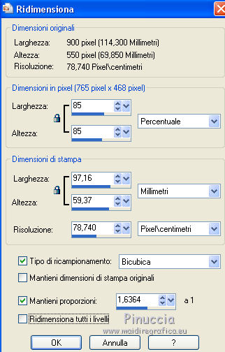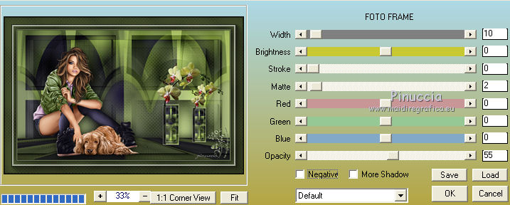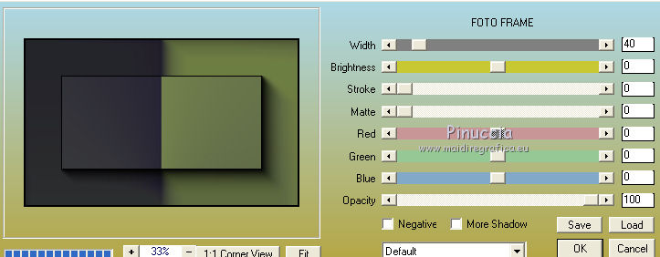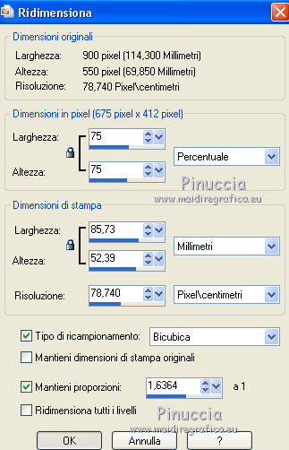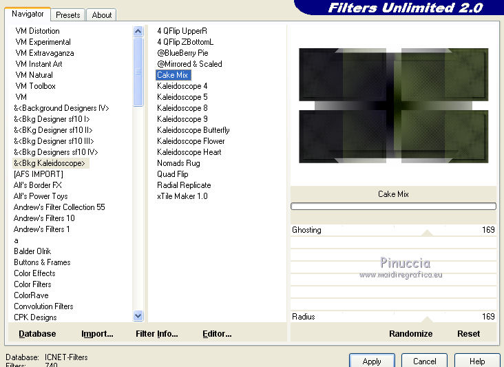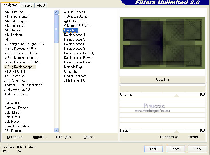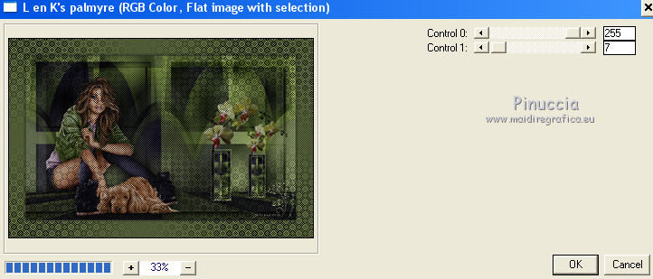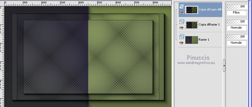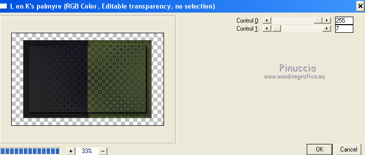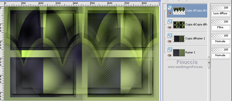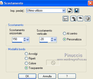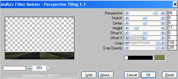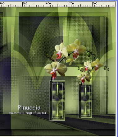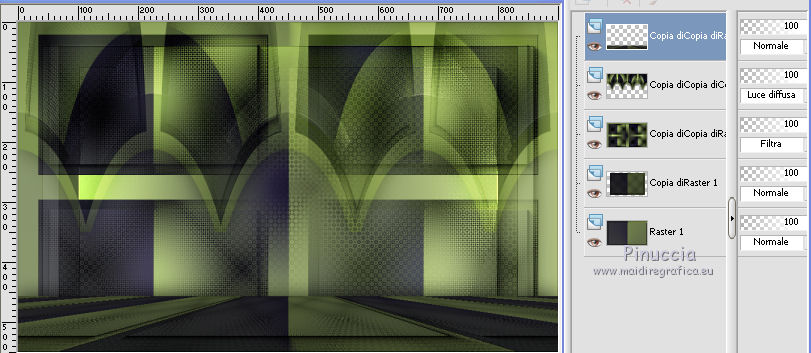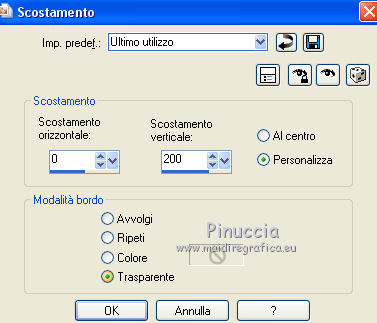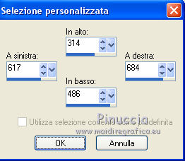 qui puoi trovare qualche risposta ai tuoi dubbi. Se l'argomento che ti interessa non è presente, ti prego di segnalarmelo. Per tradurre il tutorial ho usato Corel X, ma può essere eseguito con ogni versione di PSP. Dalla versione X4, il comando Immagine>Rifletti è stato sostituito con Immagine>Capovolgi in orizzontale, e il comando Immagine>Capovolgi con Immagine>Capovolgi in verticale. Nelle versioni X5 e X6, le funzioni sono state migliorate rendendo disponibile il menu Oggetti. Con la nuova versione X7, sono tornati Rifletti/Capovolgi, ma con nuove differenze Vedi la scheda sull'argomento qui traduzione in francese qui Le vostre versioni qui Occorrente: Materiale qui (in questa pagina trovi i links ai loro siti). Filtri in caso di dubbi, ricorda di consultare la mia sezione filtri qui Filters Unlimited 2.0 qui &<Bkg Kaleidoscope> - Cake mix (da importare in Unlimited qui L&K's - L& K Palmyre qui Mura's Meister - Perspective Tiling qui AAA Frames - Foto Frame qui ![]() se stai usando altri colori, sperimenta le modalità di miscelatura e opacità più adatte ai tuoi colori Nelle ultime versioni di PSP non c'è il gradiente di primo piano/sfondo (Corel_06_029) Puoi usare i gradienti delle versioni precedenti. Trovi qui i gradienti Corel X. 1. Imposta il colore di primo piano con #272435, e il colore di sfondo con #72814d. ![]() Passa il colore di primo piano a Gradiente di primo piano/sfondo, stile Radiale. ![]() 2. Apri una nuova immagine trasparente 900 x 550 pixels. ![]() Riempi l'immagine trasparente con il gradiente.3. Effetti>Plugins>AAA Frames - Foto Frame. ![]() 4. Livelli>Duplica. Immagine>Ridimensiona, all'85%, tutti i livelli non selezionato. ![]() 5. Effetti>Plugins>L&K's - L& K Palmyre. ![]() 6. Livelli>Duplica. Cambia la modalità di miscelatura di questo livello in Filtra. ![]() 7. Effetti>Plugins>Filters Unlimited 2.0 - &<Bkg Kaleidoscope> - Cake Mix. ![]() attenzione, se stai usando la versione software di Unlimited che si installa, questo filtro assume la tonalità del tuo colore di sfondo (in questo caso #72814d) Se però stai usando la versione di Unlimited che non si installa ed è composta da files in formato 8bf, avrai questo risultato, indipendentemente dal colore di sfondo ![]() Per avere il risultato corretto dovresti sostituire nei Percorsi Files la versione 8bf con la versione software di Unlimited. 8. Livelli>Duplica. Immagine>Ridimensiona, al 75%, tutti i livelli non selezionato. ![]() 9. Effetti>Effetti di distorsione>Coordinate polari. ![]() 10. Effetti>Effetti di immagine>Scostamento. ![]() 11. Effetti>Effetti 3D>Sfalsa ombra, colore nero. ![]() 12. Cambia la modalità di miscelatura di questo livello in Luce diffusa. ![]() 13. Attiva il livello Copia di Raster 1. Livelli>Duplica. Effetti>Plugins>Mura's Meister - Perspective Tiling. ![]() 14. Livelli>Disponi>Porta in alto. 15. Effetti>Effetti 3D>Sfalsa ombra, colore nero. ![]() Dovresti avere questo. ![]() 16. Livelli>Unisci>Unisci visibile. 17. Immagine>Ruota a destra. se stai usando PSP 9: Immagine>Ruota - 90 gradi in senso orario Modifica>Copia. Immagine>Ruota a sinistra. se stai usando PSP 9: Immagine>Ruota - 90 gradi in senso antiorario 18. Attiva lo strumento Selezione ![]() (non importa il tipo di selezione impostato, perchè con la selezione personalizzata si ottiene sempre un rettangolo) clicca sull'icona Selezione personalizzata ![]() e imposta i seguenti settaggi. ![]() 19. Livelli>Nuovo livello raster. Modifica>Incolla nella selezione. 20. Livelli>Nuovo livello raster. Imposta il colore di primo piano con il colore bianco. Riempi con il colore bianco,modalità di corrispondenza dello strumento Riempimento su Nessuno. ![]() 21. Selezione>Modifica>Contrai - 1 pixel. Premi sulla tastiera il tasto CANC ![]() 22. Selezione>Modifica>Contrai - 10 pixels. Riempi la selezione con il colore bianco #ffffff.23. Selezione>Modifica>Contrai - 1 pixel. Premi sulla tastiera il tasto CANC. 24. Effetti>Effetti 3D>Sfalsa ombra, colore nero. ![]() Selezione>Deseleziona. 25. Livelli>Unisci>Unisci giù. 26. Livelli>Duplica. Immagine>Ridimensiona, all'85%, tutti i livelli non selezionato. 27. Effetti>Effetti di immagine>Scostamento. ![]() 28. Livelli>Unisci>Unisci giù. 29. Apri il tube deco-bloemen-1 e vai a Modifica>Copia. Torna al tuo lavoro e vai a Modifica>Incolla come nuovo livello. Sposta i fiori sui "vasi".![]() 30. Apri il tube 0_e1724_5ecabc12_L.png e vai a Modifica>Copia. Torna al tuo lavoro e vai a Modifica>Incolla come nuovo livello. Sposta questo tube a sinistra.31. Effetti>Effetti 3D>Sfalsa ombra, colore nero. ![]() 32. Immagine>Aggiungi bordatura, 1 pixel, simmetriche, #272435. Immagine>Aggiungi bordatura, 3 pixels, simmetriche, #7281d4. Immagine>Aggiungi bordatura, 1 pixel, simmetriche, #272435. 33. Selezione>Seleziona tutto. Immagine>Aggiungi bordatura, 50 pixels, simmetriche, #7281d4. Selezione>Inverti. 34. Effetti>Plugins>L&K's - L& K Palmyre. ![]() 35. Selezione>Inverti. Effetti>Effetti 3D>Sfalsa ombra, colore nero. ![]() Selezione>Deseleziona. 36. Effetti>Plugins>AAA Frames - Foto Frame. ![]() 37. Firma il tuo lavoro su un nuovo livello. Livelli>Unisci>Unisci tutto e salva in formato jpg. I tubes di questo esempio sono di Cal e Maryse (elaborazione) ![]() ![]() Se hai problemi o dubbi, o trovi un link non funzionante, o anche soltanto per un saluto, scrivimi. 7 Ottobre 2017 |